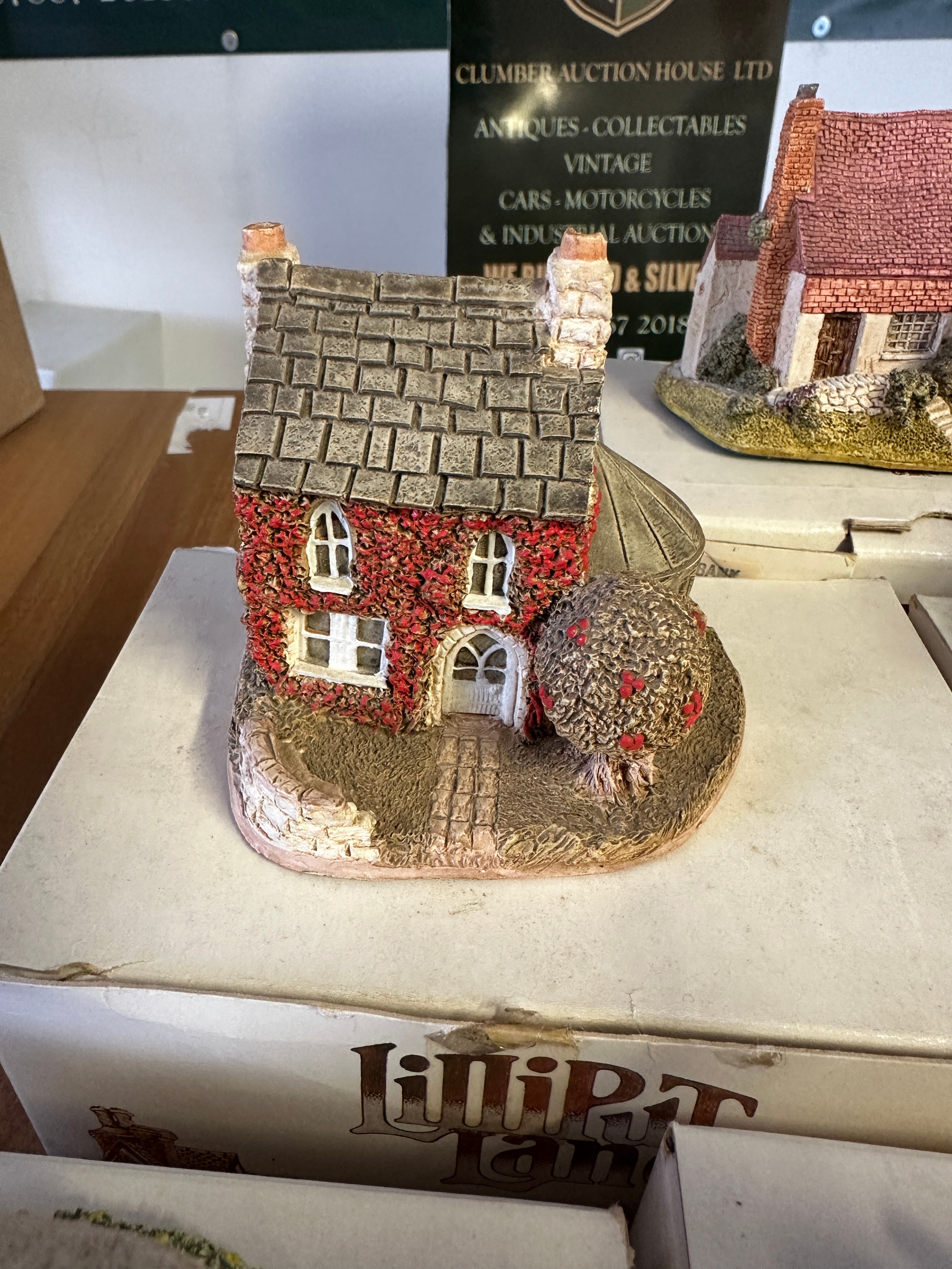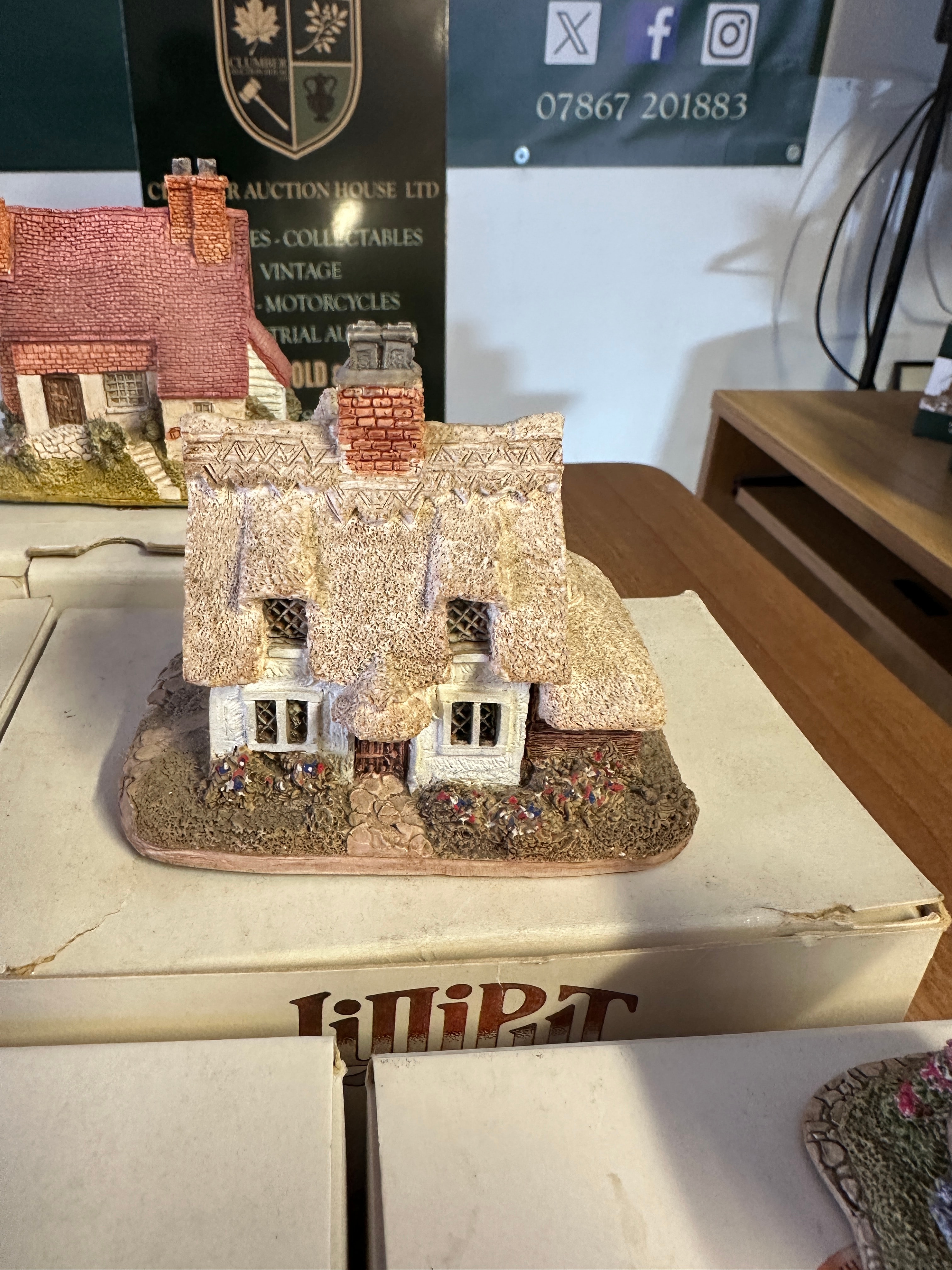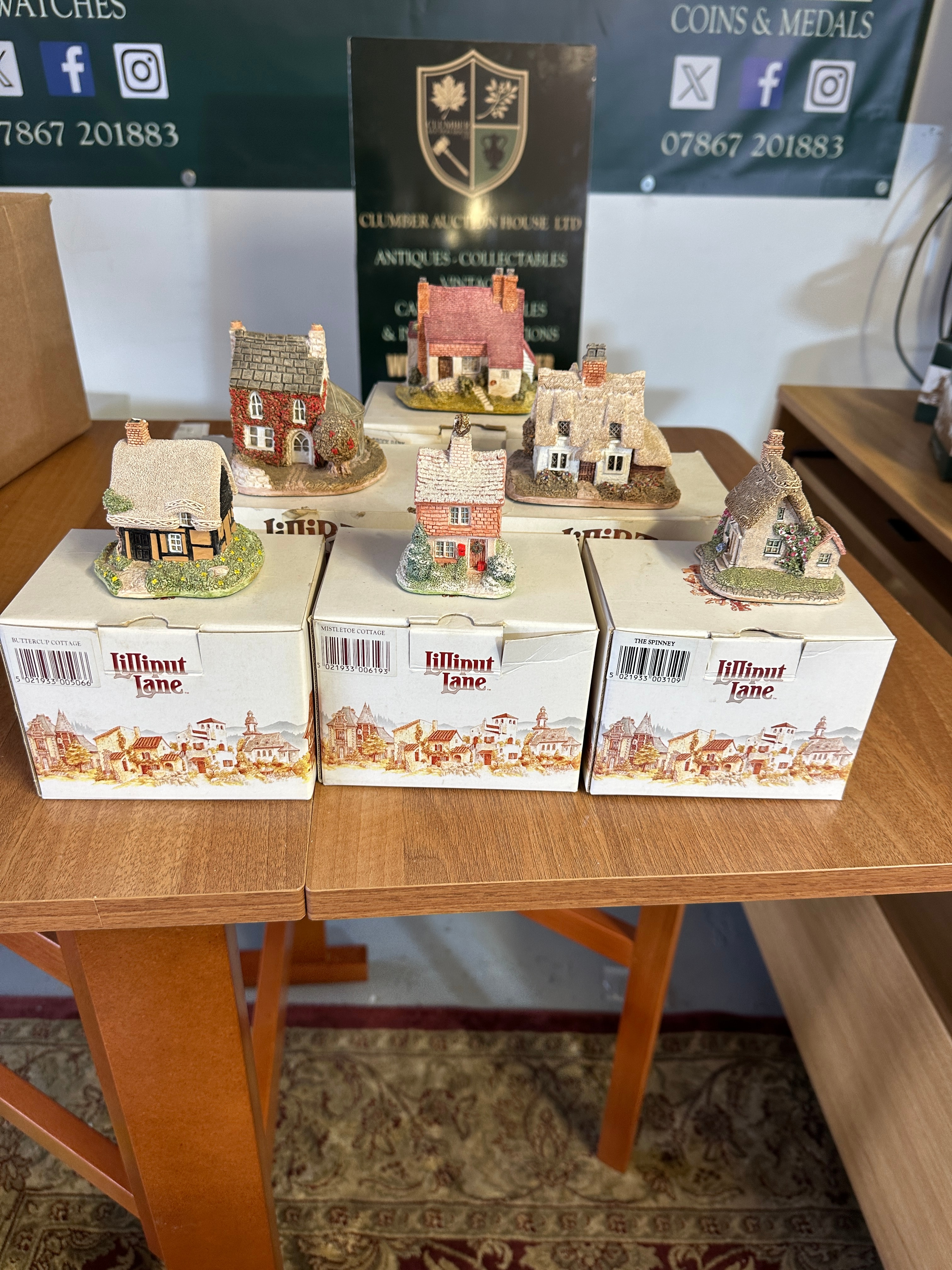 A collection of six Lilliput Lane miniature decorative house figurines. Each figurine, crafted from hand-painted resin or ceramic, depicts a highly detailed traditional English-style cottage. Features include thatched or tiled roofs, brickwork, exposed timber framing, chimneys, and landscaped bases with gardens and pathways. One box label partially visible includes the word ‘COTTAGE’, confirming the theme. These are modern collectibles, likely dating from the late 20th or early 21st century.