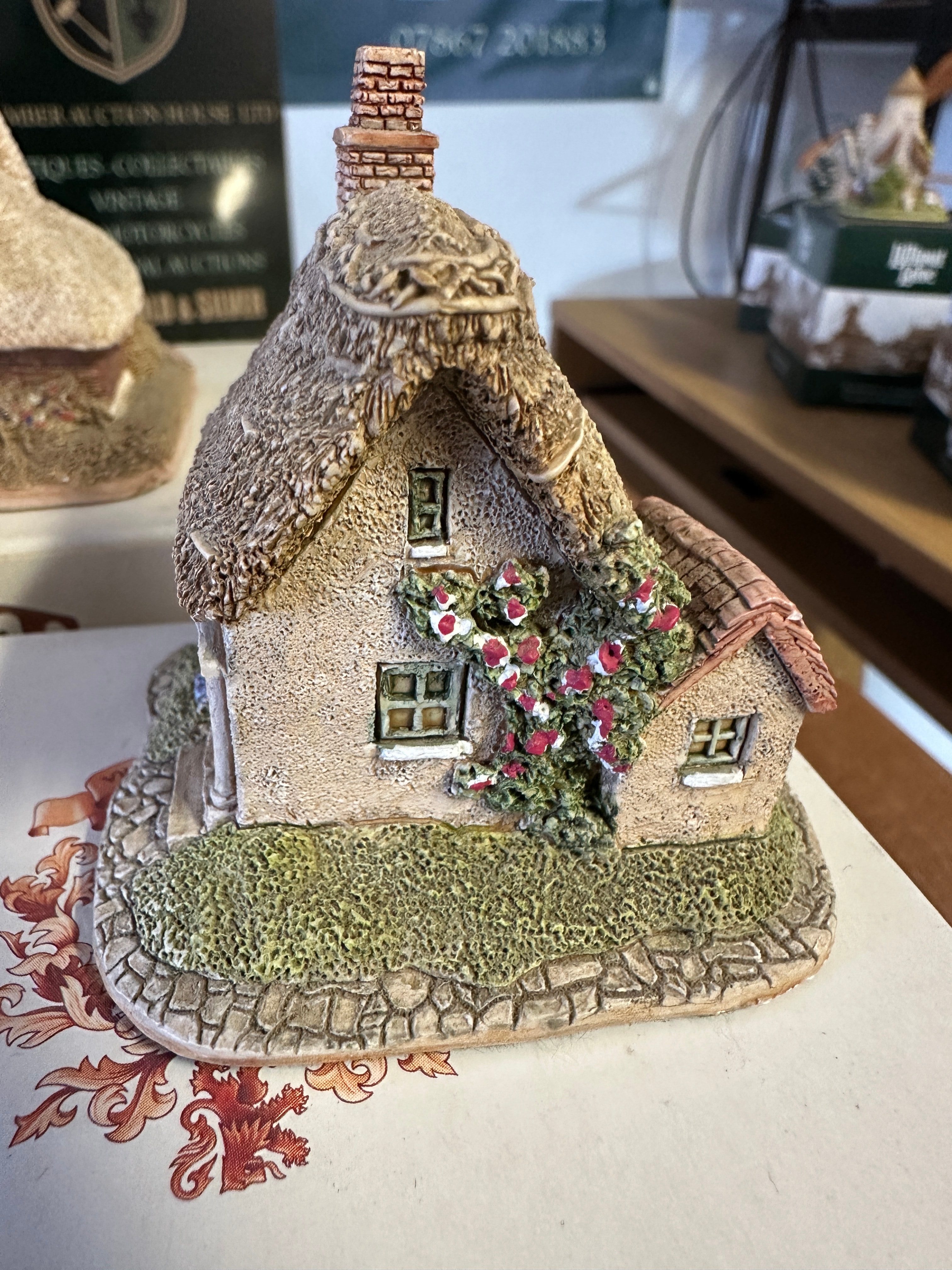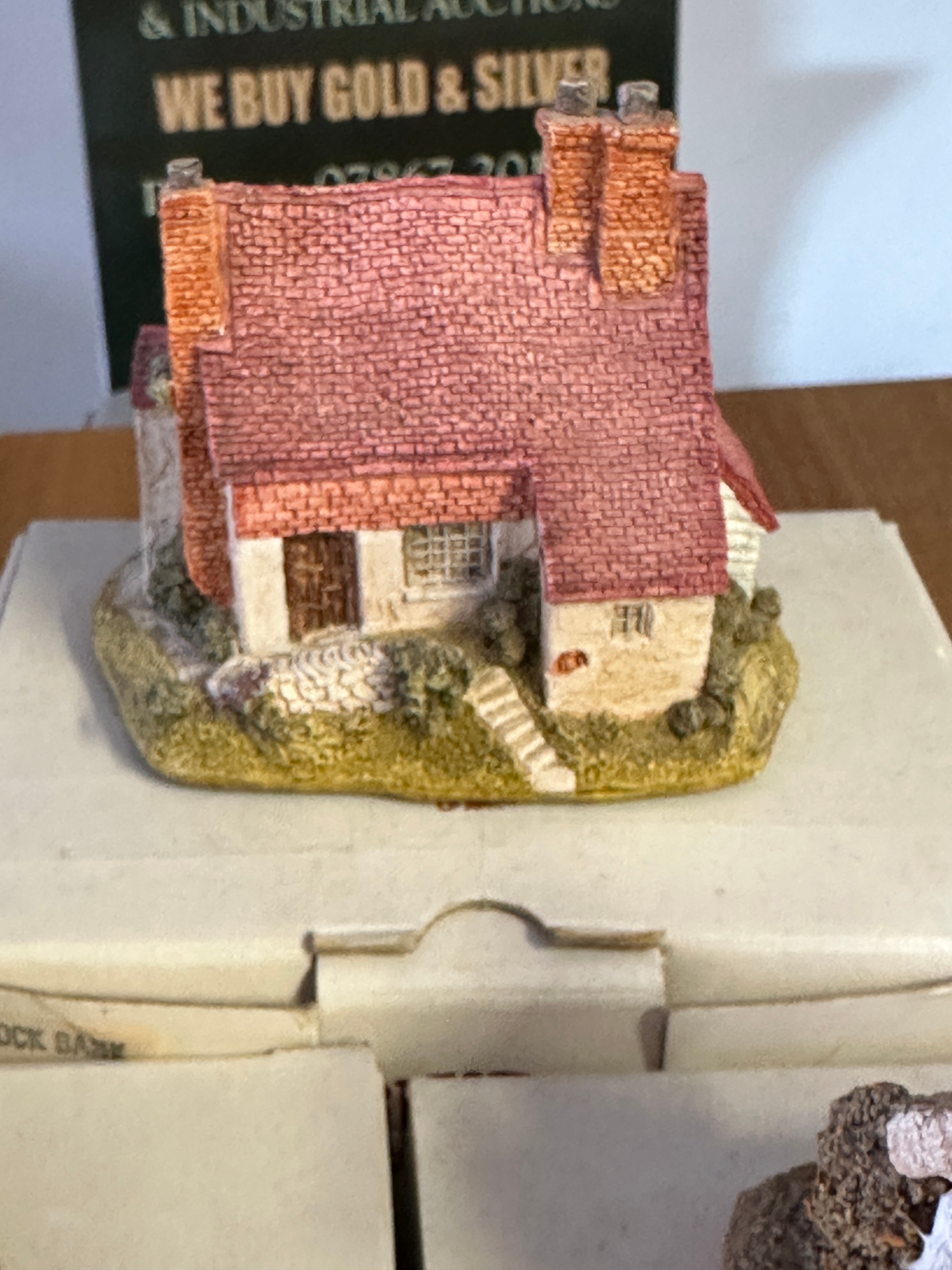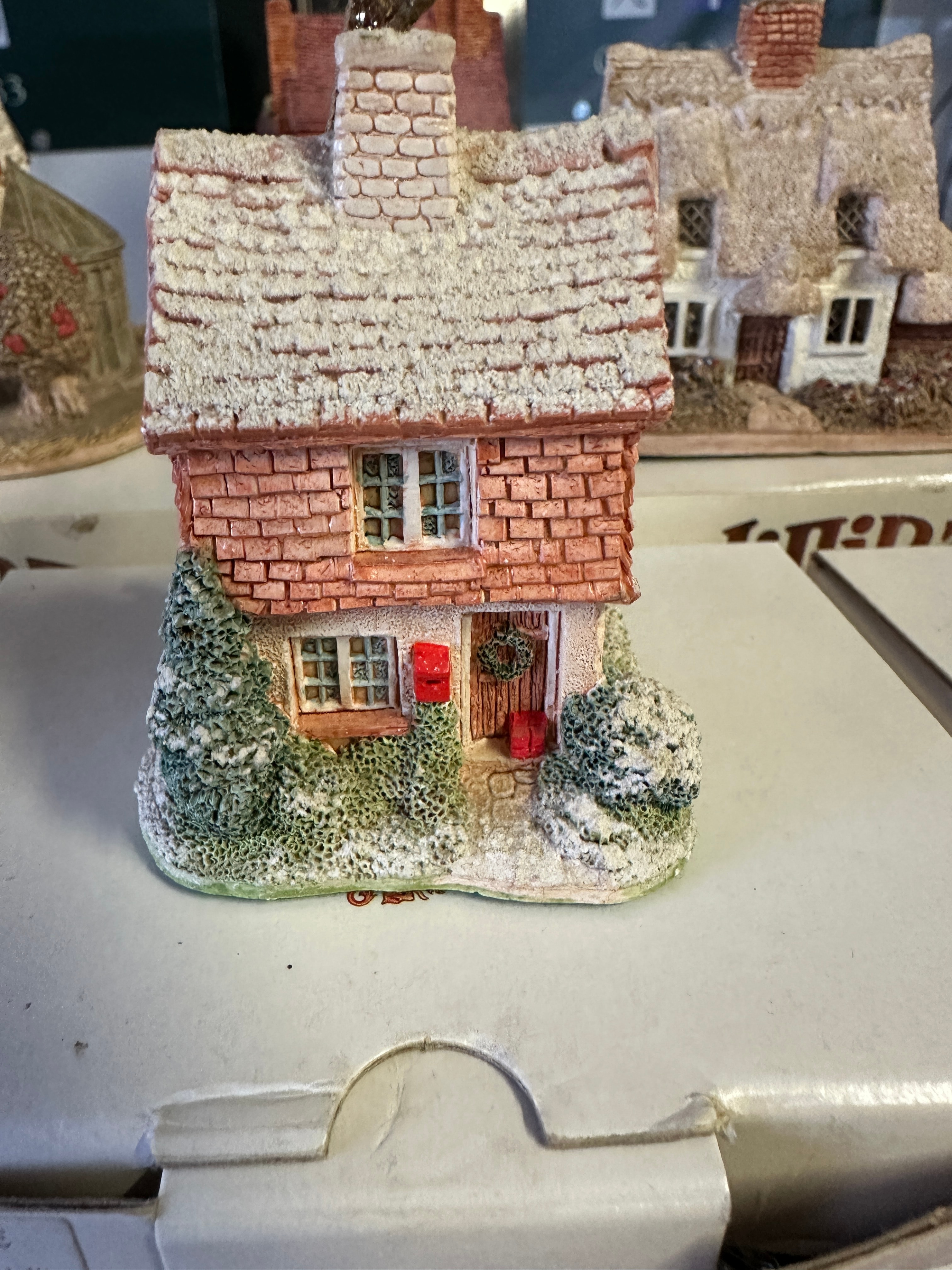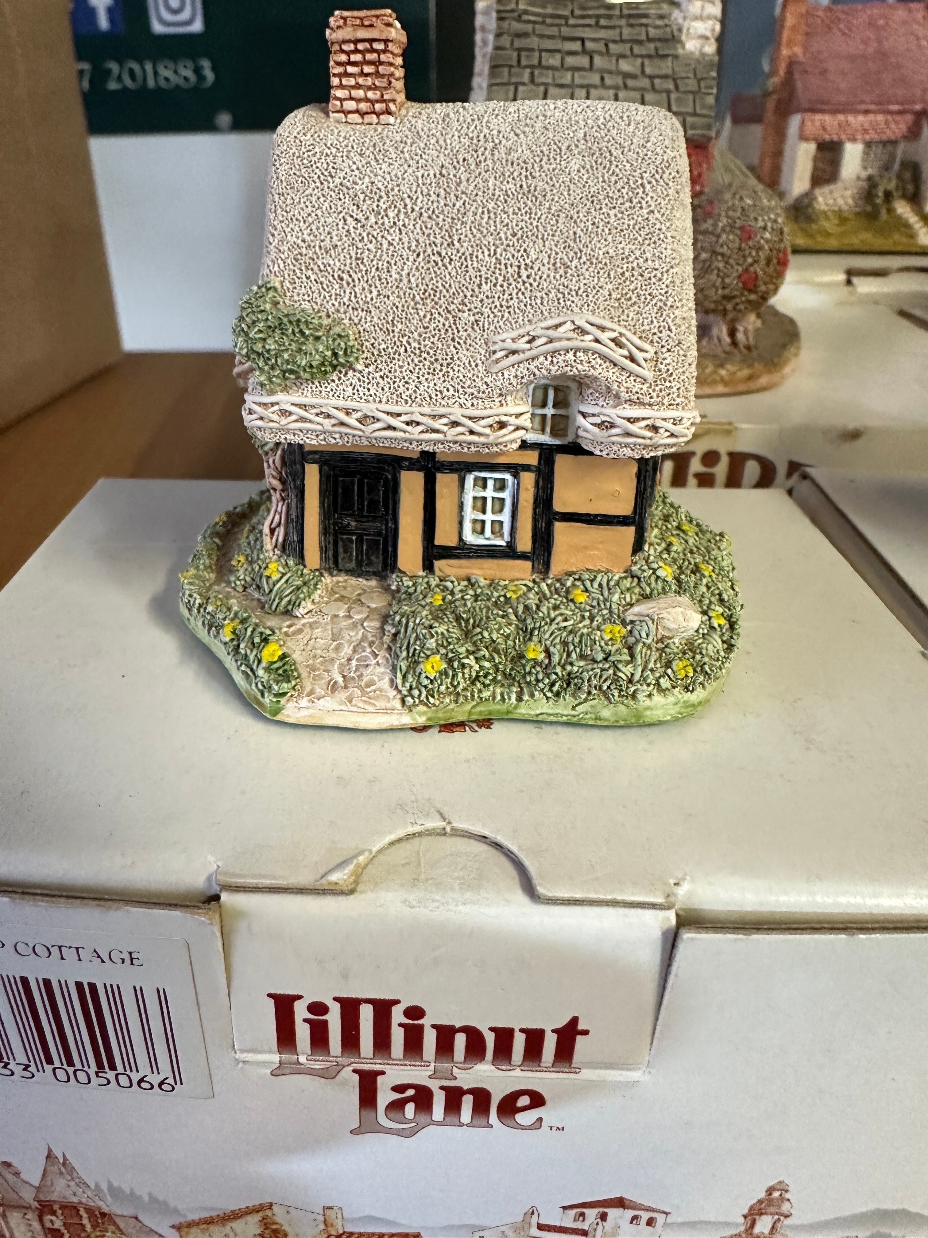 A collection of six Lilliput Lane miniature decorative house figurines. Each figurine, crafted from hand-painted resin or ceramic, depicts a highly detailed traditional English-style cottage. Features include thatched or tiled roofs, brickwork, exposed timber framing, chimneys, and landscaped bases with gardens and pathways. One box label partially visible includes the word ‘COTTAGE’, confirming the theme. These are modern collectibles, likely dating from the late 20th or early 21st century.