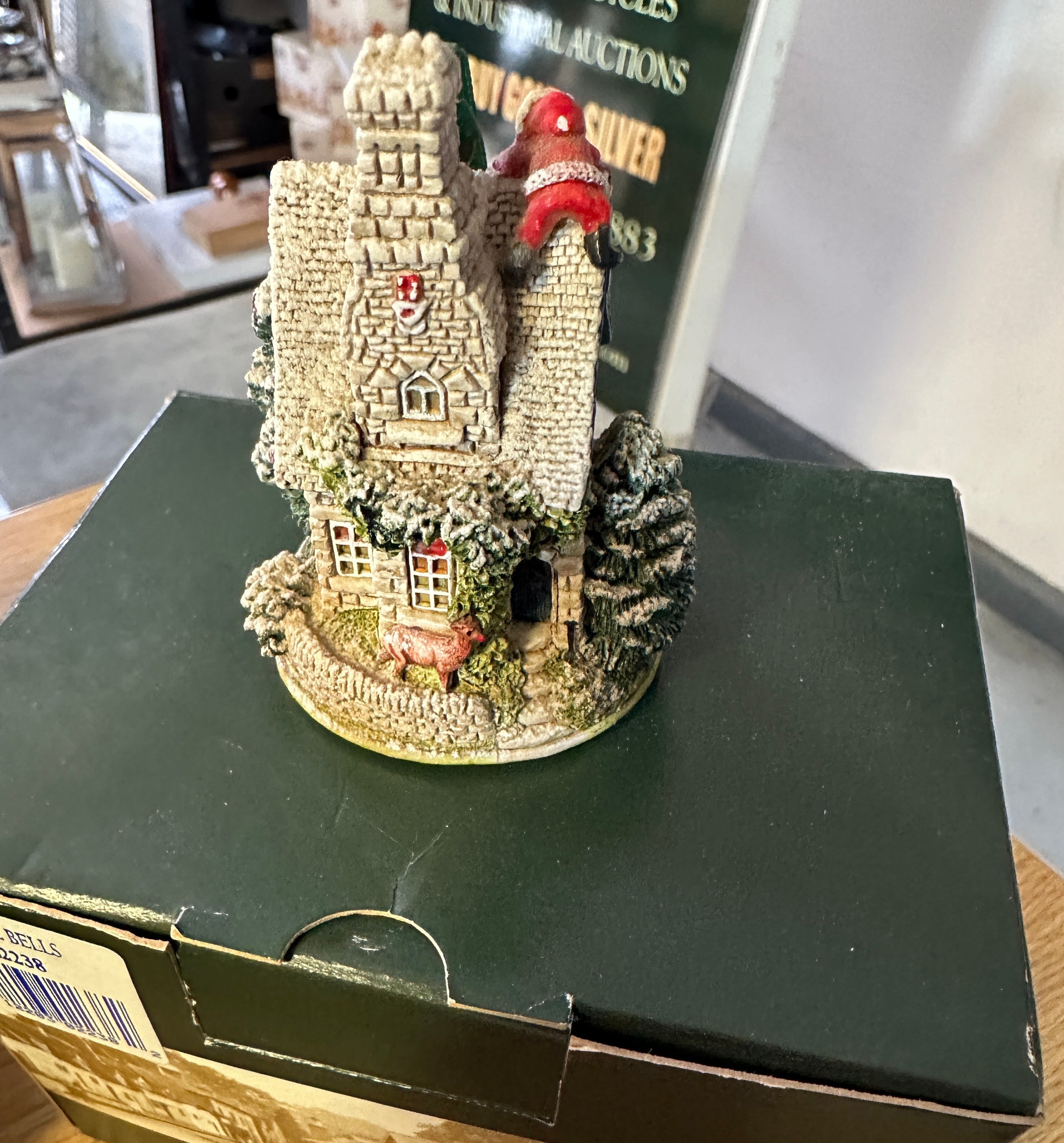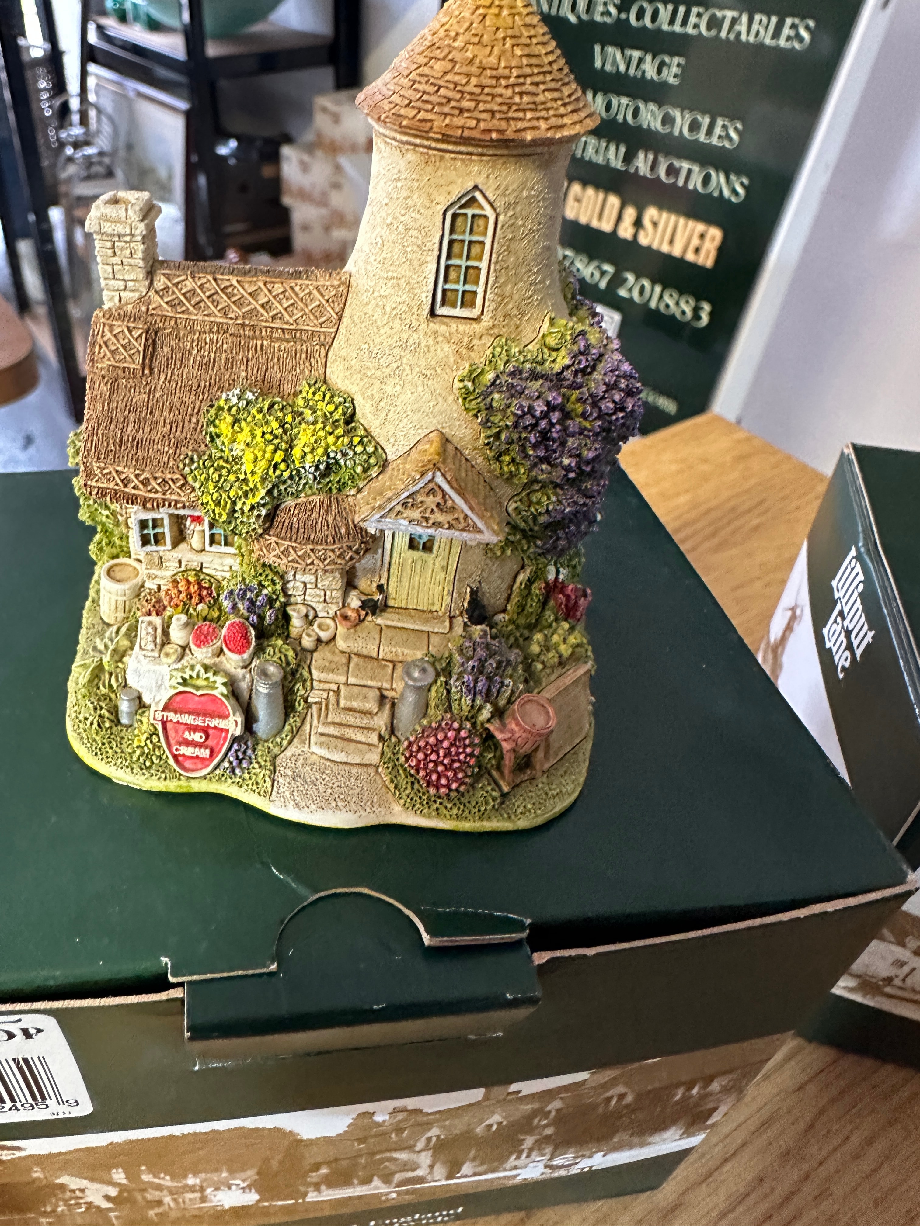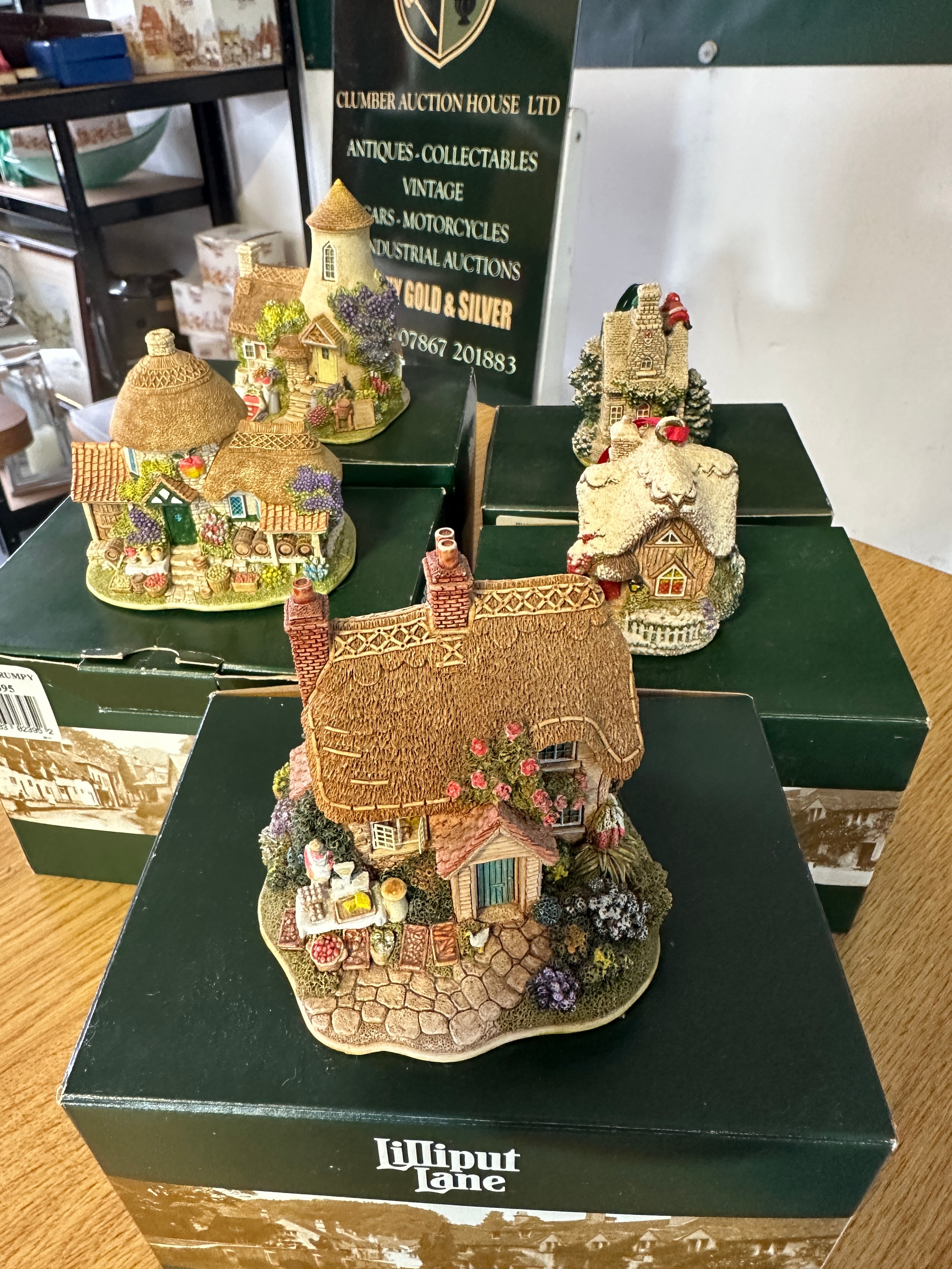 A collection of five Lilliput Lane miniature house figurines, crafted from hand-painted resin or a similar cold-cast material. Each piece is highly detailed, depicting picturesque cottages and buildings. The collection includes one figurine with a distinctive lighthouse-style tower and another featuring a snow-covered roof, indicating seasonal variations. The figurines are presented on their associated dark green retail boxes, which prominently display the “Lilliput Lane” logo and text stating “Handmade in England” and “Treasured Worldwide.” Visible model names on the packaging include “LITTLE ‘O’ GRUMPY,” “STRAWBERRIES AND CREAM,” and “CHRISTMAS BELLS.”