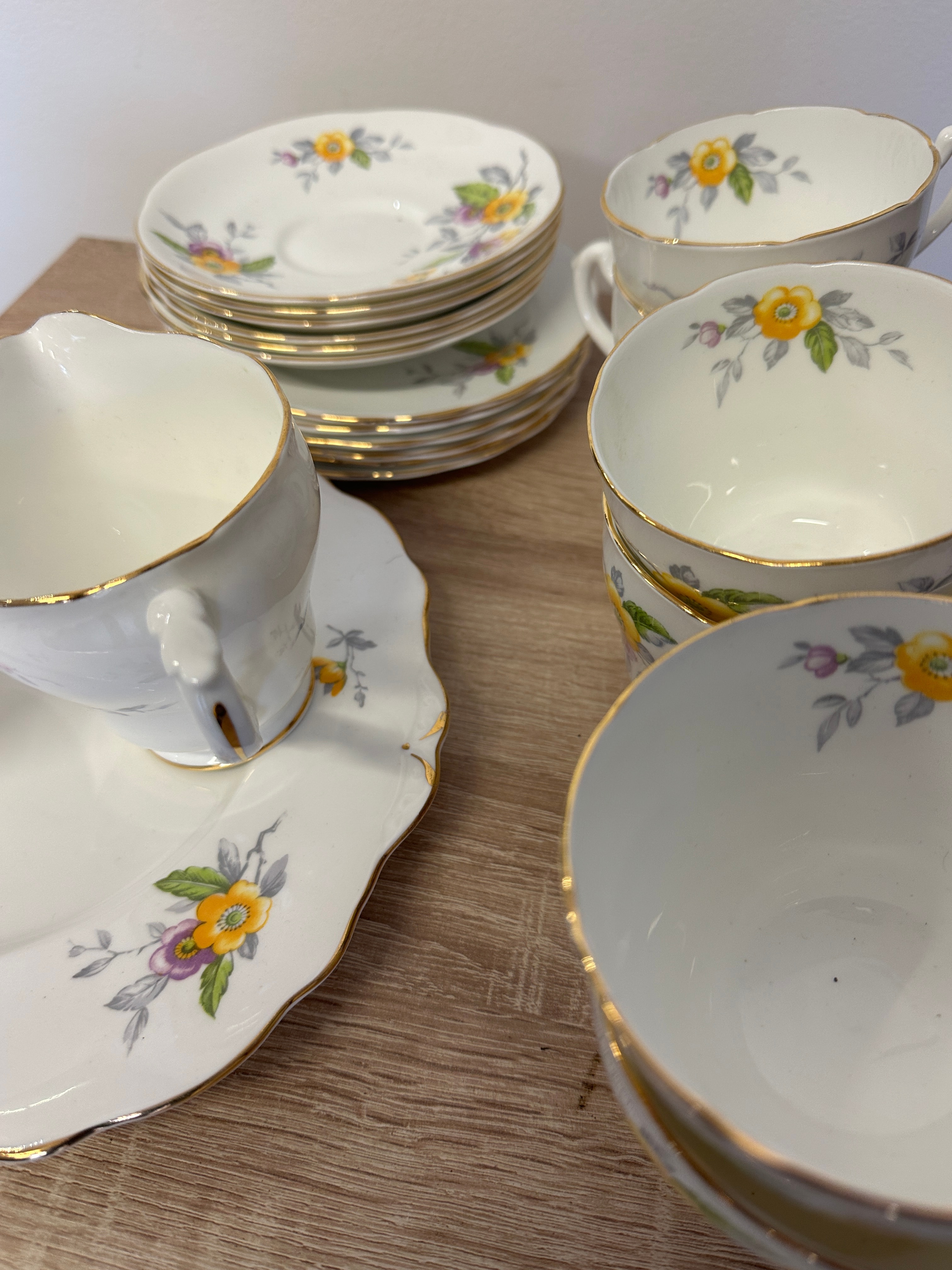 A Royal Albert ‘Primrose’ partial tea service, comprising six teacups, seven saucers, one creamer, and one sugar bowl. Each piece crafted from white ceramic, consistent with porcelain or fine bone china, adorned with a consistent floral transferware pattern featuring yellow and purple blooms with grey-green foliage. The pieces are finished with a gold-colored gilt rim and accents. Some saucers and the creamer display a gently scalloped or fluted edge, contributing to a traditional or vintage aesthetic.