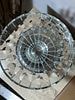 A Stuart Fine Crystal ‘Juxton’ footed centerpiece bowl. This modern or mid-20th century crystal bowl features a wide, open mouth, a waisted body, and a heavy faceted base resting on a pedestal foot. The decoration consists of a series of vertically cut, alternating plain and tear-drop shaped facets designed to catch the light. The bowl bears a rectangular label affixed to the interior rim clearly reading “STUART FINE CRYSTAL” and “JUXTON.” Made in England. Presented on a separate circular mirrored stand with a glittered edge.