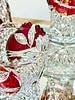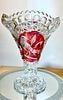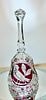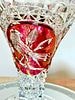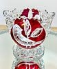 A group of three Hofbauer ‘The Byrdes Collection’ ruby-flashed, cut-to-clear crystal items, comprising a footed compote or vase, a hand bell, and a small footed cordial or shot glass. Each piece features a prominent deep ruby red layer, intricately cut through to reveal clear glass beneath, forming detailed motifs of a bird on a branch amidst stylized foliage, complemented by geometric faceting, diamond, and star-cut patterns. The clear glass sections on the stems and bases also display elaborate geometric cutting. The style is characteristic of Bohemian or Czech artistry.