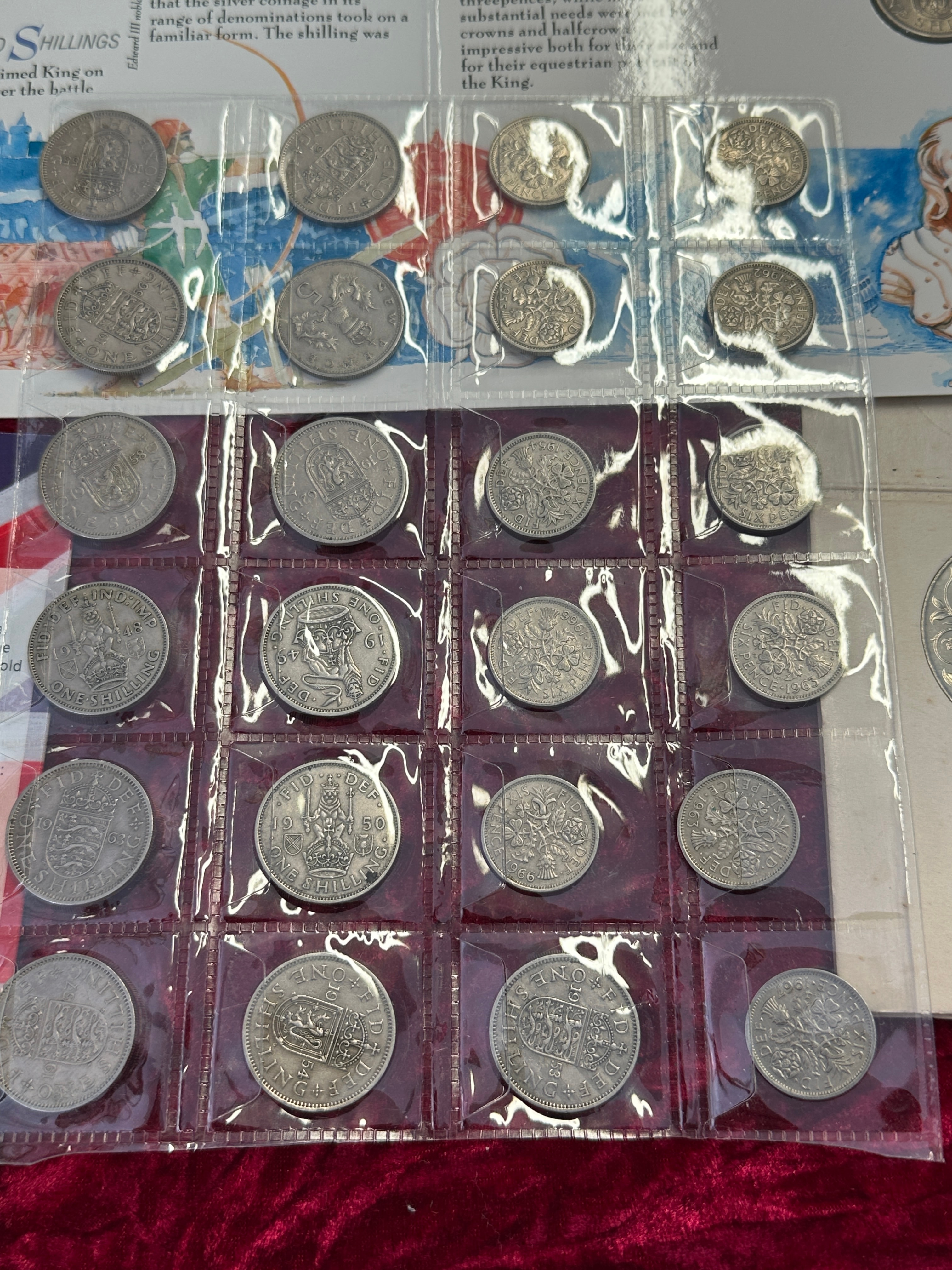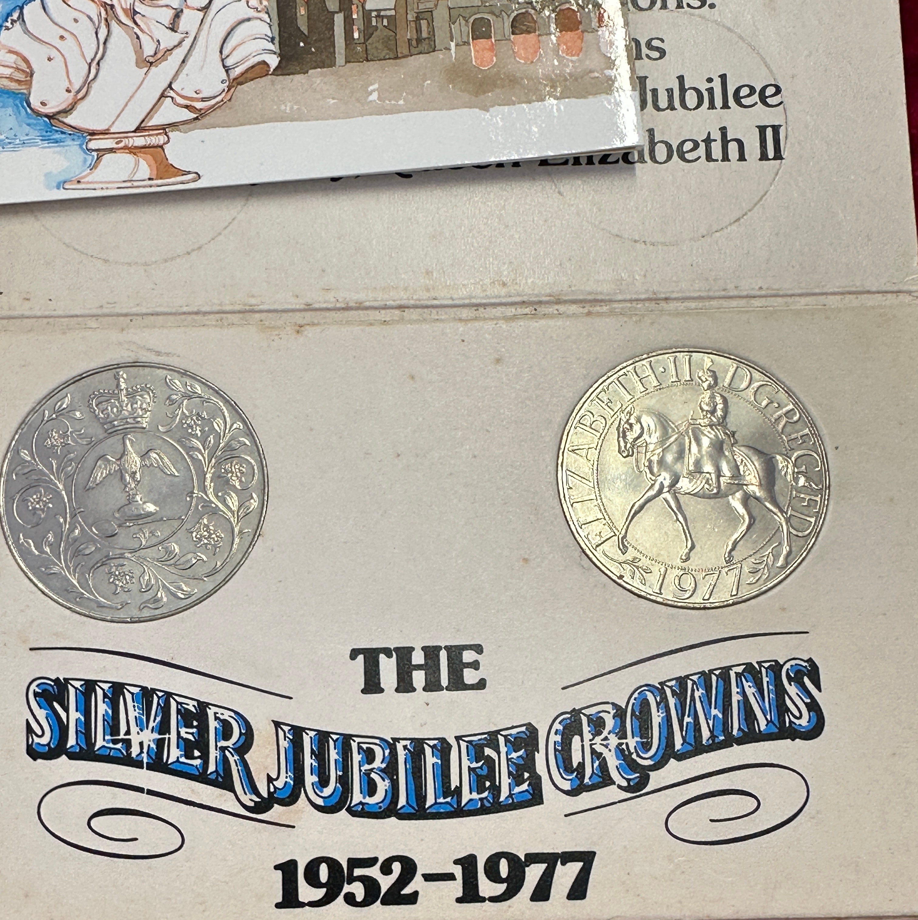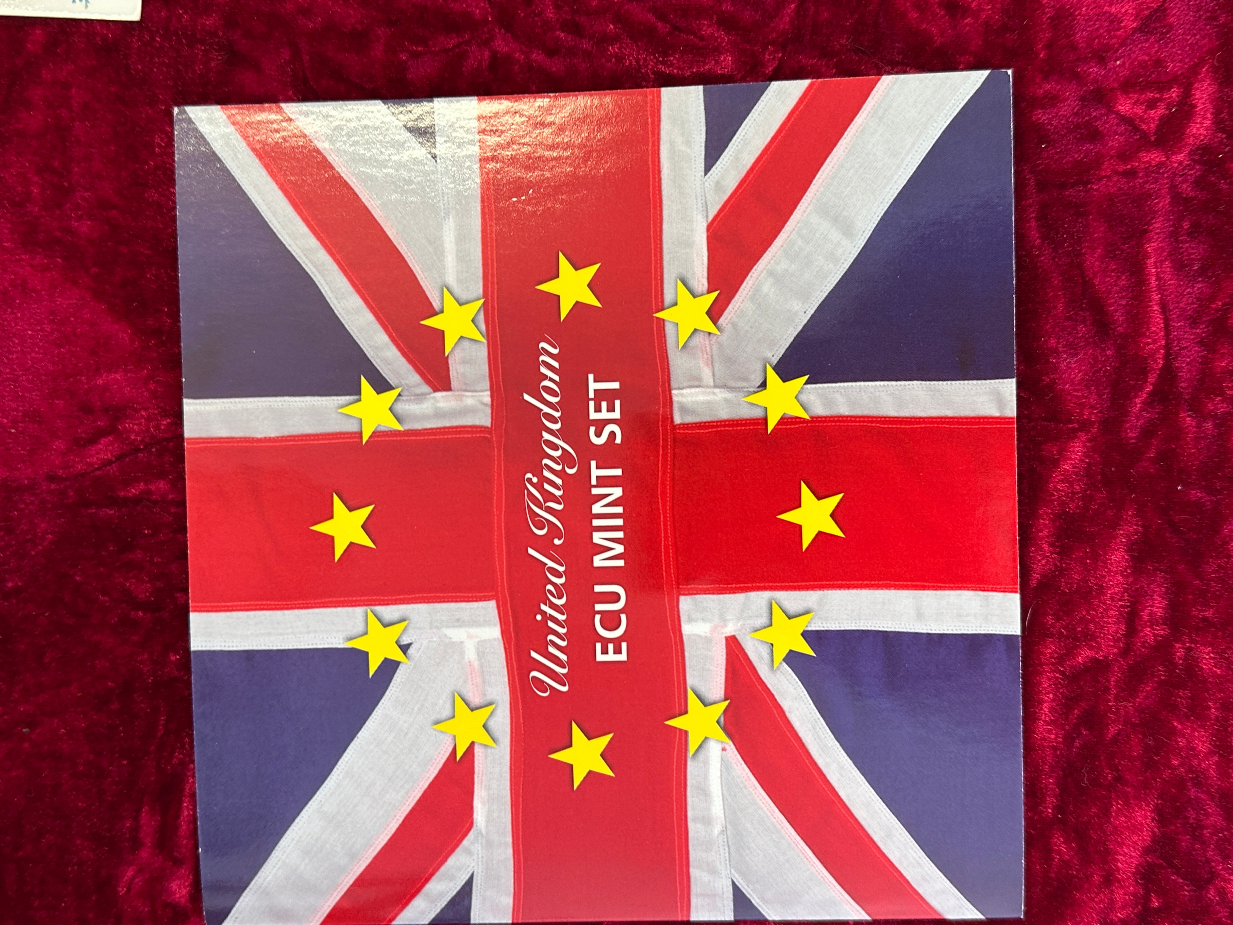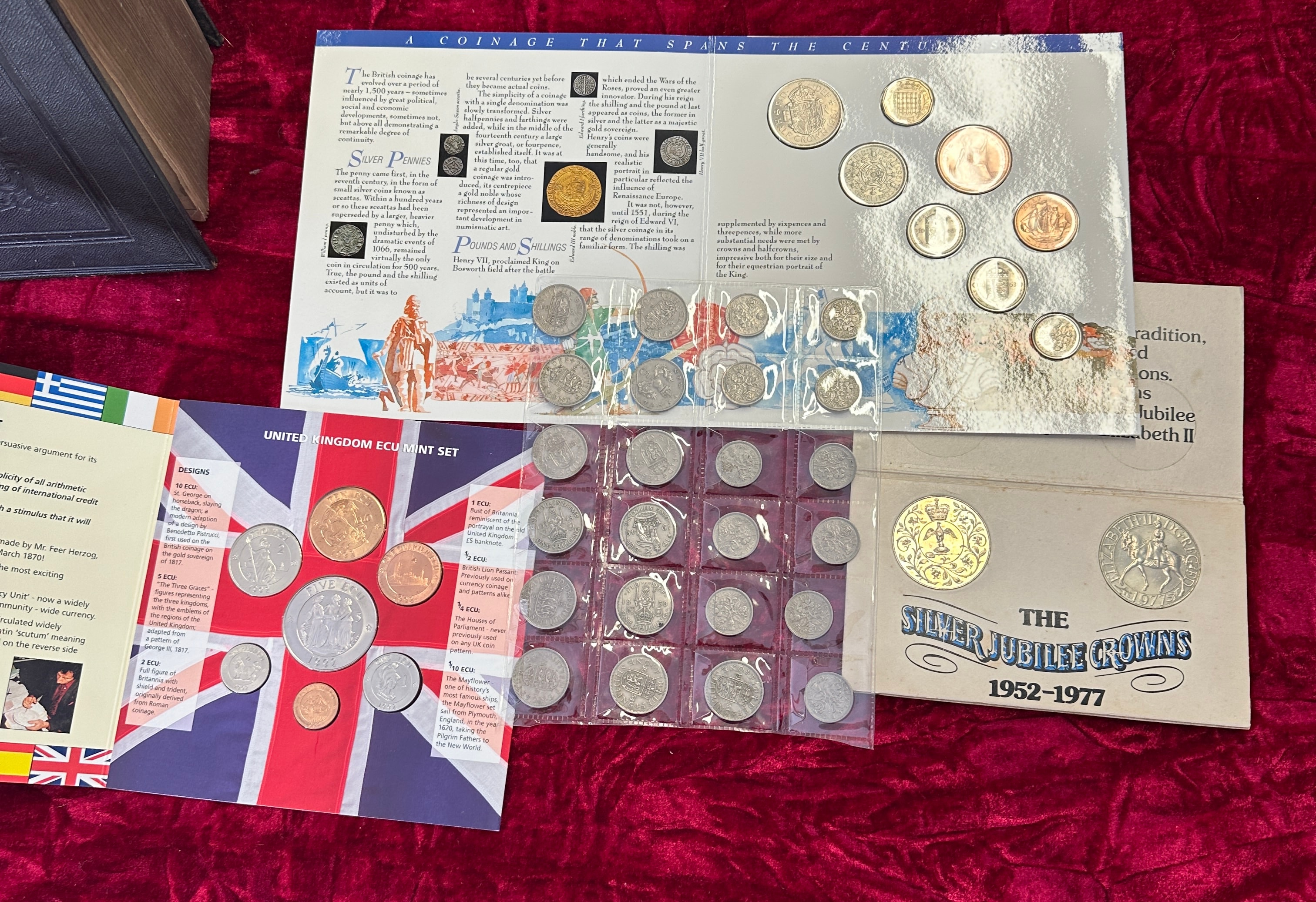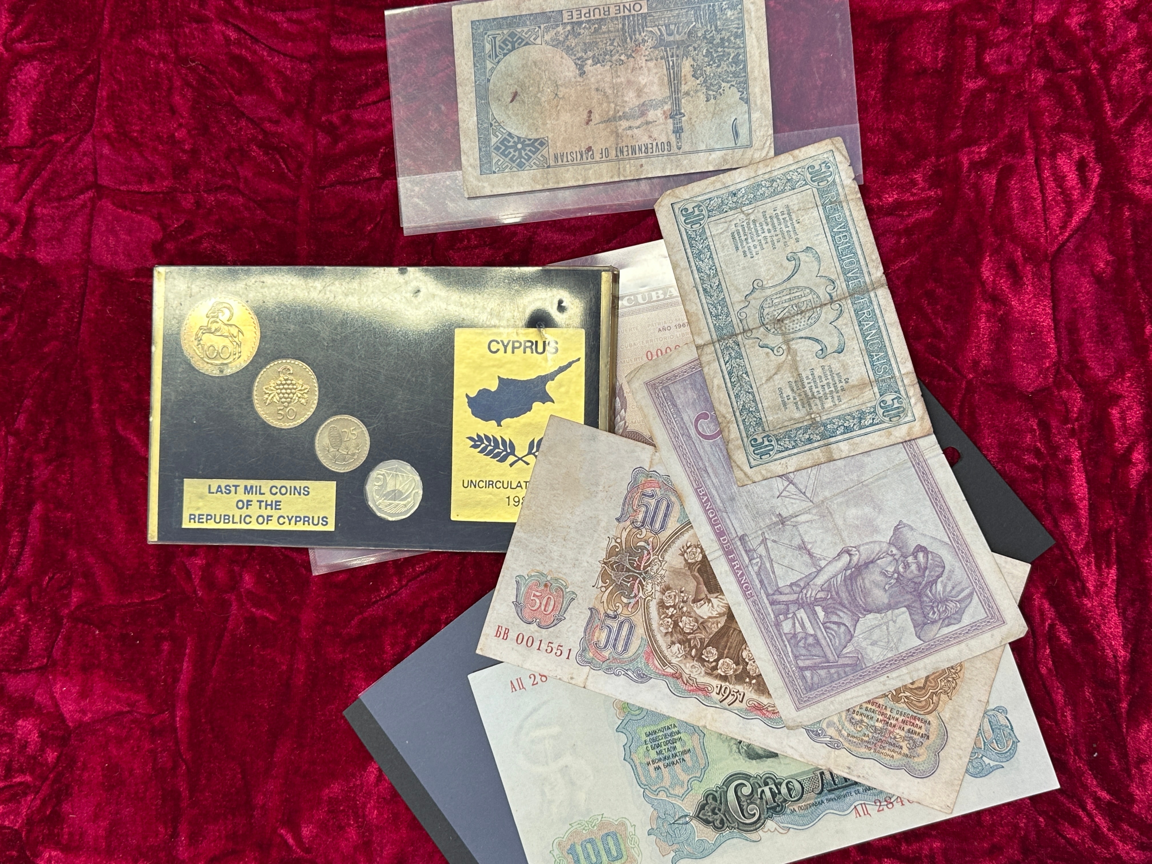 This lot presents a diverse collection of numismatic items. The primary feature is a “COINAGE THAT SPANS THE CENTURIES” commemorative set, identified through web intelligence as a Royal Mint Pounds Shillings and Pence Coin Set, containing various pre-decimal United Kingdom coins, some dated 1950. Also included is a “UNITED KINGDOM ECU MINT SET” presented in a Union Jack-themed folder, and “THE SILVER JUBILEE CROWNS 1952-1977” displaying two large commemorative coins featuring Queen Elizabeth II. Further items comprise a “LAST MIL COINS OF THE REPUBLIC OF CYPRUS” uncirculated set, a collection of numerous individual pre-decimal UK coins, many dated in the 1940s and 1950s, organized in protective plastic sleeves, and a group of international banknotes. Notable among the banknotes are a “GOVERNMENT OF PALESTINE ONE RUPEE” note, Cuban currency, and notes bearing Greek (Δραχμ*ς) and Cyrillic (“СТО” – One Hundred) inscriptions.