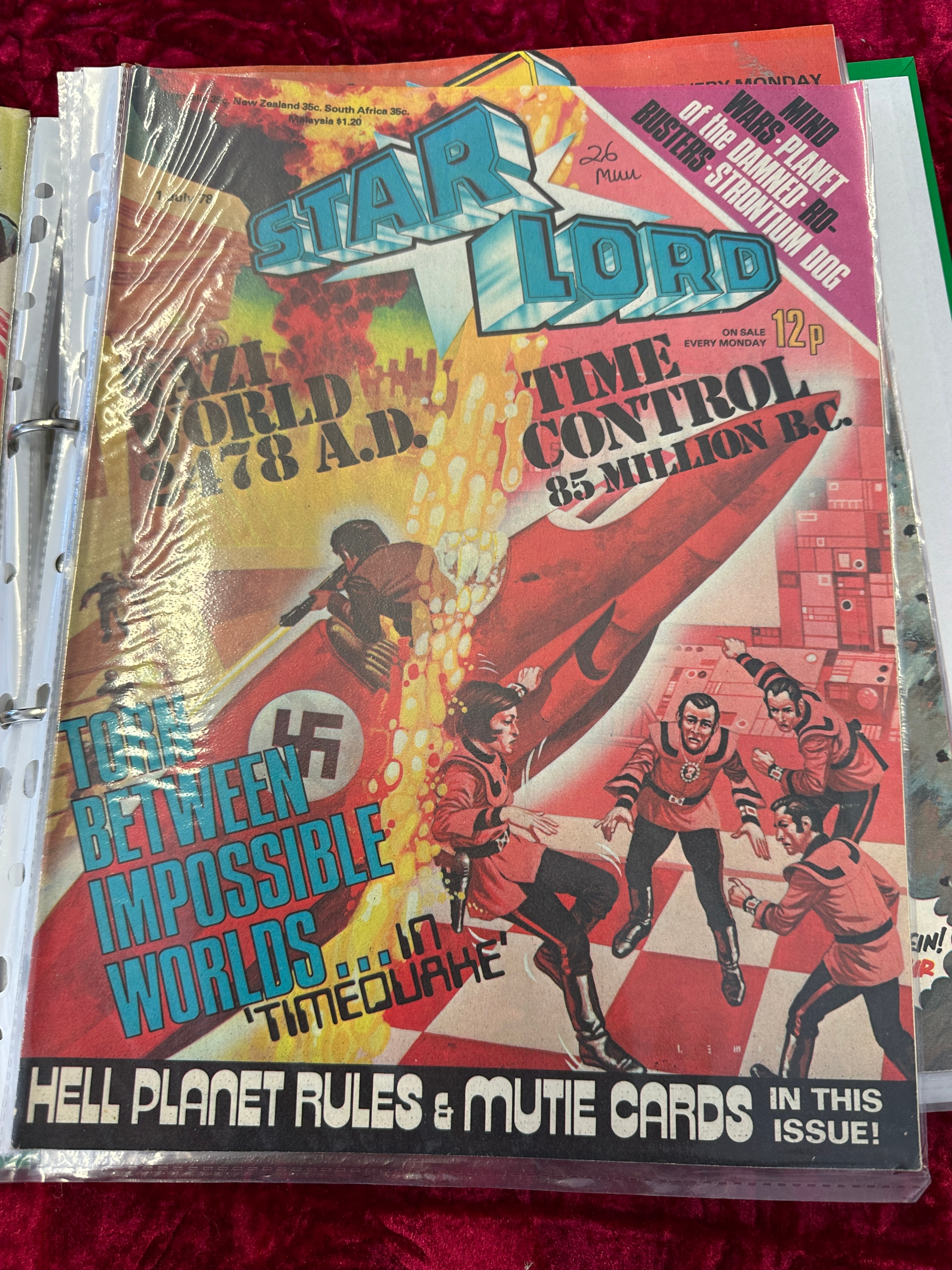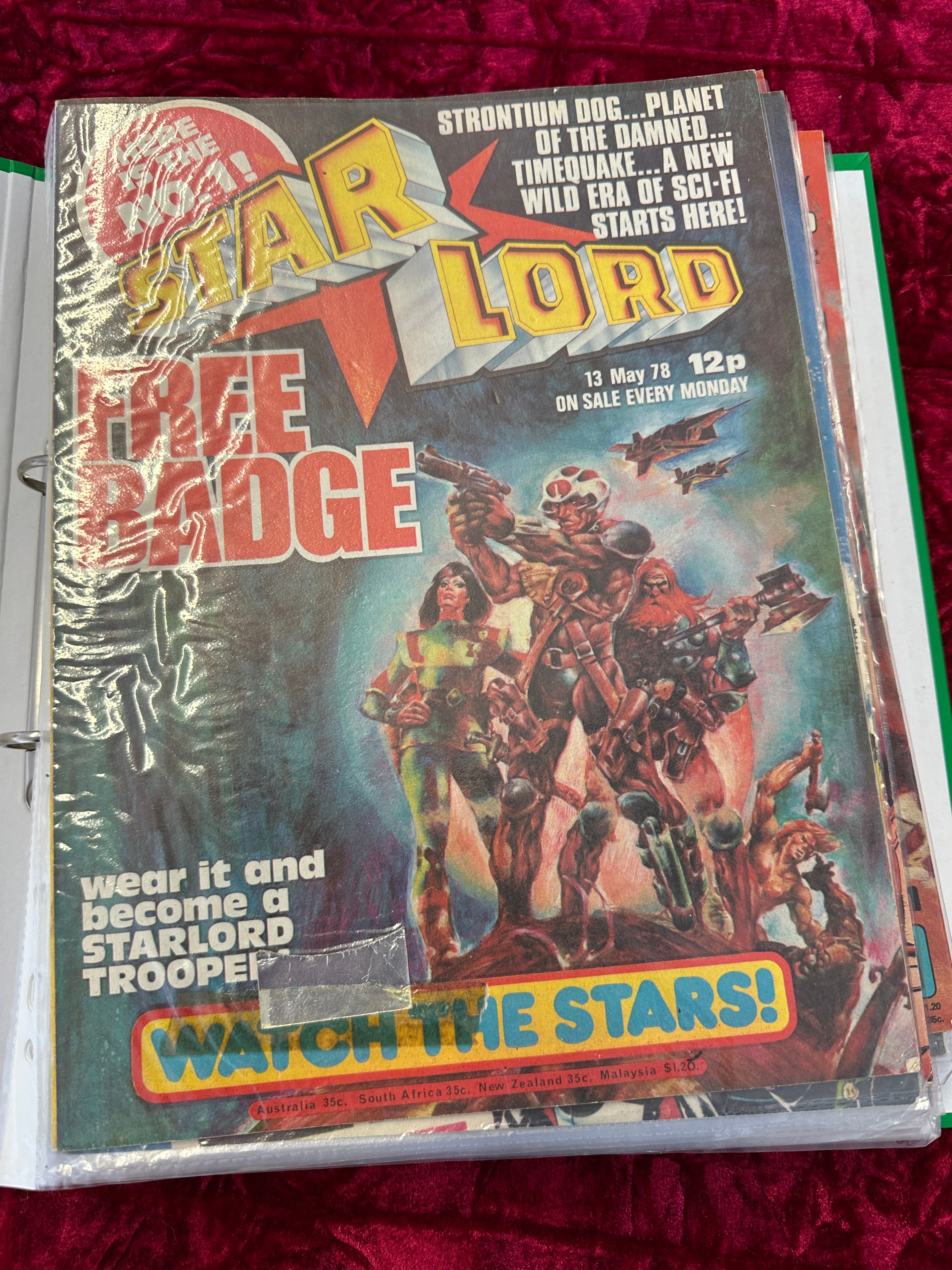 A collection of vintage science fiction comic magazines from the ‘STAR LORD’ series, published by IPC in 1978. The lot comprises multiple issues, with visible dates such as ’13 May 78′ and ’17 June 78′. Printed on paper, the comics feature colorful, action-packed cover illustrations in a classic science fiction style, depicting futuristic warriors, spaceships, and alien beings. Visible story titles include “Strontium Dog”, “Timequake”, and “Interstellar Federation Invasion Begins!”. Original pricing information such as “12p” and various international equivalents is present. The magazines are individually stored within clear plastic sleeves and organized in a green three-ring binder.