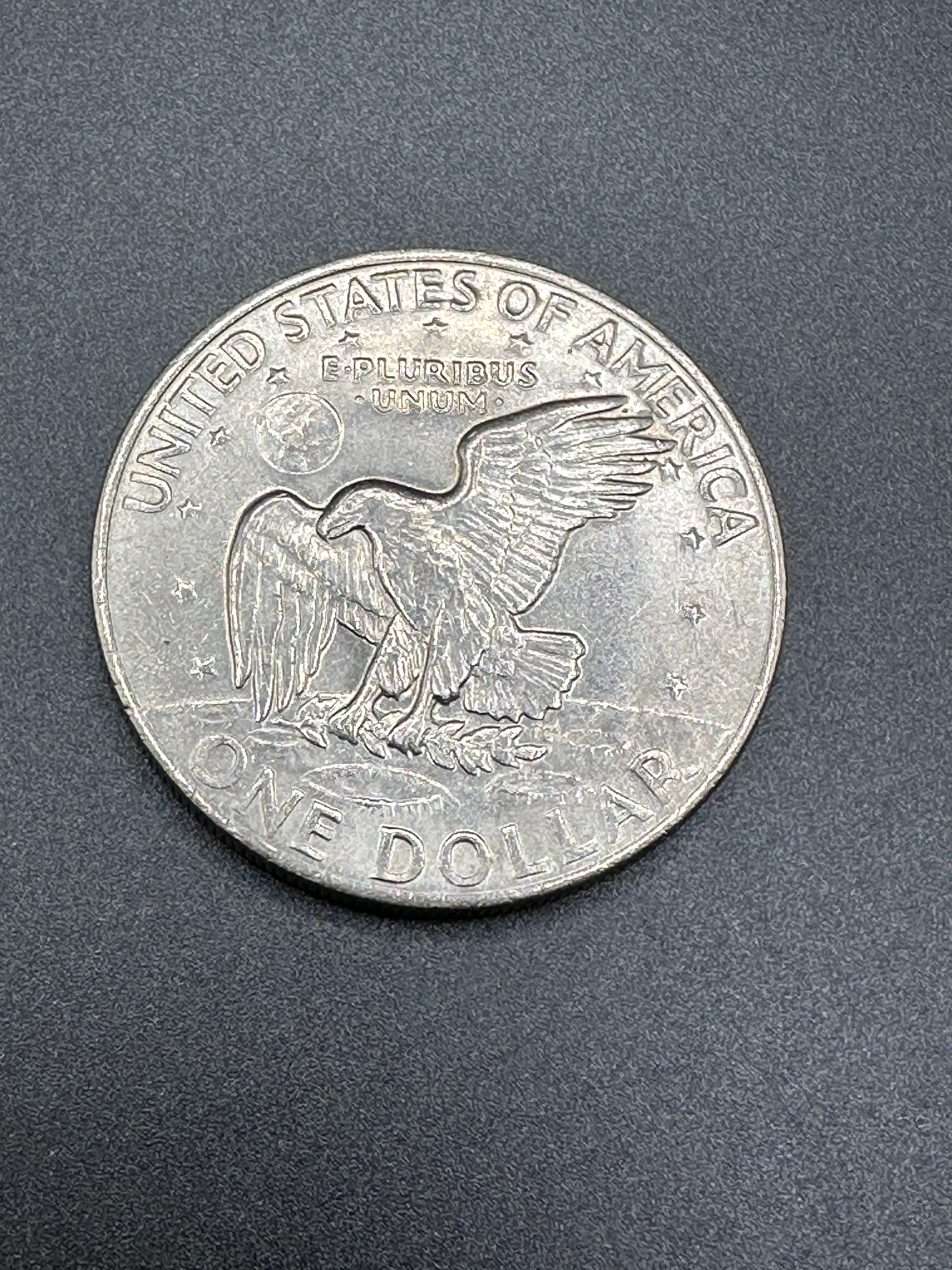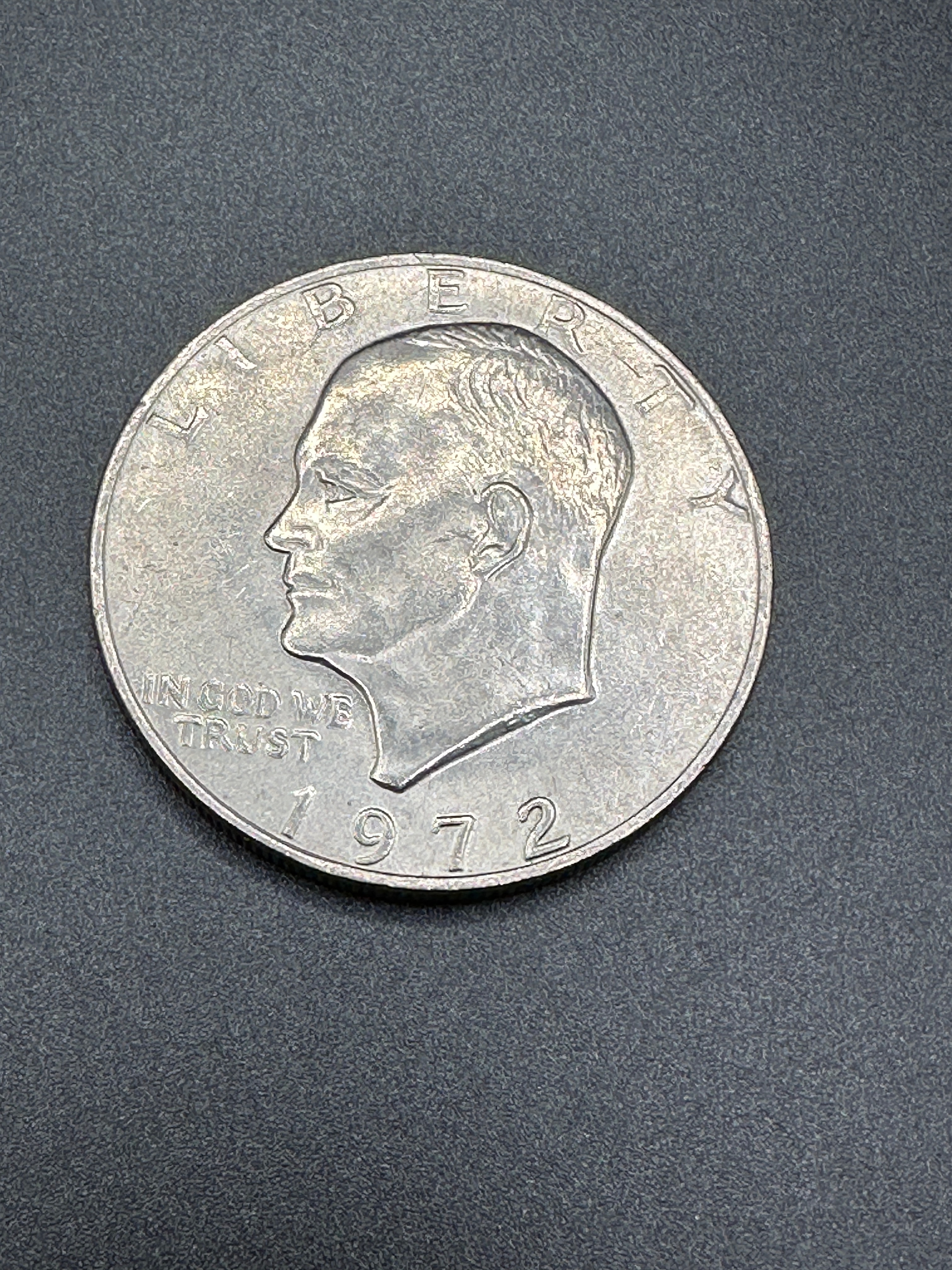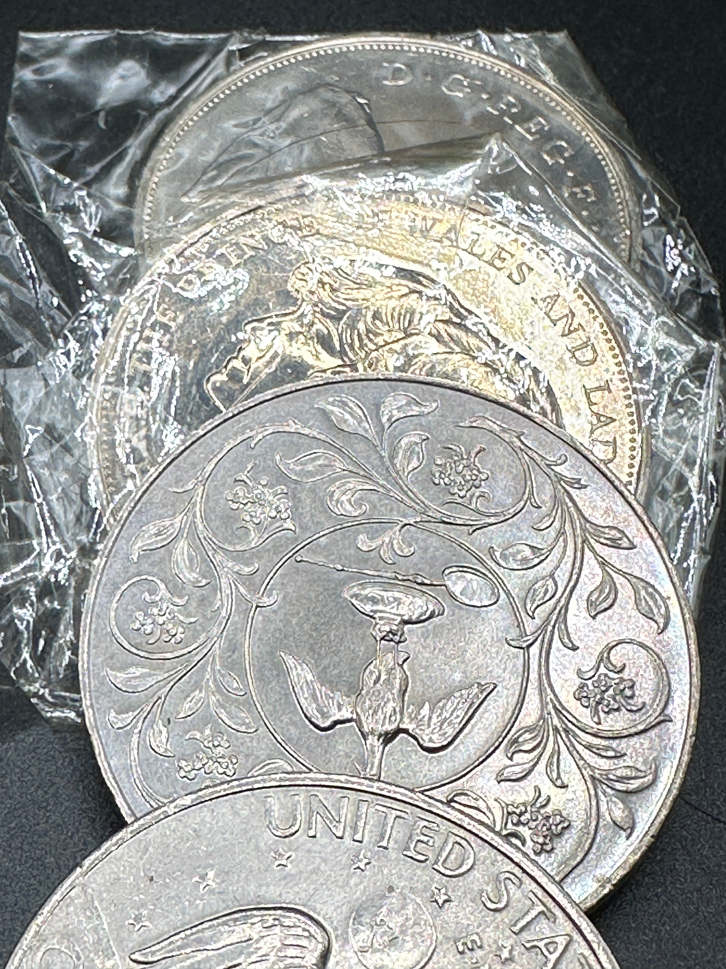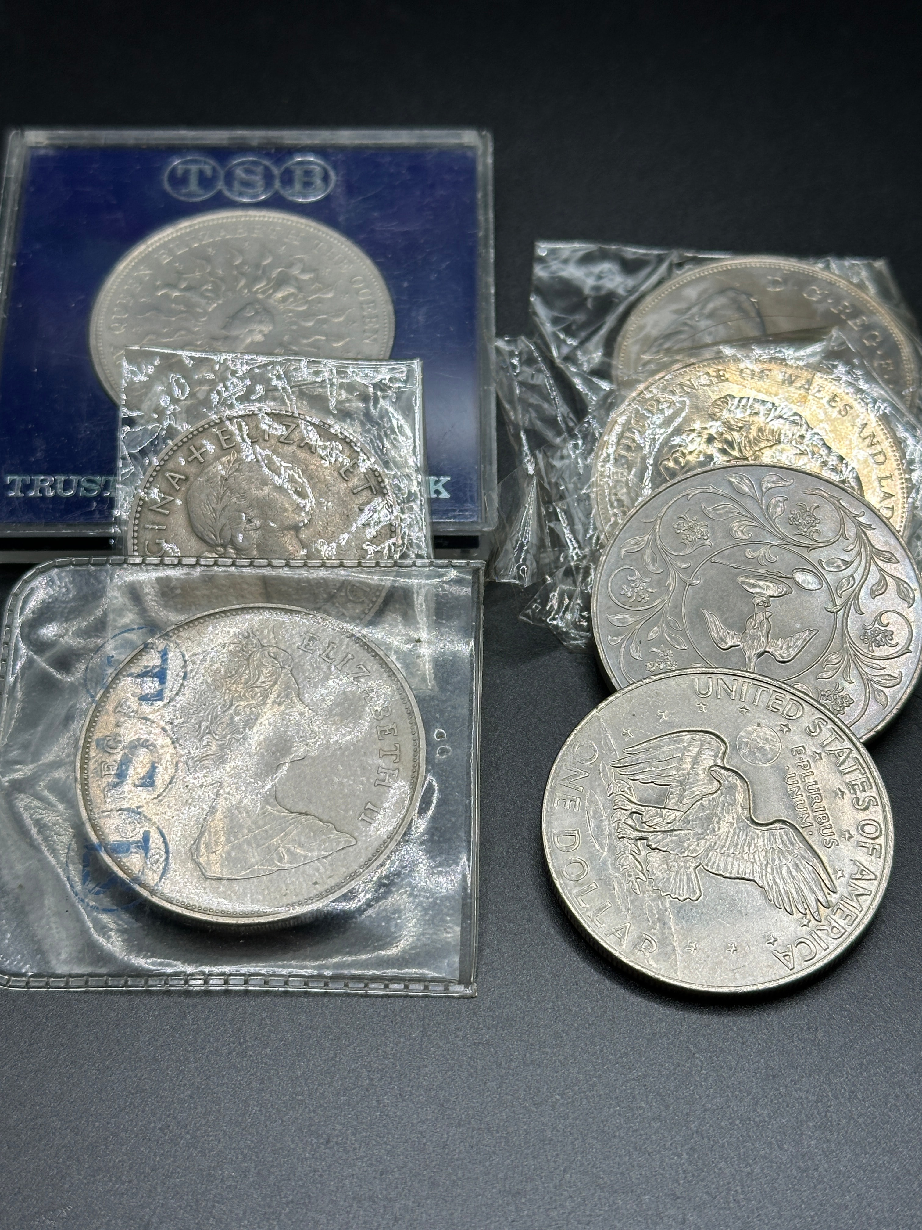 A collection of modern circular metallic coins and medallions, prominently featuring a Type 3 1972 United States One Dollar coin. This coin depicts President Eisenhower’s profile on the obverse, inscribed with “LIBERTY” and “IN GOD WE TRUST,” and an eagle landing on the moon on the reverse, marked “UNITED STATES OF AMERICA,” “E PLURIBUS UNUM,” and “ONE DOLLAR.” This specific 1972 coin does not bear a mint mark. The collection also includes a silver-toned medallion featuring intricate floral scrollwork and a central dove motif; a coin bearing the effigy of Queen Elizabeth II, inscribed “ELIZABETH II D G REG F D”; and a partially visible piece referencing “PRINCE OF WALES.” Many items are preserved in clear plastic sleeves or blue cardboard holders, indicating varied preservation efforts. The apparent material for most pieces is a silver-colored alloy.