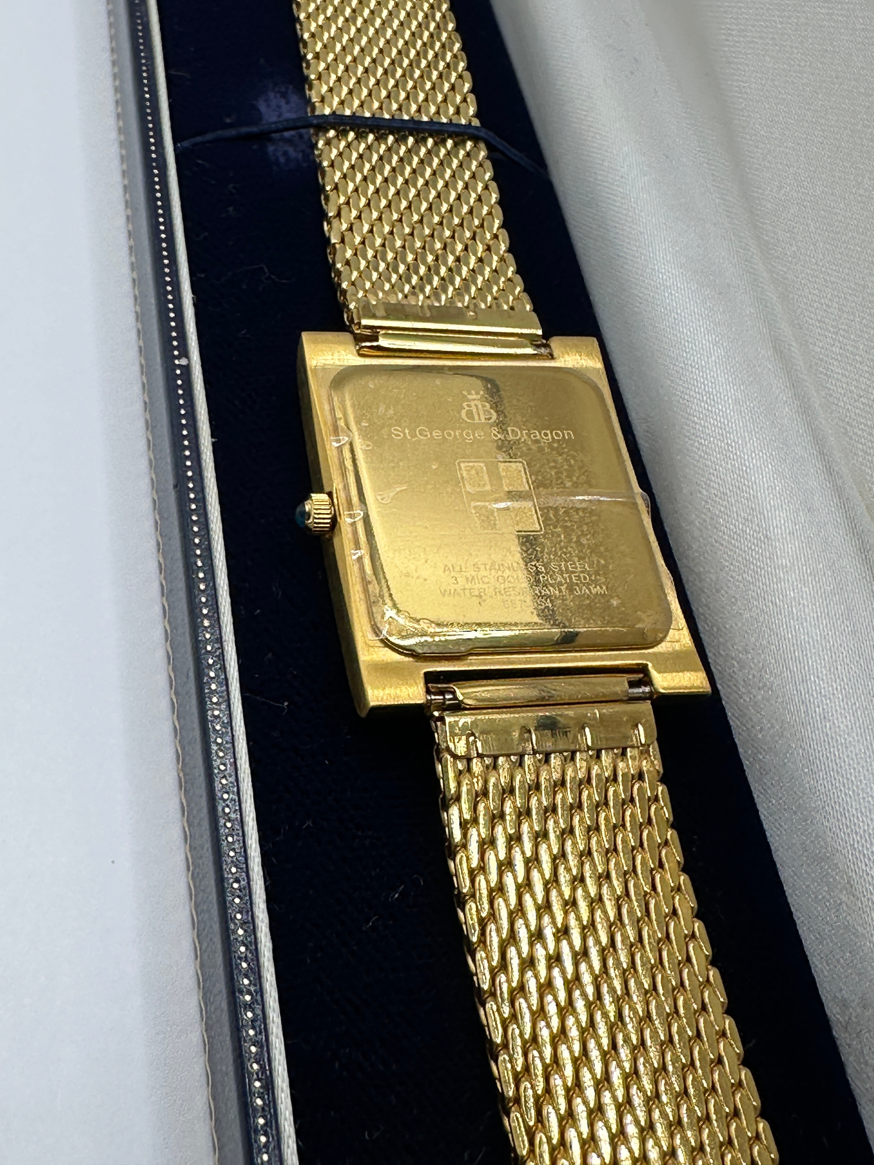 A Brooks & Bentley St. George & Dragon 3 Mic Gold Plated Quartz Wristwatch, presented in its original blue and cream-lined box, which is marked “BROOKS & BENTLEY” in gold lettering. The rectangular watch features a black dial with a prominent raised gold-tone relief depicting St. George and the Dragon, complemented by four small clear stones and a date window displaying ’23’. It is fitted with a matching gold-tone mesh bracelet secured by a fold-over clasp. The case back is engraved with “St. George & Dragon,” an ornate monogram, “ALL STAINLESS STEEL BACK,” “QUARTZ,” and “WATER RESISTANT 3ATM.” The item’s materials are confirmed to be All Stainless Steel, 3 Mic Gold Plated, and it is Water Resistant 3ATM.