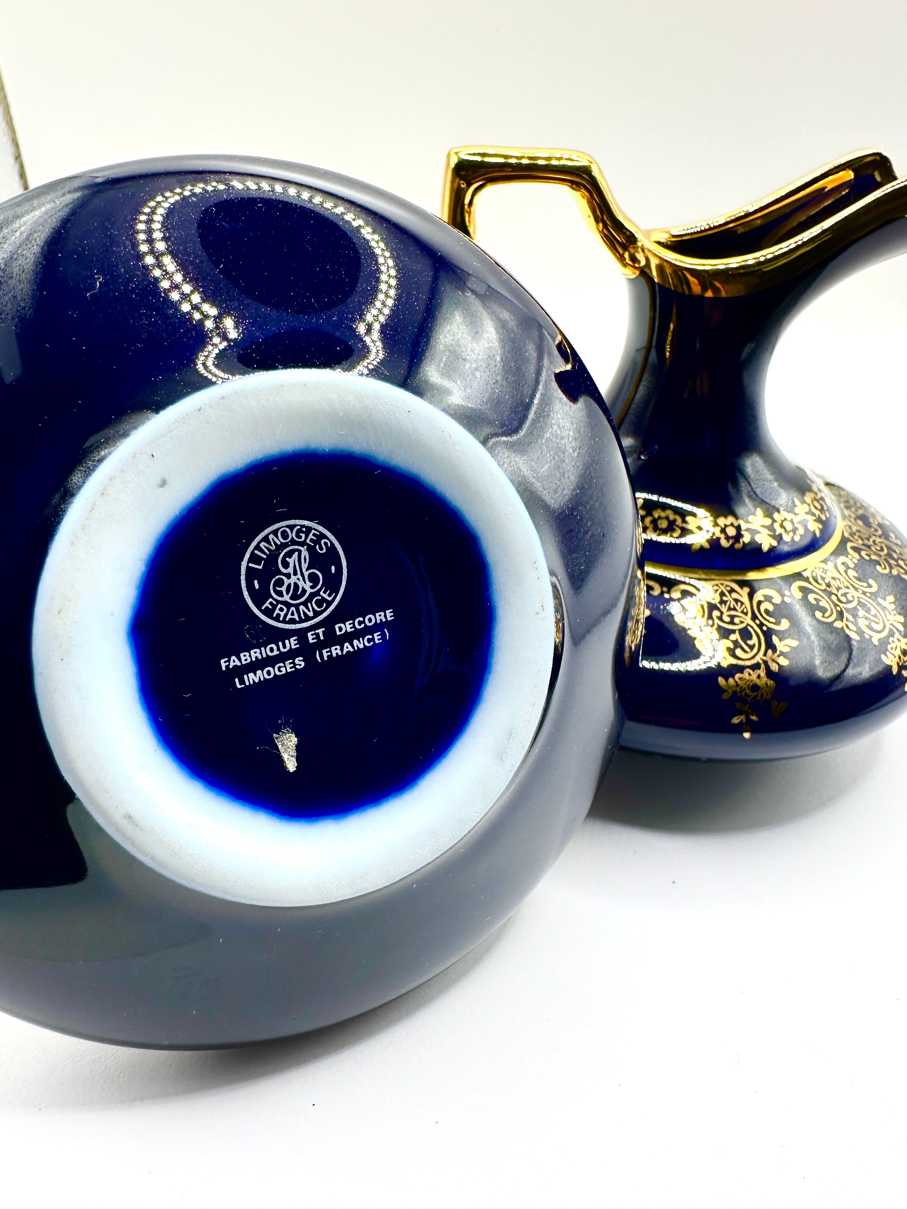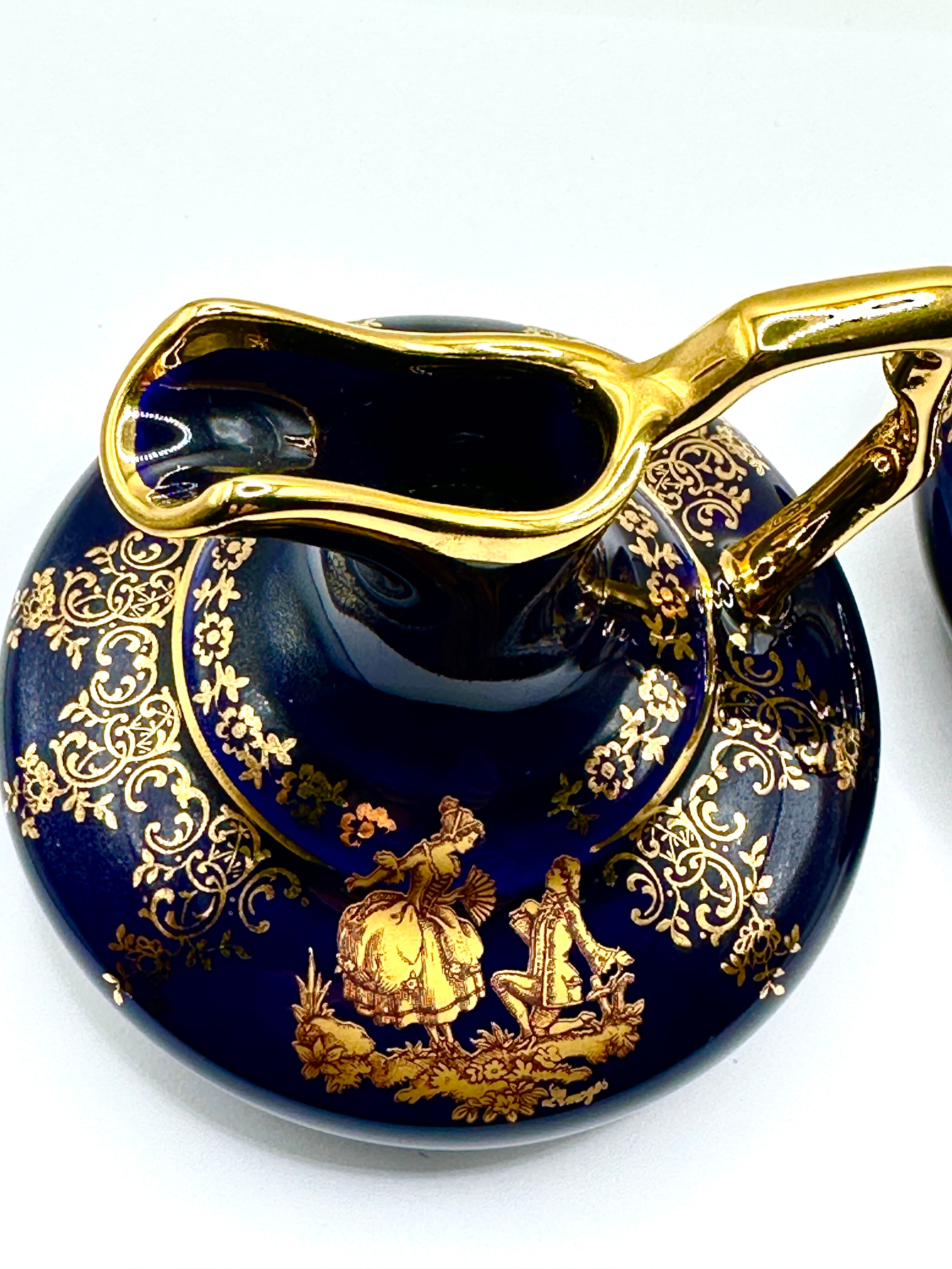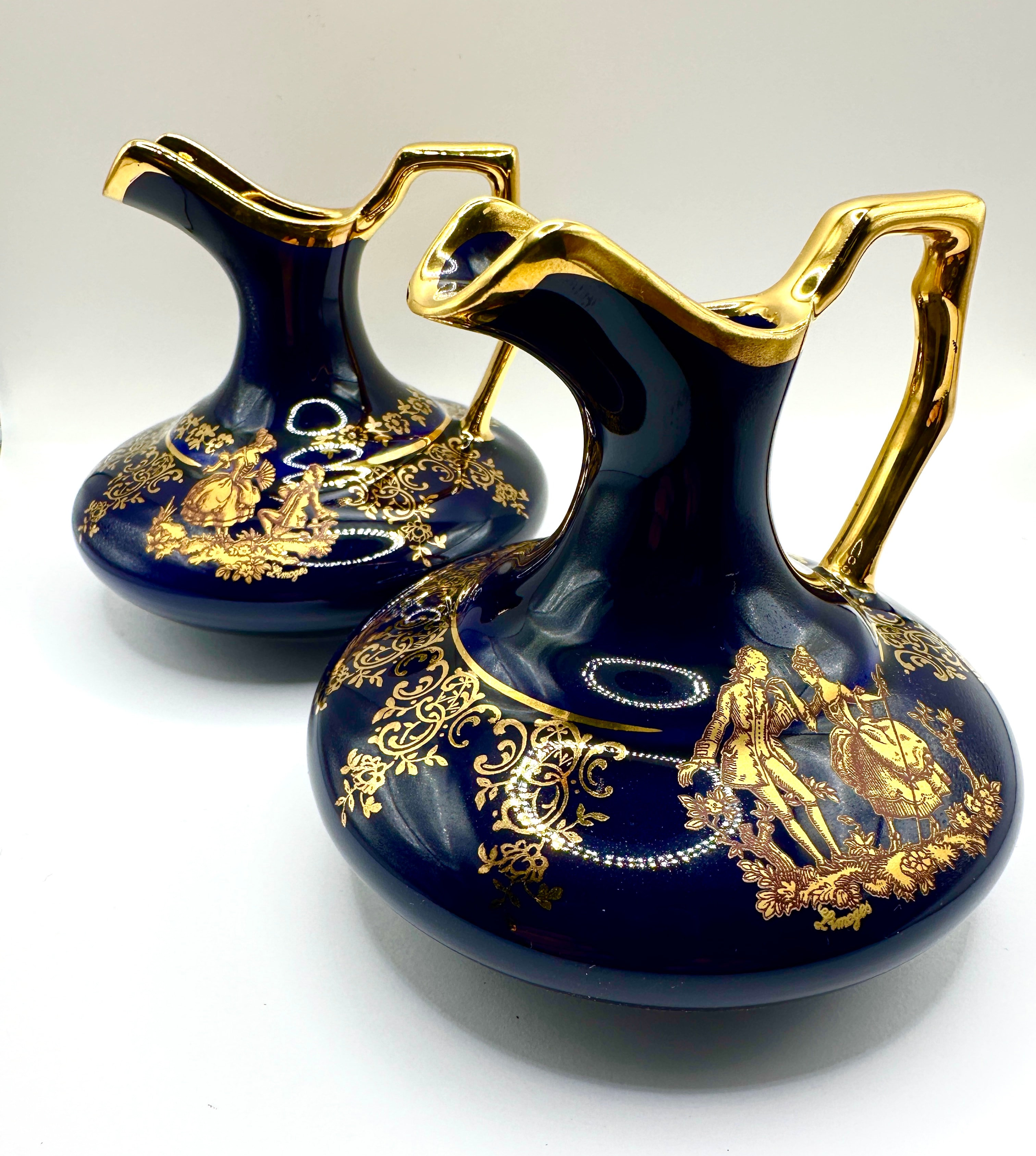 A pair of Limoges, France, cobalt blue and gold miniature jug pitchers. Each features a bulbous body, narrow neck, prominent spout, and an ornate, fully gilded handle. The items are finished in a rich, dark cobalt blue glaze, extensively decorated with intricate gold gilding. The decoration includes rococo-inspired scrollwork, floral motifs, and figural scenes depicting elegantly dressed couples in pastoral settings. Visible markings on the base of one piece include a circular monogram, “LIMOGES,” “FRANCE,” and “FABRIQUE ET DECORE LIMOGES (FRANCE),” which translates to “MANUFACTURED AND DECORATED LIMOGES (FRANCE).” The word “Limoges” is also present in gold script within the side decoration.