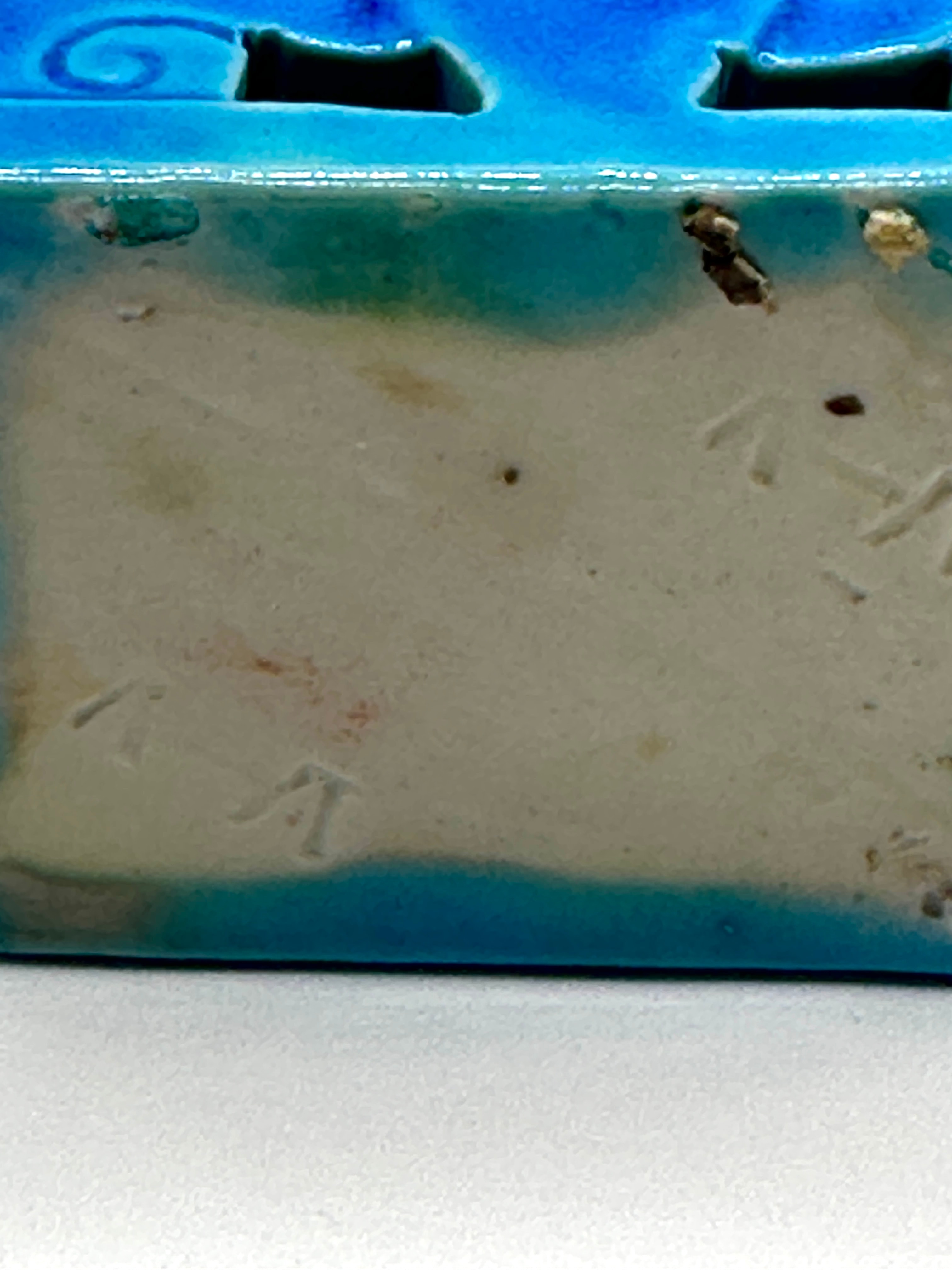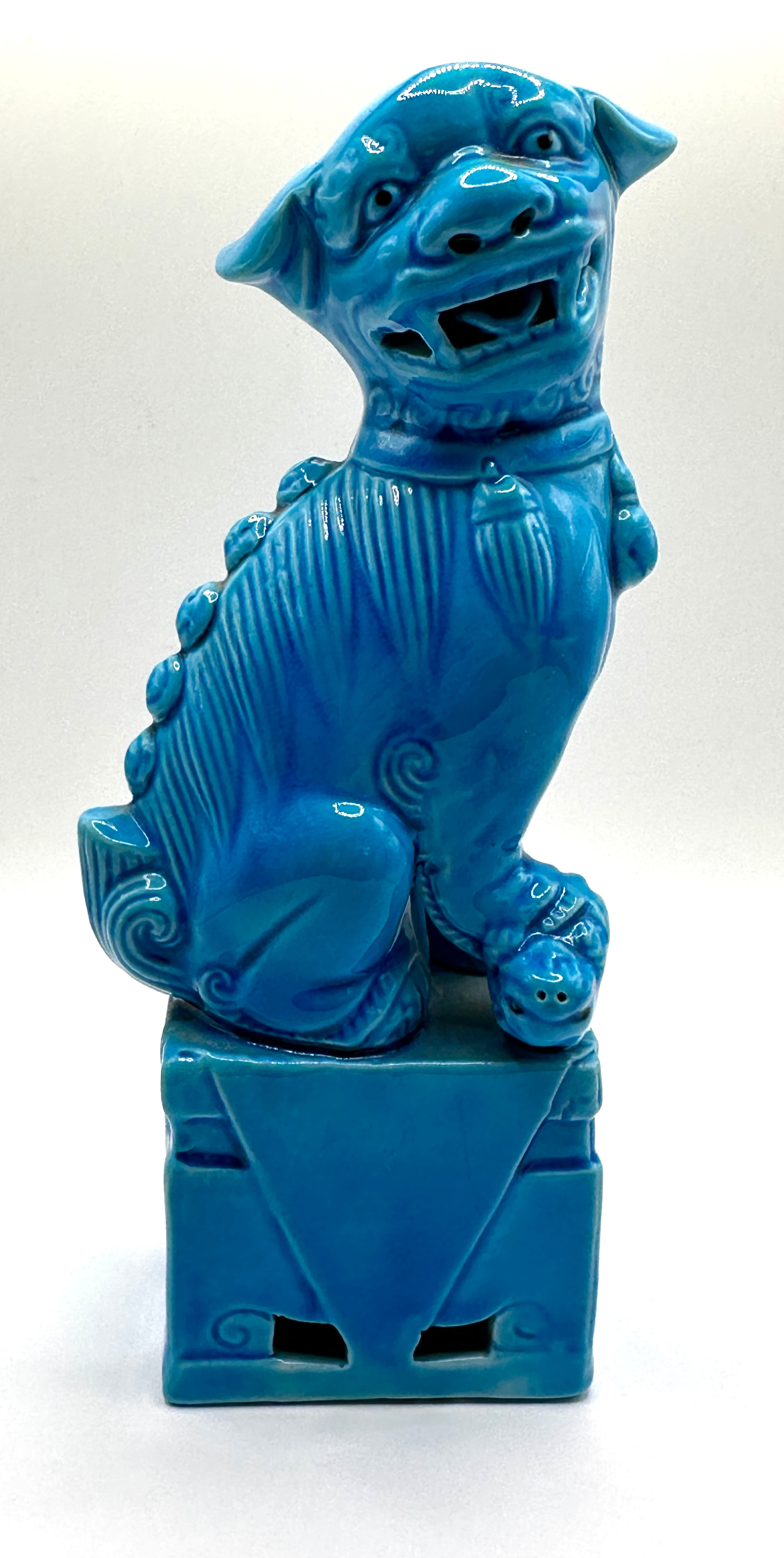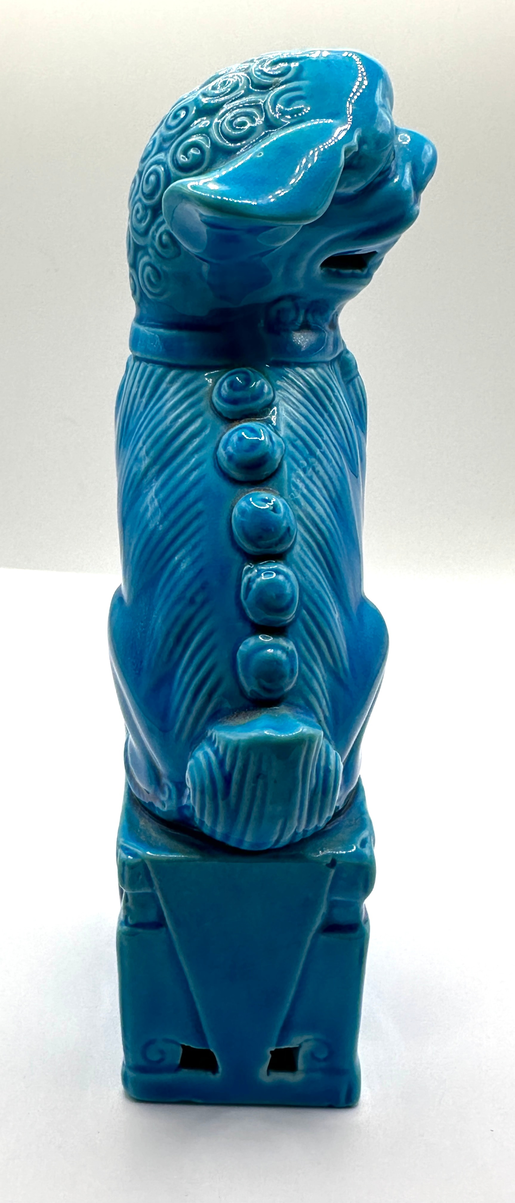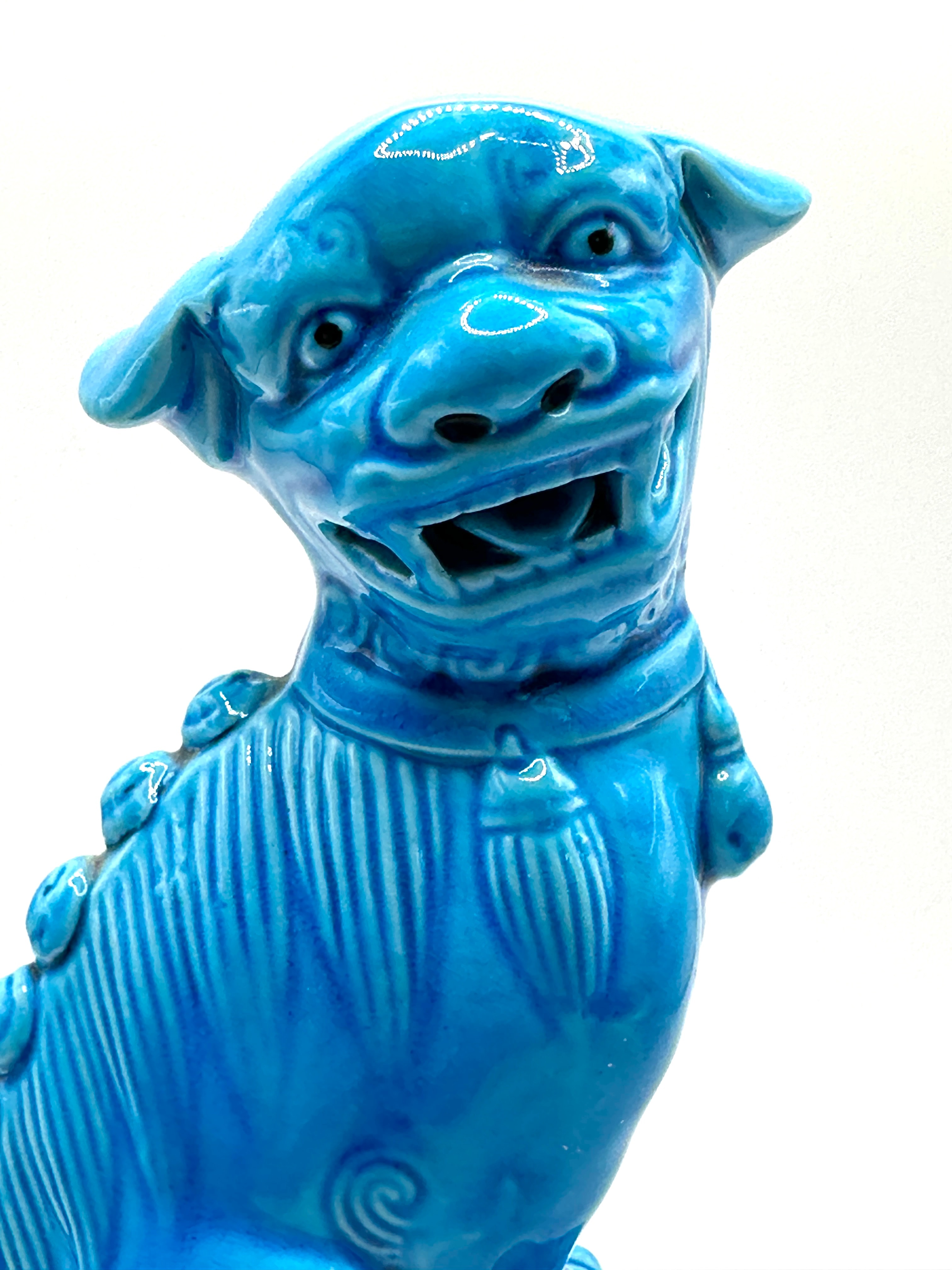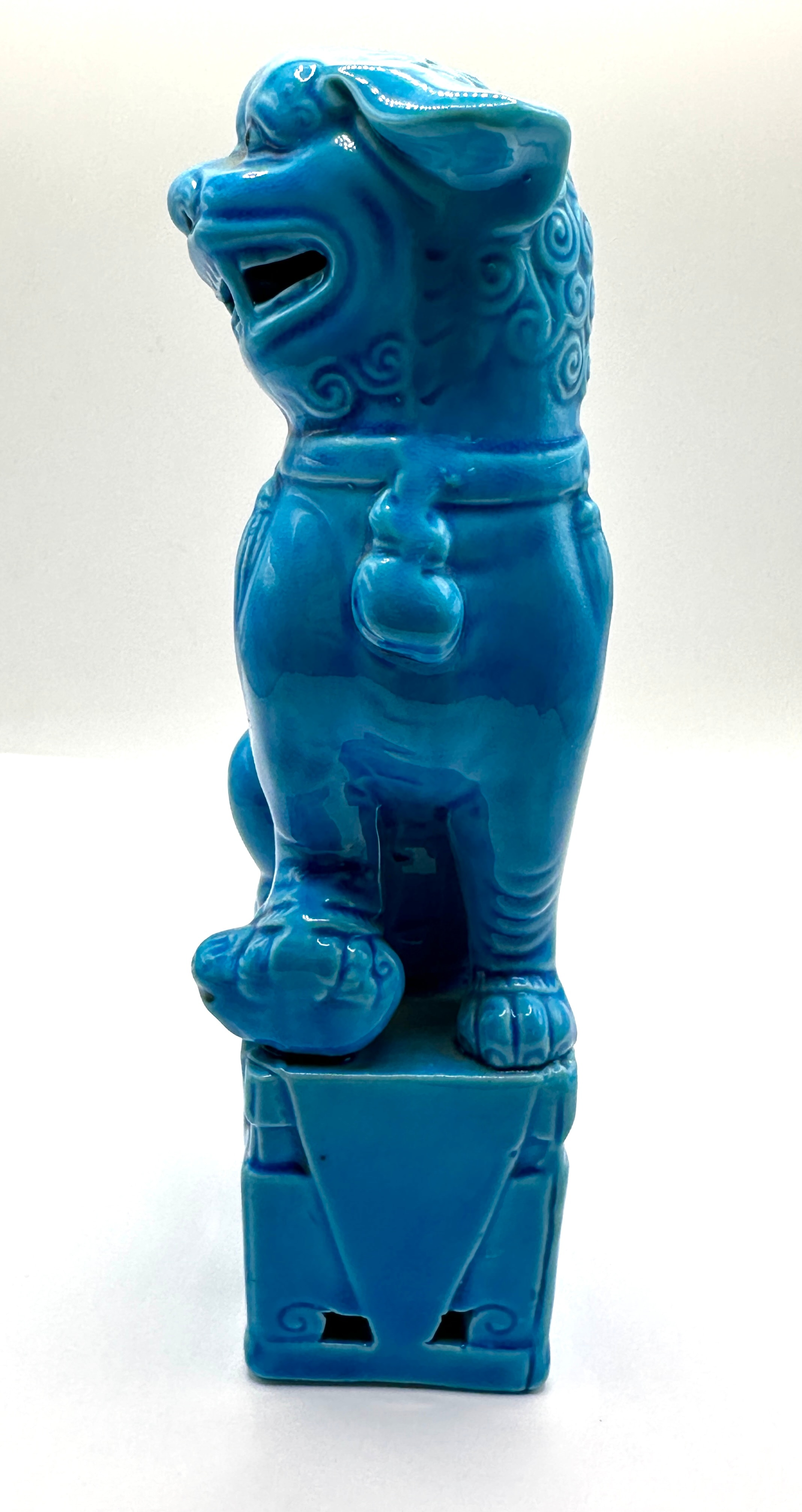 A single ceramic figurine depicting a mythical creature, likely a “Foo Dog” or guardian lion, presented in a traditional East Asian style. It is rendered in a vibrant, high-gloss turquoise-blue monochrome glaze, exhibiting subtle crackle. The creature is depicted seated on an integral rectangular pedestal base, featuring stylized fur, an open mouth, and a fierce expression, with one paw resting on a sphere or object. The material is glazed ceramic or porcelain, evident from the unglazed white biscuit visible on the base. The base reveals indistinct impressed markings or characters on the unglazed portion, including what appears to be the Chinese character “八” (bā – eight).