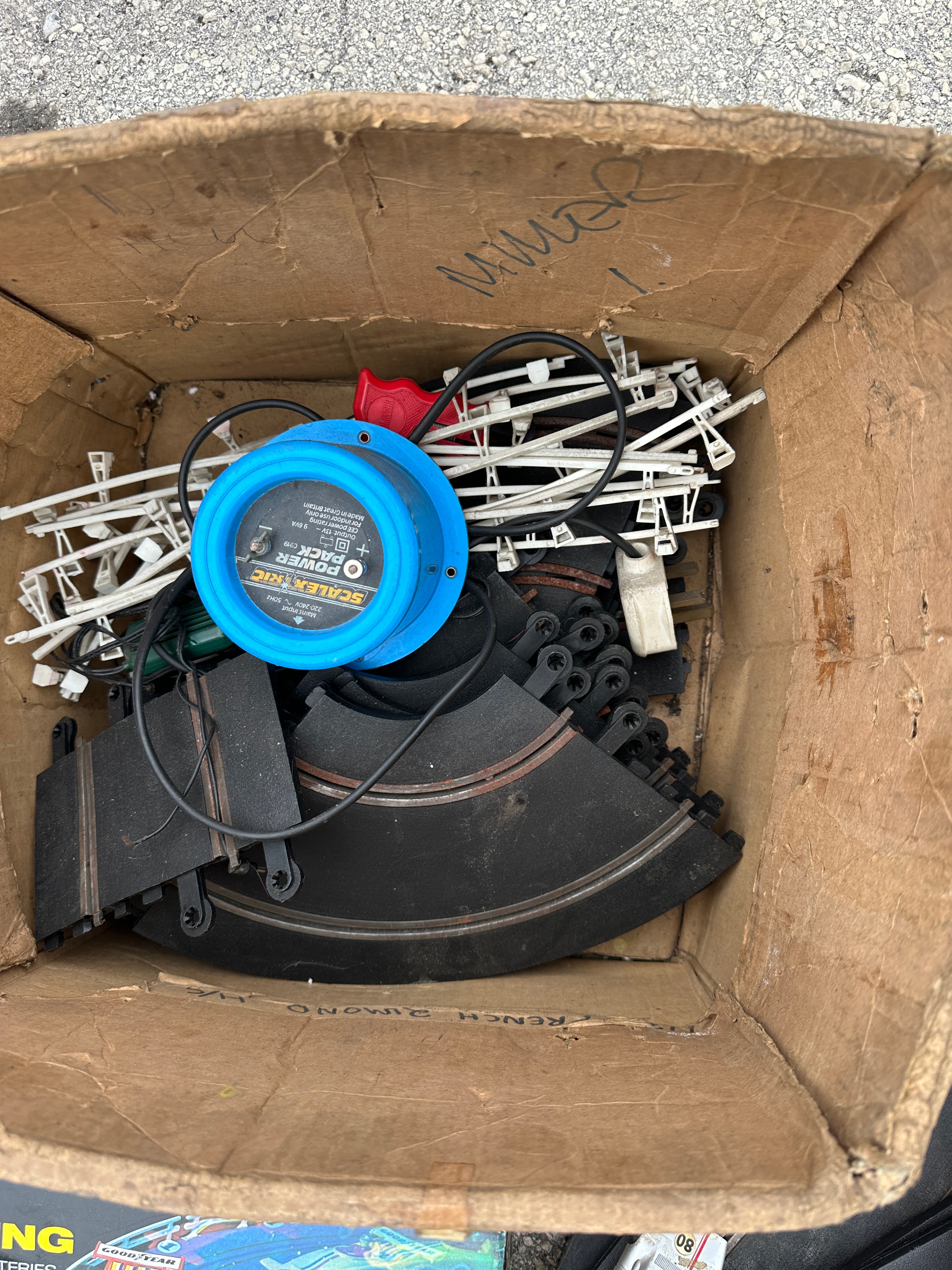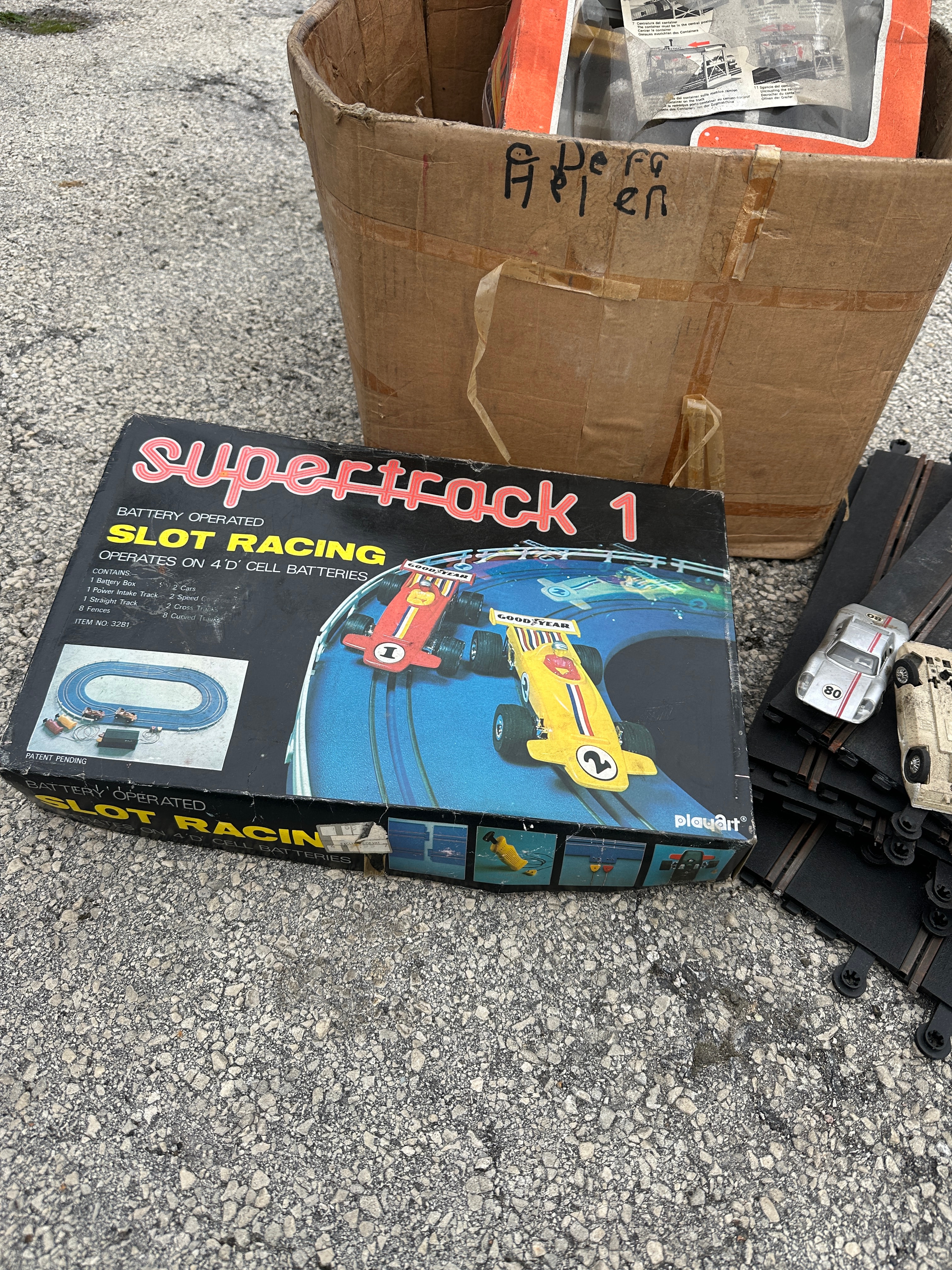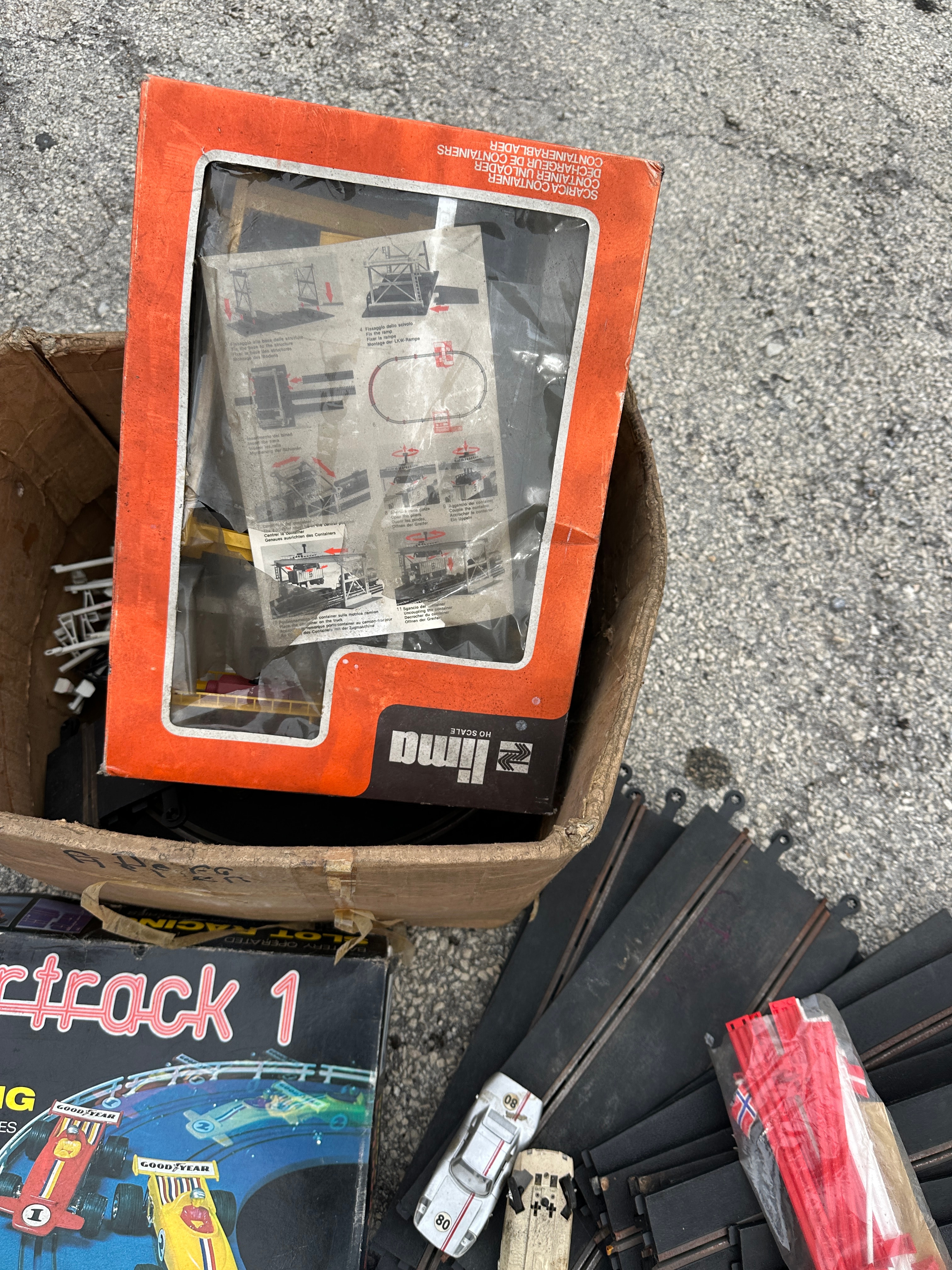A collection of vintage slot car racing track and accessories, primarily from the 1960s, featuring components from various manufacturers including Eldon and Scalextric. The lot comprises numerous track segments, both straight and curved, constructed from molded black plastic, along with two visible slot cars, various plastic guard rails, support pieces, and associated wiring. A blue “SCALEXTRIC POWER PACK” is included. Original packaging identifies a “Supertrack 1 Slot Racing” set by “playart” (Item No. 3281) and a “Lima HO SCALE” box, which includes Italian text stating “Scatola contenente curve e rallentatori con barriere laterali” (Box containing curves and slowdowns with side barriers). The collection is housed in a large cardboard storage box with handwritten names, including “Miller.”