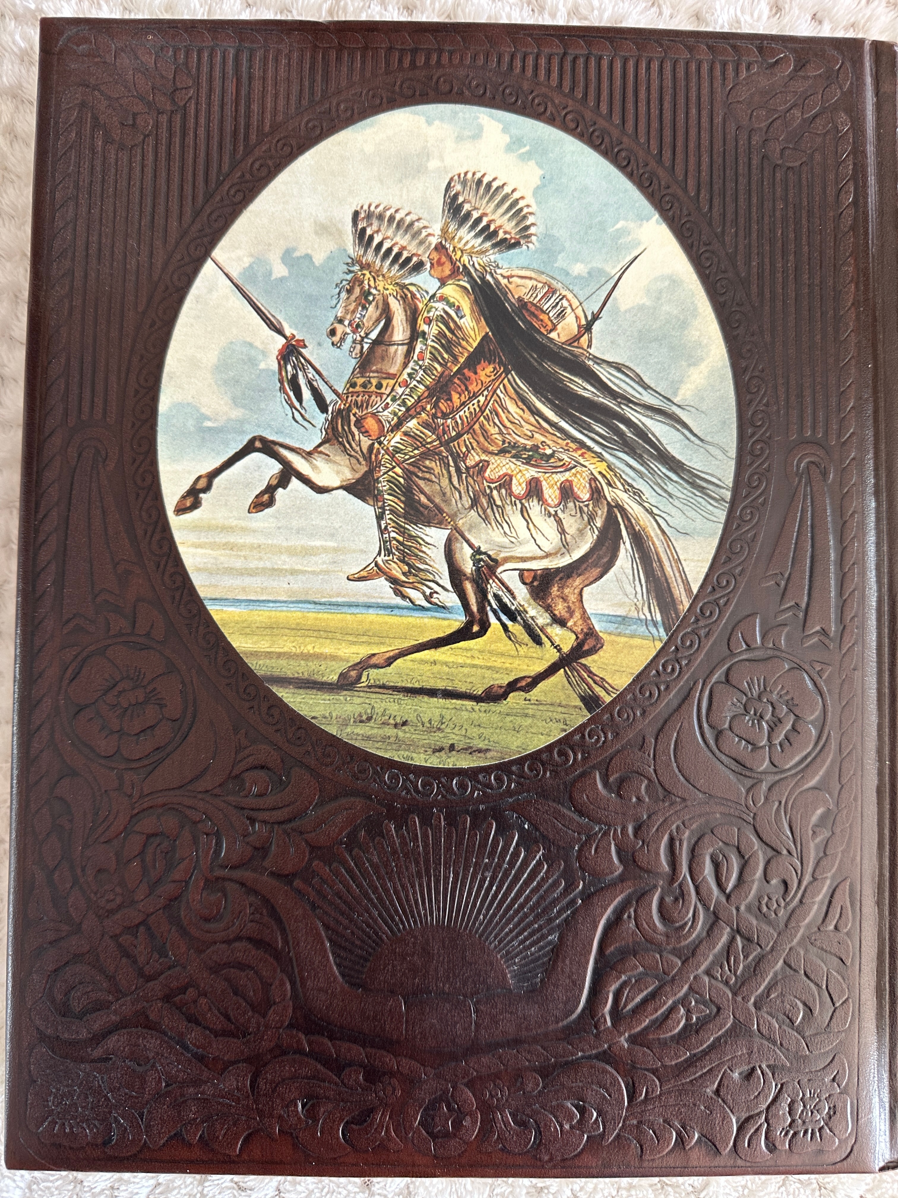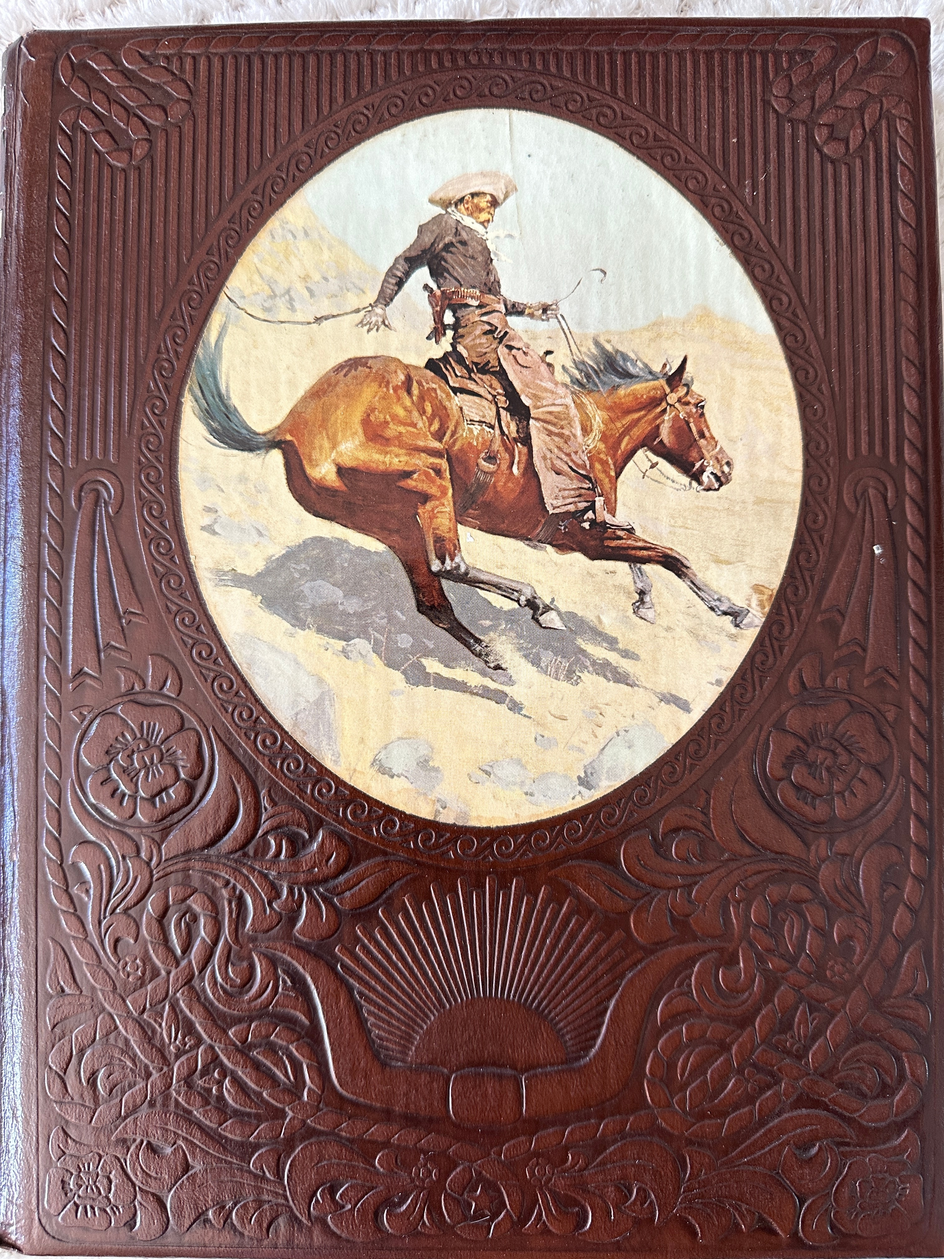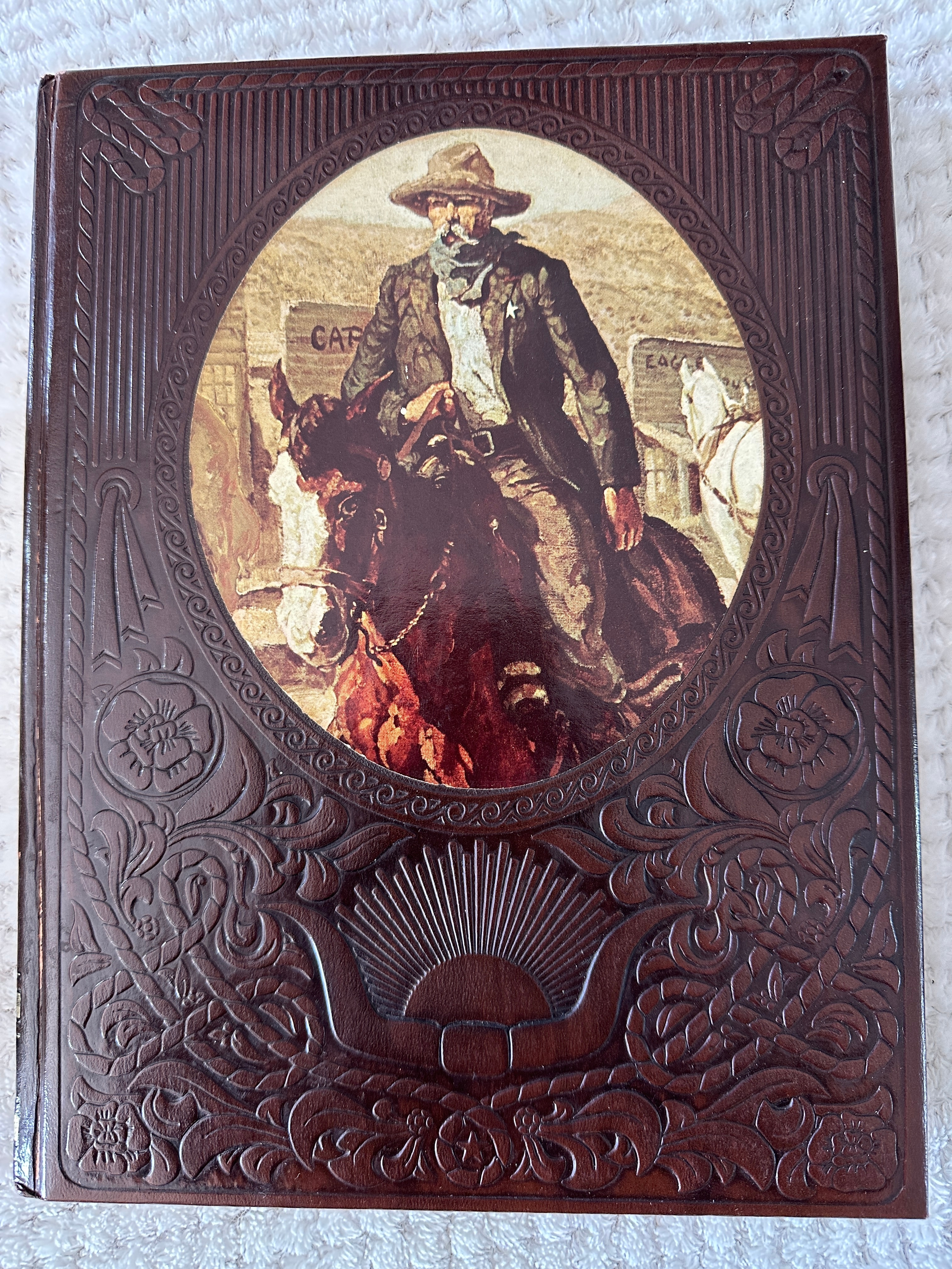A set of six volumes from the Time Life Books ‘The Old West’ series. Each volume features a sturdy, dark brown faux leather embossed hardcover binding, adorned with intricate scrollwork, floral motifs, and a central oval illustration depicting scenes and figures pertinent to the American Old West. The spines are consistently titled “THE OLD WEST” at the top and “TIME LIFE BOOKS” at the bottom in gold lettering. Individual volume titles included in this set are “THE RAILROADERS,” “THE INDIANS,” “THE COWBOYS,” “THE GREAT CHIEFS,” “THE GUNFIGHTERS,” and “THE TRAILBLAZERS.”