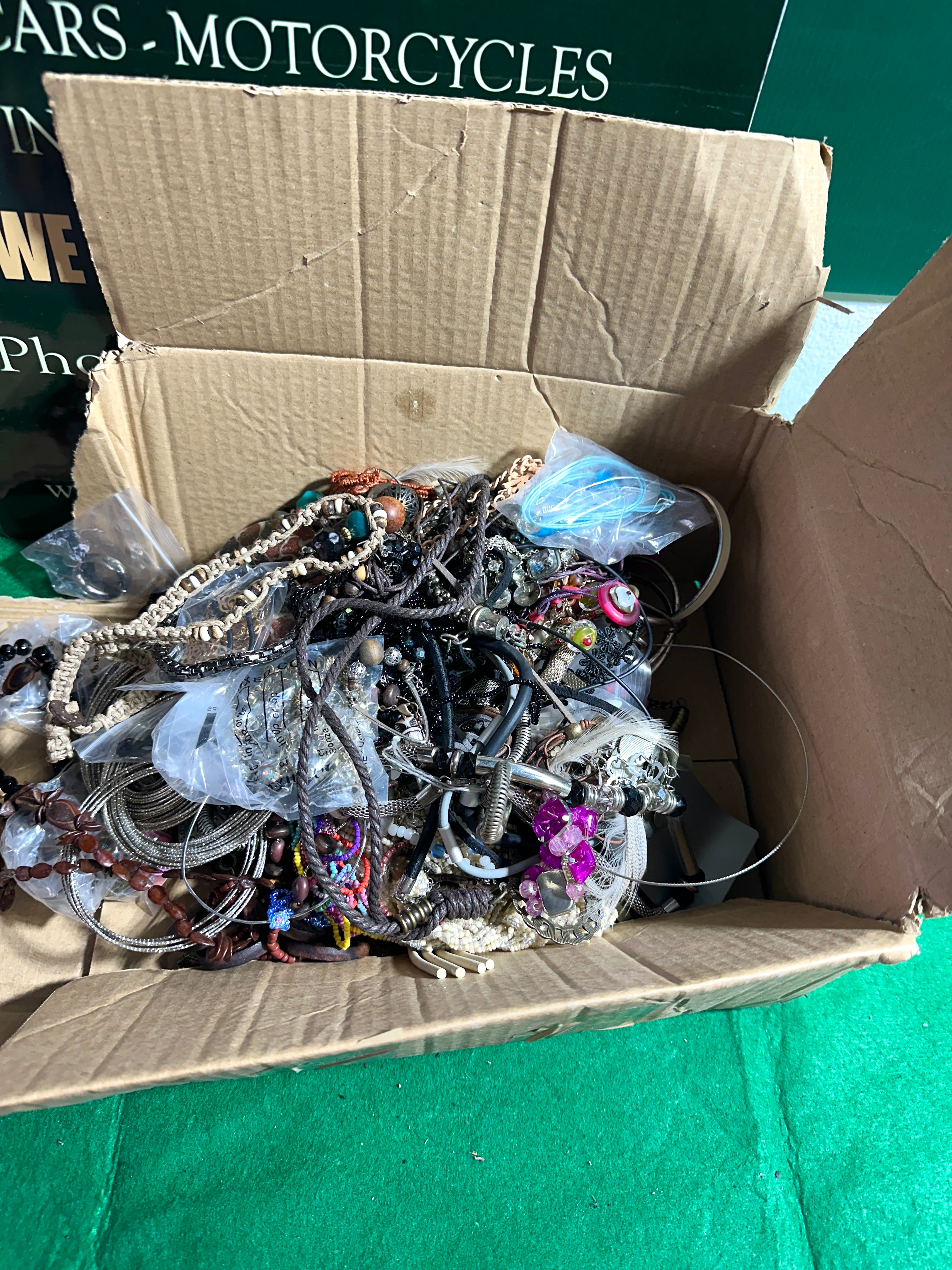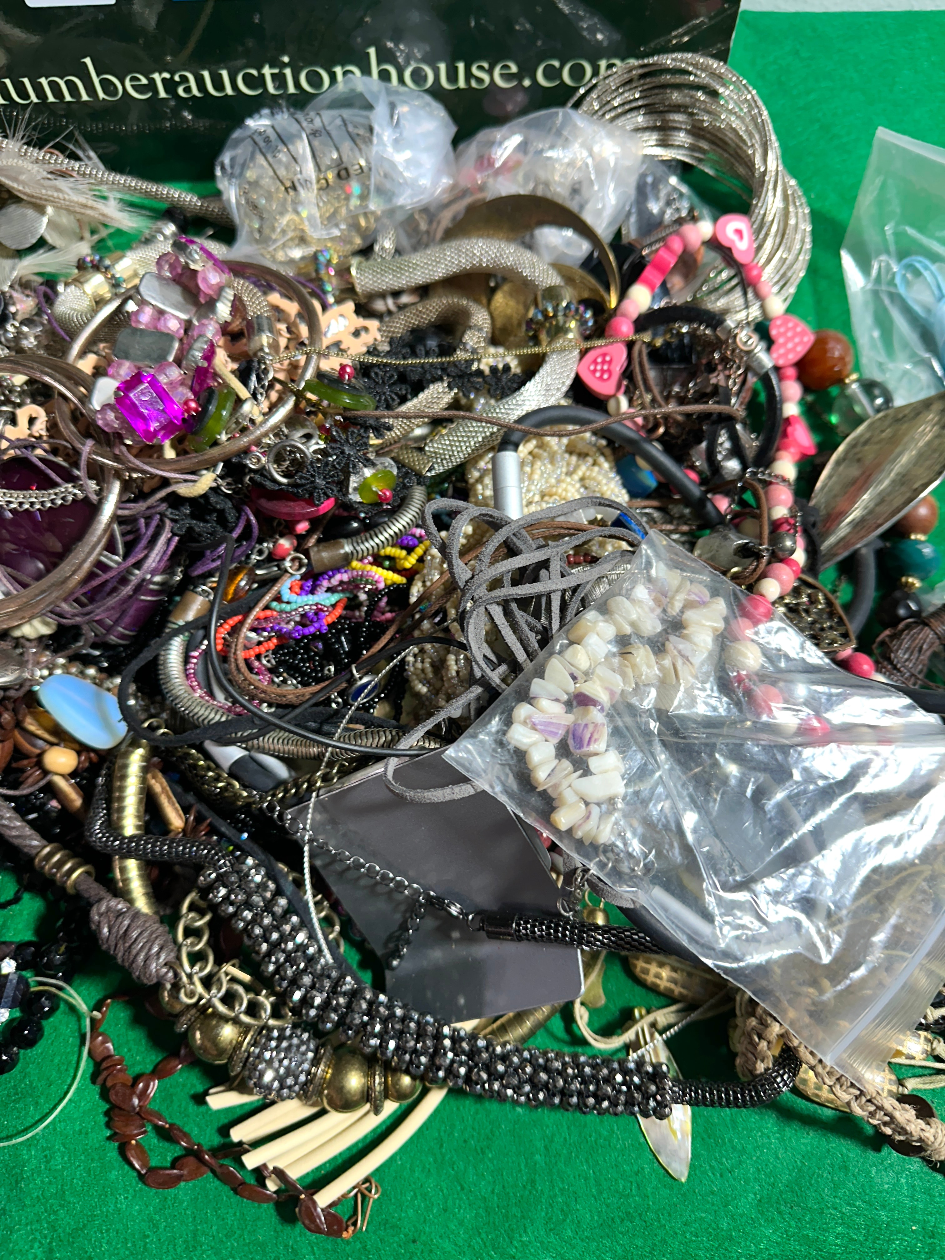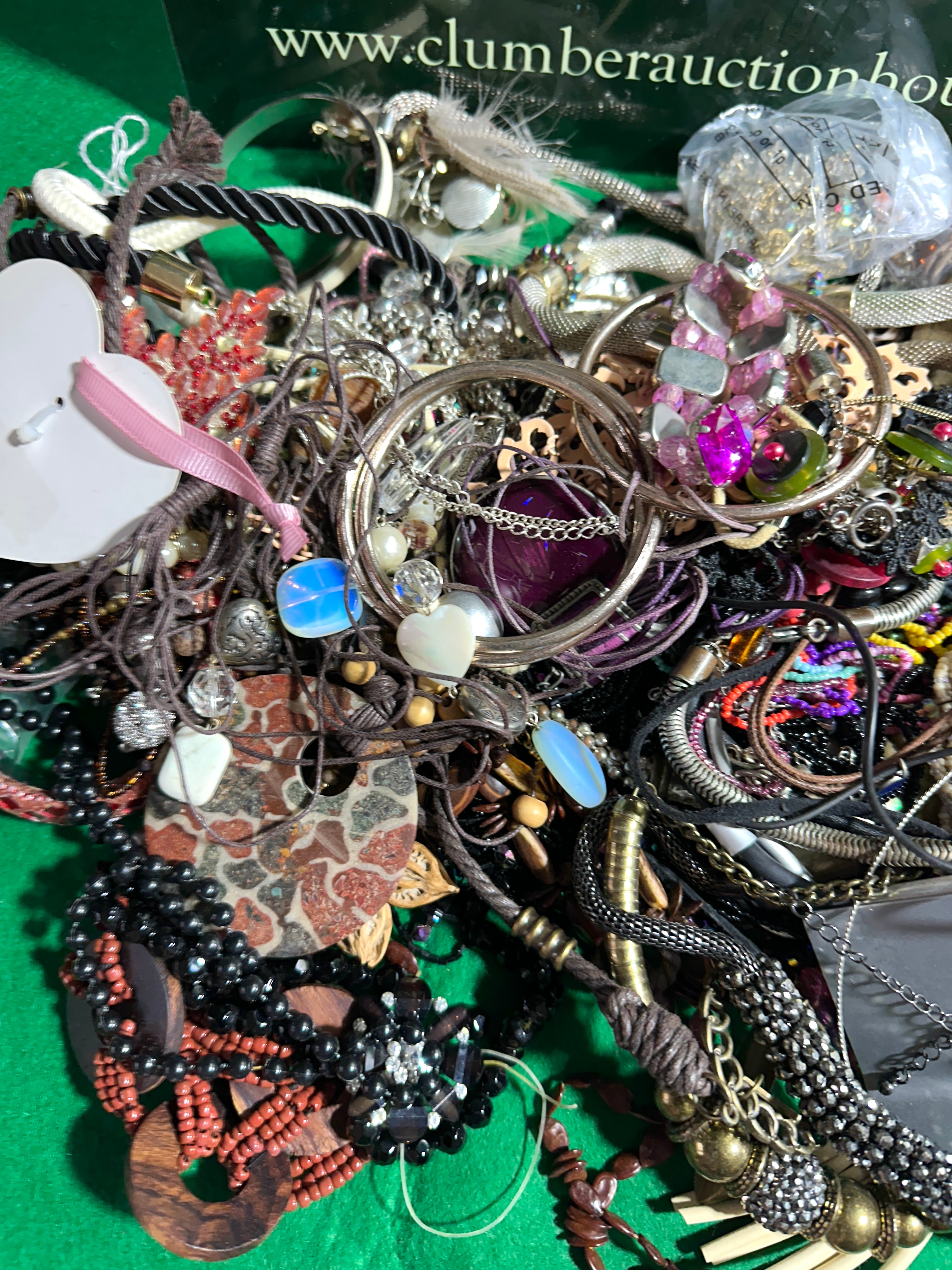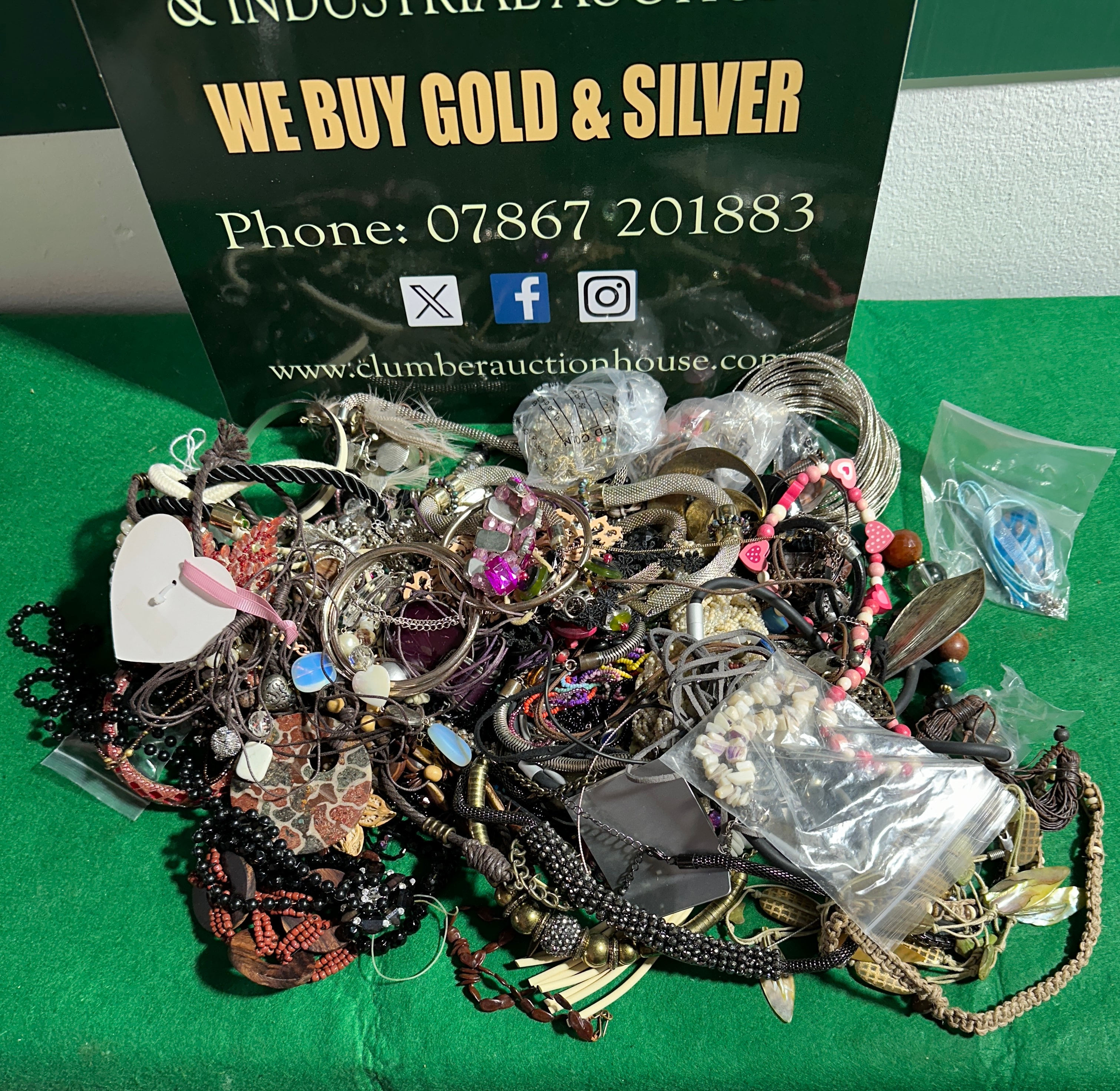 A large, unsorted collection of mixed costume jewelry, comprising various necklaces, bracelets, earrings, and other personal adornments. The items display an eclectic range of styles, from contemporary fashion to possibly vintage designs, suggesting a period spanning the late 20th to early 21st centuries. Materials observed include diverse metals (silver-tone, gold-tone, bronze-tone), plastic and glass beads, natural stones, wood, shells, fabric cords, and rhinestones. No specific manufacturer’s marks or identifying text are visible on the jewelry itself. The lot originates from Clumber Auction House, as indicated by a partially visible background sign.