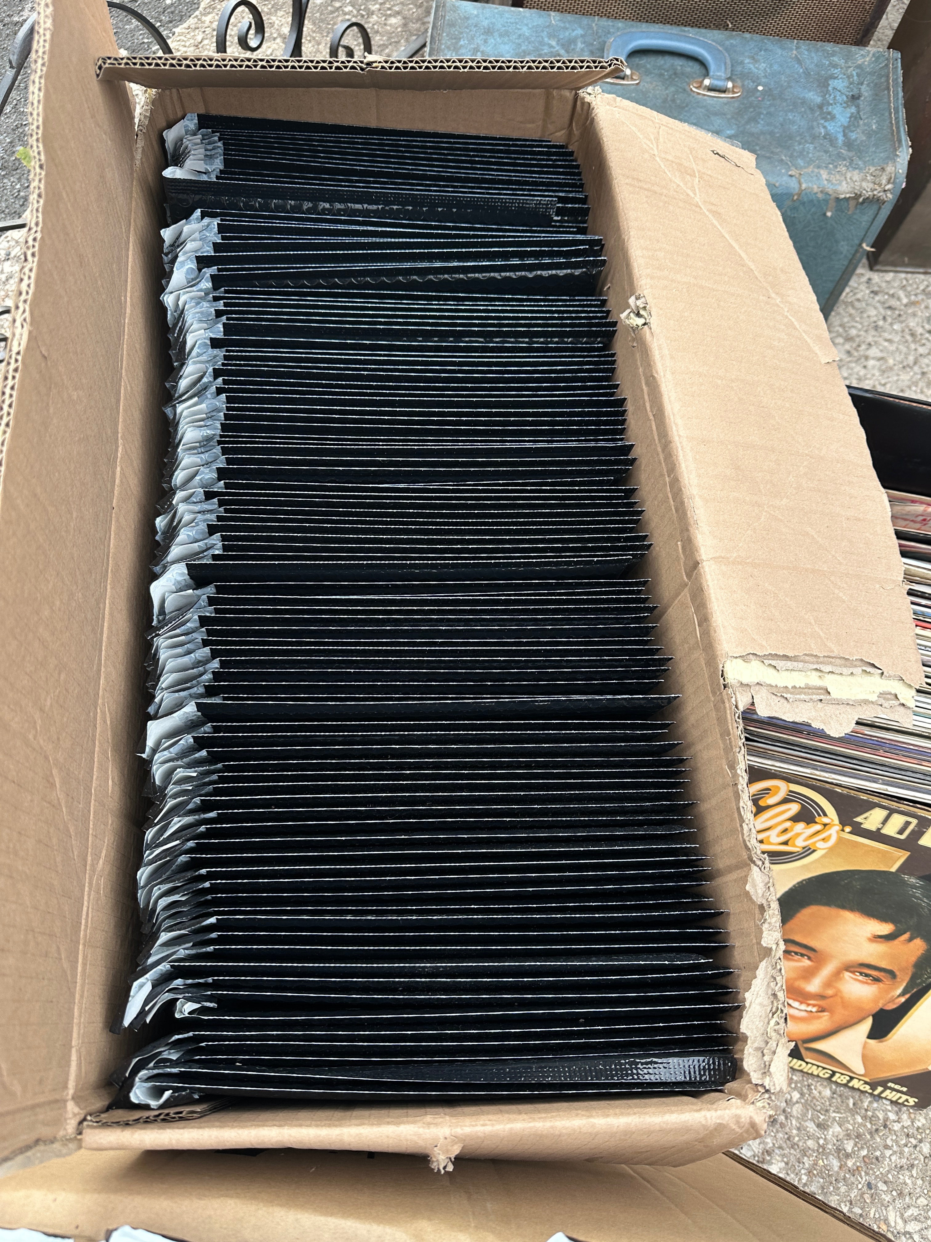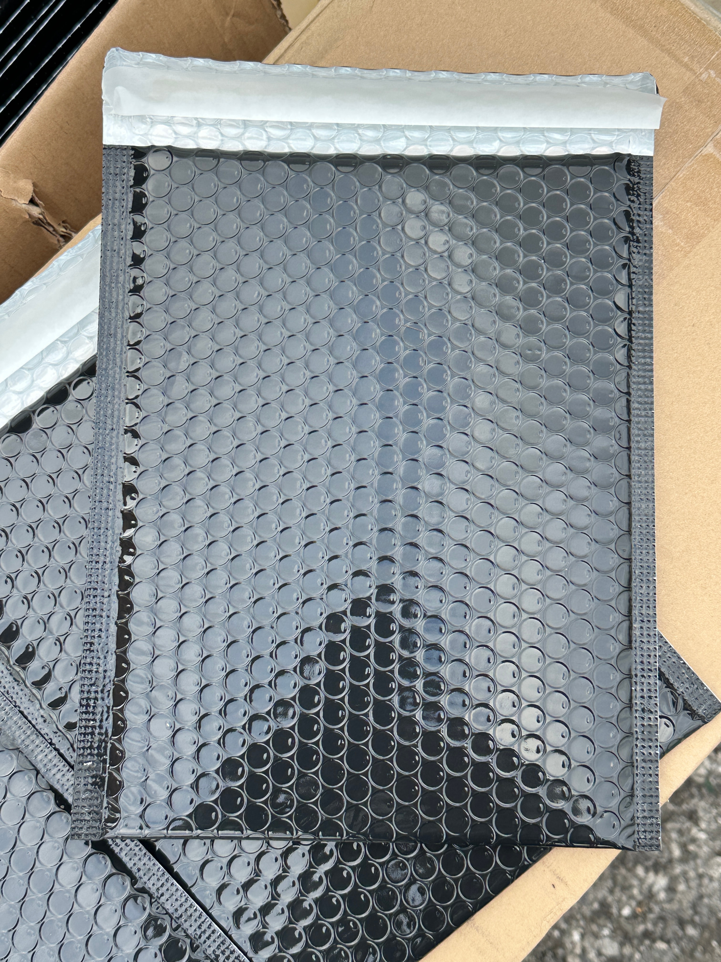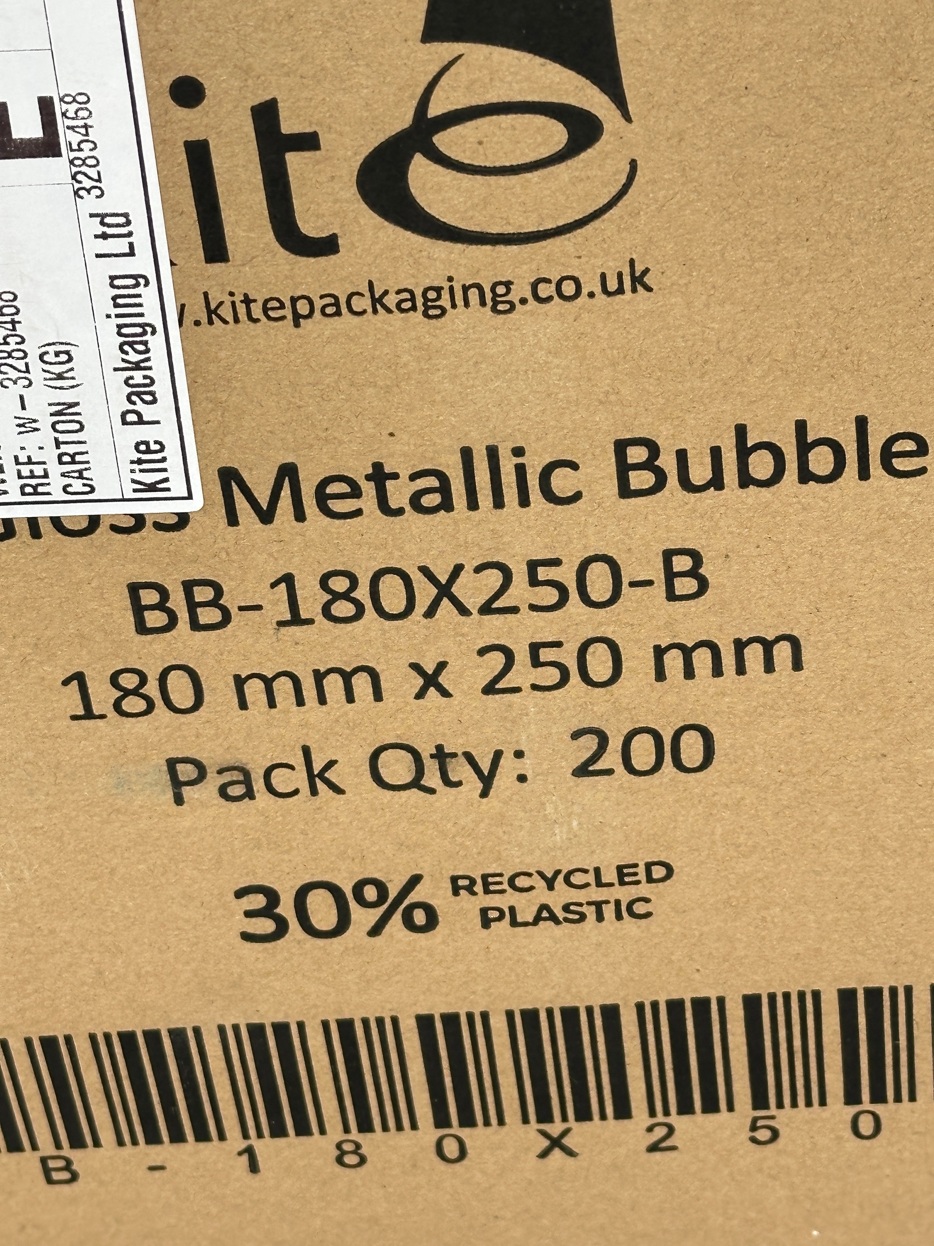 A pack of 200 new, black metallic bubble mailers from Kite Packaging Ltd., contained within their original branded corrugated cardboard shipping box. The individual padded envelopes are constructed from plastic, stated to contain 30% recycled material.