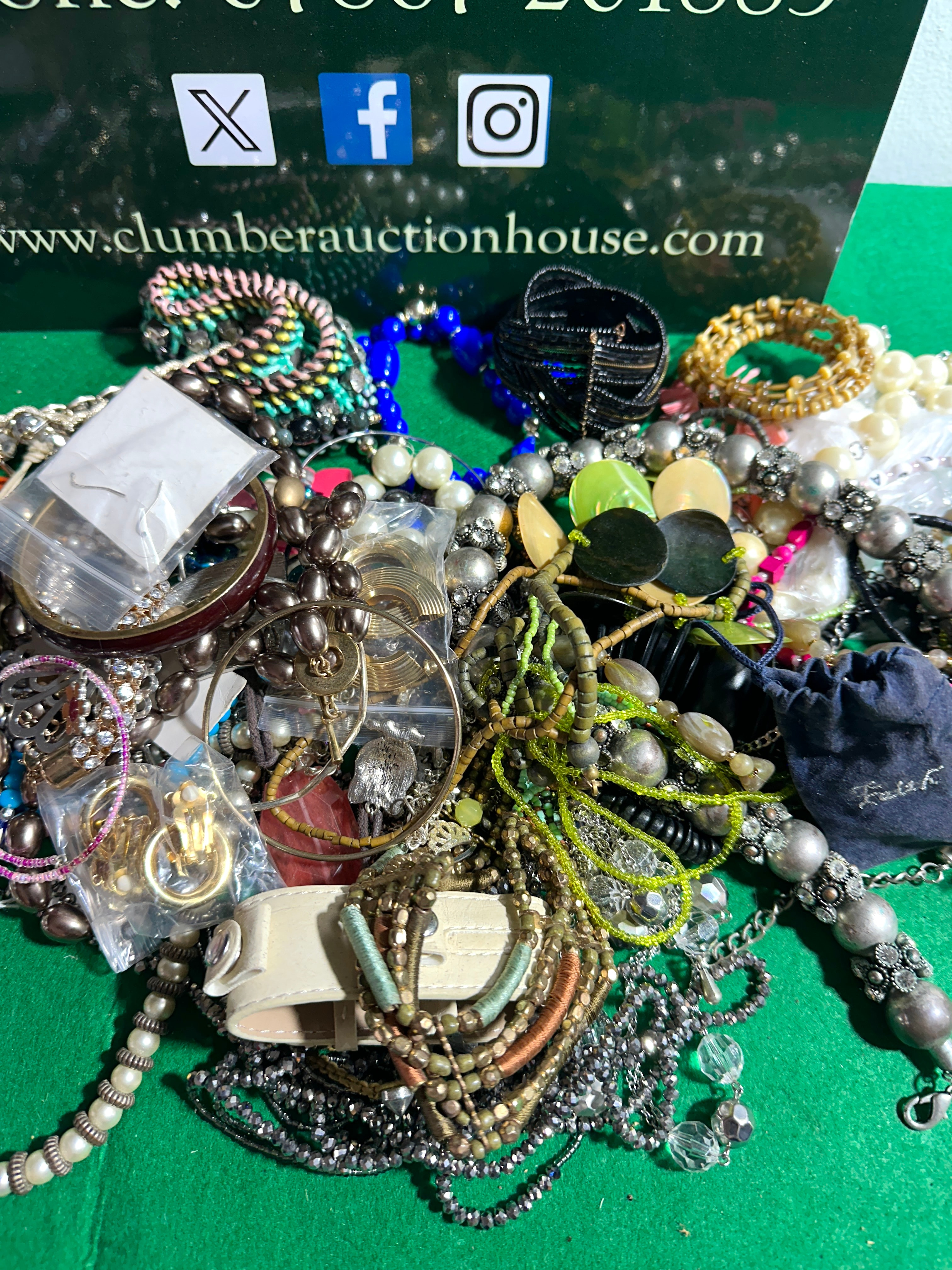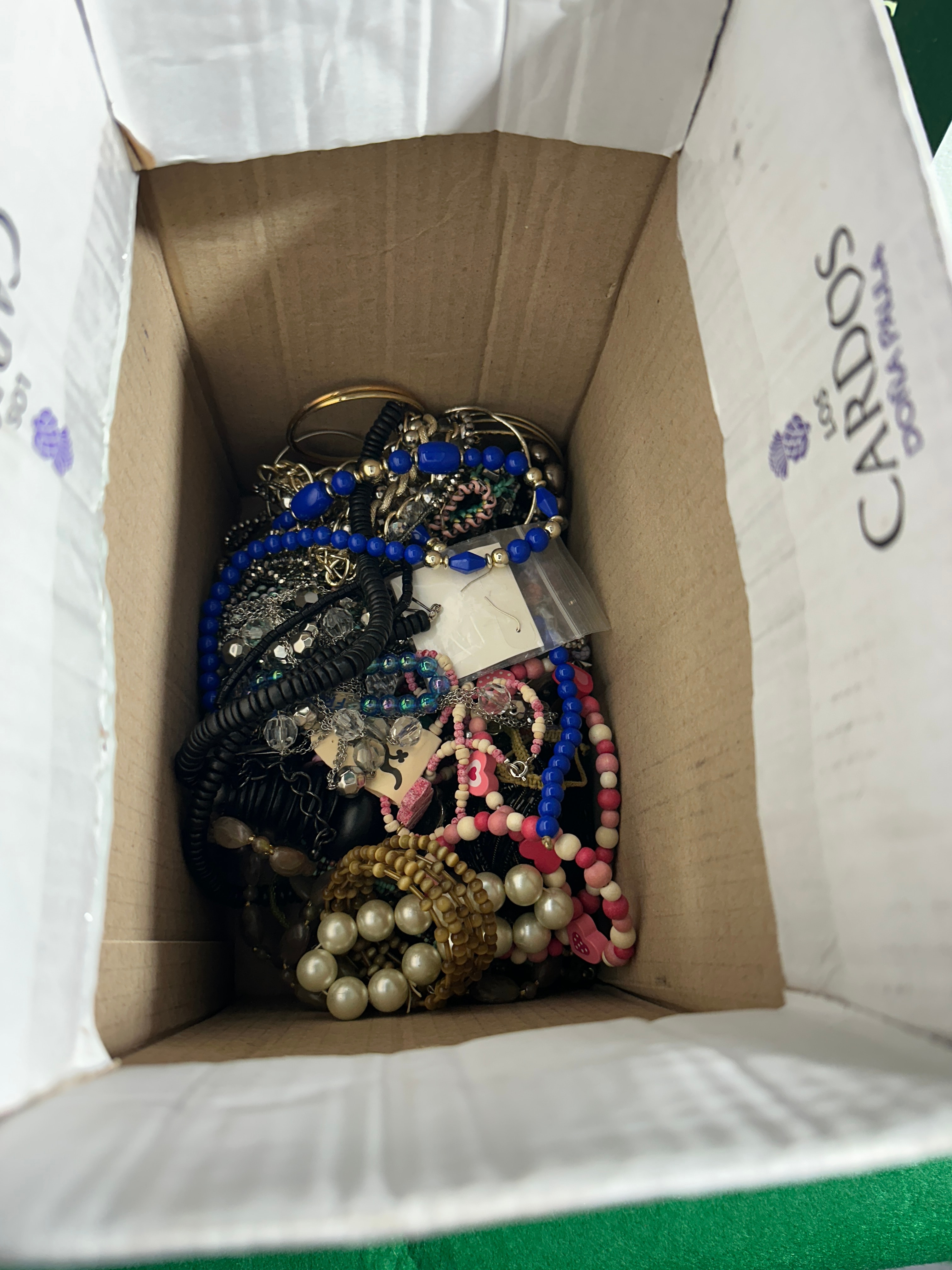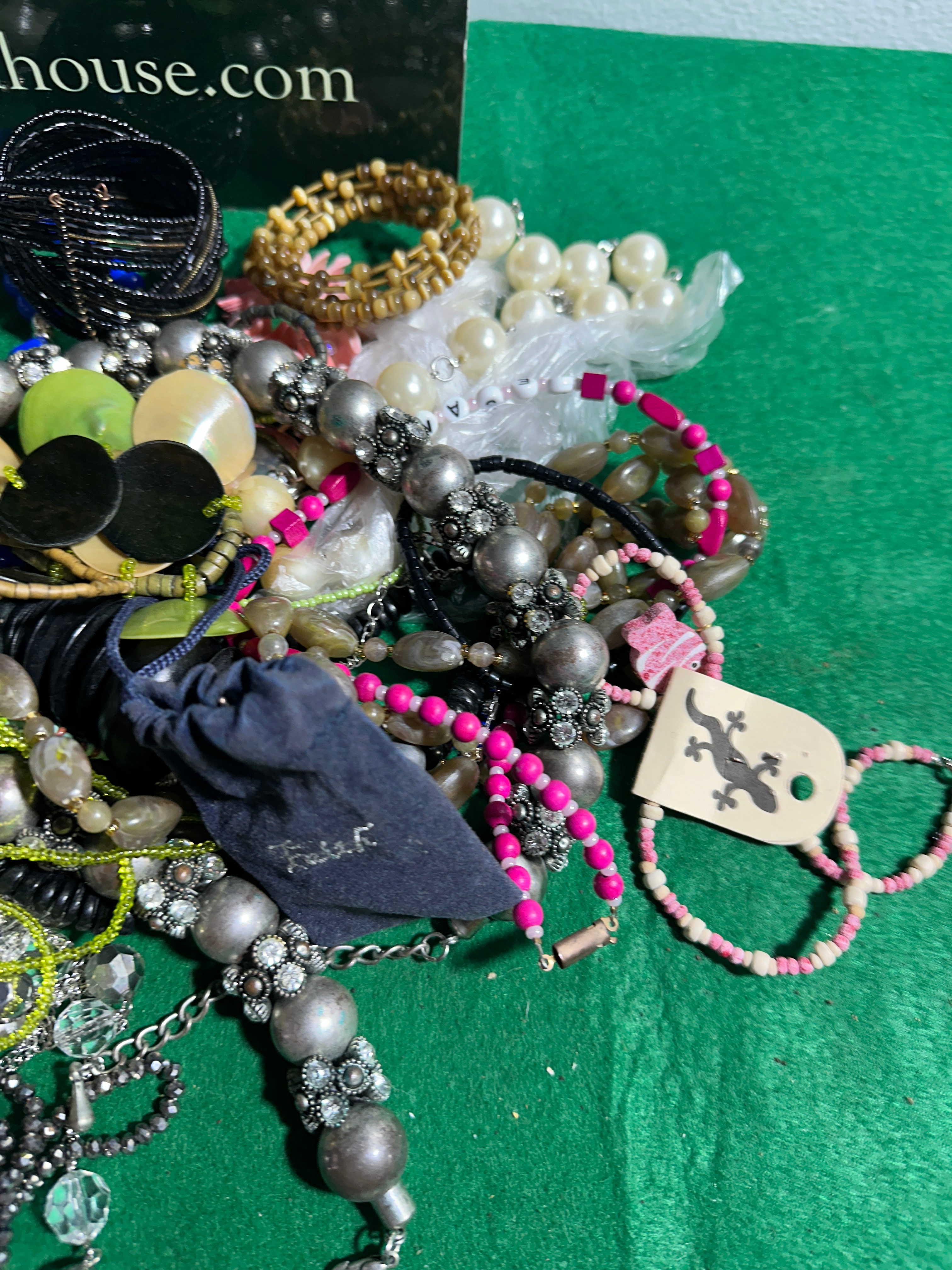 A substantial collection of assorted costume jewelry, primarily comprising necklaces and bracelets, exhibiting a variety of styles characteristic of contemporary and modern periods. Materials observed include glass and plastic beads, faux pearls, diverse non-precious metal alloys (silver-tone, gold-tone), shell discs, and textile elements. Visible text includes “Faith” embroidered on a small blue fabric pouch and “LOS CARDOS” (The Thistles) alongside “DOÑA PAULA” printed on a cardboard box containing additional pieces.