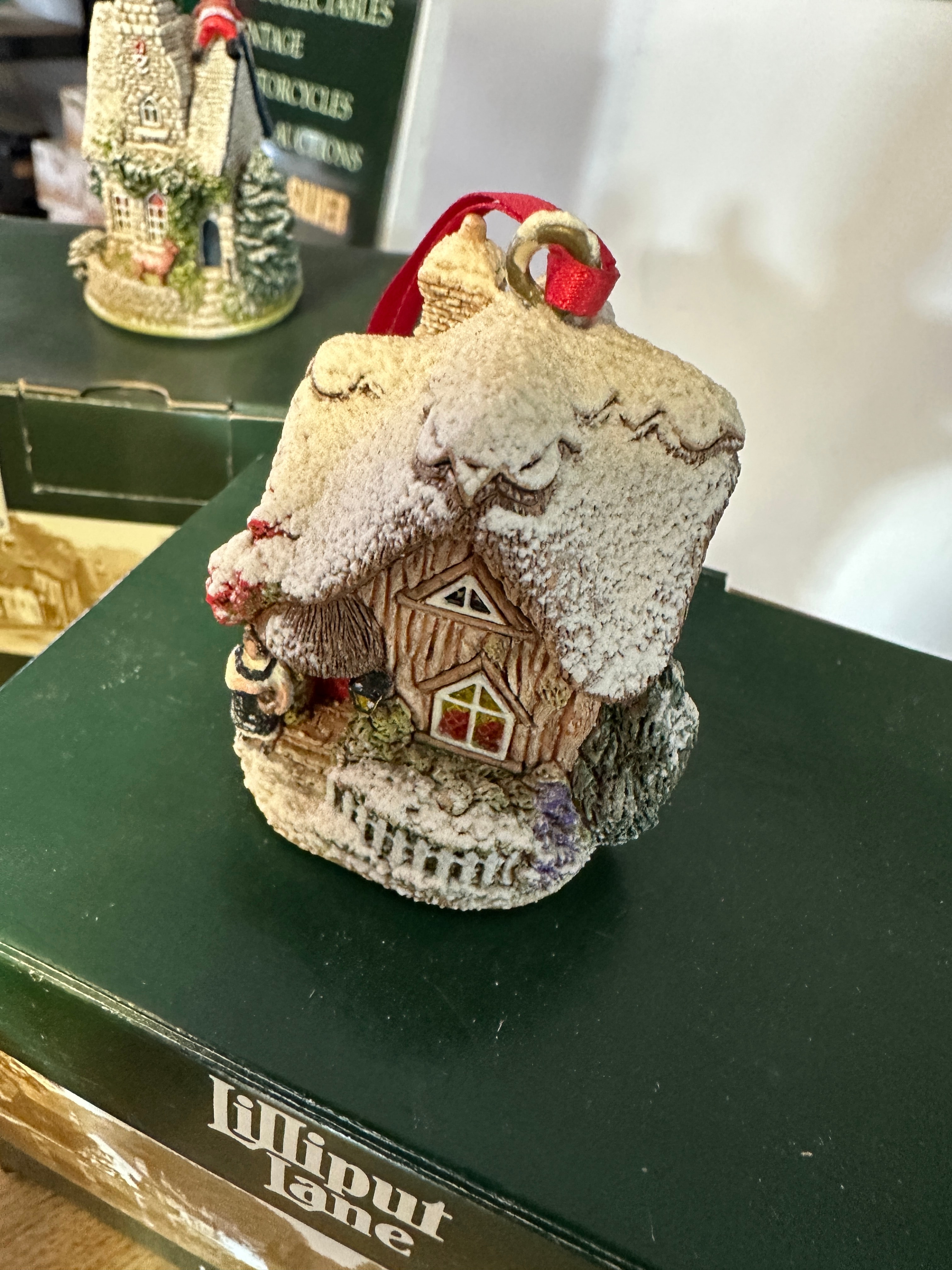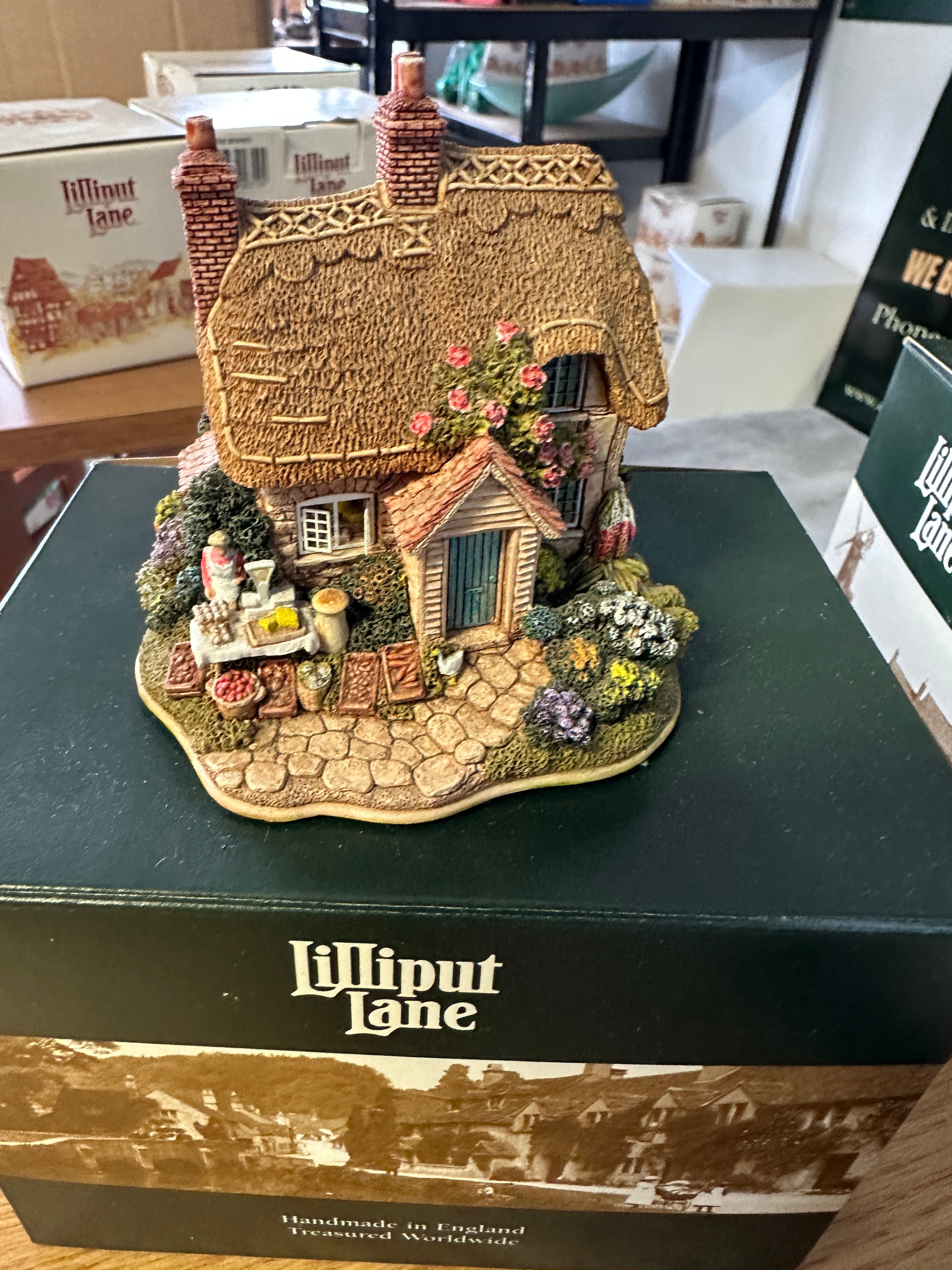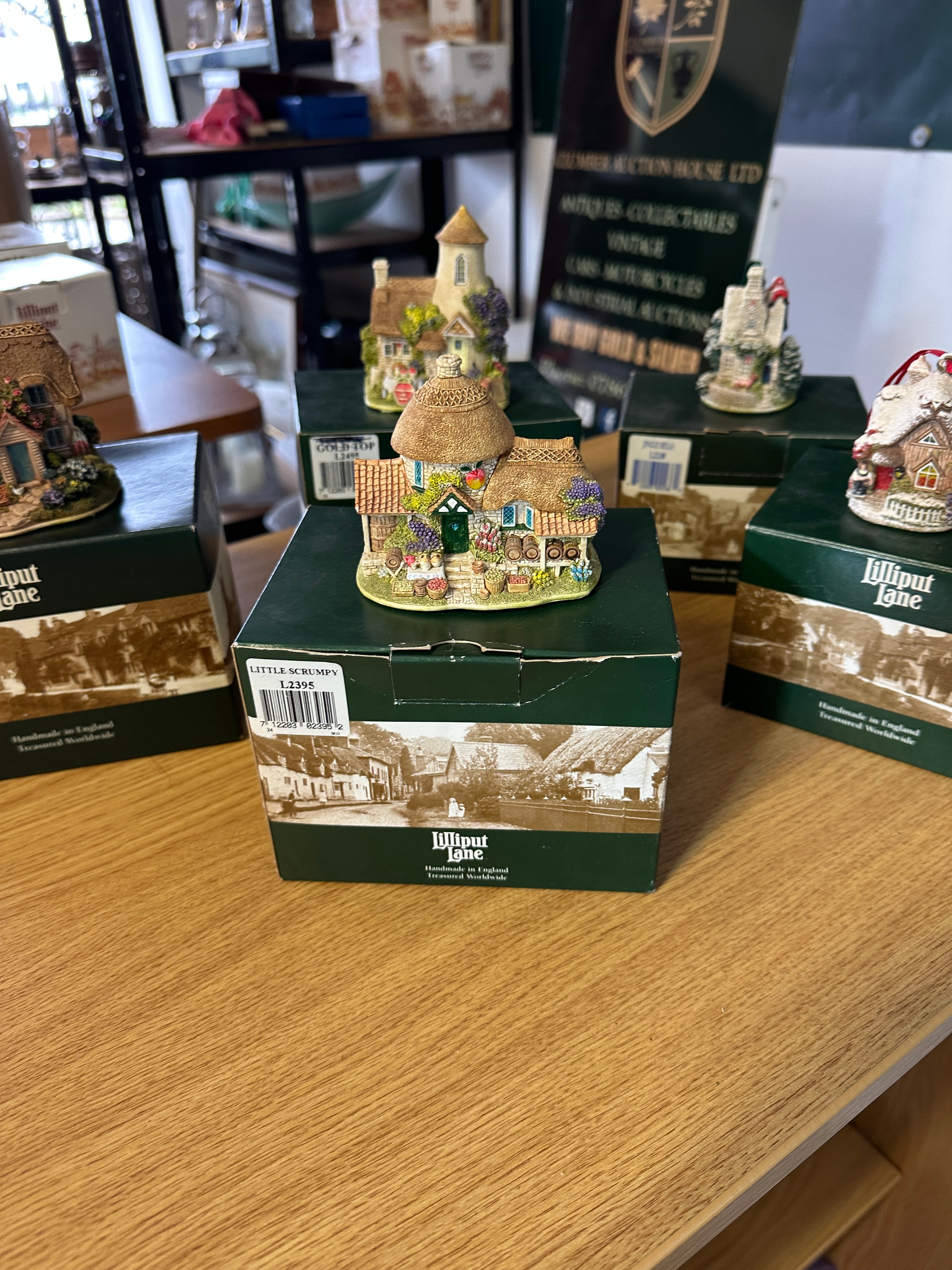 A collection of Lilliput Lane miniature collectible house figurines, crafted from hand-painted resin or a similar composite material. These pieces depict quaint English country cottages with intricate details such as thatched roofs, chimneys, and various floral arrangements. Specific models visible include one identified as “LITTLE SCRUMPY” featuring a market stall, and another with a sign for “STRAWBERRIES AND CREAM.” Some figurines also exhibit seasonal, winter-themed details, including snow-covered roofs and one with a red ribbon loop. Most items are accompanied by their original dark green boxes, which prominently display the “Lilliput Lane” logo, “Handmade in England,” and “Treasured Worldwide” text, along with product-specific labels and barcodes.