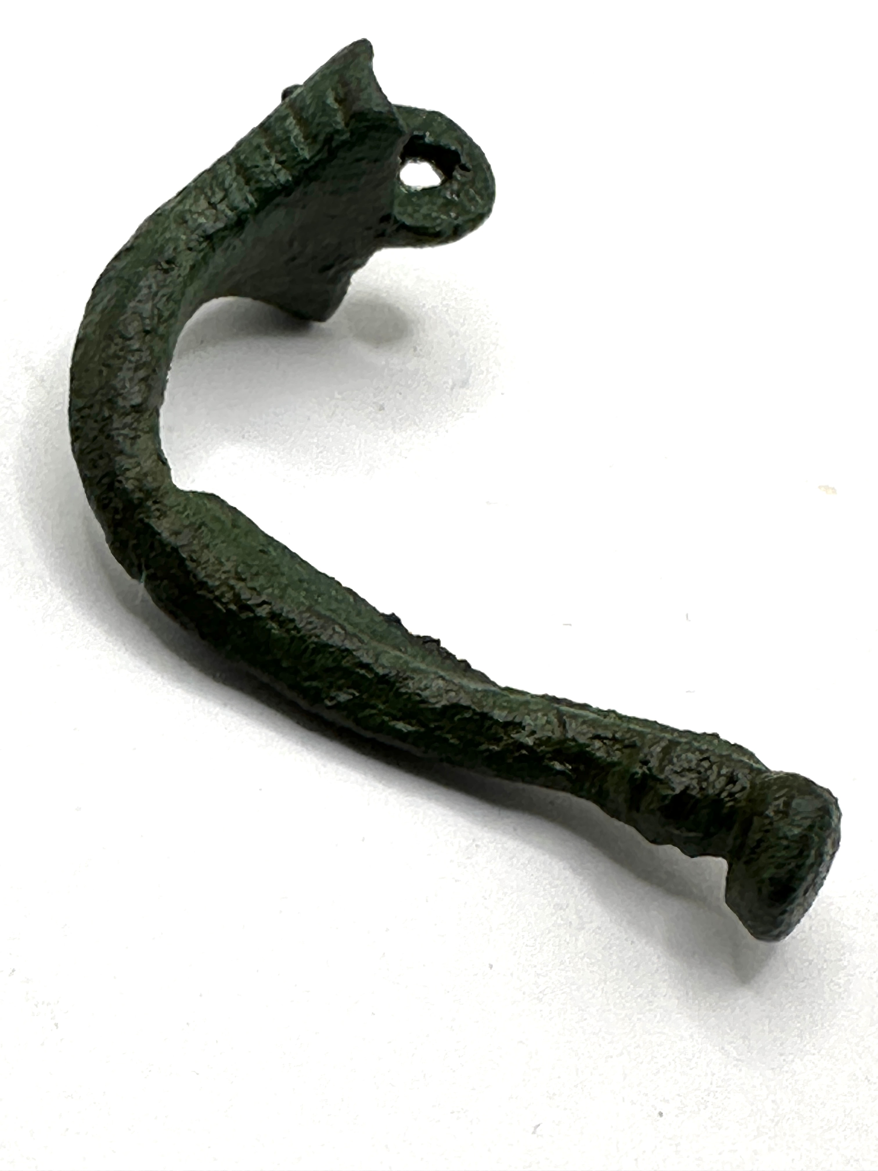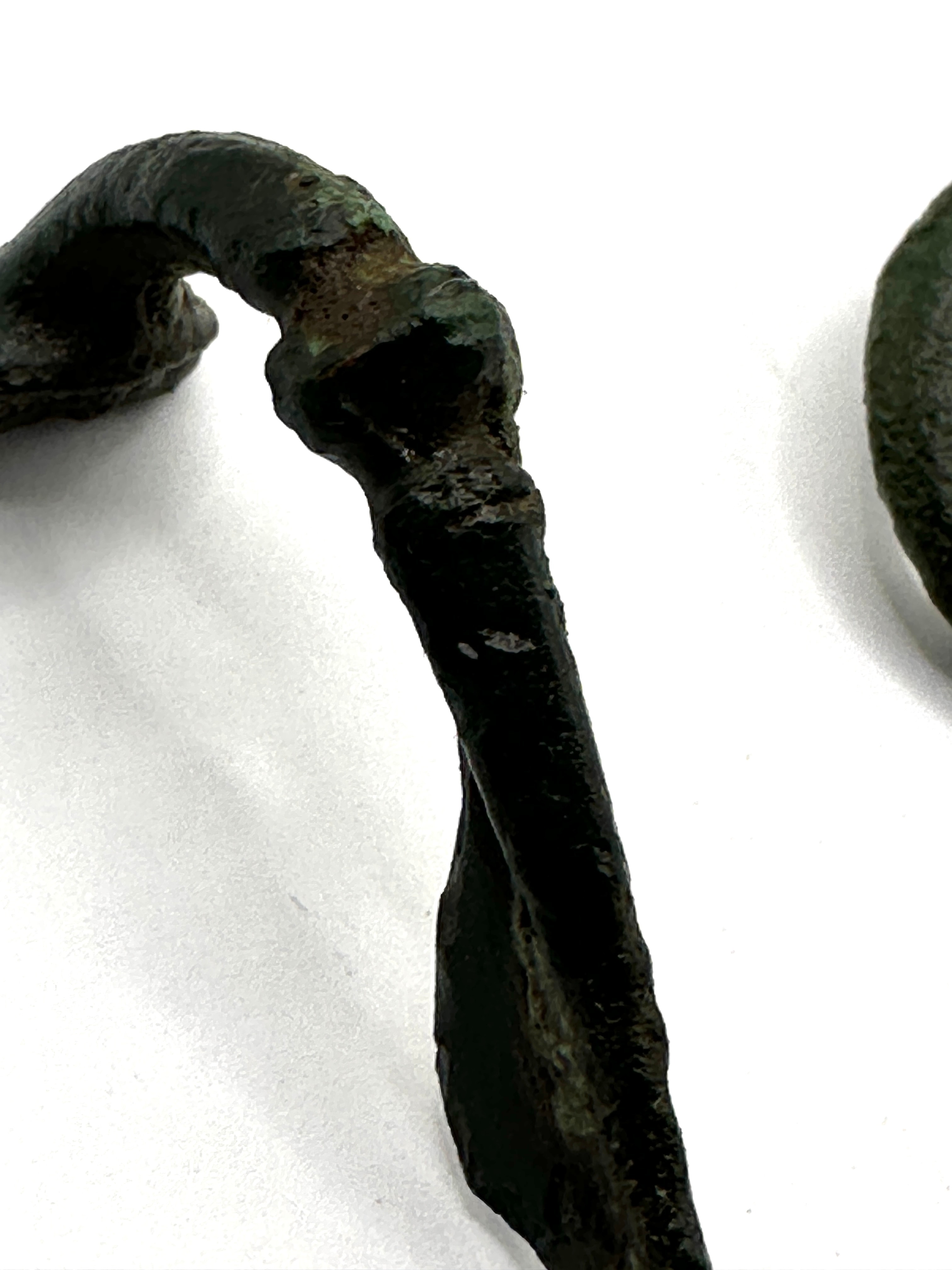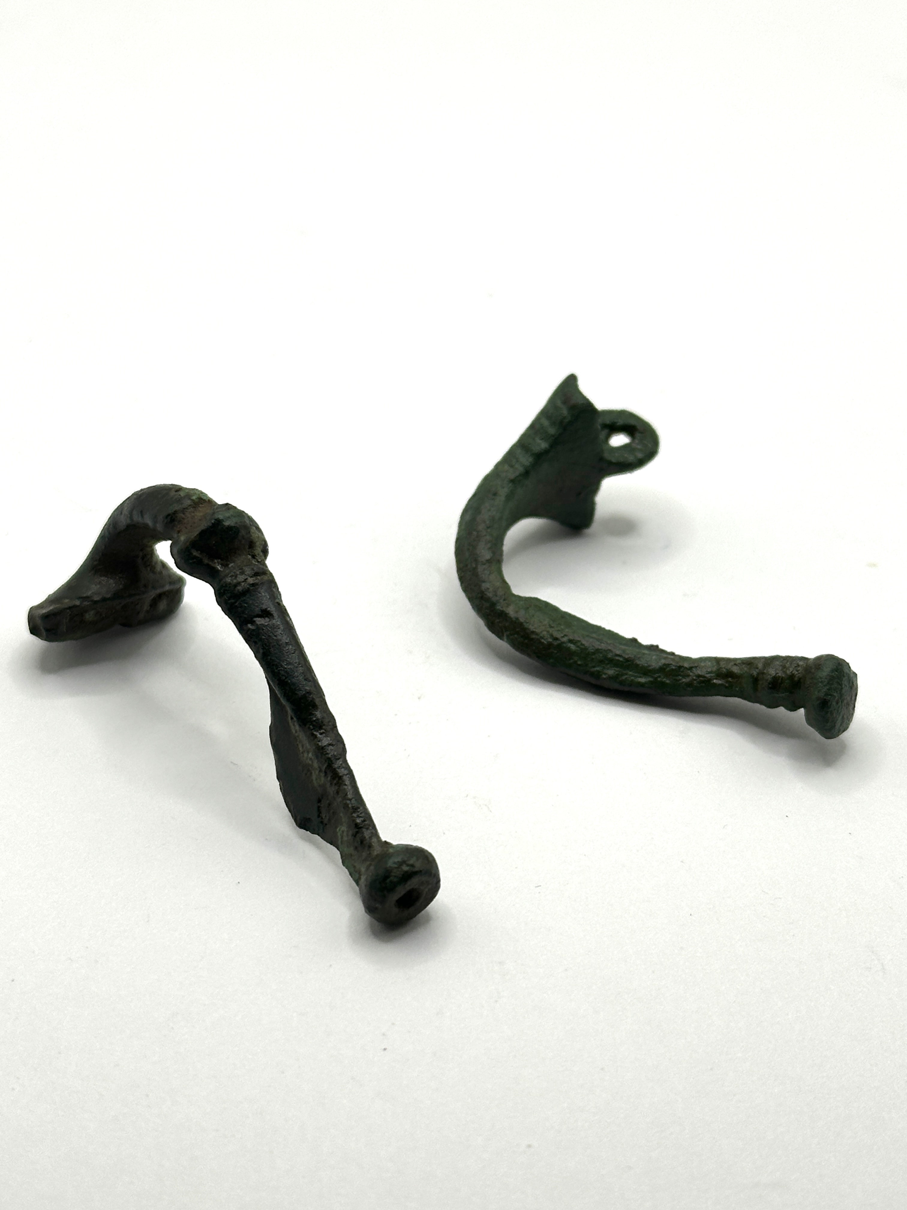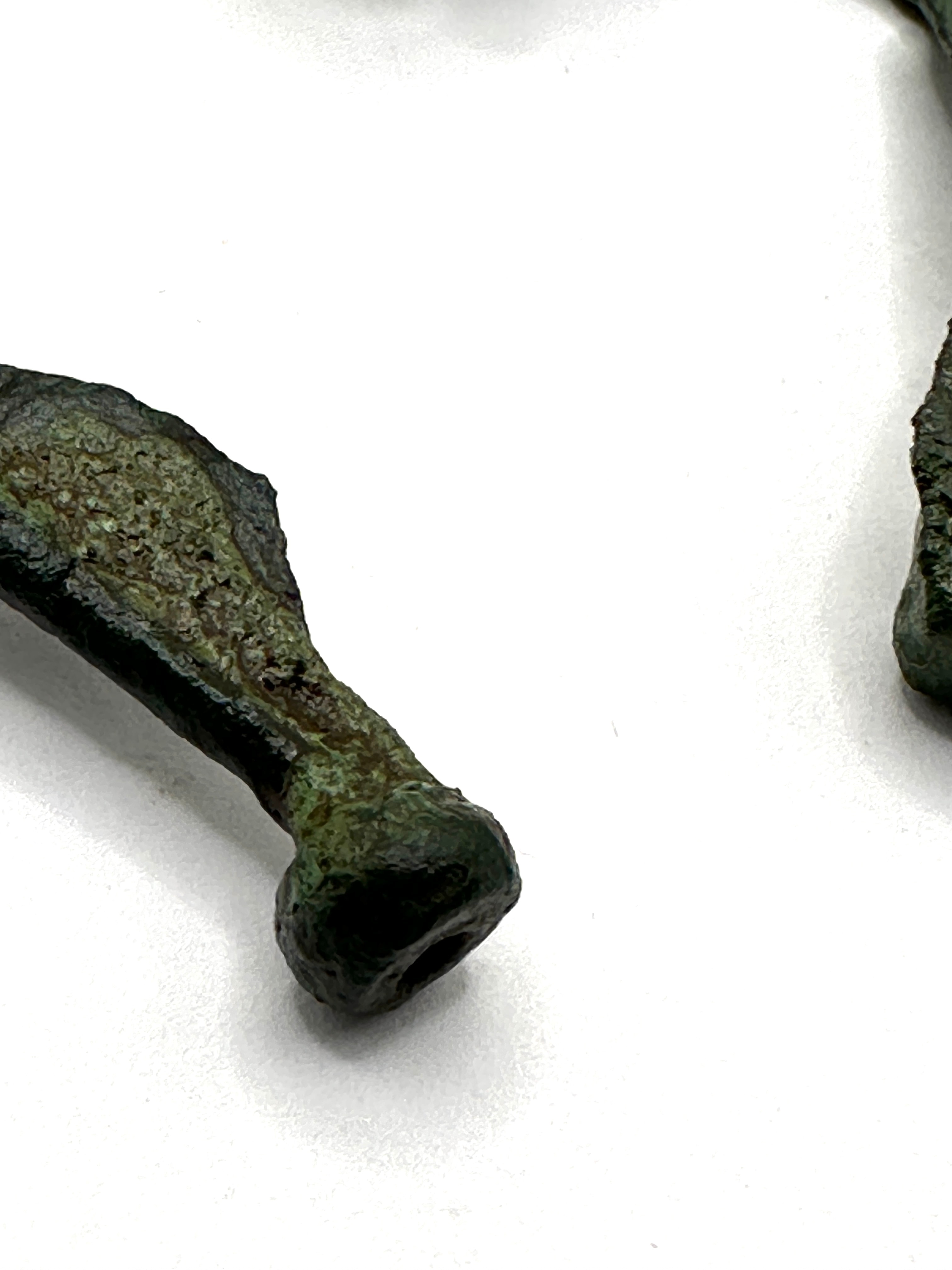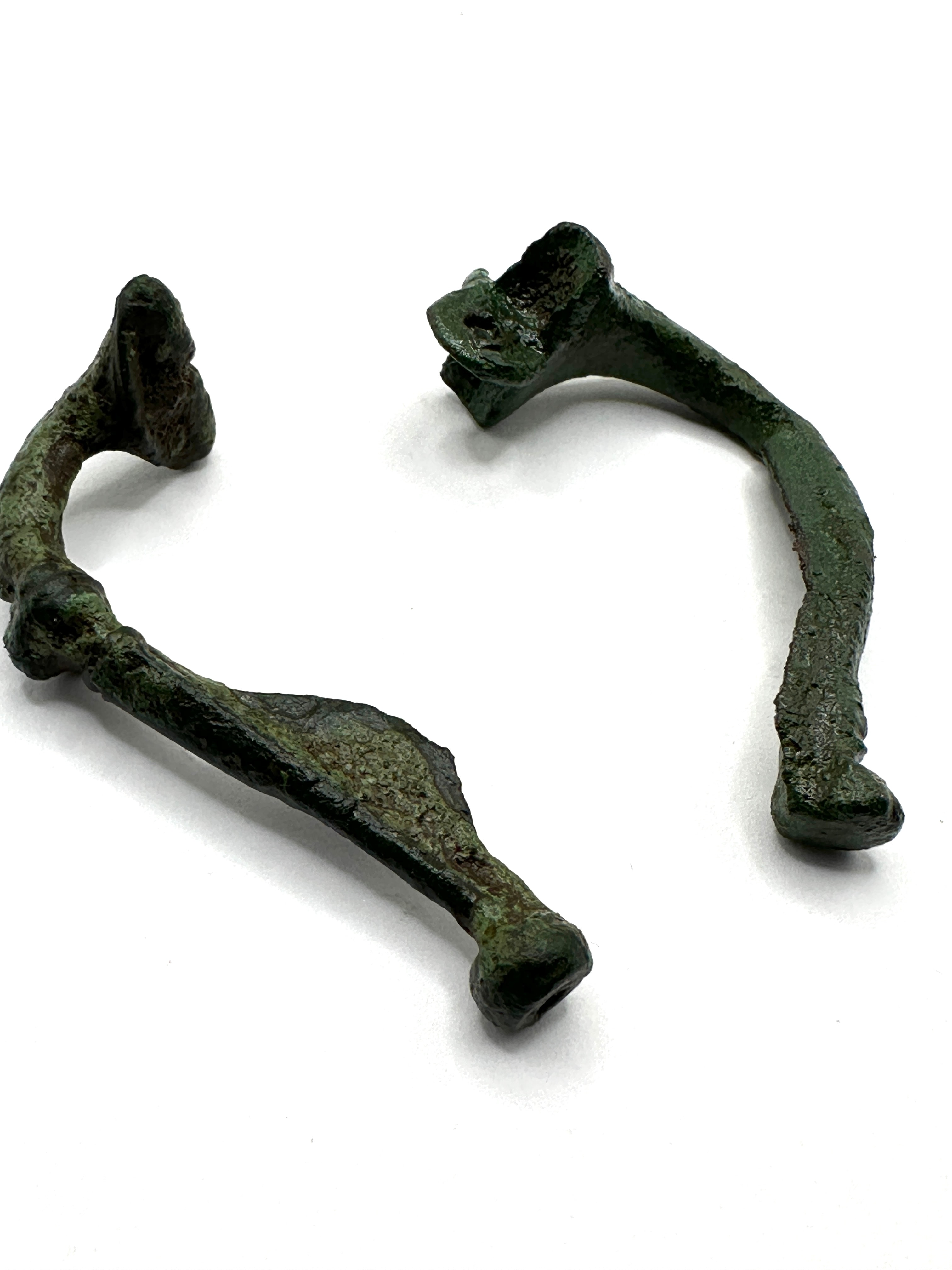 A pair of ancient Roman bronze fibulae, dating from the 1st to 5th Century AD. Each piece is cast from a copper alloy, likely bronze, and displays a heavy, stable green-blue patination with significant surface corrosion, consistent with extended age and burial. One fibula features a prominent loop at its wider end, suggesting an attachment point, while the other terminates in a flattened, irregular form. No visible text, symbols, or maker’s marks are discernible.