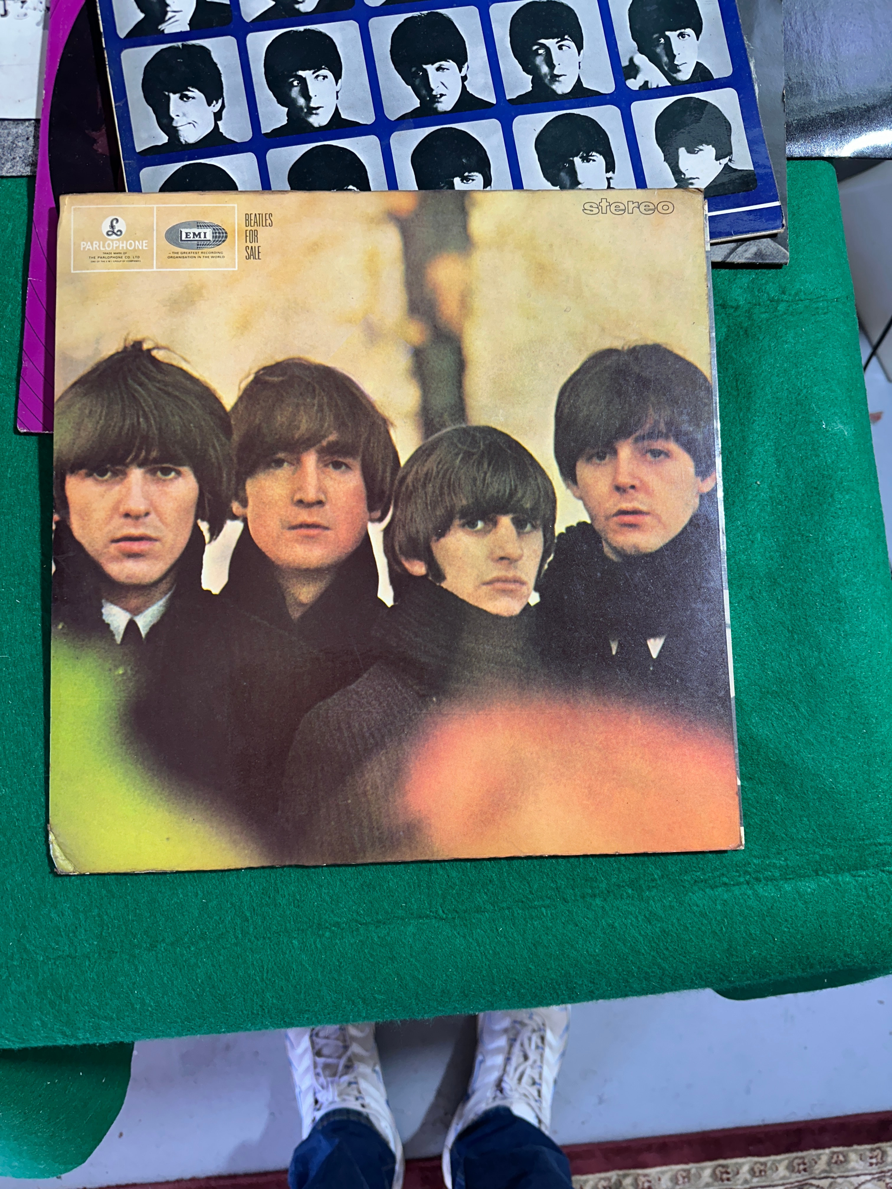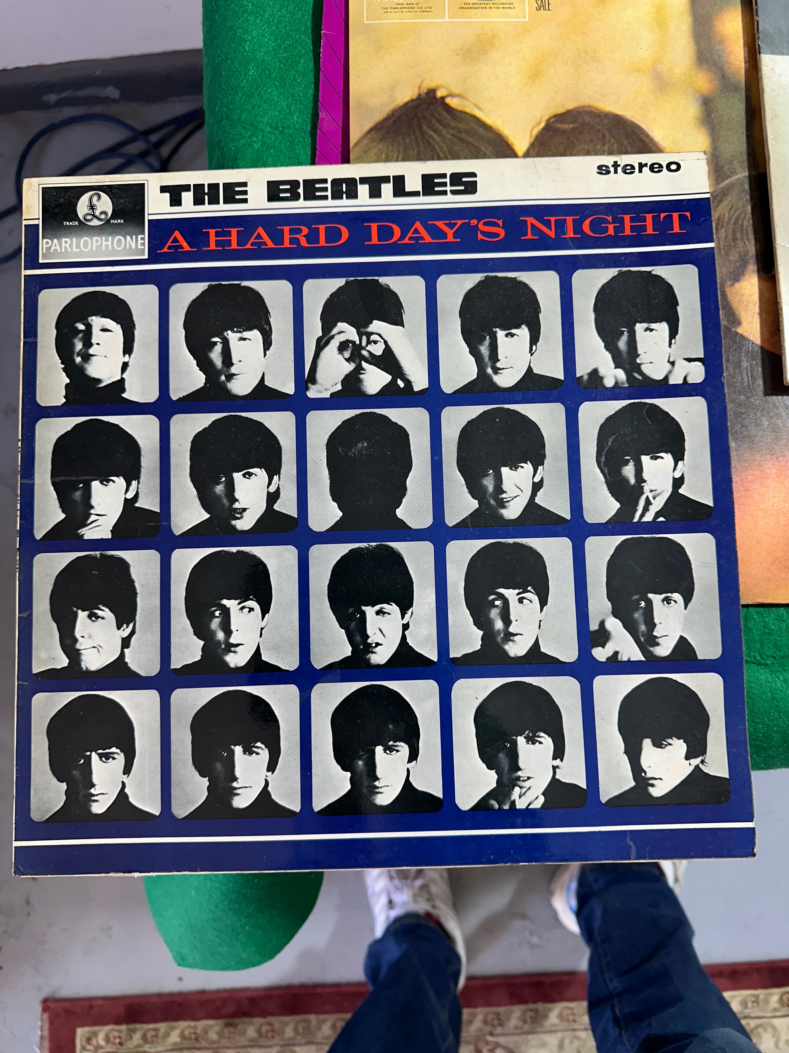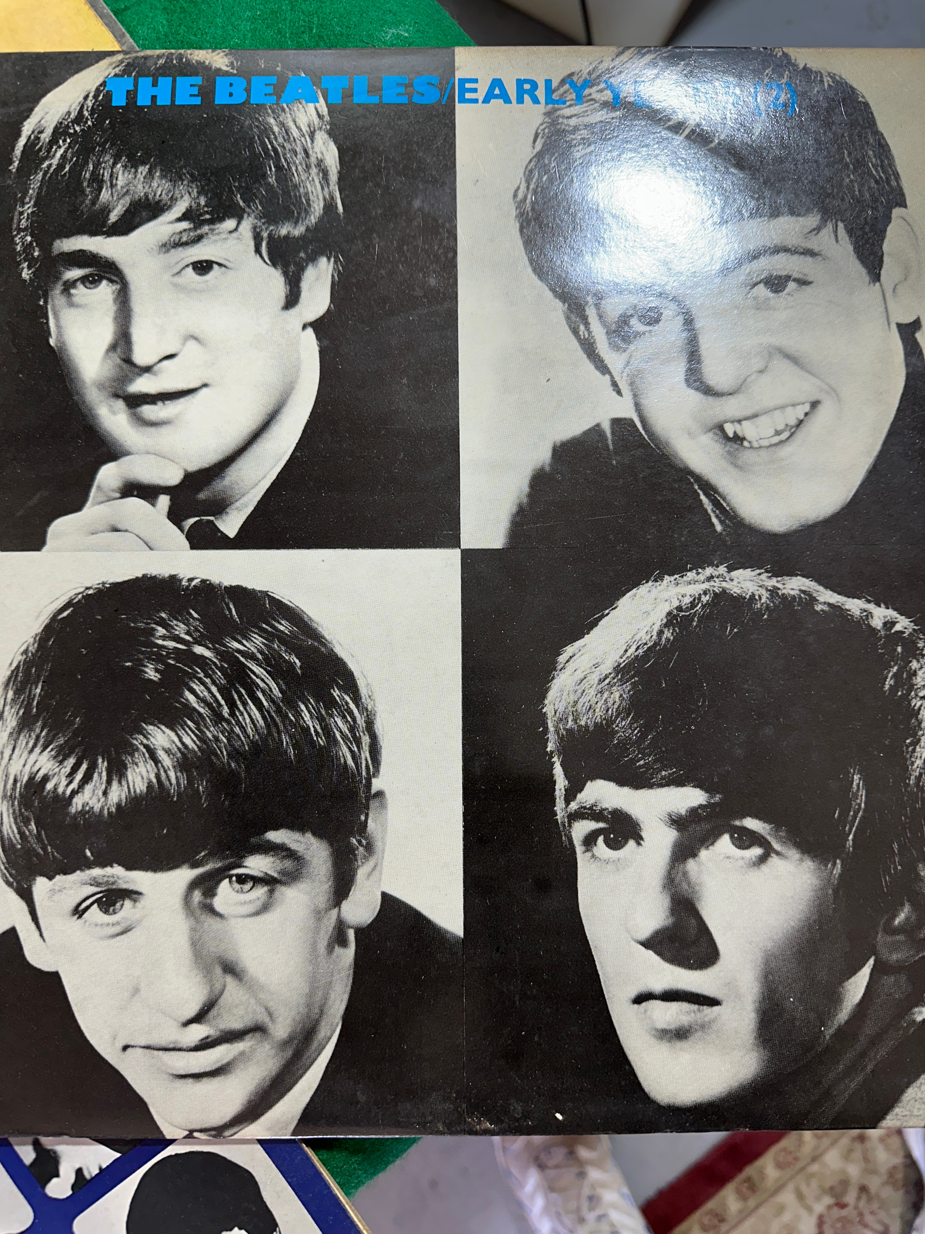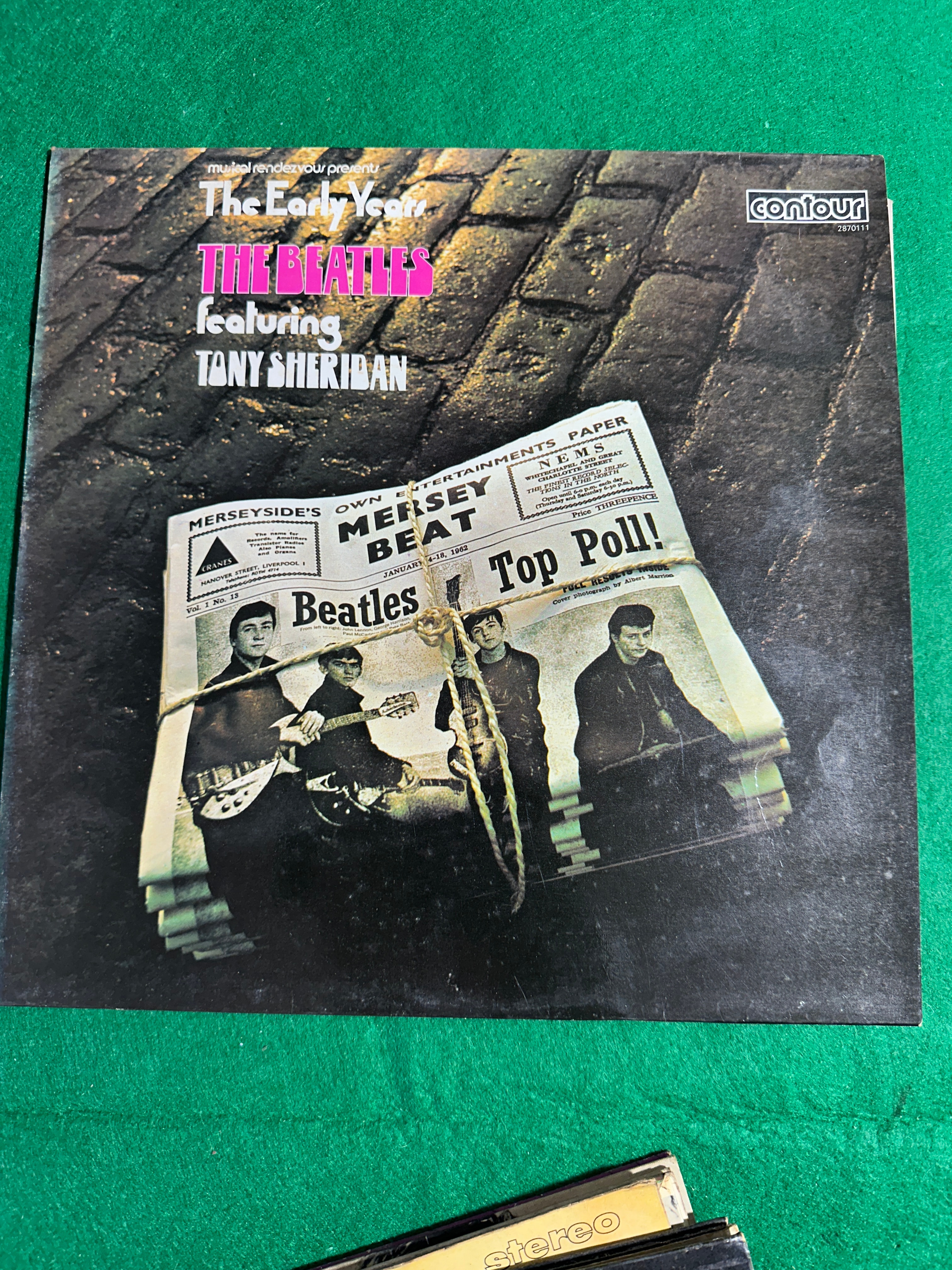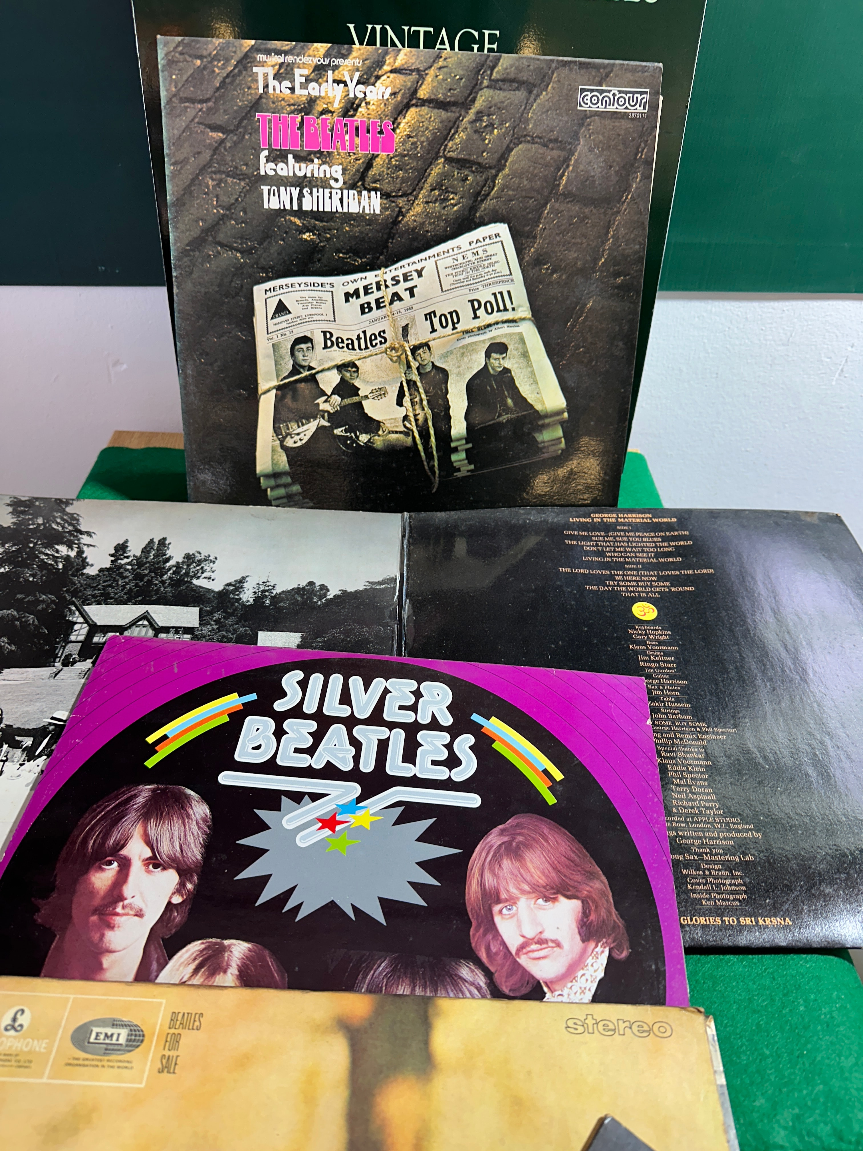 This collection comprises approximately eight vinyl LP record albums, primarily from the 1960s and 1970s, featuring The Beatles and George Harrison’s solo work. Identifiable titles include “THE BEATLES A HARD DAY’S NIGHT, ” “THE BEATLES FOR SALE, ” “The Early Years featuring TONY SHERIDAN, ” “SILVER BEATLES, ” George Harrison’s “Living in the Material World, ” and an album featuring an illuminated hand on a black background (likely “All Things Must Pass”). Visible record labels include Parlophone, EMI, and Contour, with “stereo” markings also present. One album cover displays a newspaper clipping reading “MERSEY BEAT” with “Beatles Top Poll!”.