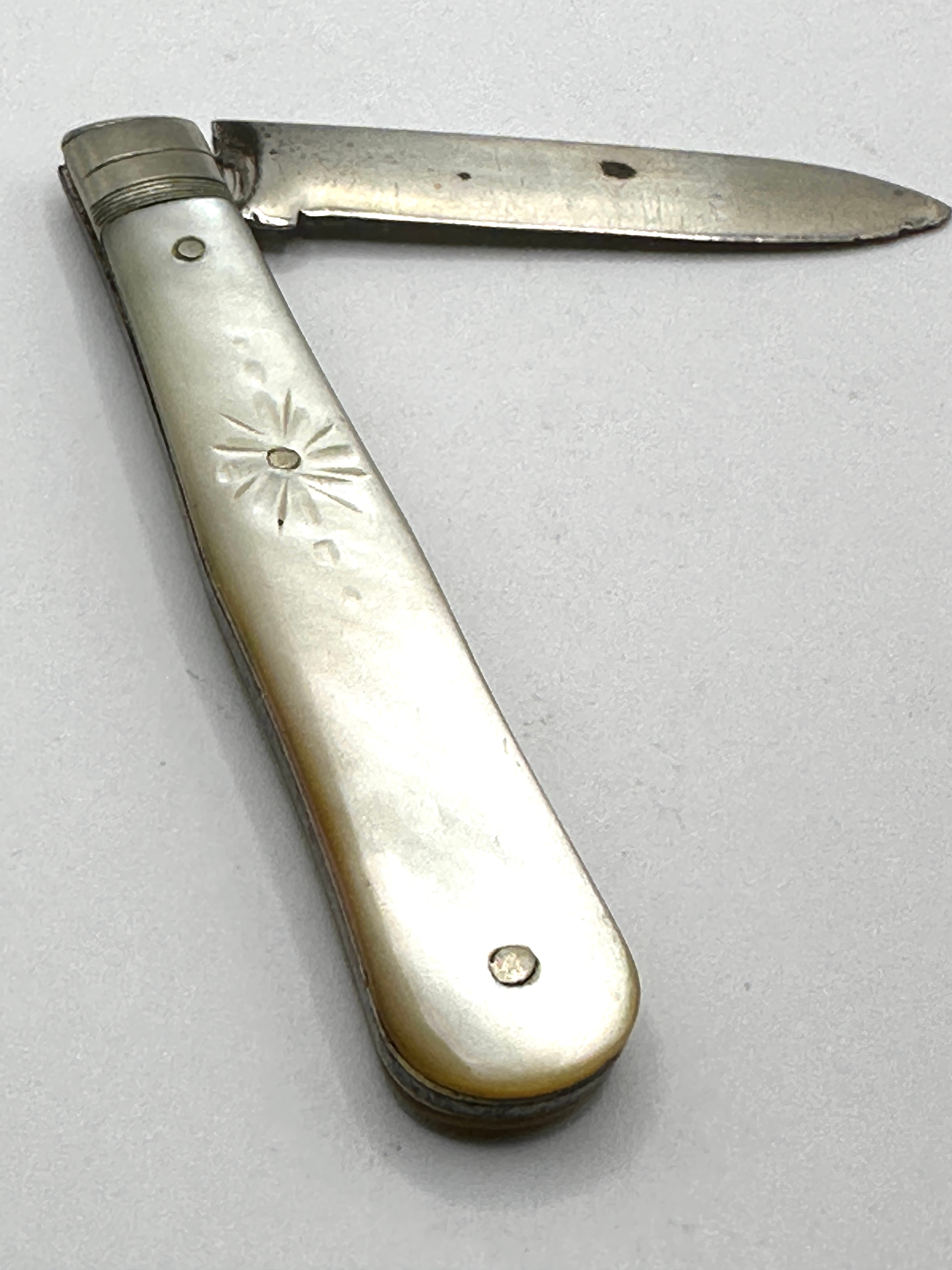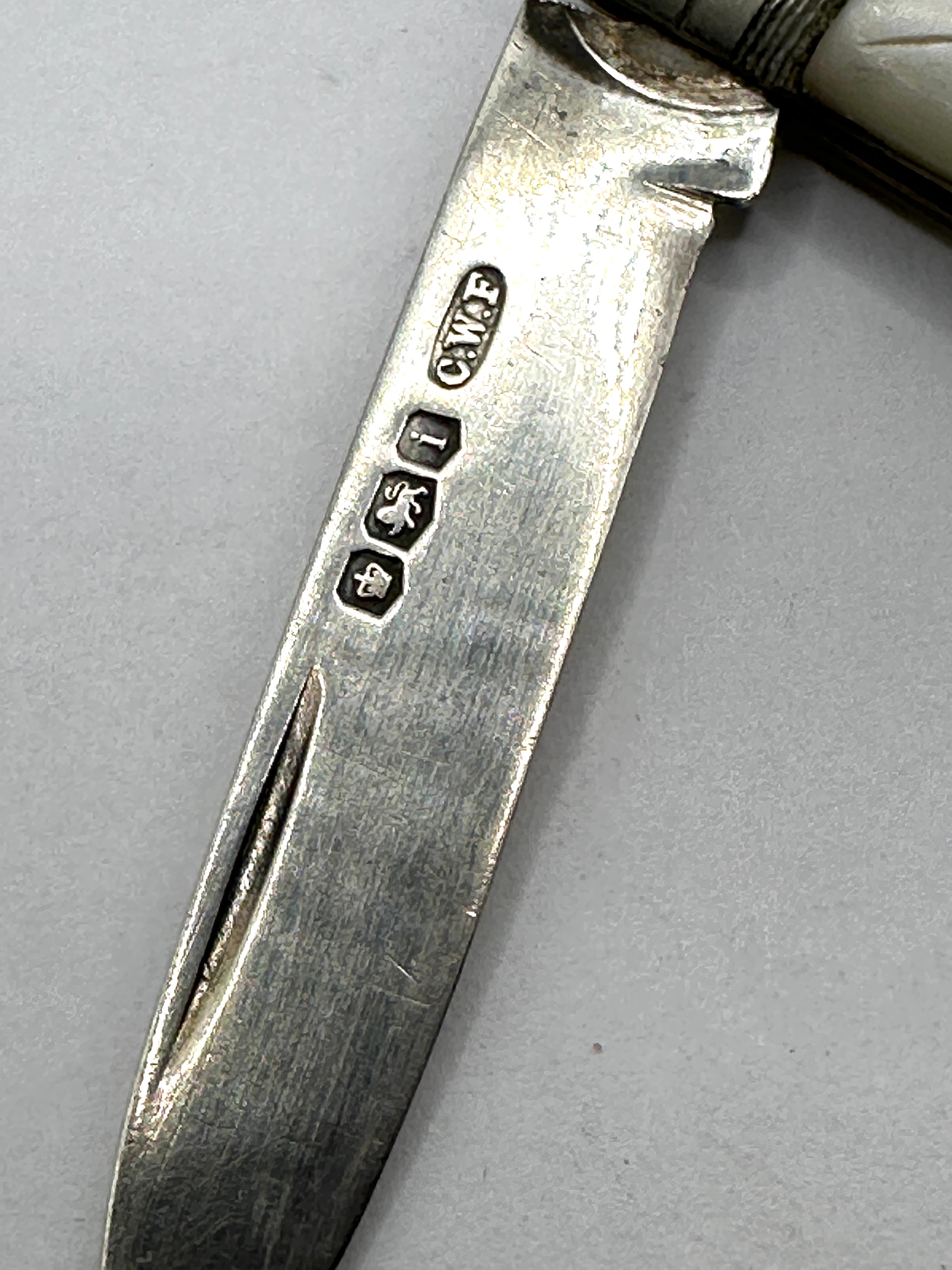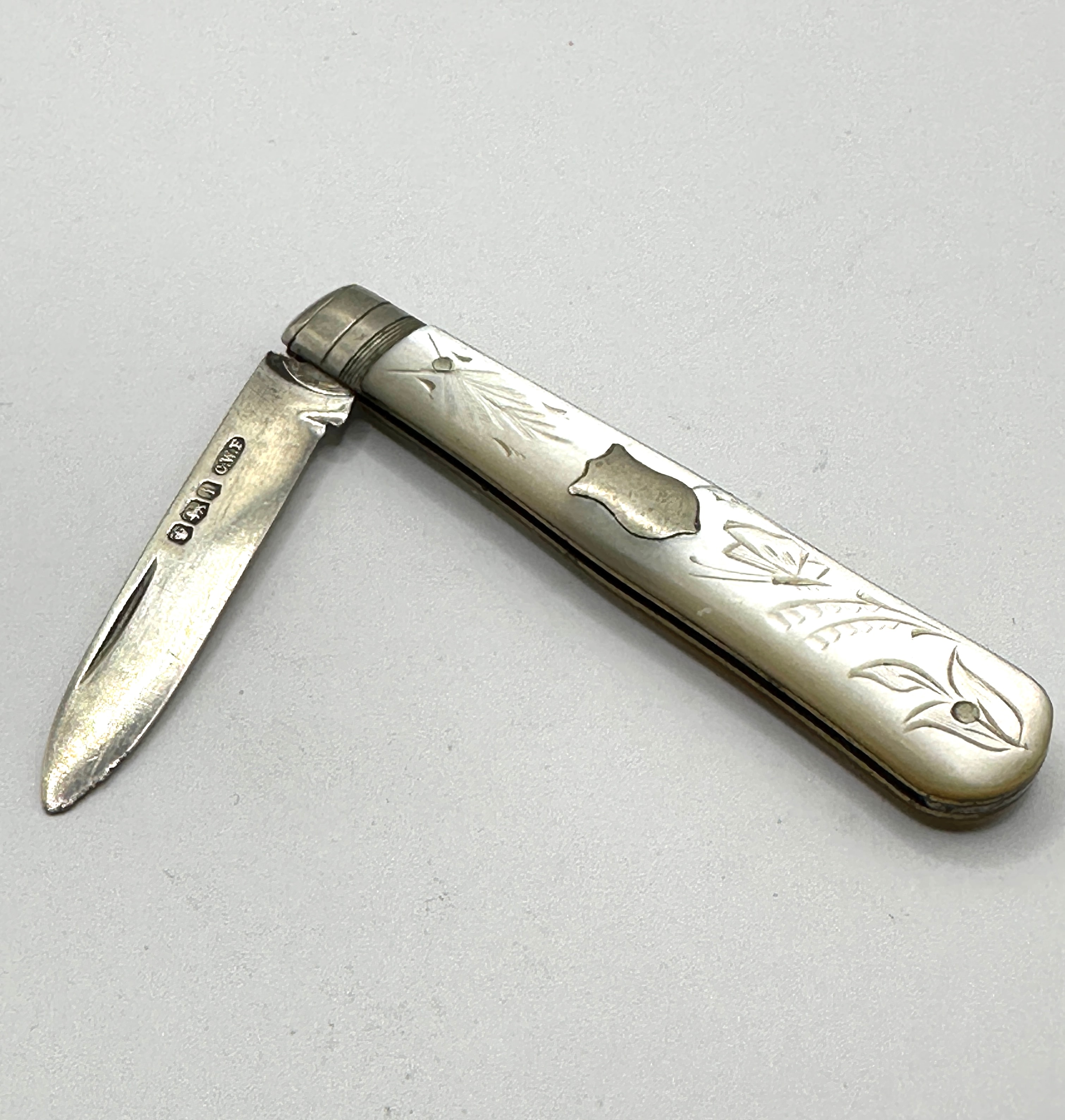 A sterling silver and Mother-of-Pearl folding fruit knife. The single sterling silver blade and bolster are clearly hallmarked for Birmingham, with the anchor assay mark, the lion passant, the date letter ‘i’ (for 1908), and the maker’s mark ‘C.W.F’. The handle scales are crafted from Mother-of-Pearl, decorated with engraved floral and foliate motifs on one side, including a plain shield-shaped escutcheon. The reverse features a simple star-like design.