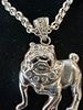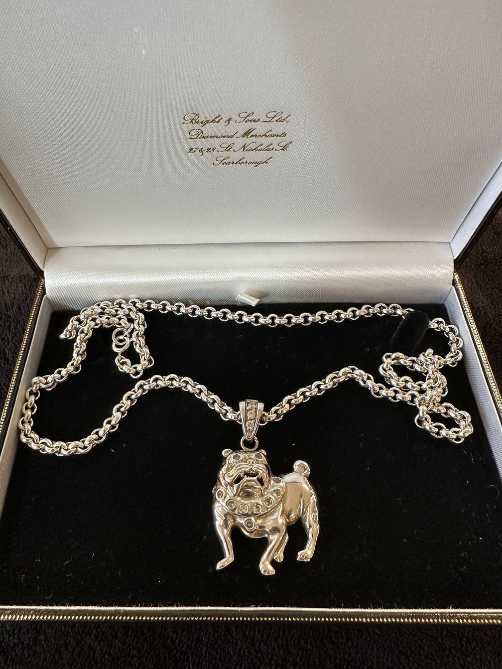 A sterling silver necklace comprising a rolo link chain and a detailed bulldog-form pendant. The pendant is crafted from sterling silver, indicated by a “925” hallmark alongside a smaller, illegible mark, and is embellished with numerous clear, faceted stones set on the head and around the neck, suggesting a studded collar. The necklace is presented in its original black velvet-lined box, the lid of which is printed with the retailer’s details: “Bright & Sons Ltd., Diamond Merchants, 27 & 28 St. Nicholas St., Scarborough.”