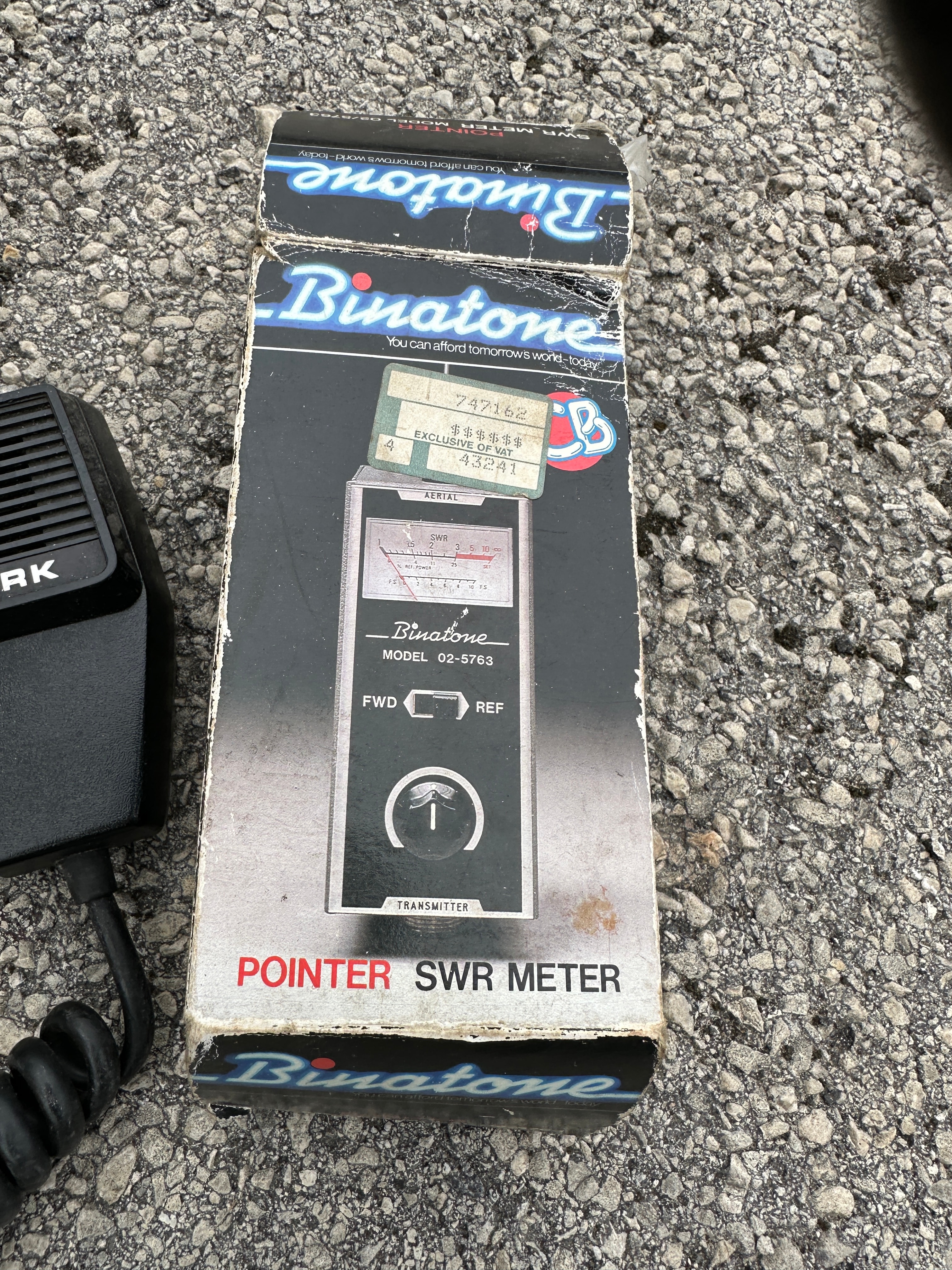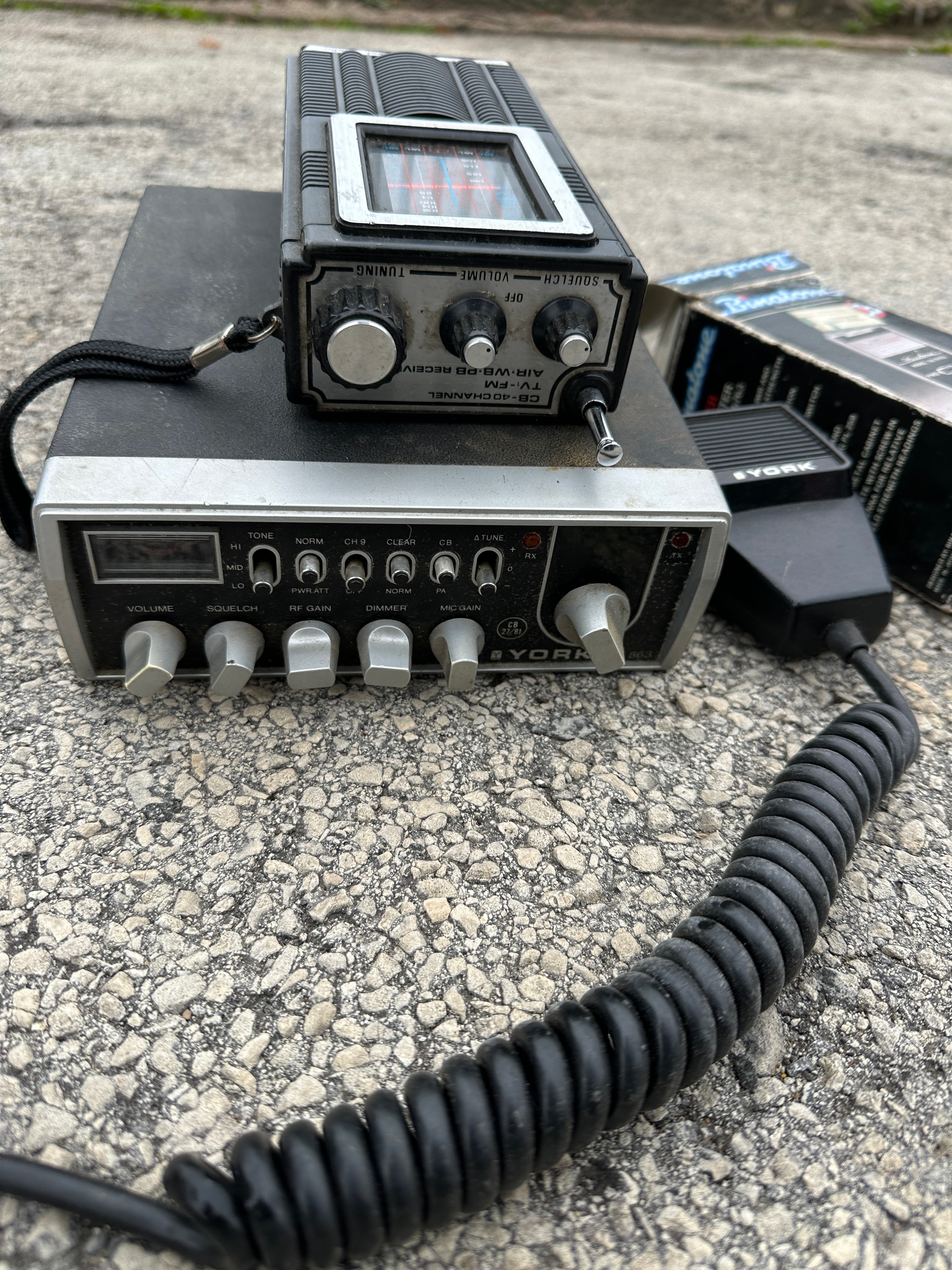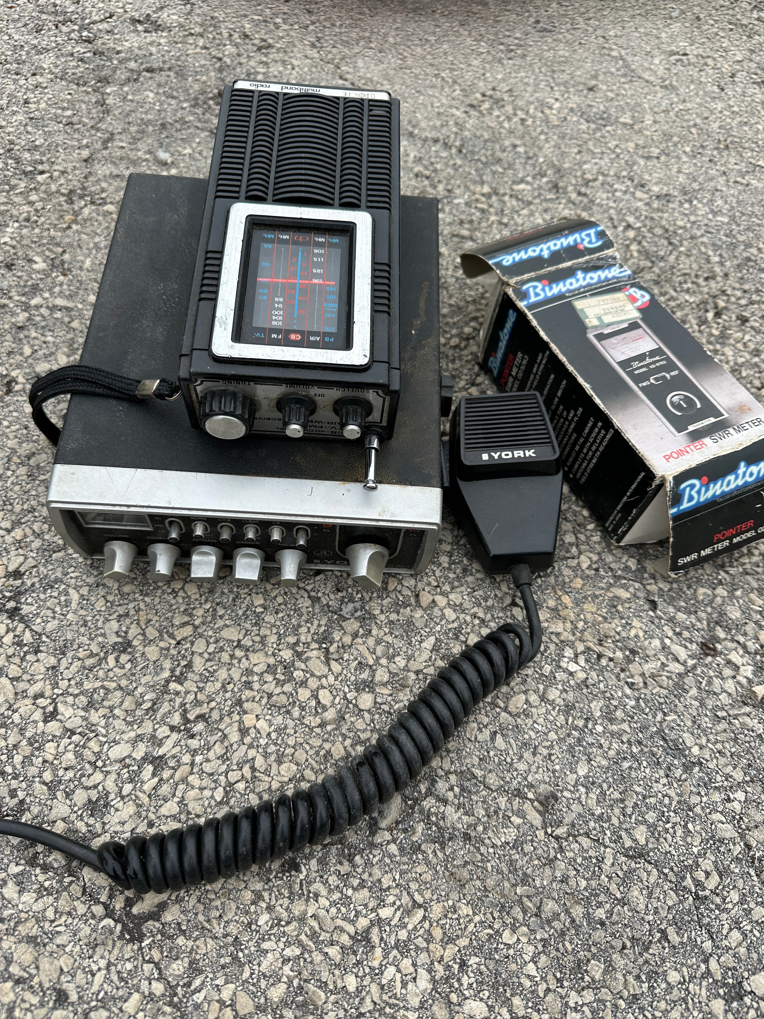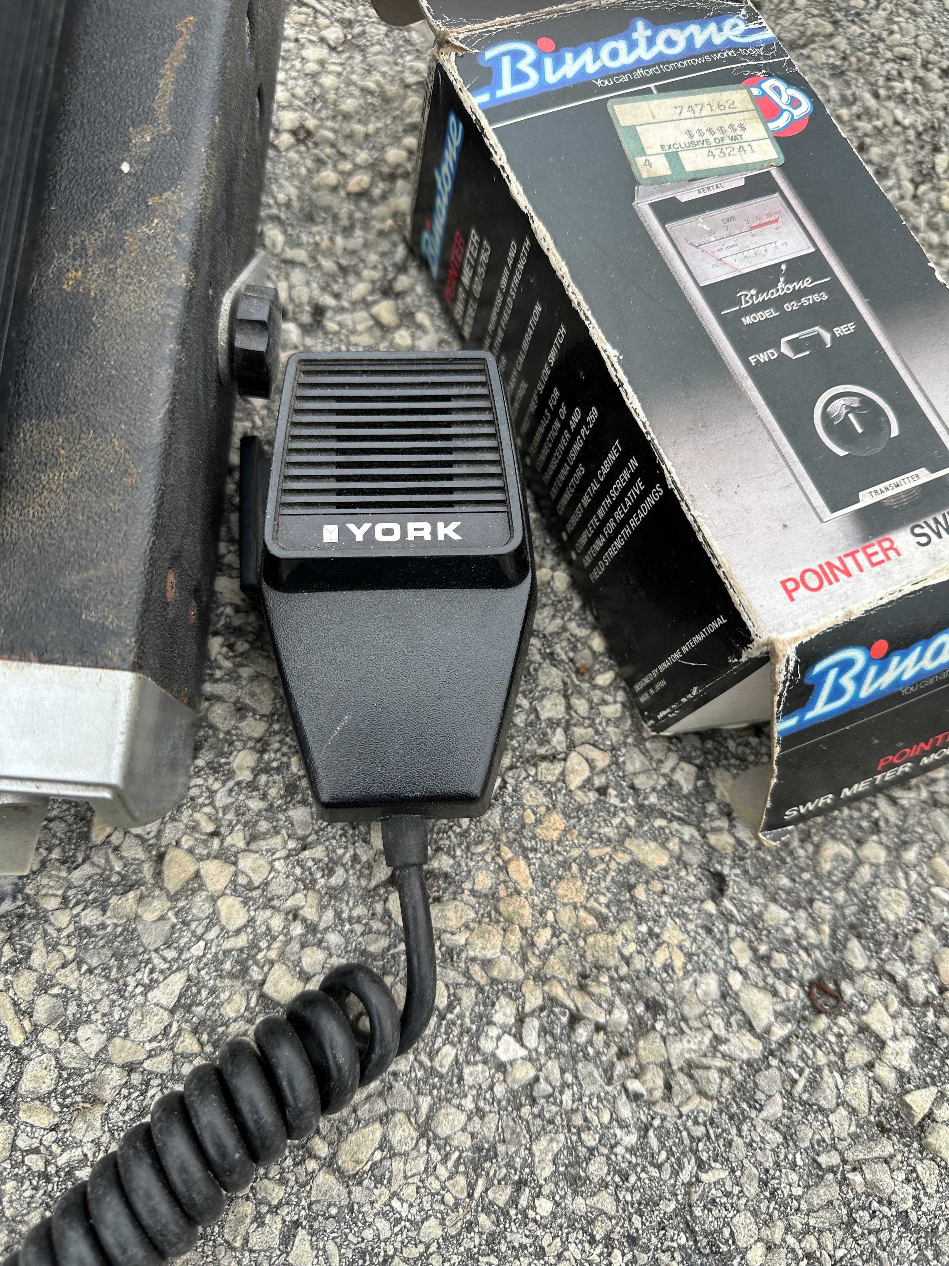 A group of vintage citizens band radio equipment. The lot features a black and chrome YORK CB-40 CHANNEL transceiver, likely a base station, equipped with labeled controls including VOLUME, SQUELCH, and RF GAIN. A black handheld YORK microphone with a coiled cable is connected to the transceiver. Perched atop the transceiver is a smaller black plastic PANASONIC TV-FM AIR/WB RECIEVER portable radio, which includes a visible frequency dial, tuning, and volume controls. Also included is a Binatone POINTER SWR METER, Model 02-5763, presented in its partially opened cardboard box. The box depicts an SWR gauge, FWD/REF switches, and the slogan “You can afford tomorrow’s world-today,” alongside Japanese text including “専用” (sen’yō), indicating “exclusive use.”