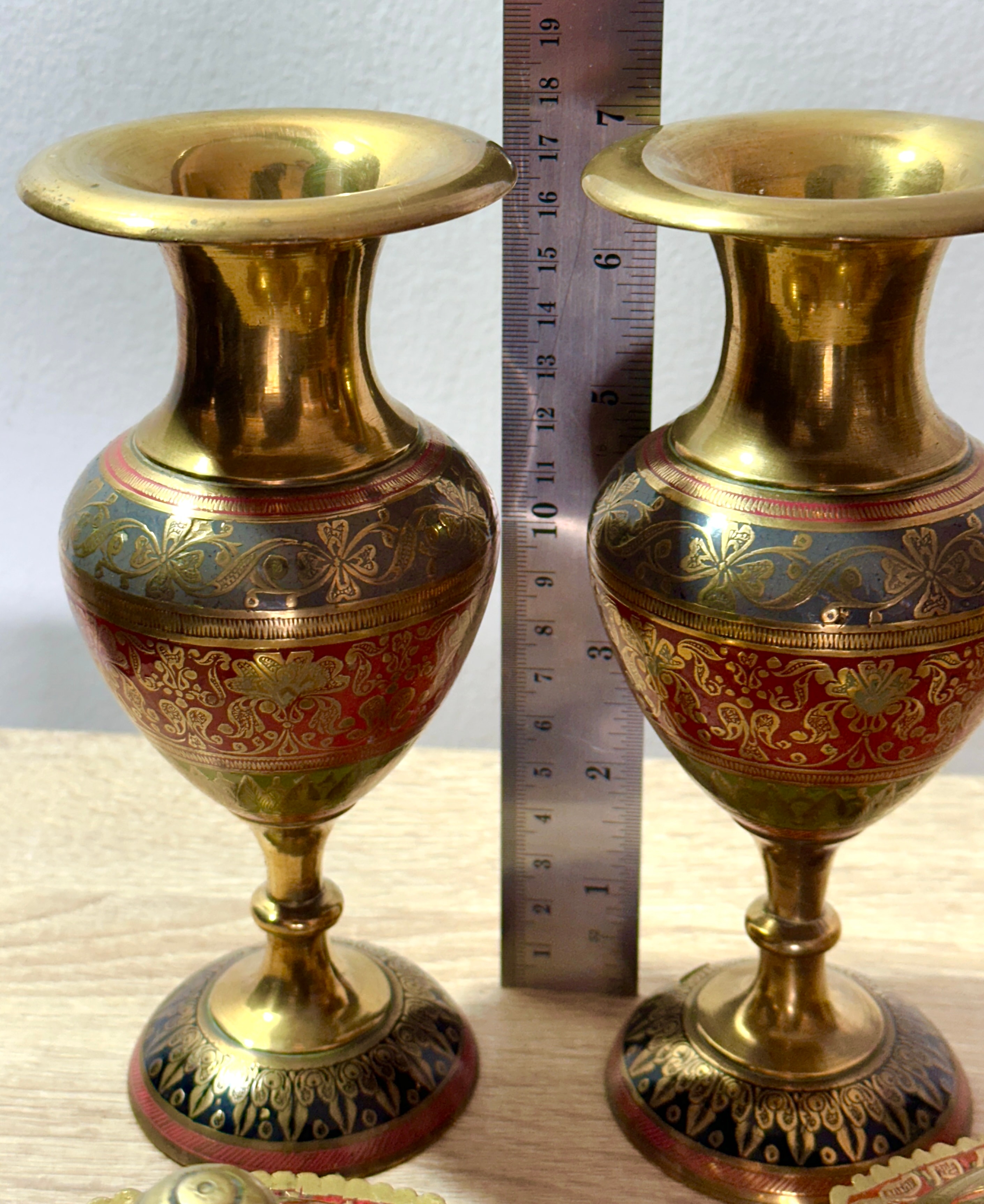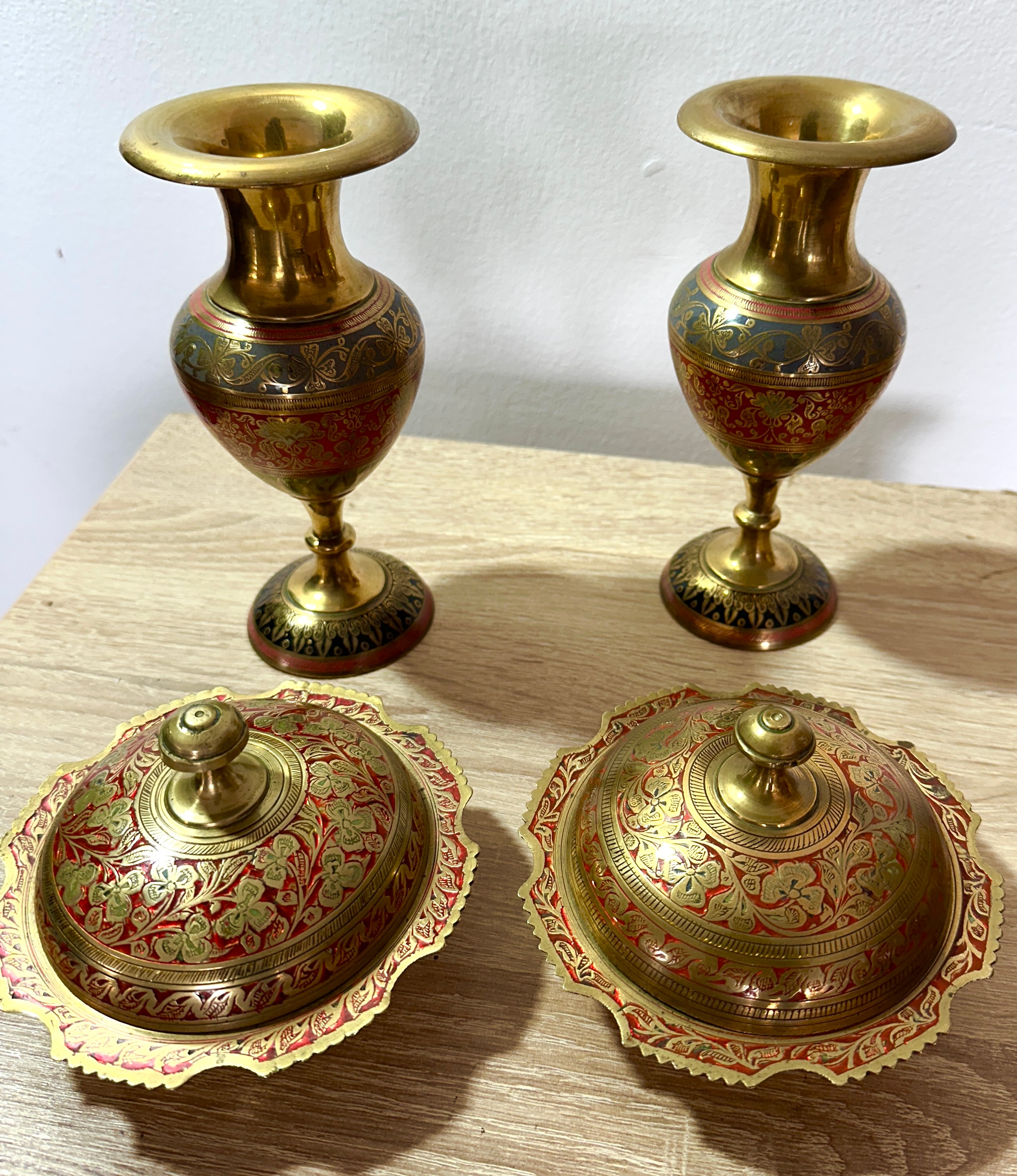 A set of four vintage Indian decorative wares, comprising a matching pair of tall, footed vessels resembling vases or urns, and a matching pair of smaller, lidded bowls or dishes. Each piece is crafted from a brass-toned metal, featuring intricate etched or engraved floral and geometric patterns infilled with red, green, and blue enamel or paint, consistent with a traditional South Asian aesthetic. The reverse side of a ruler visible in the images displays the inscription “MADE IN INDIA.”