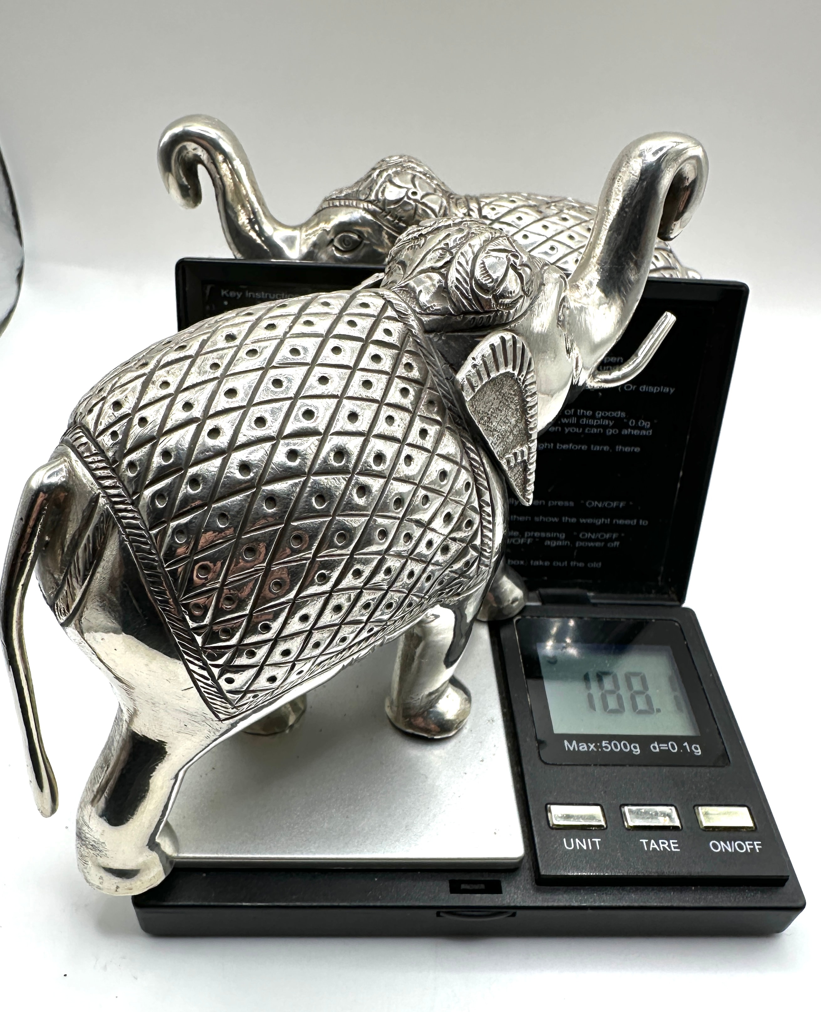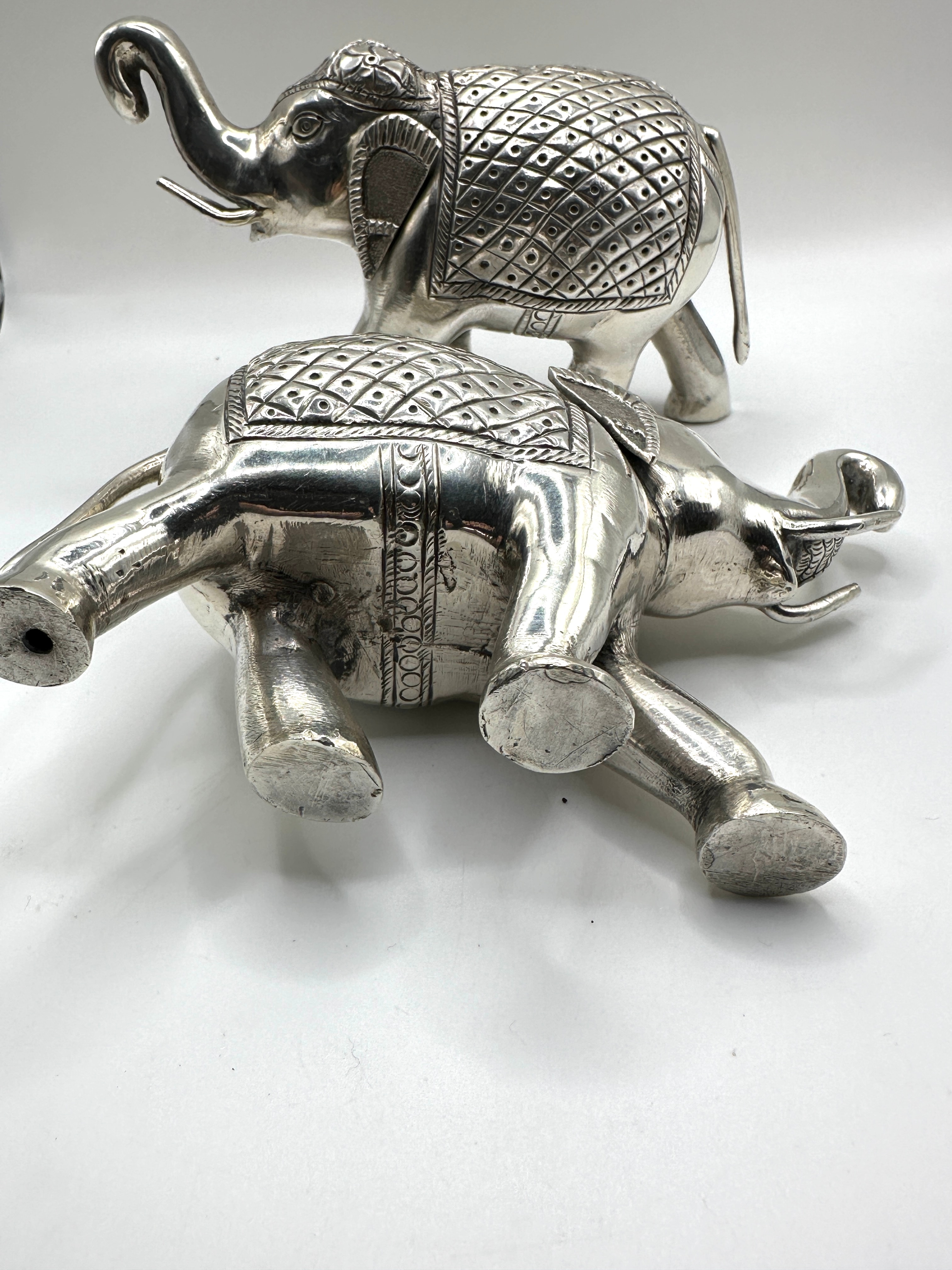 A pair of Indian 800 silver elephant figurines, circa 1940. Each figurine features a polished, silvery finish and a stylized form with a raised trunk. Their backs and heads are elaborately decorated with an intricate, raised diamond pattern, complemented by detailed etching on the ears and legs. No visible text, markings, or hallmarks are discernible.