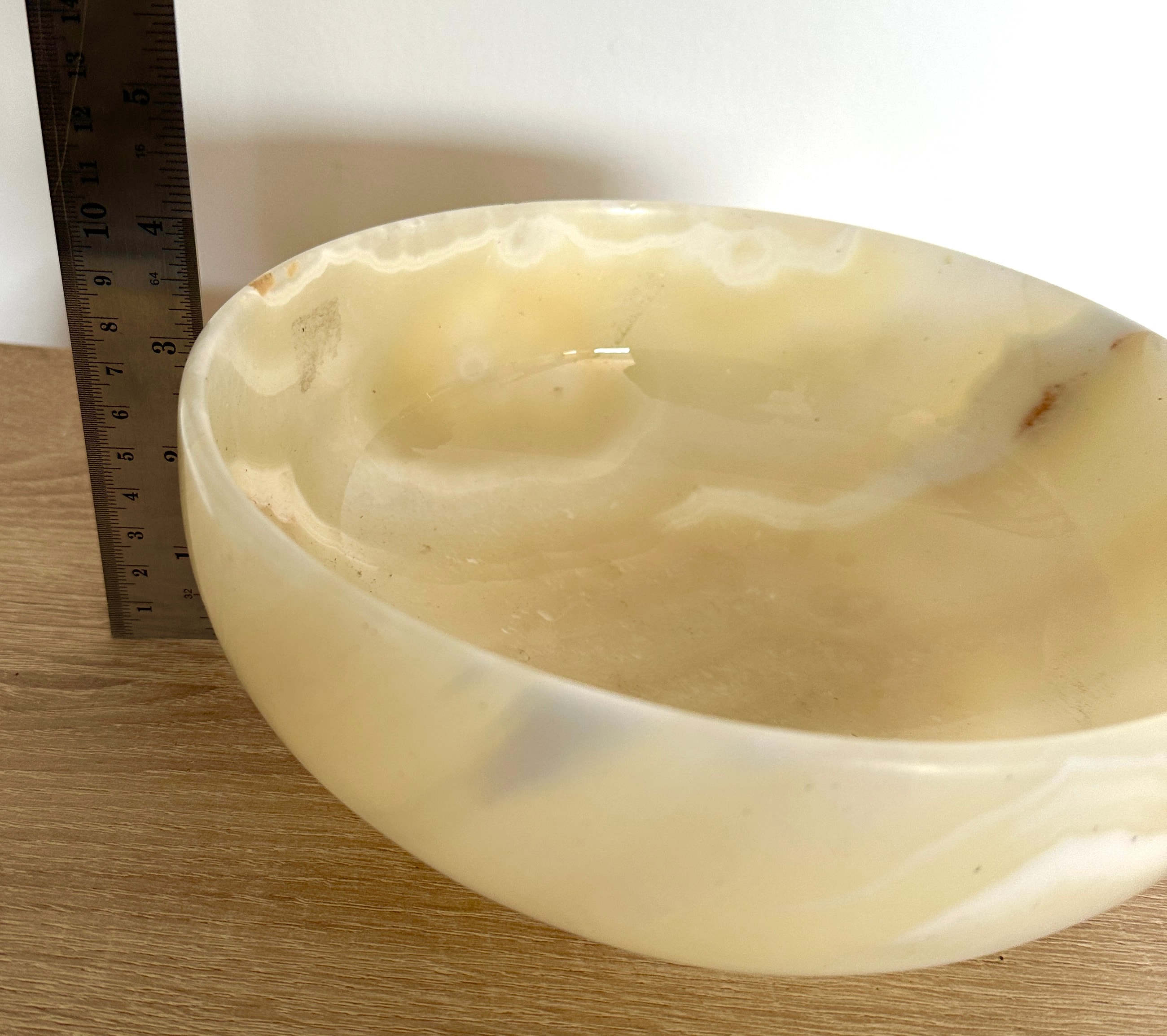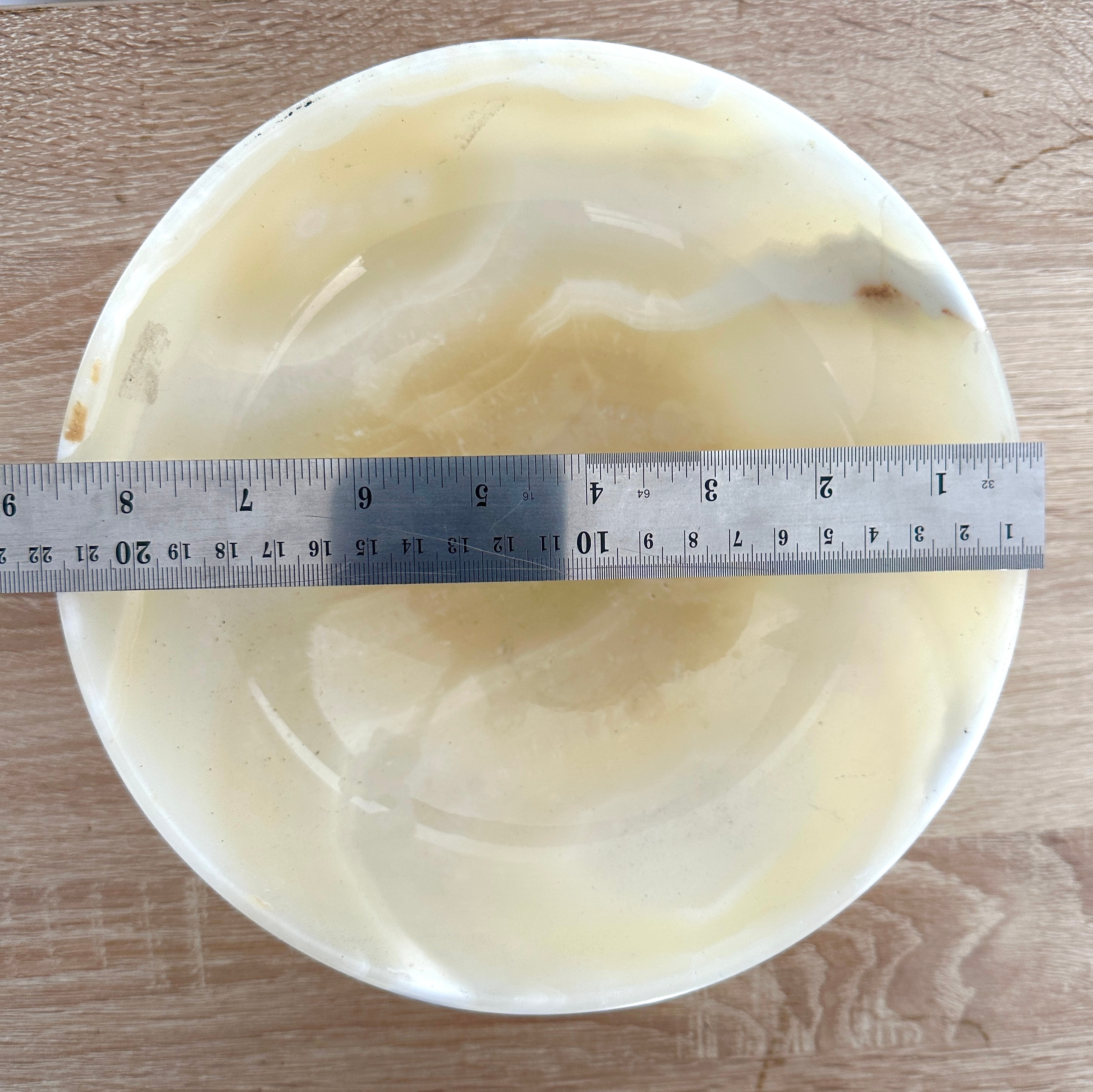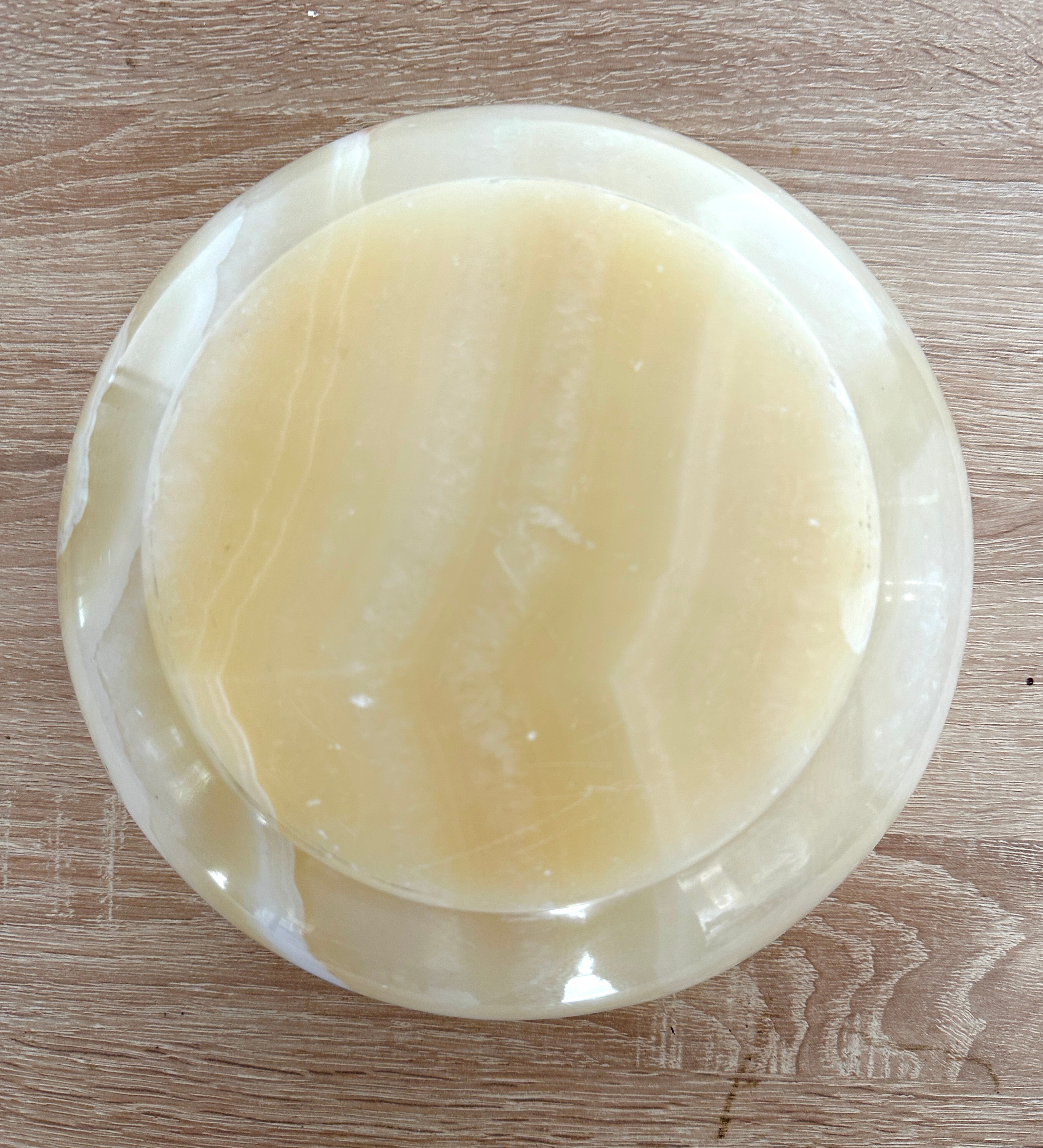 A circular, shallow bowl carved from polished onyx, exhibiting natural translucent banding and swirling patterns in tones of creamy white, butter yellow, and light brown. The unadorned form features a gently curved body and a flat, subtly raised base.