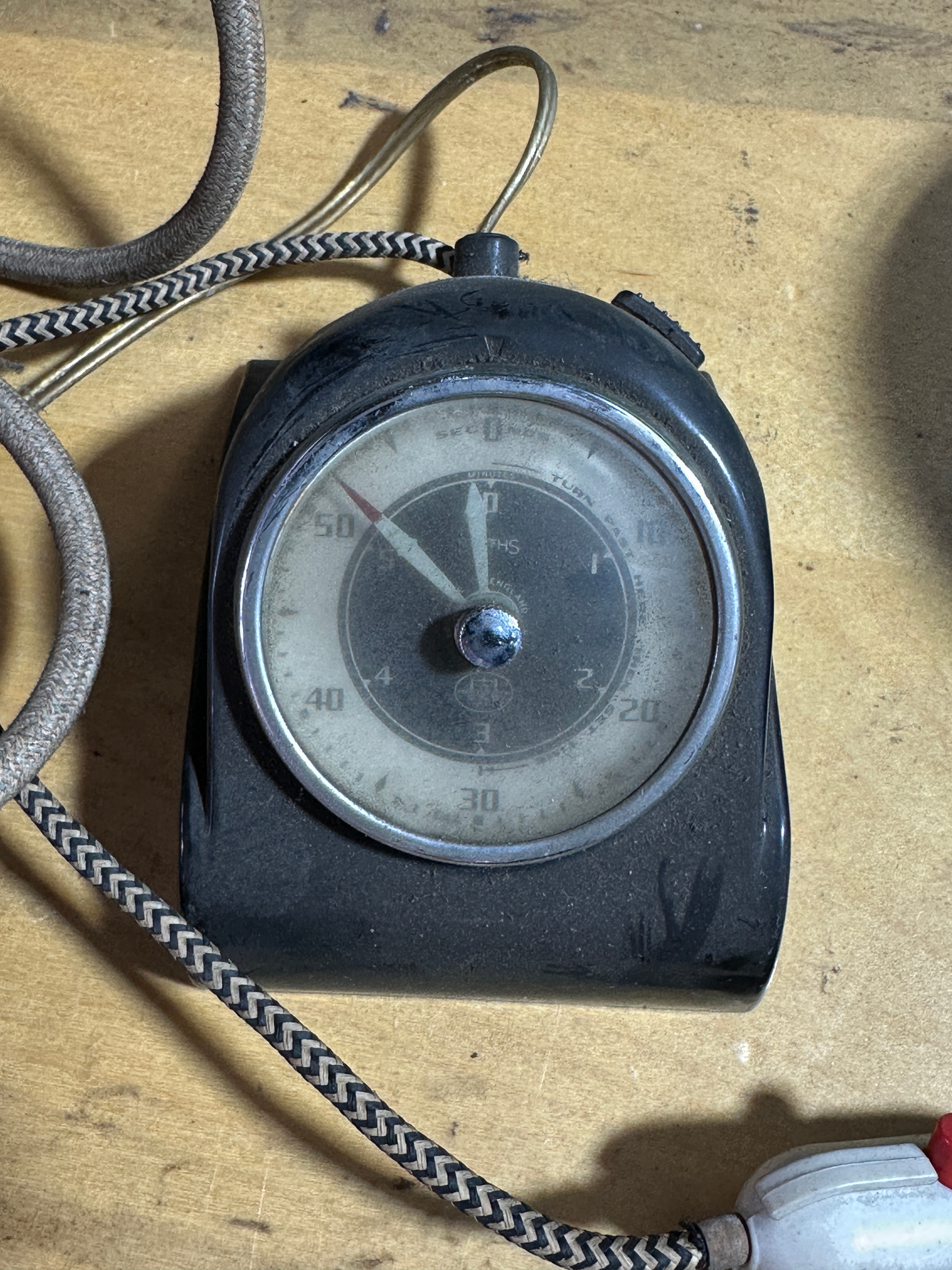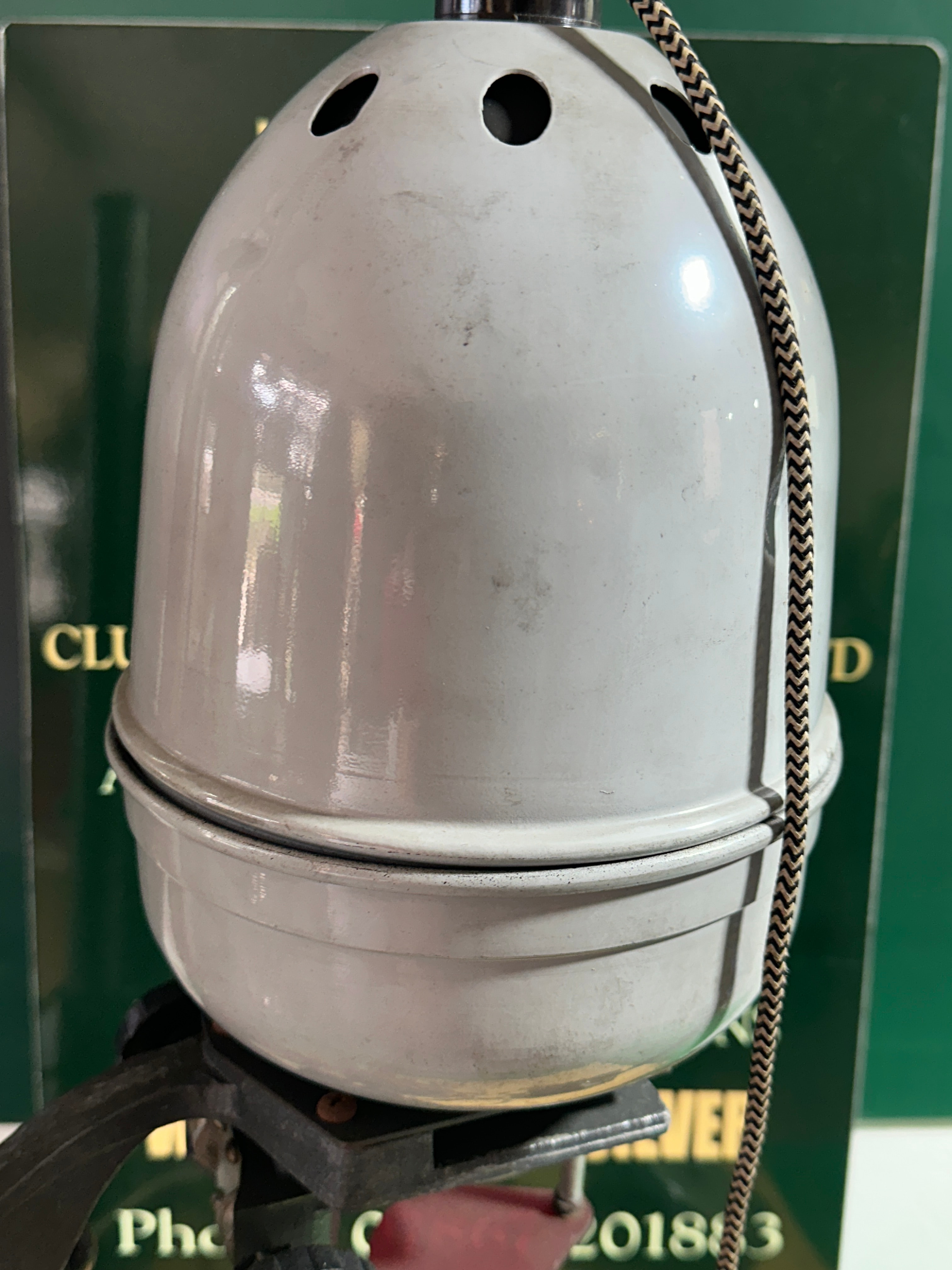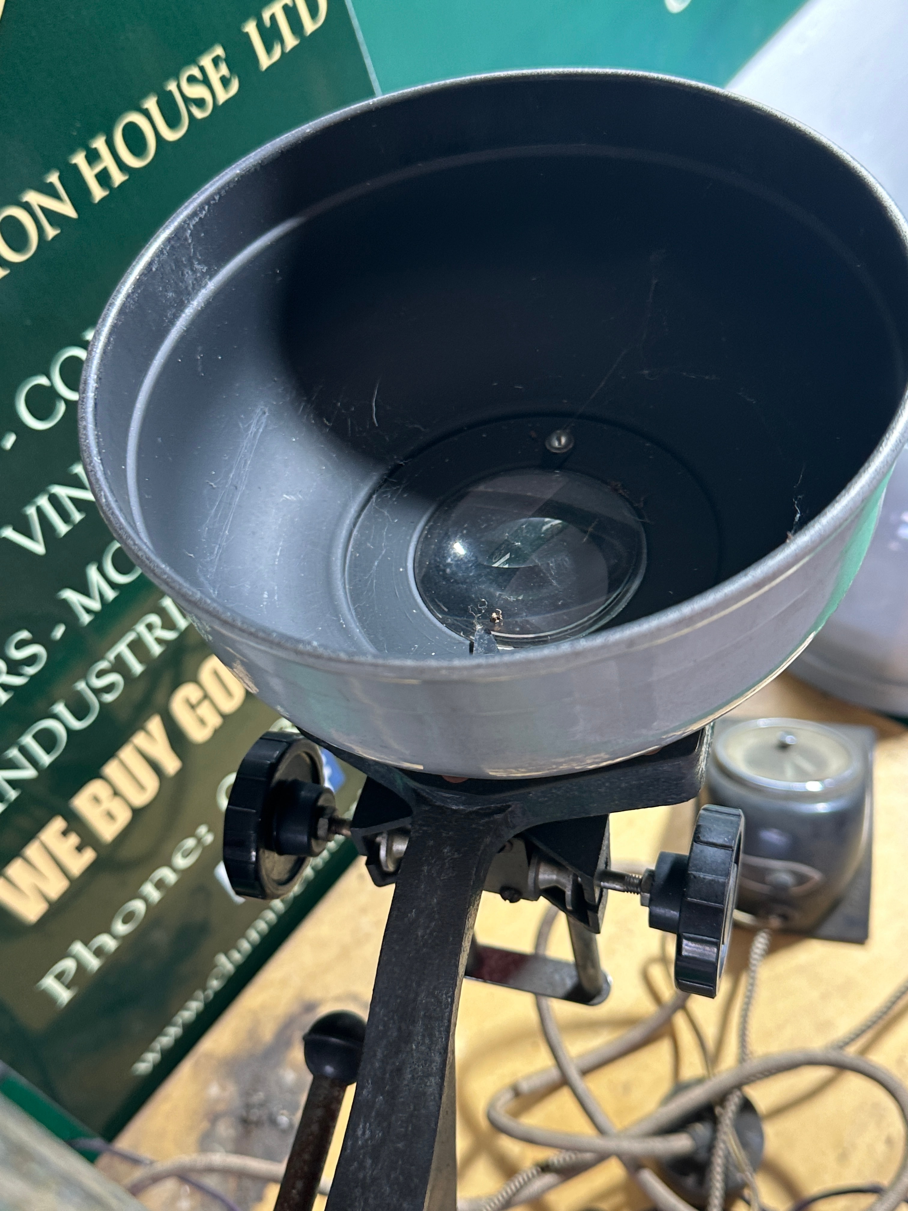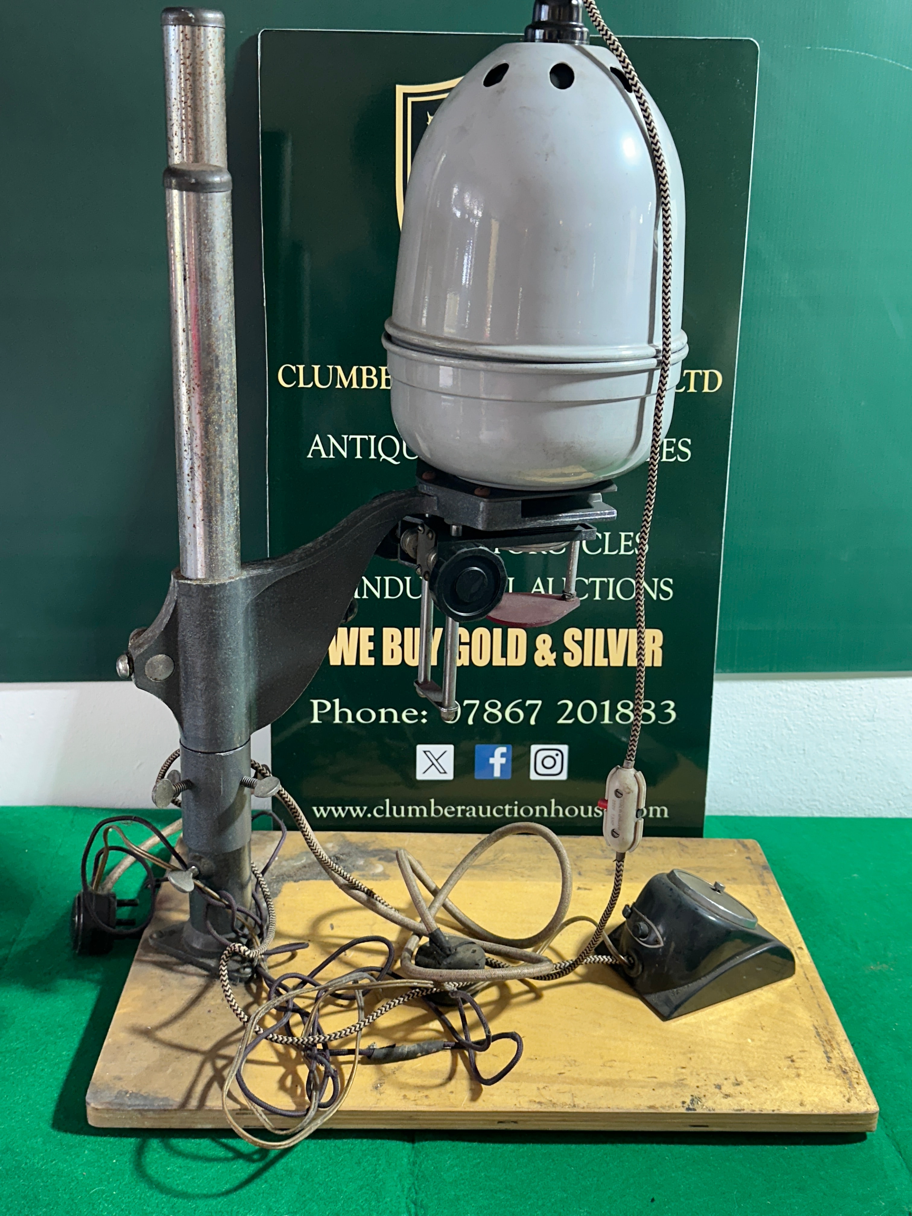 A vintage photographic darkroom enlarger, featuring a light gray enamel-coated lamp head mounted on a silver-toned adjustable metal column, secured to a wooden base. The design incorporates black plastic or bakelite components and fabric-covered electrical cords, indicative of a mid-20th century origin. Accompanying the enlarger is a mechanical timer, constructed from black plastic or bakelite with a metal bezel. The timer is marked “SECONDS,” “TURN PAST MER…,” and “ENGLAND,” and displays a dial calibrated from 1 to 59.