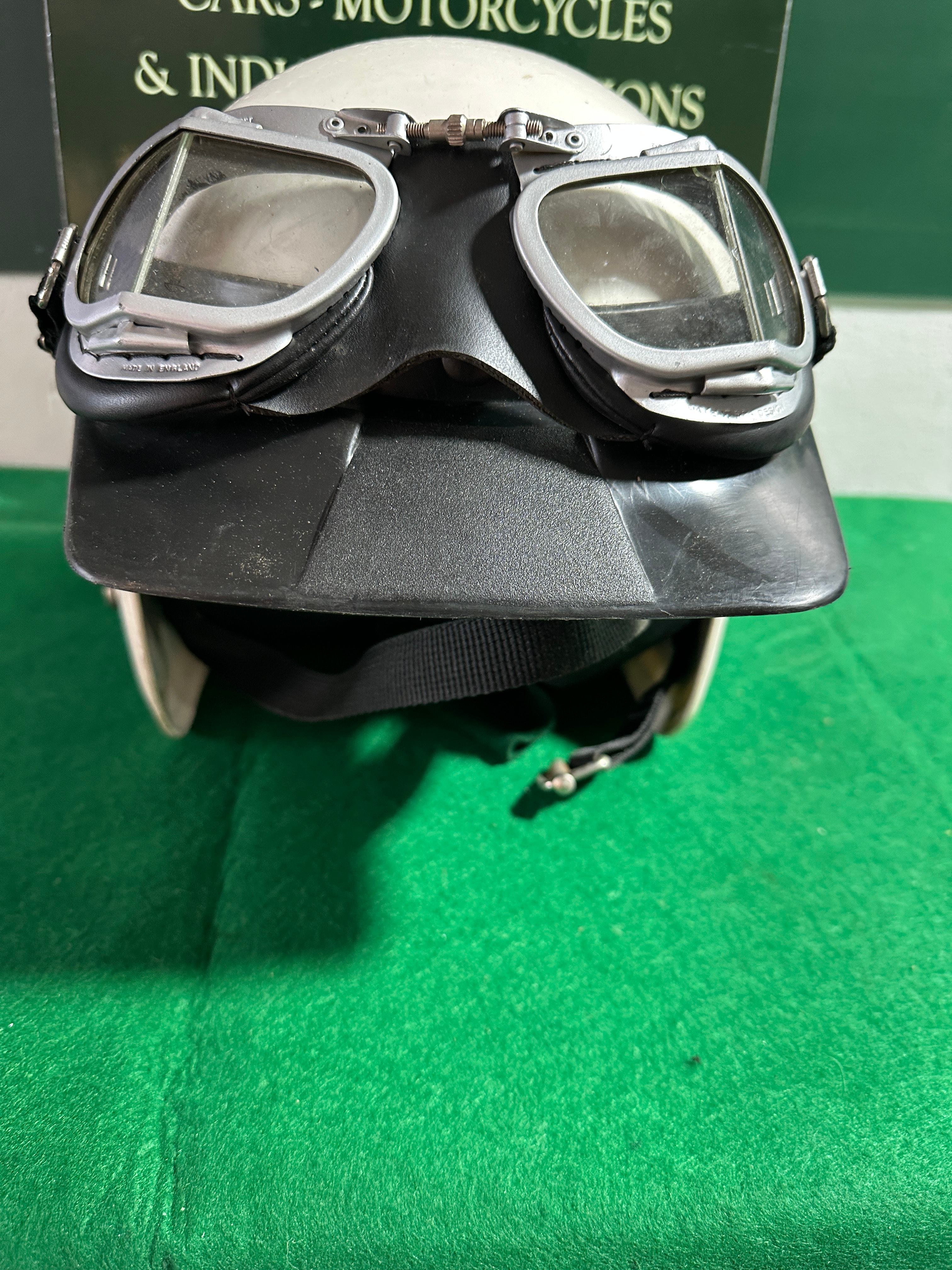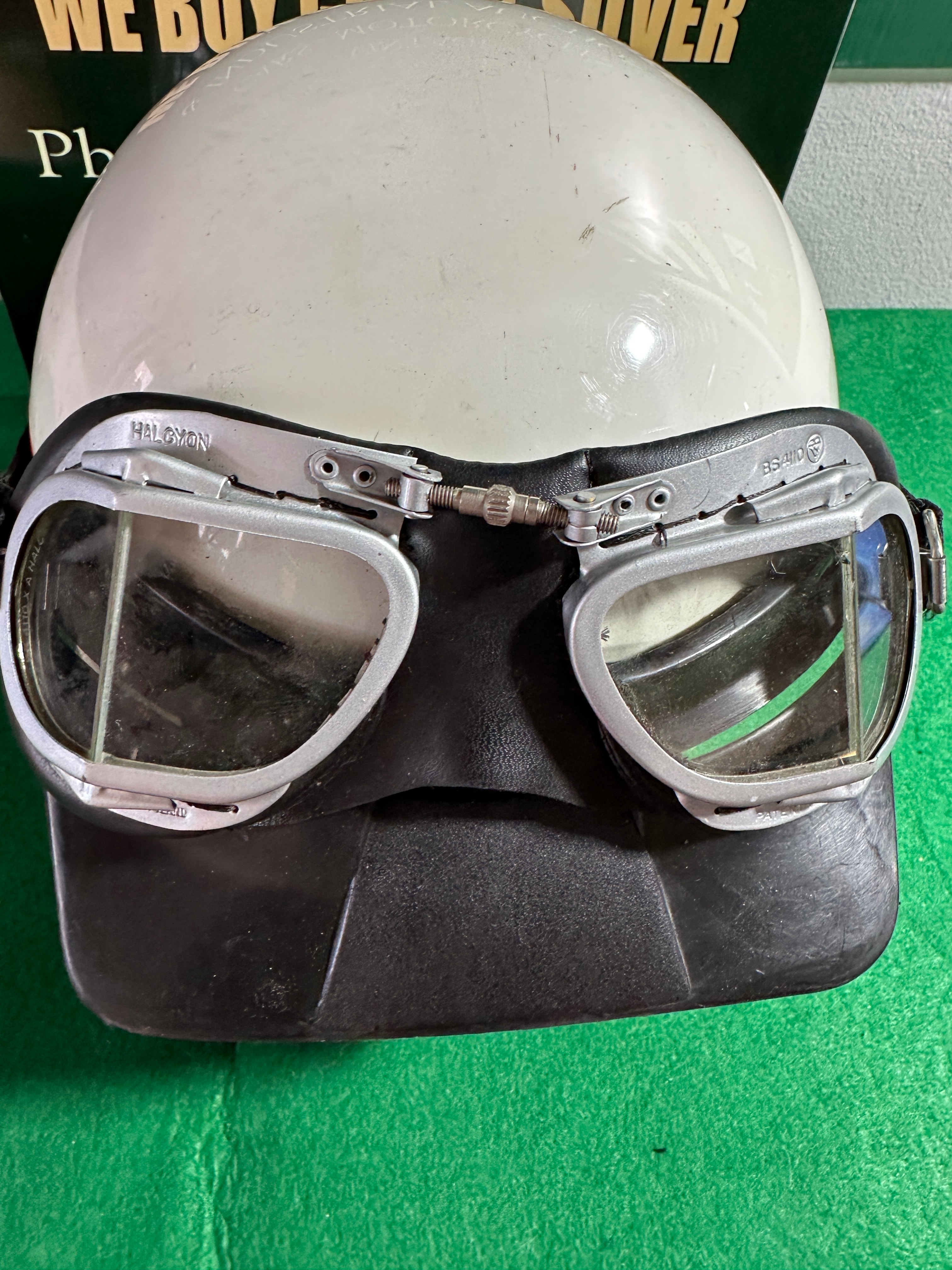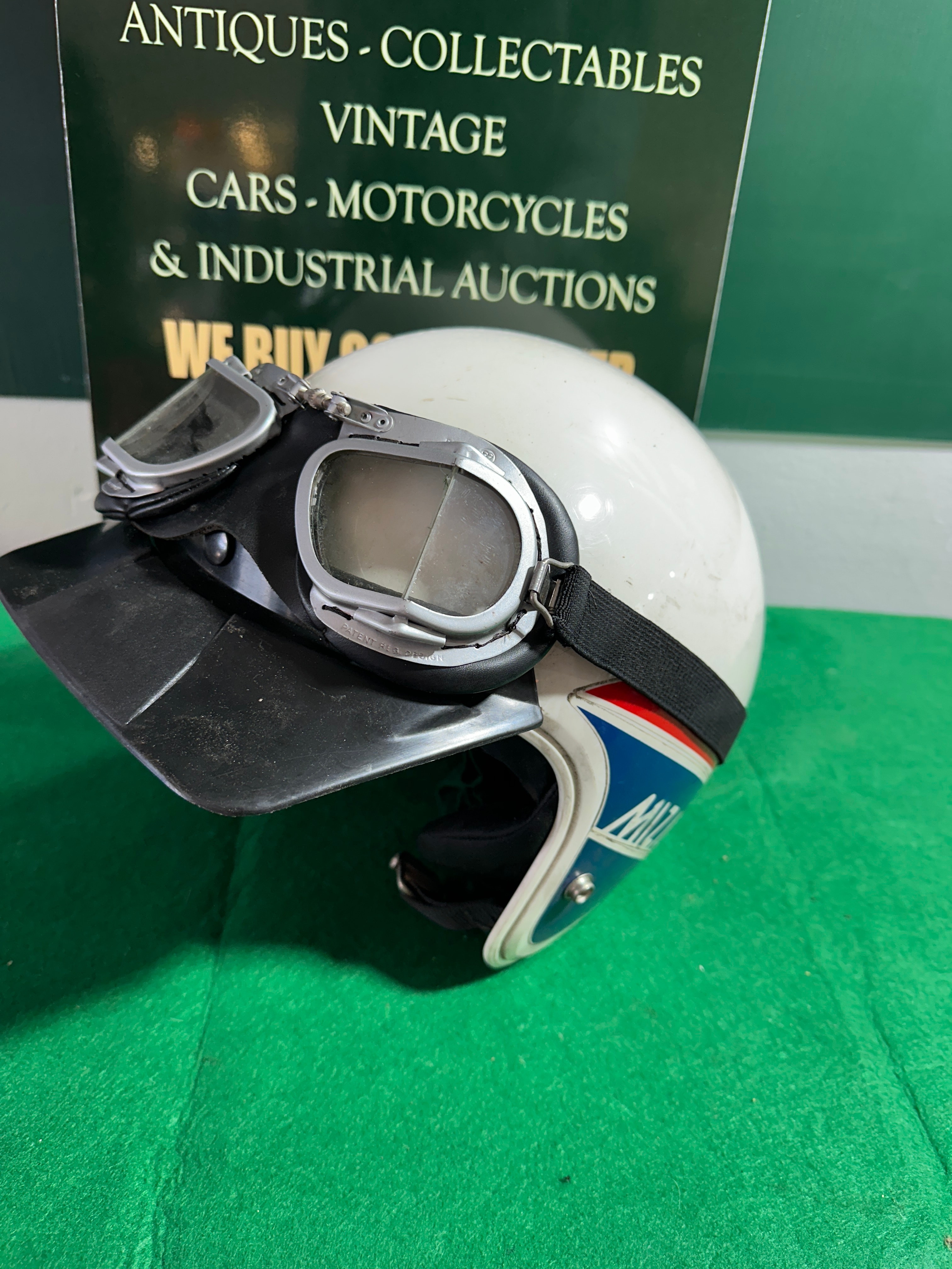 An open-face motorcycle helmet, predominantly white with a distinct red, white, and blue stripe motif on its lower sides, featuring the brand name “MIZAR” in stylized blue lettering. It is paired with aviator-style goggles, which have clear lenses, metal frames, and black leather or rubber padding. The goggles are marked “HALCYON” on one frame and “5540” on the other.