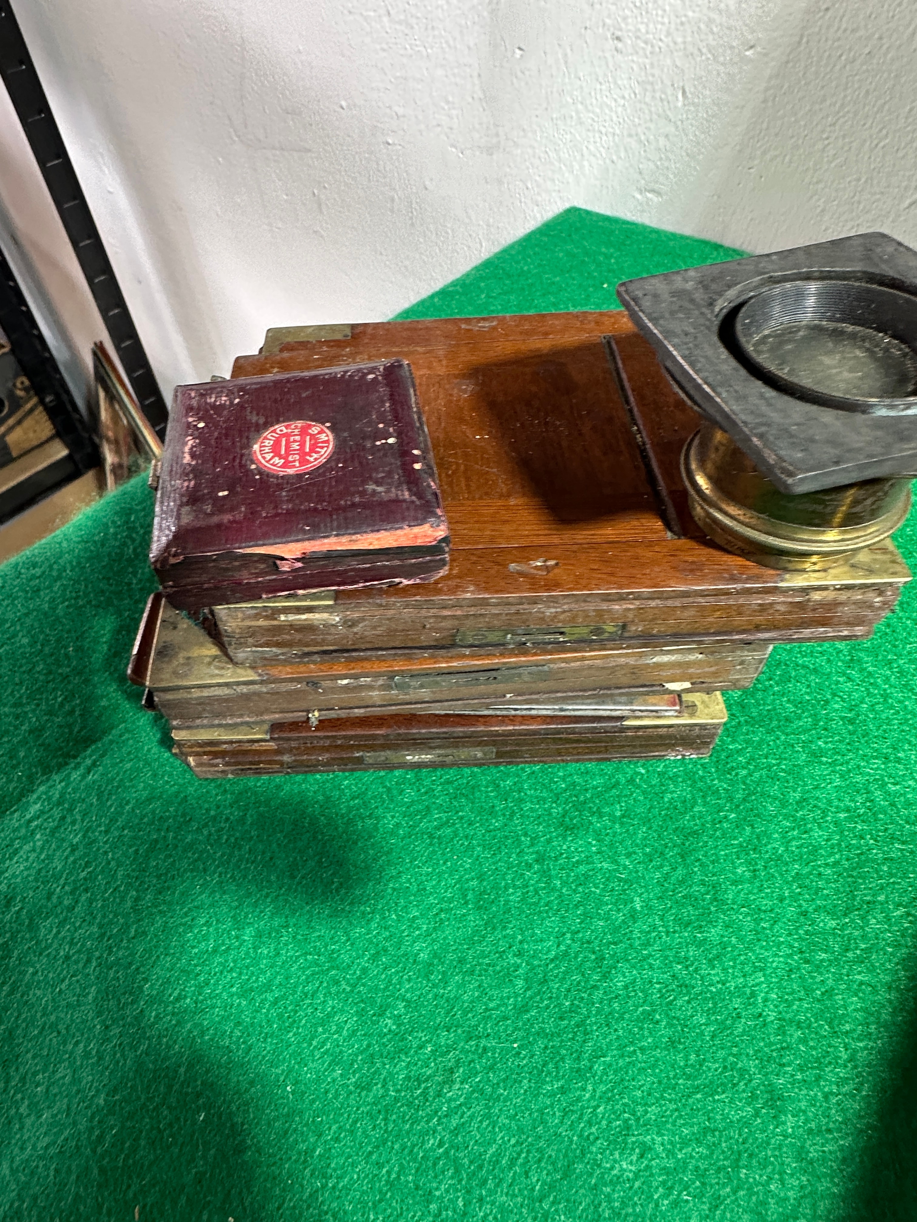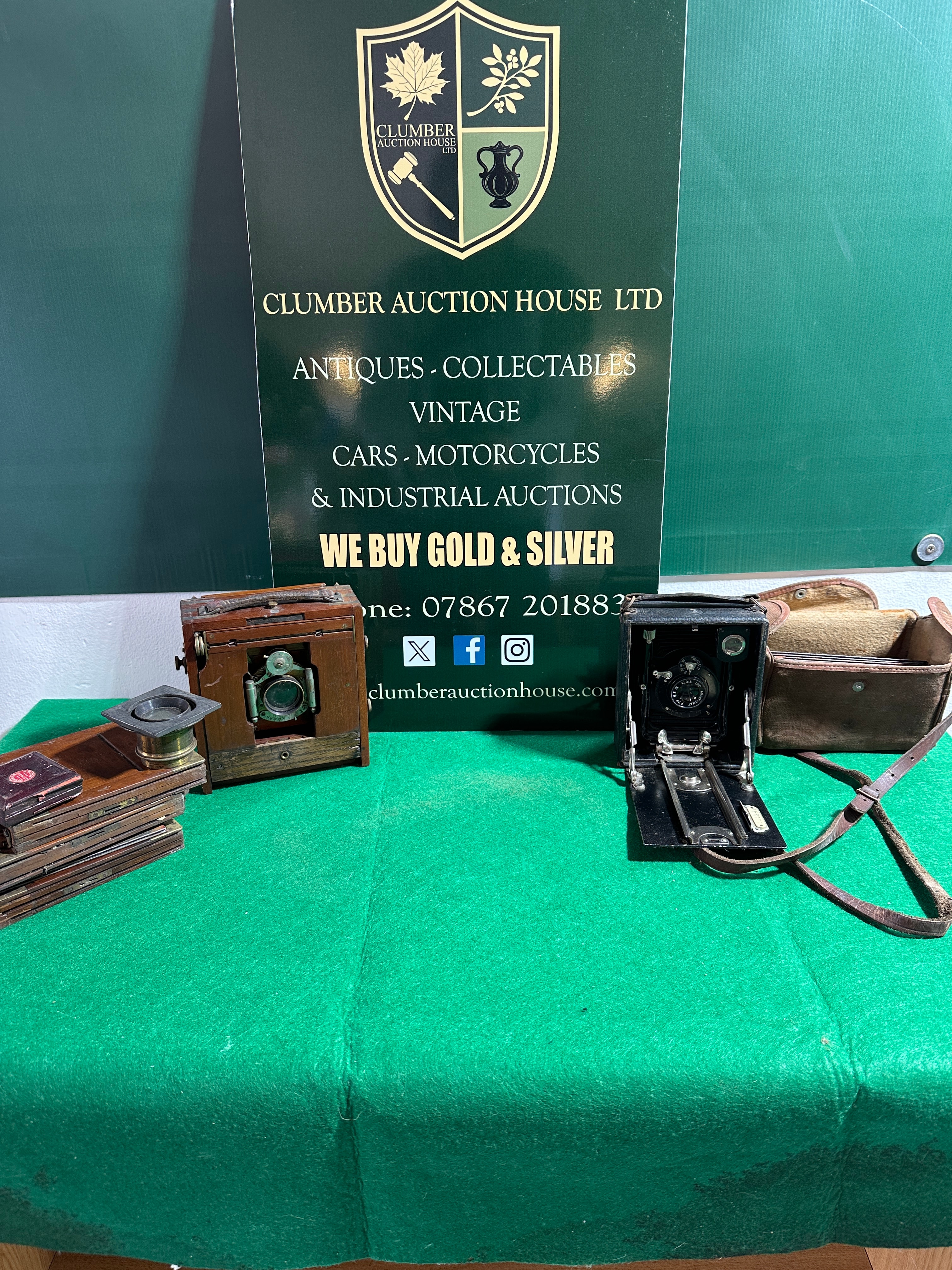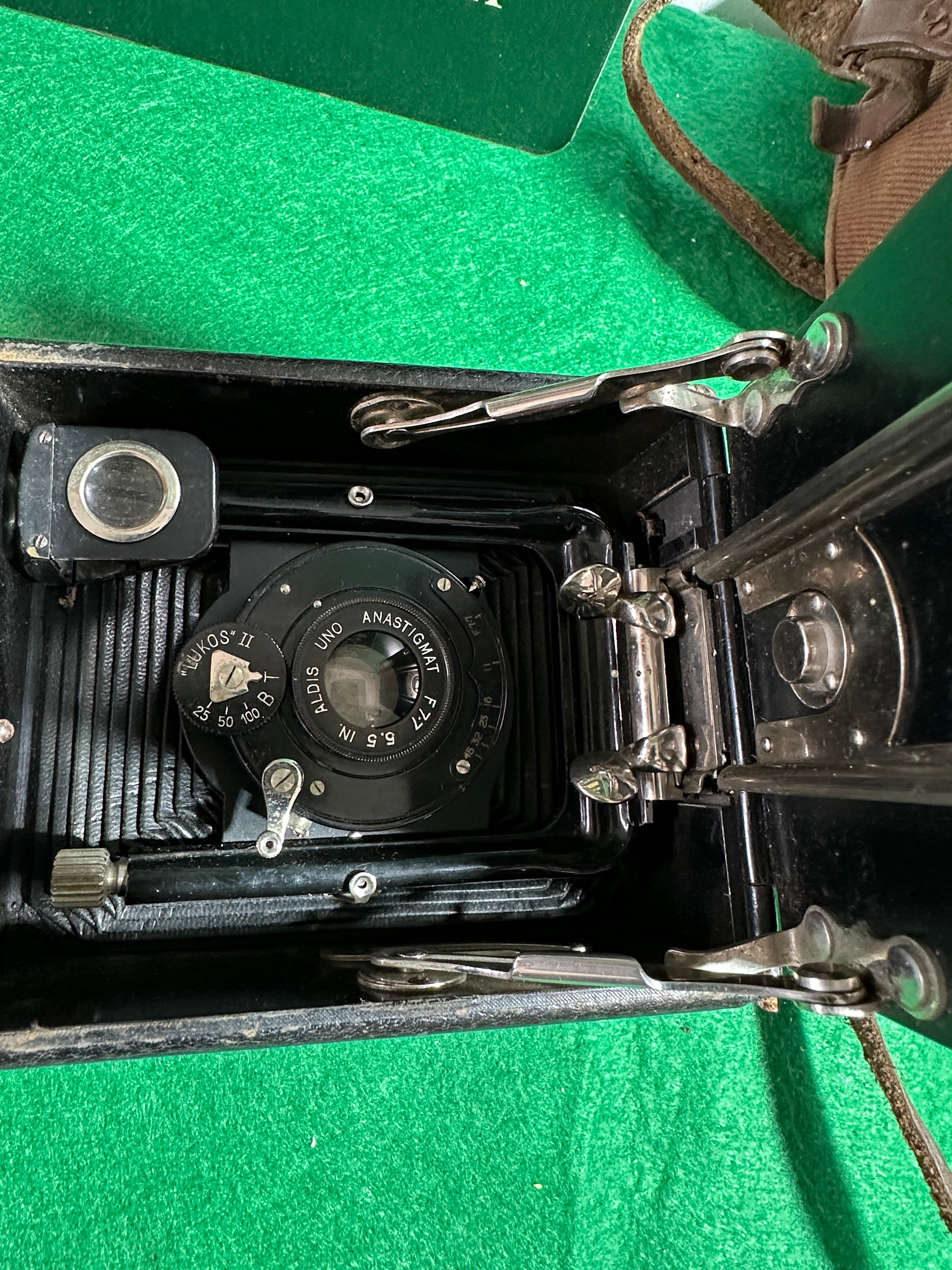 This lot comprises two vintage photographic cameras with a collection of associated accessories. The first camera is a black-bodied folding model, featuring a bellows mechanism. Its lens is explicitly marked “ALDIS UNO ANASTIGMAT 5.5 IN F.7.7.”, and the shutter is inscribed “TUKOS II” with settings “B, 25, 50, 100”. This camera is accompanied by a worn brown leather carrying case containing additional dark slides or plate holders. The second camera is a wooden-bodied large format or field camera, distinguished by visible brass and metal fittings. It comes with a stack of multiple wooden dark slides or film plate holders and a small brass-toned cup-like accessory. Also included in the lot is a small red box, partially legible as “GEMT”.