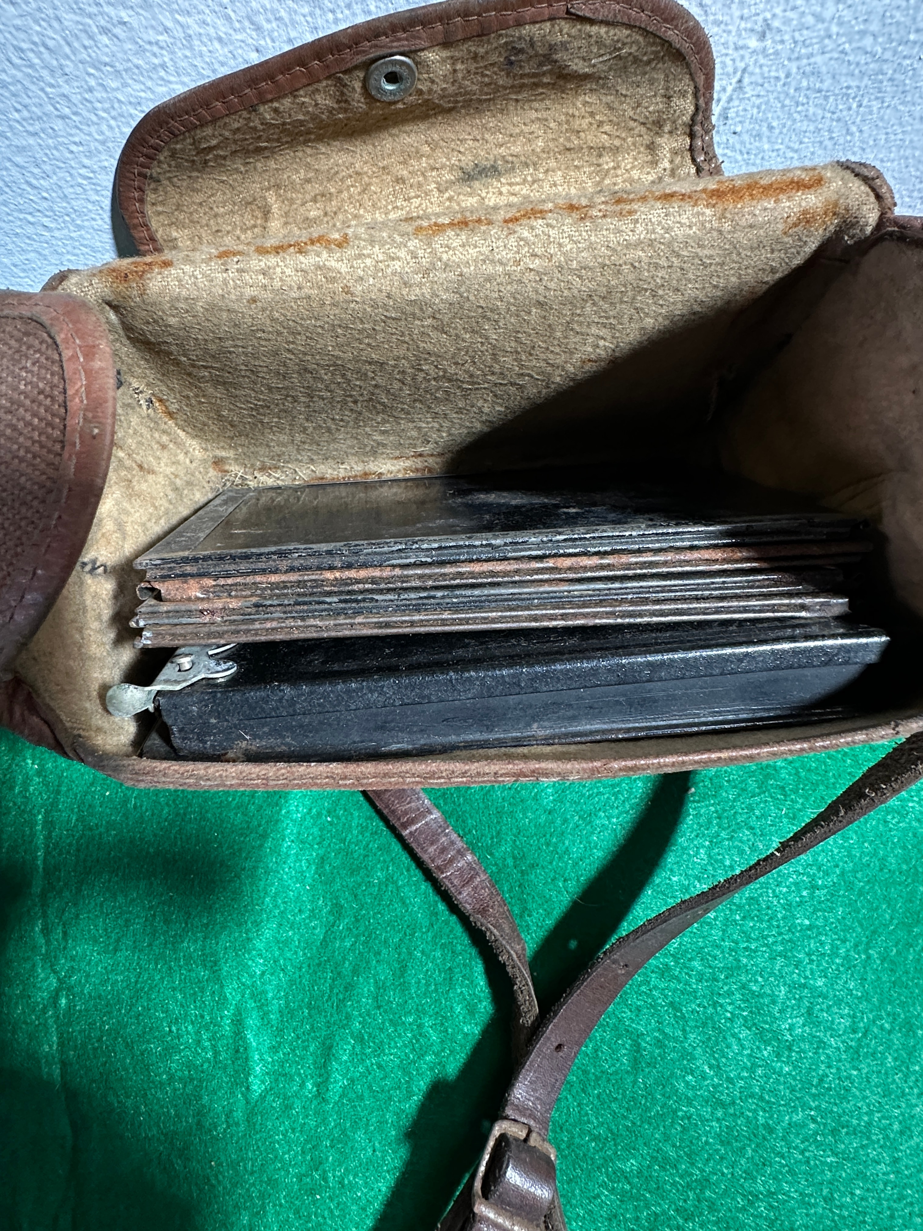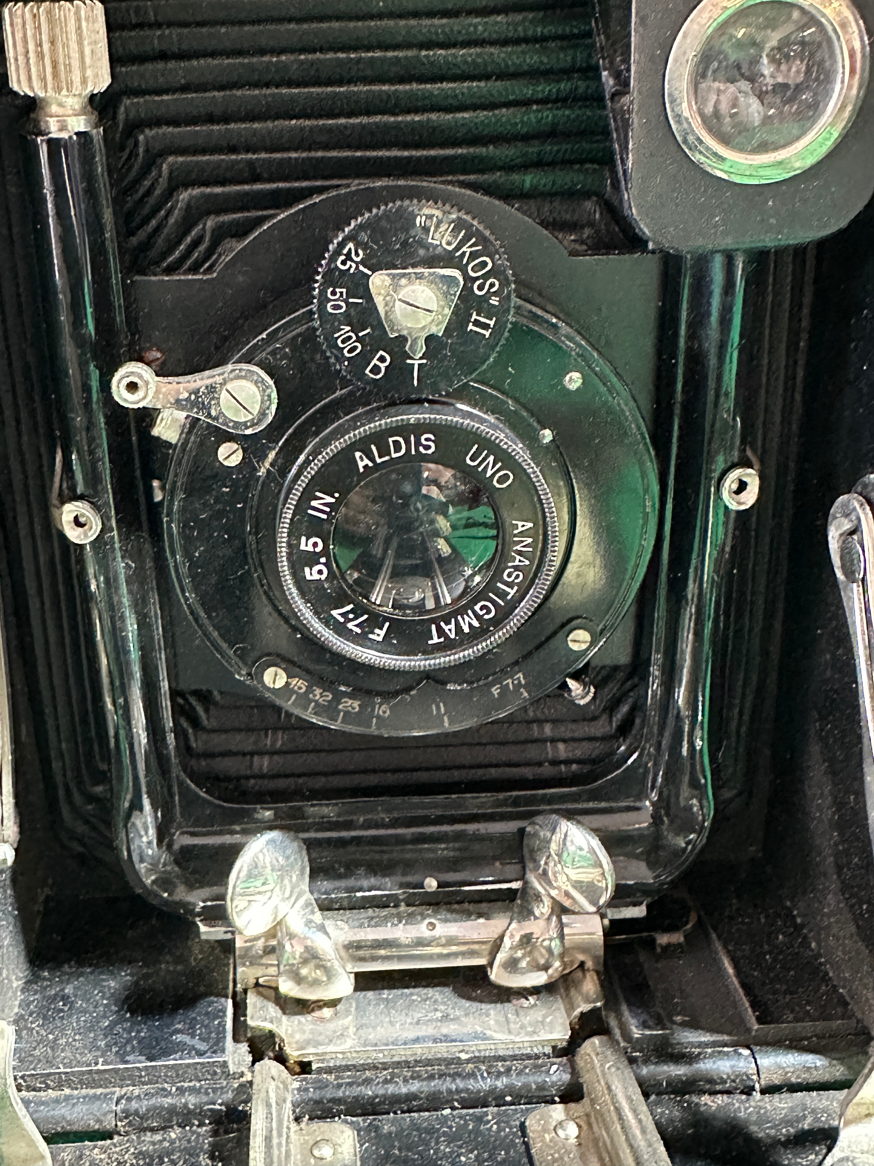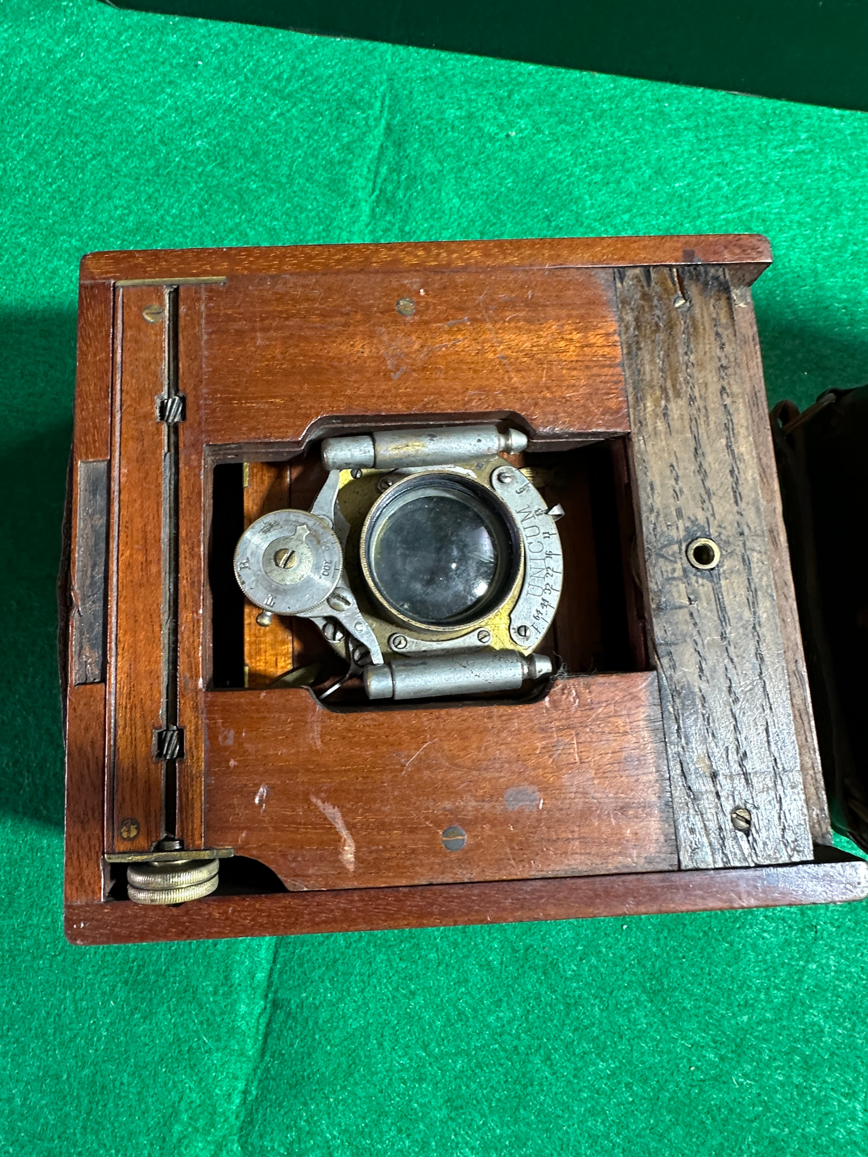 This lot comprises two vintage photographic cameras with a collection of associated accessories. The first camera is a black-bodied folding model, featuring a bellows mechanism. Its lens is explicitly marked “ALDIS UNO ANASTIGMAT 5.5 IN F.7.7.”, and the shutter is inscribed “TUKOS II” with settings “B, 25, 50, 100”. This camera is accompanied by a worn brown leather carrying case containing additional dark slides or plate holders. The second camera is a wooden-bodied large format or field camera, distinguished by visible brass and metal fittings. It comes with a stack of multiple wooden dark slides or film plate holders and a small brass-toned cup-like accessory. Also included in the lot is a small red box, partially legible as “GEMT”.