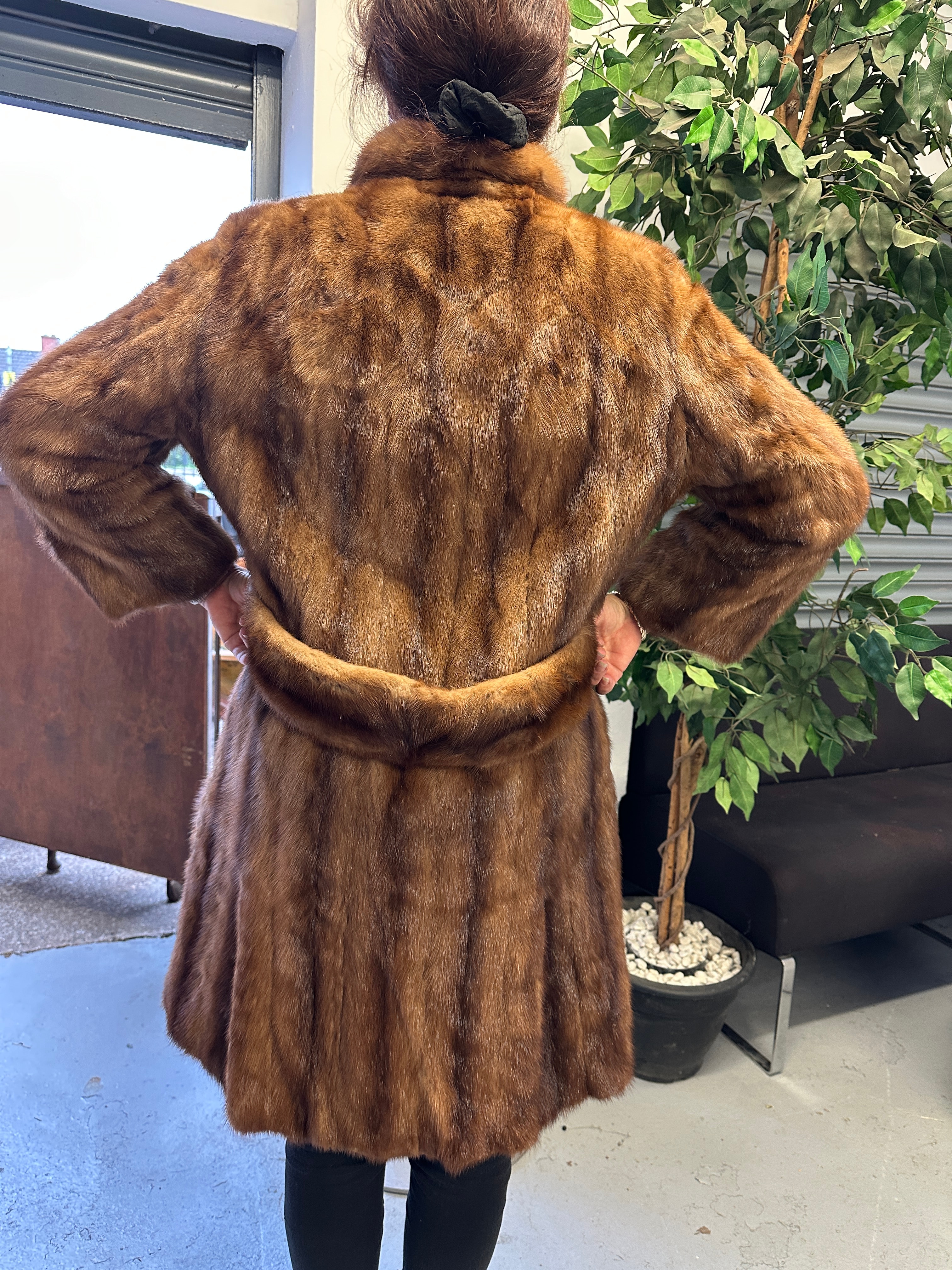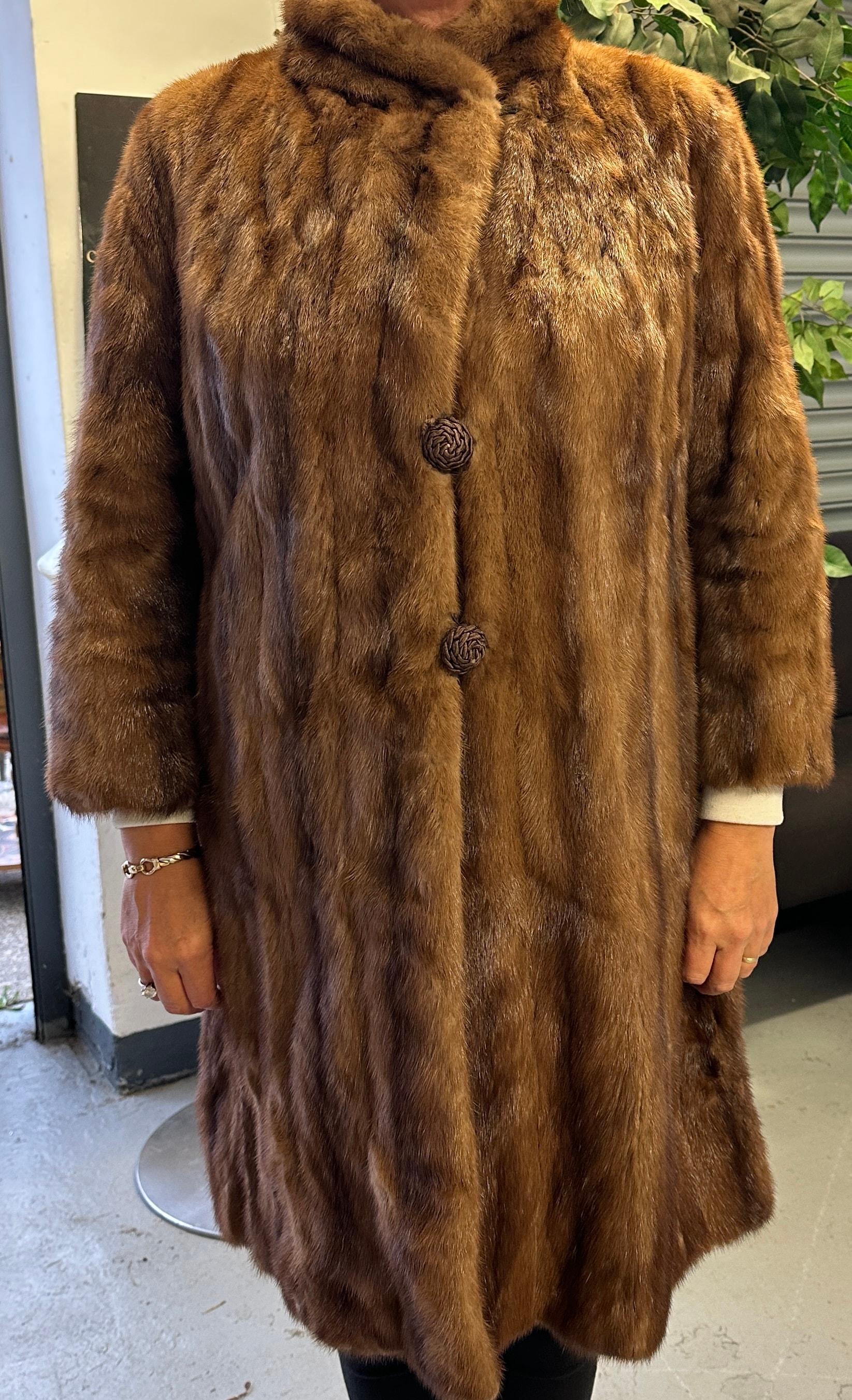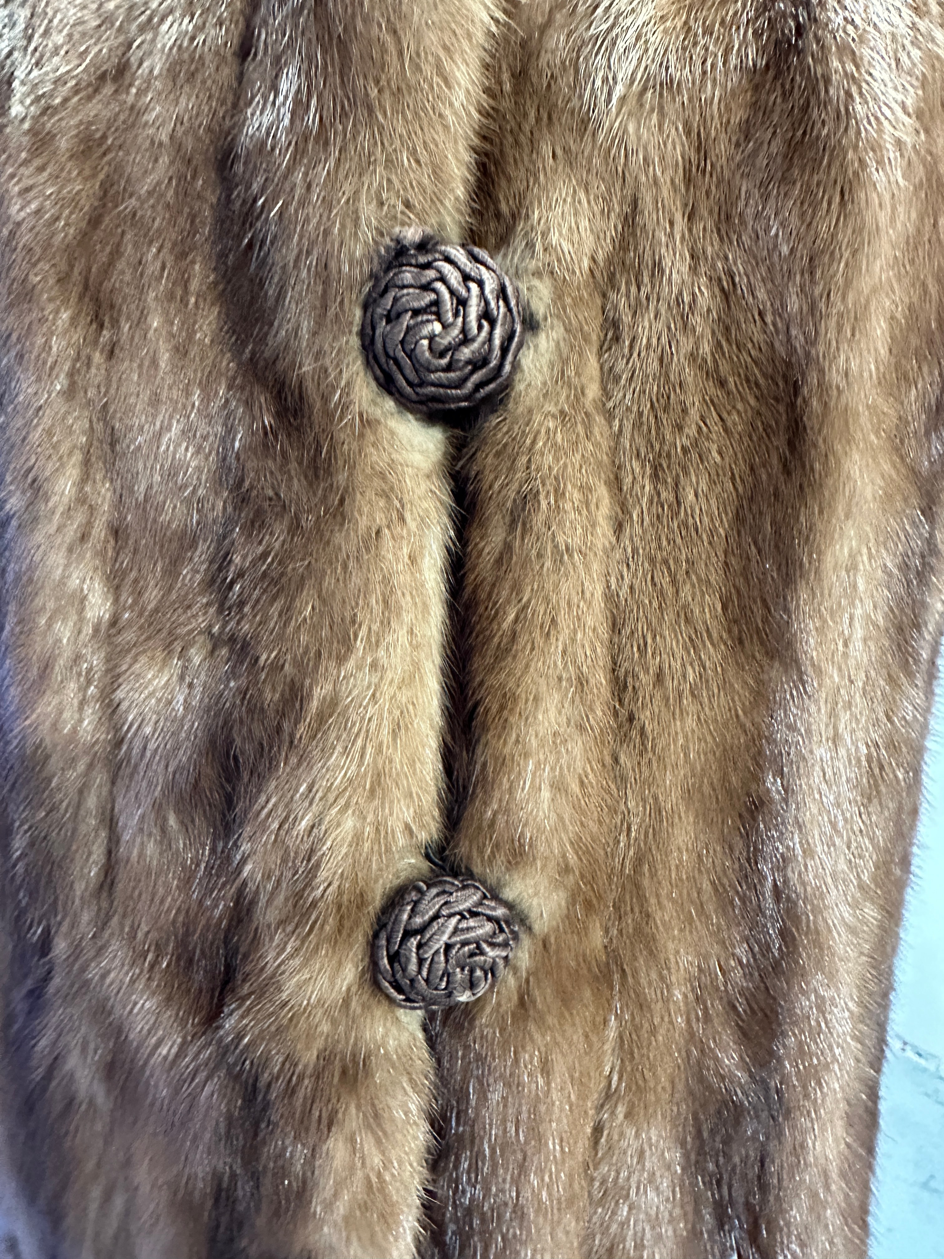 A vintage brown mink fur coat, knee-length, featuring a stand-up collar and long sleeves. The front is secured by two ornate, coiled fabric buttons. A matching fur belt is visible across the back. No visible text, labels, or maker’s marks are discernible on the item.