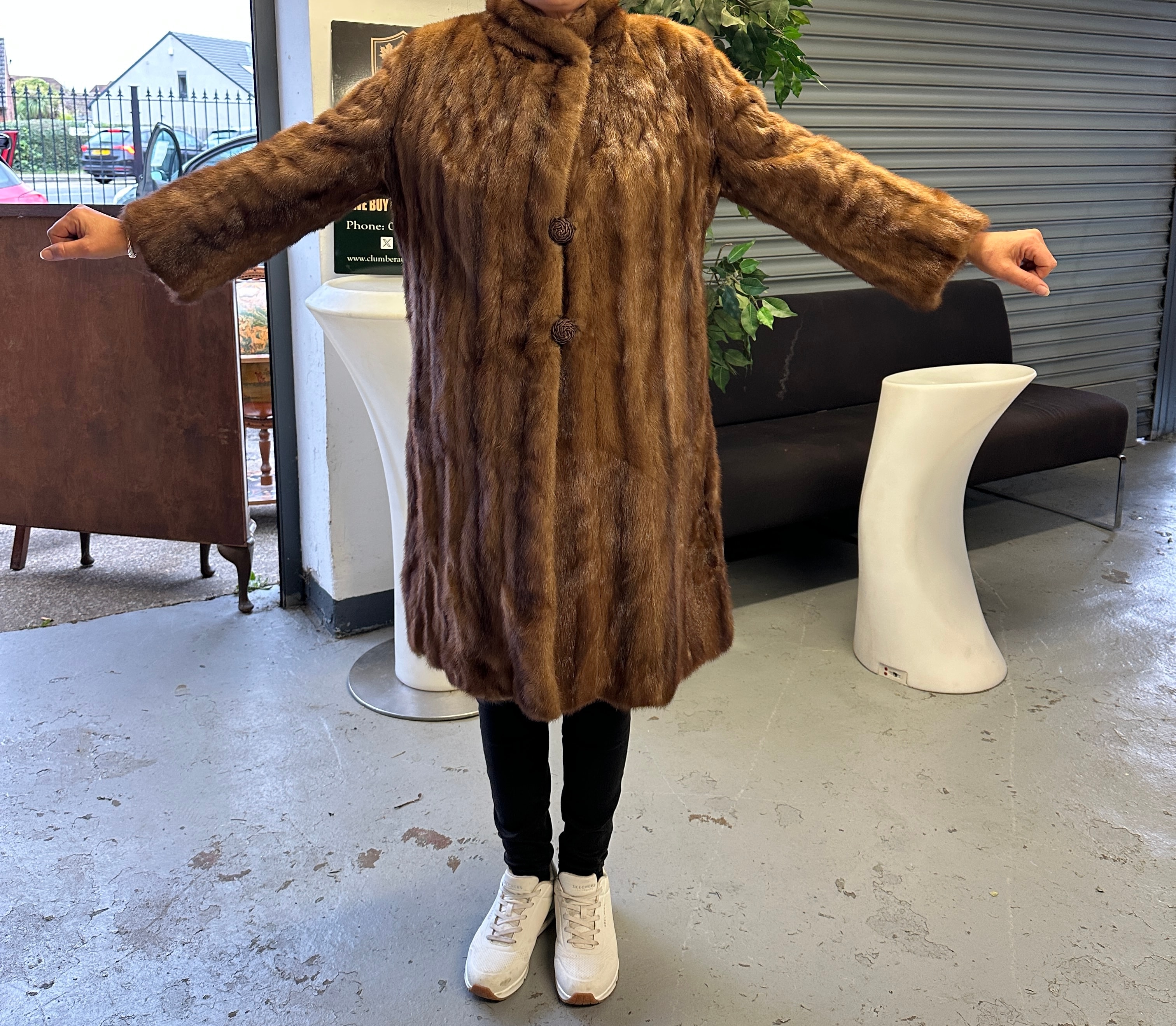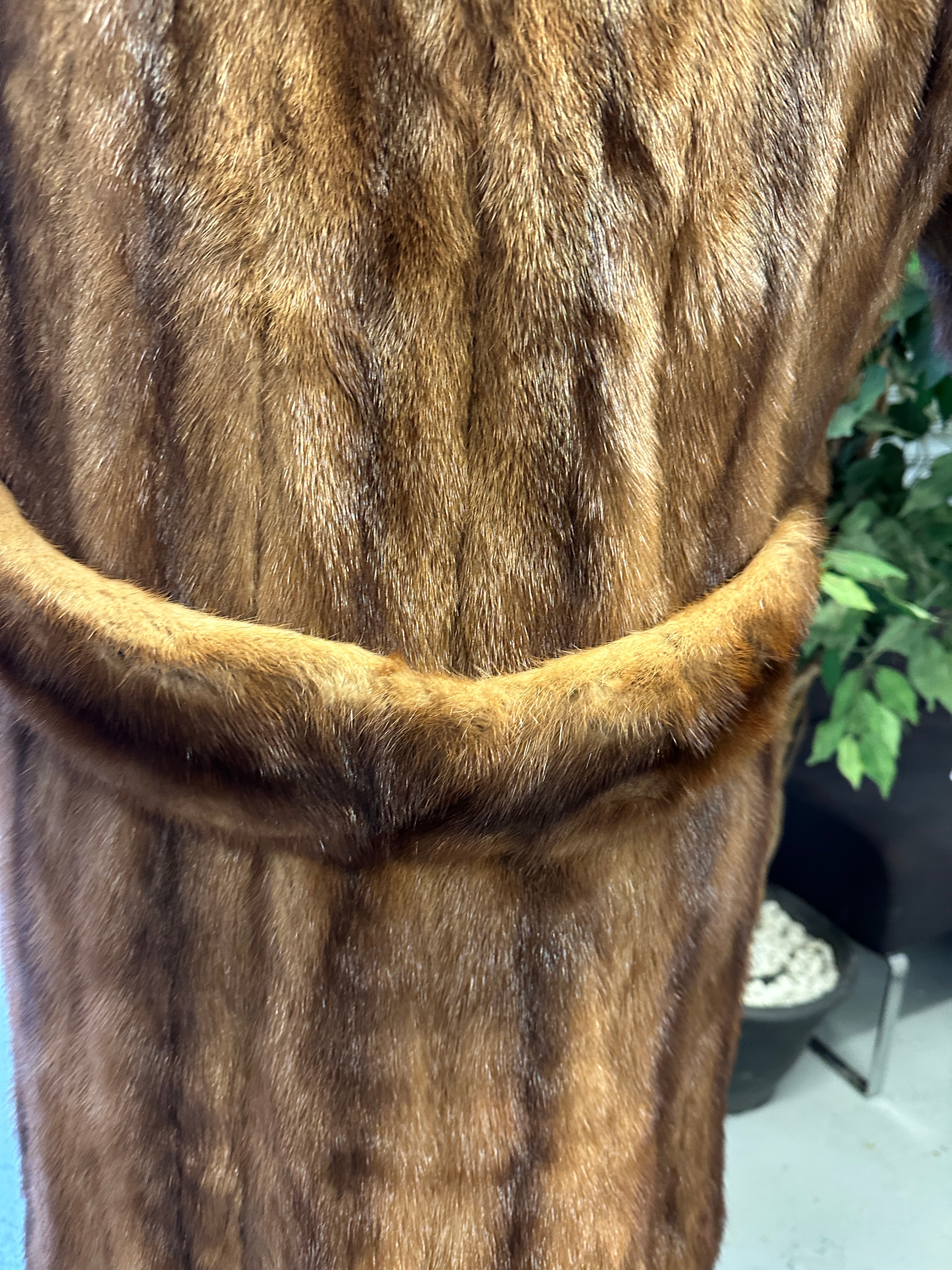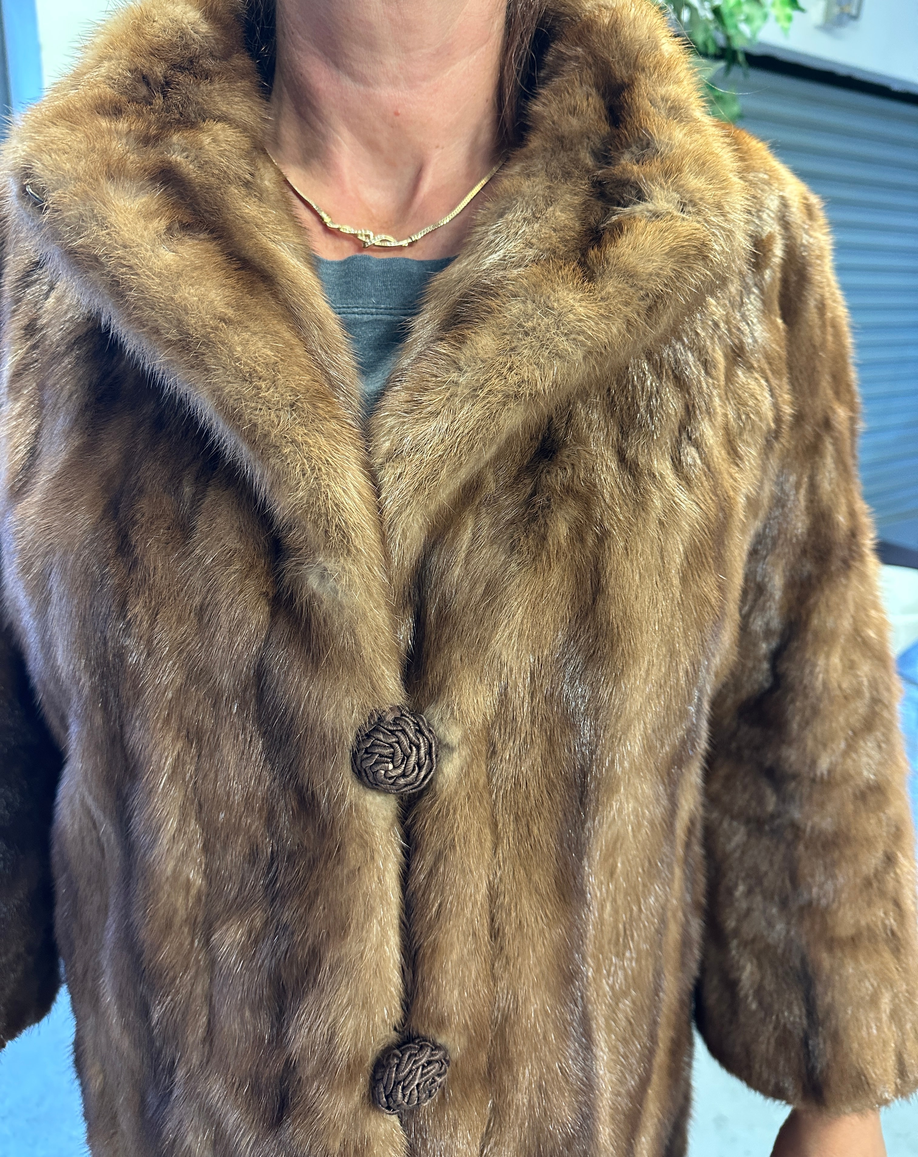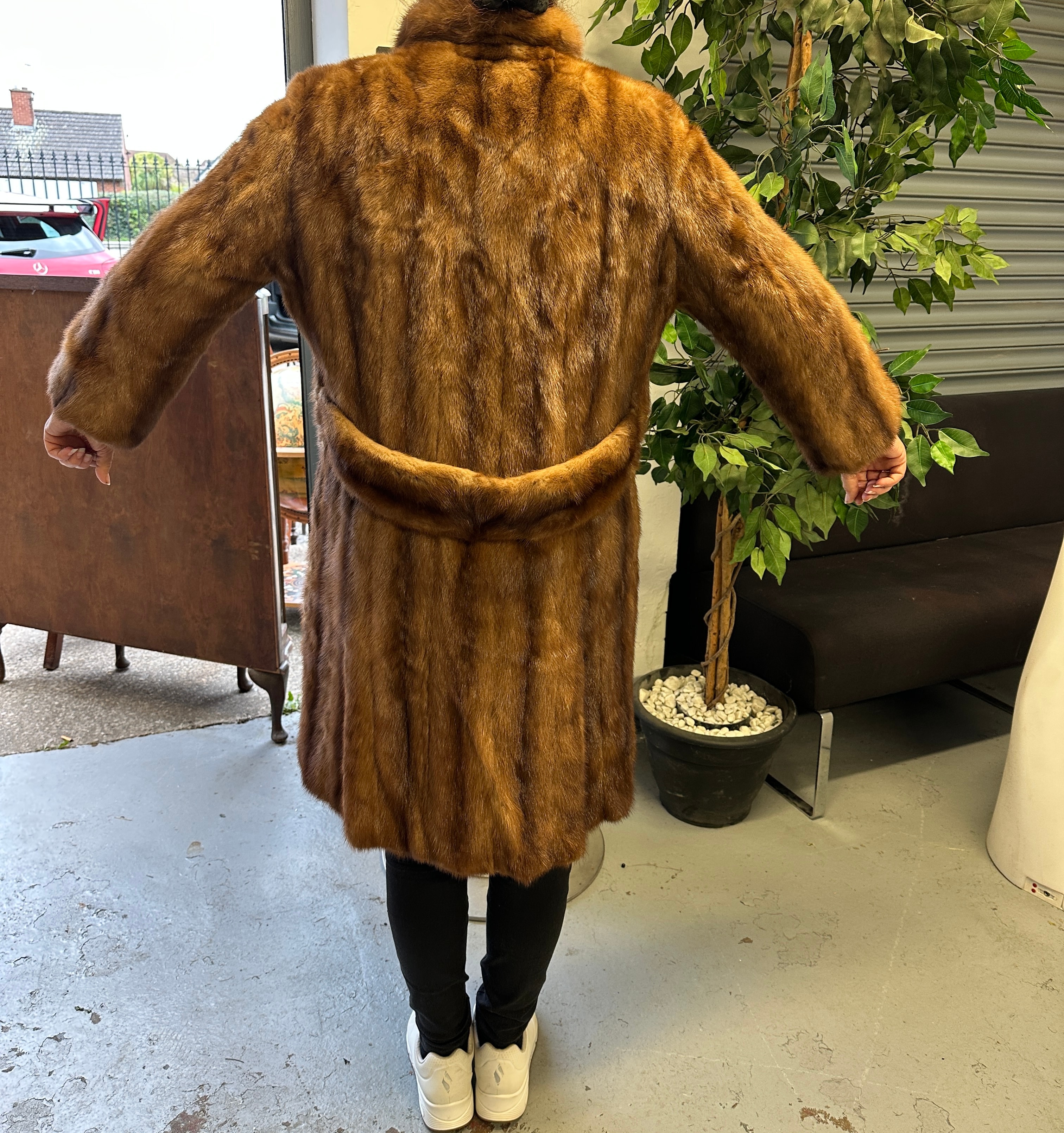 A vintage brown mink fur coat, knee-length, featuring a stand-up collar and long sleeves. The front is secured by two ornate, coiled fabric buttons. A matching fur belt is visible across the back. No visible text, labels, or maker’s marks are discernible on the item.