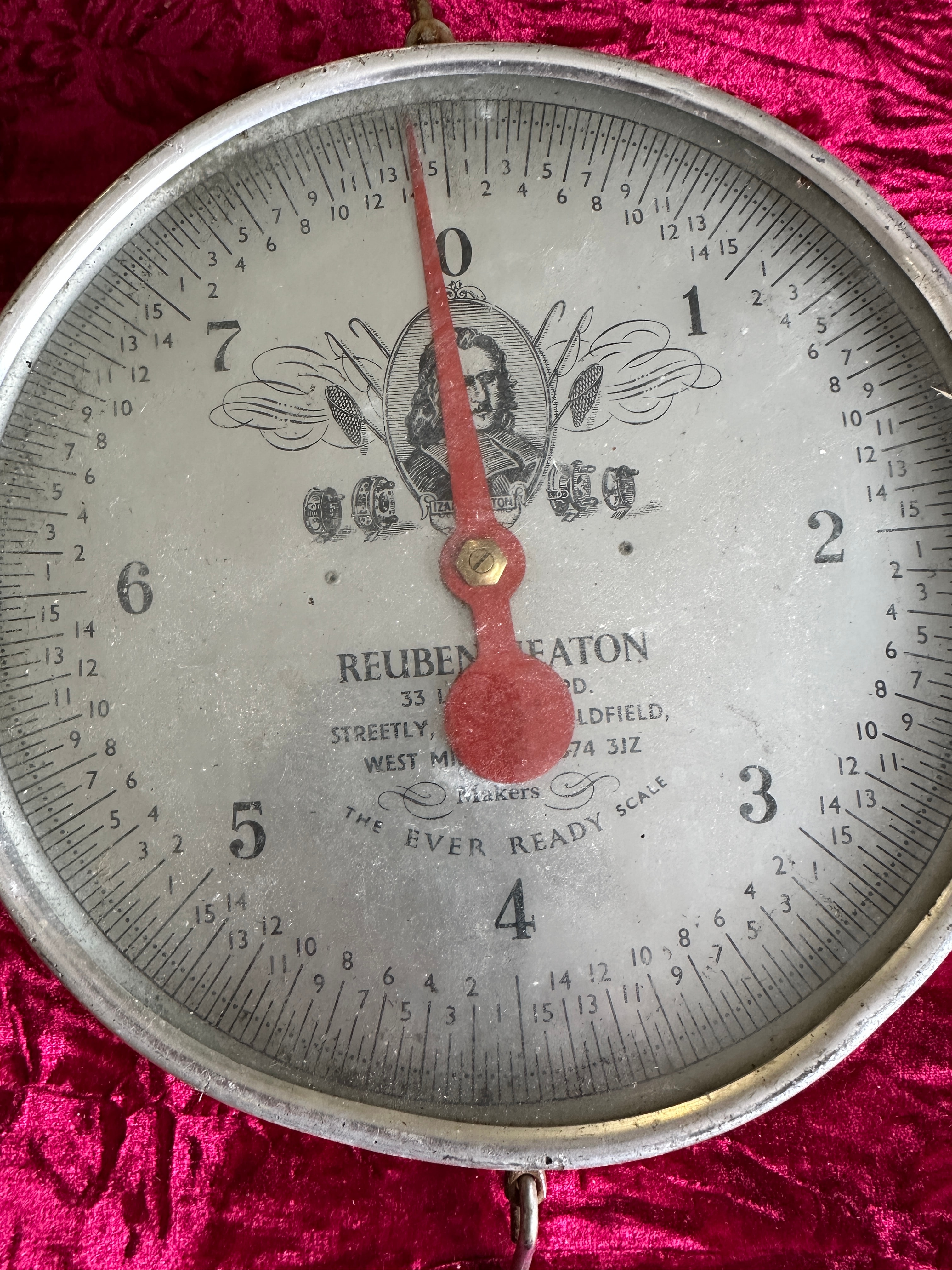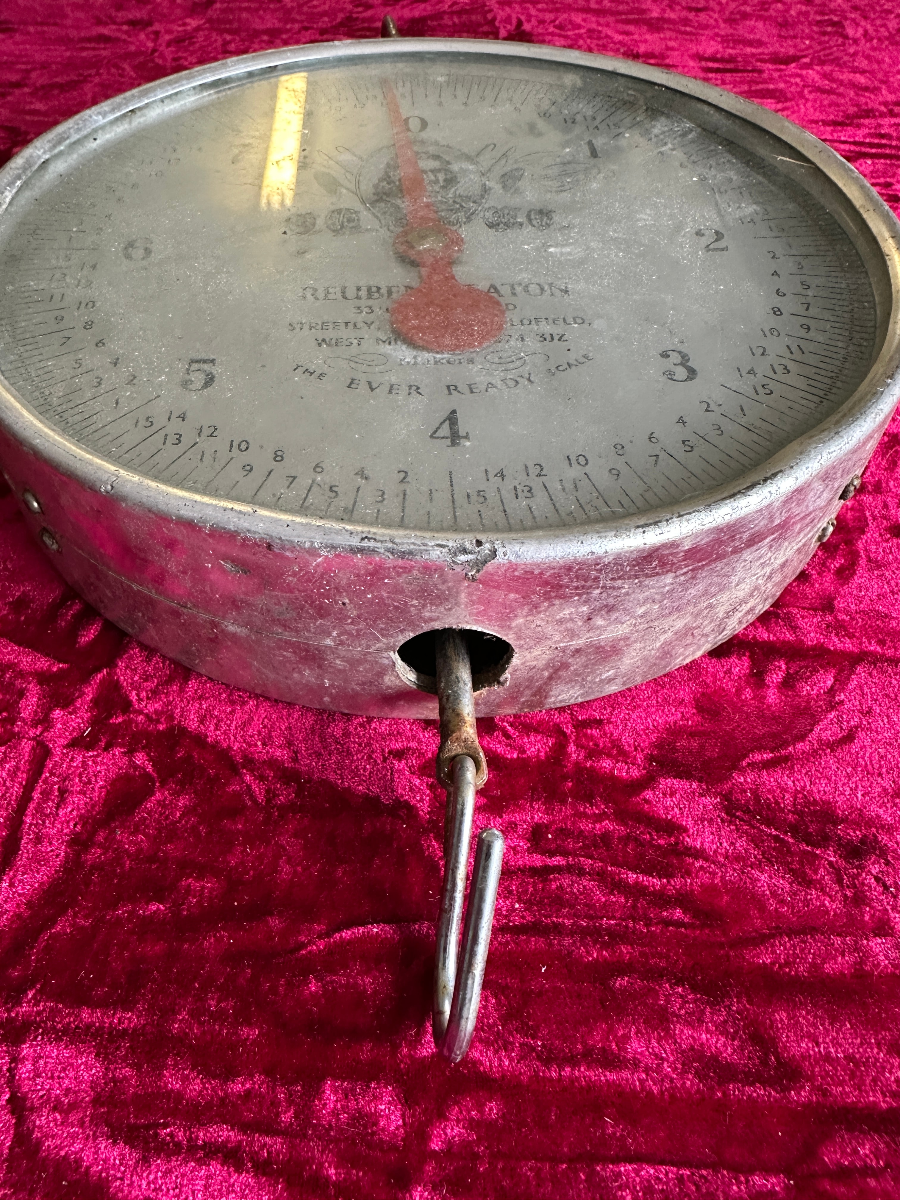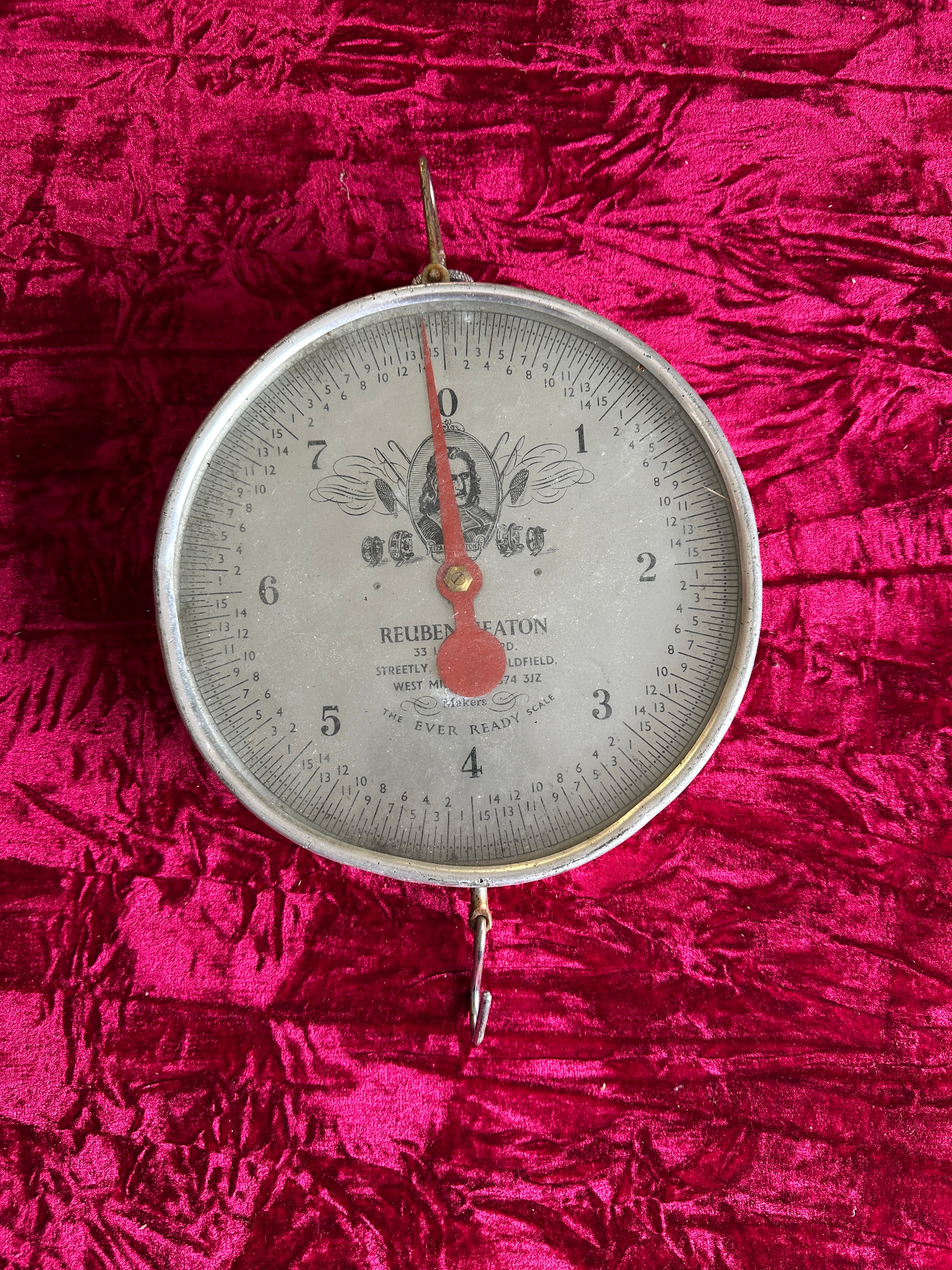 A vintage Reuben Heaton ‘The Ever Ready’ fishing scale, of apparent British manufacture. This hanging spring scale features a circular metal casing and a clear protective face. The dial is marked with numerical weight measurements from 0 to 15, with larger numbers 1-7 prominently displayed, and features a red indicator needle. The dial is inscribed with ‘REUBEN HEATON,’ ’33 LTD.,’ ‘STREETLY, SUTTON COLDFIELD, WEST MIDLANDS B74 3JZ,’ ‘Makers,’ and ‘THE EVER READY SCALE,’ centered around a portrait of a man. The scale is equipped with a hanging loop at the top and a double hook at the bottom for weighing items.