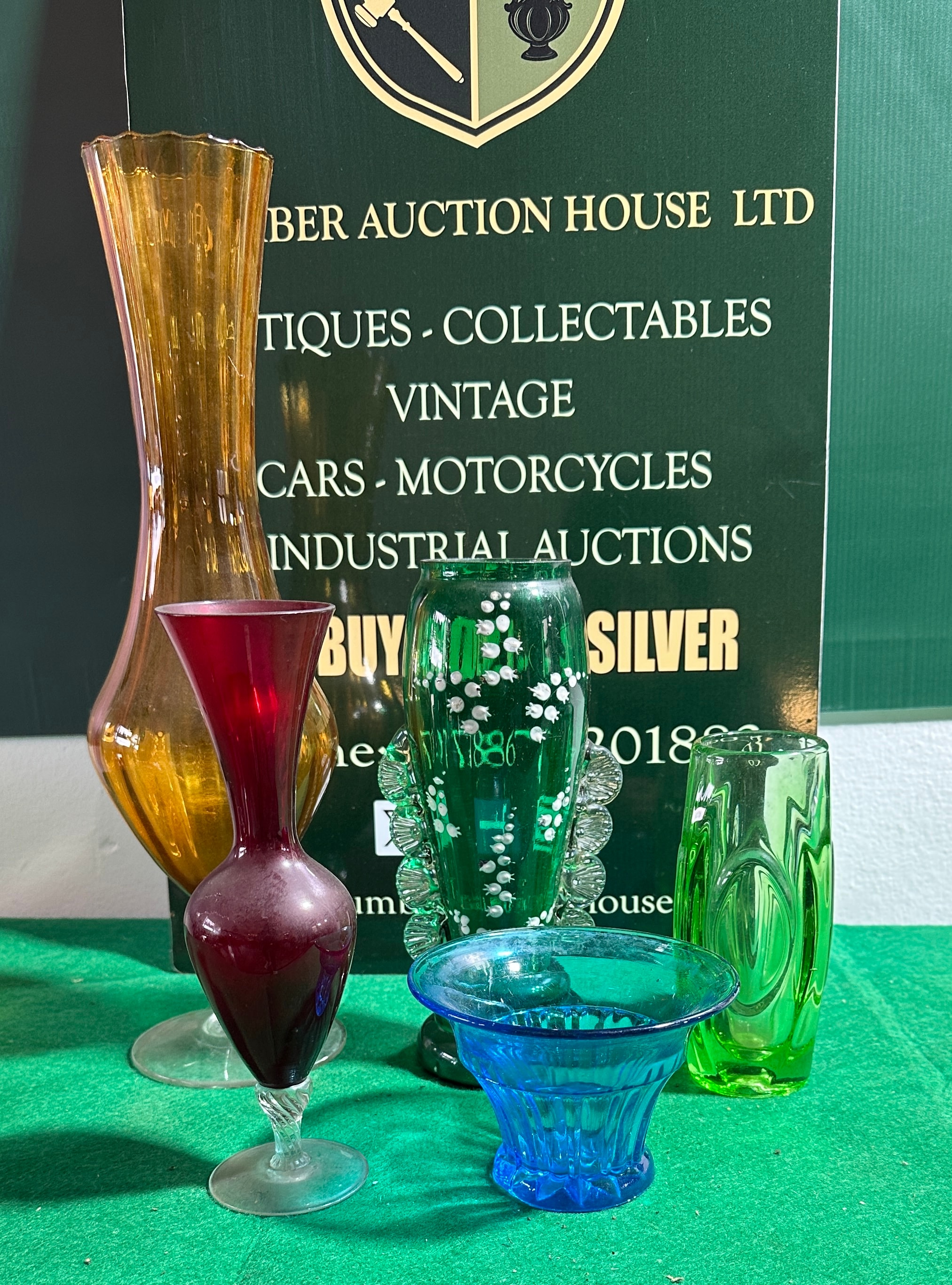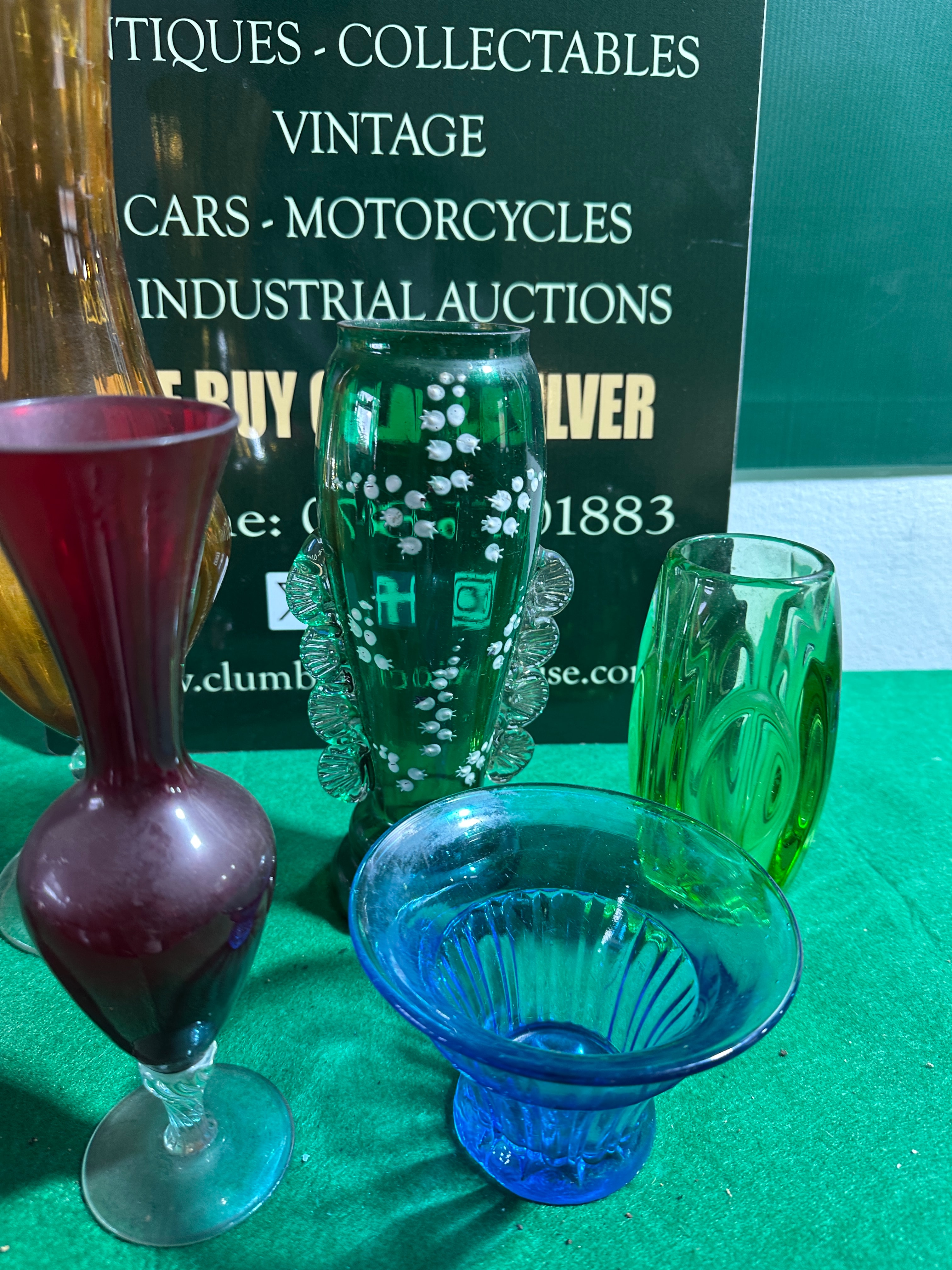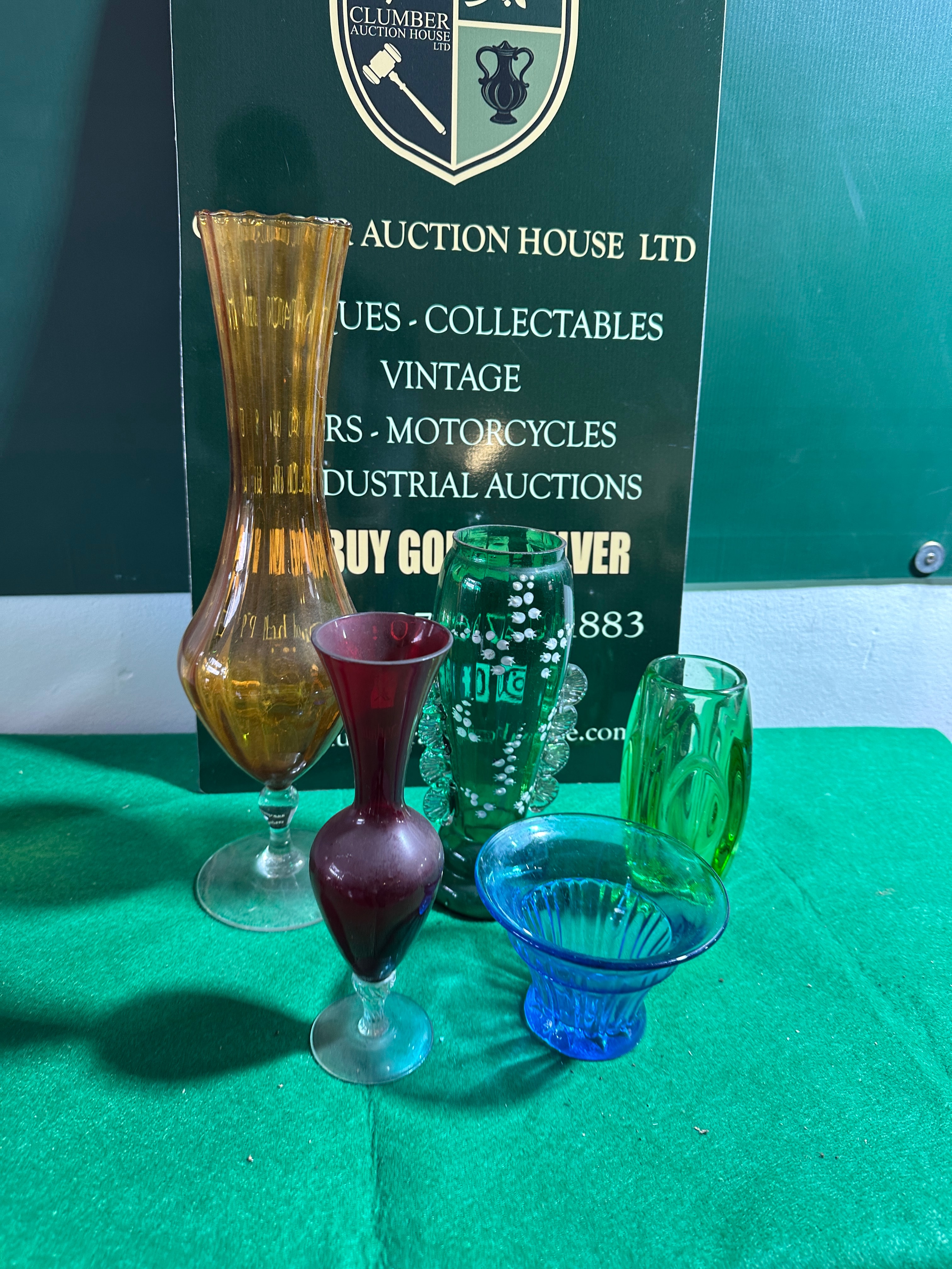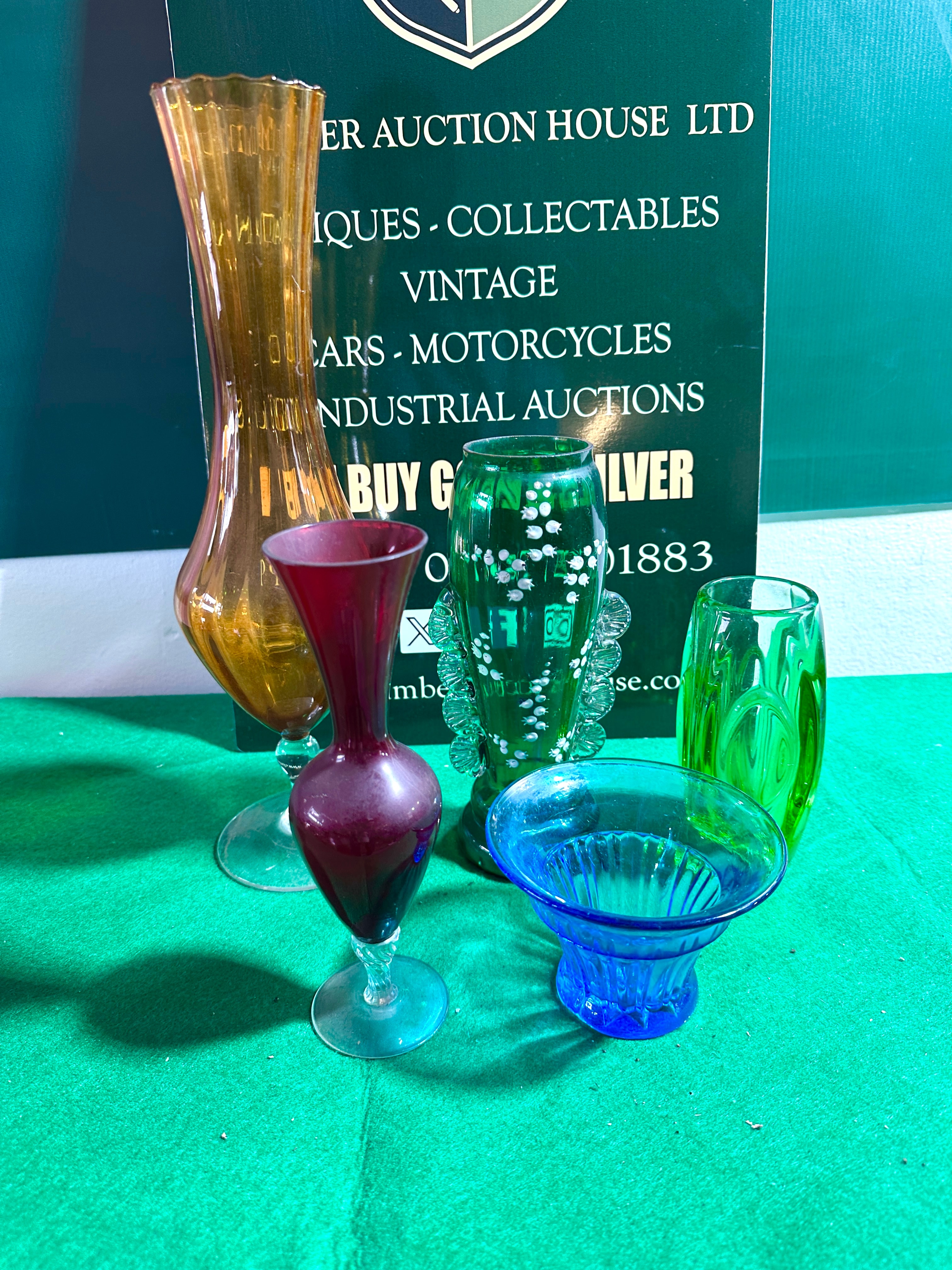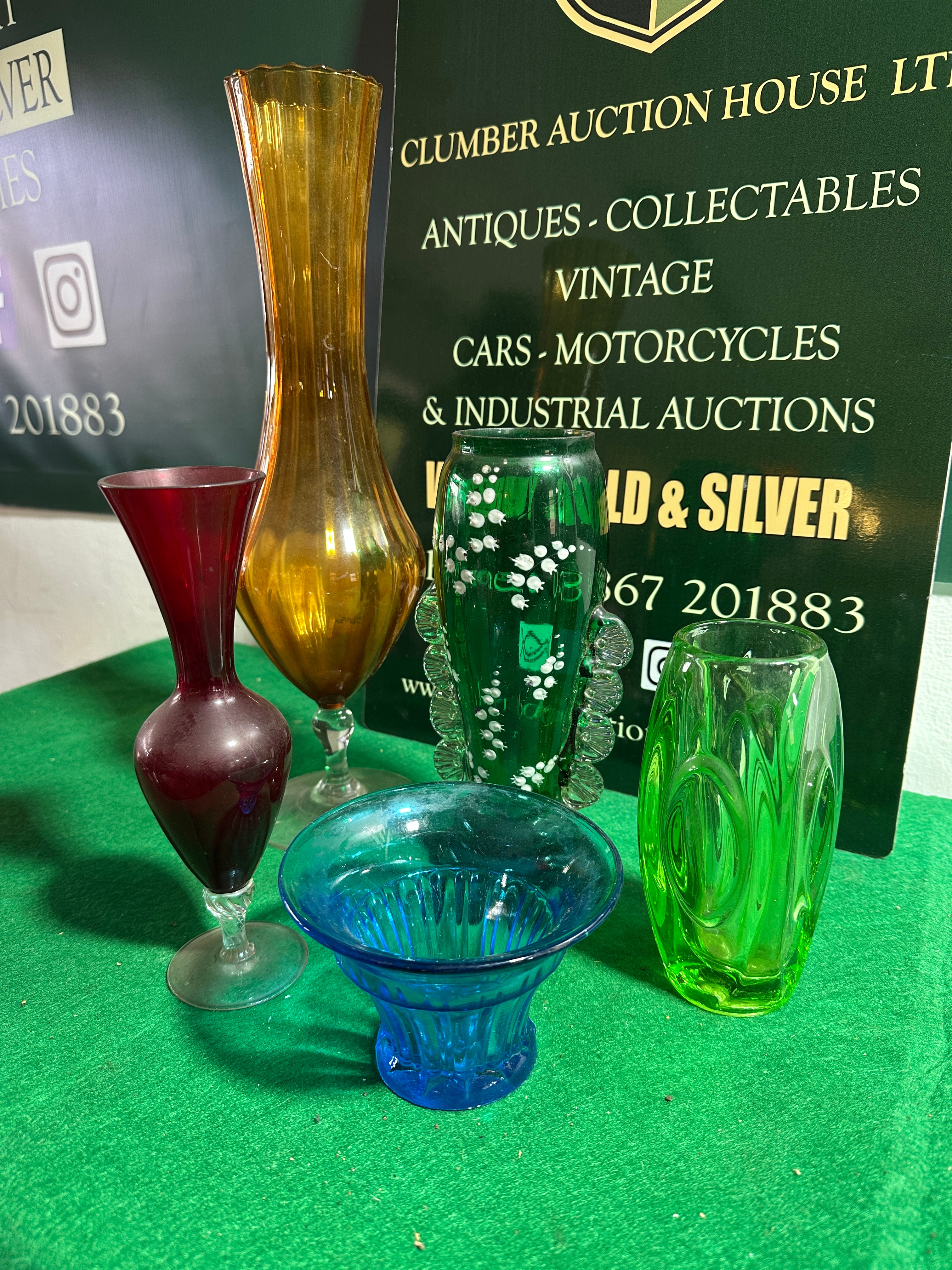 This lot comprises five assorted colored glass vessels, predominantly vases, dating from the mid-20th century and later, with some pieces potentially containing uranium glass as suggested by market interest. Included are a tall, amber-toned ribbed footed vase with a flared rim; a smaller, dark red footed vase featuring a slender neck and flared opening; a vibrant green vase with a ruffled base and white enamel dot decoration, suggesting a floral or snowflake motif; a small, cobalt blue footed bowl with a ribbed interior; and a smaller, bright green vase or tumbler exhibiting a molded, wavy texture. All items are made of blown or molded glass.