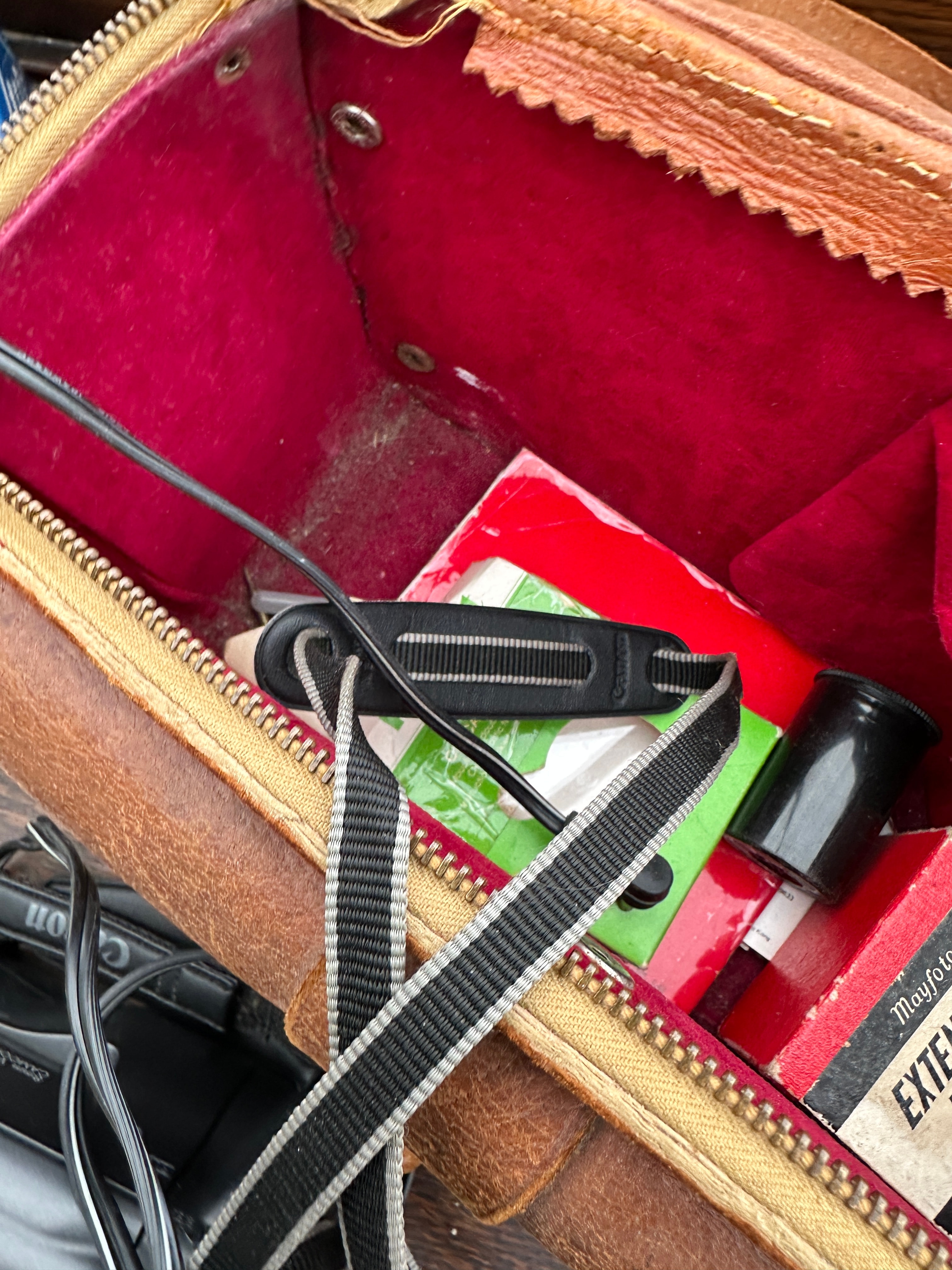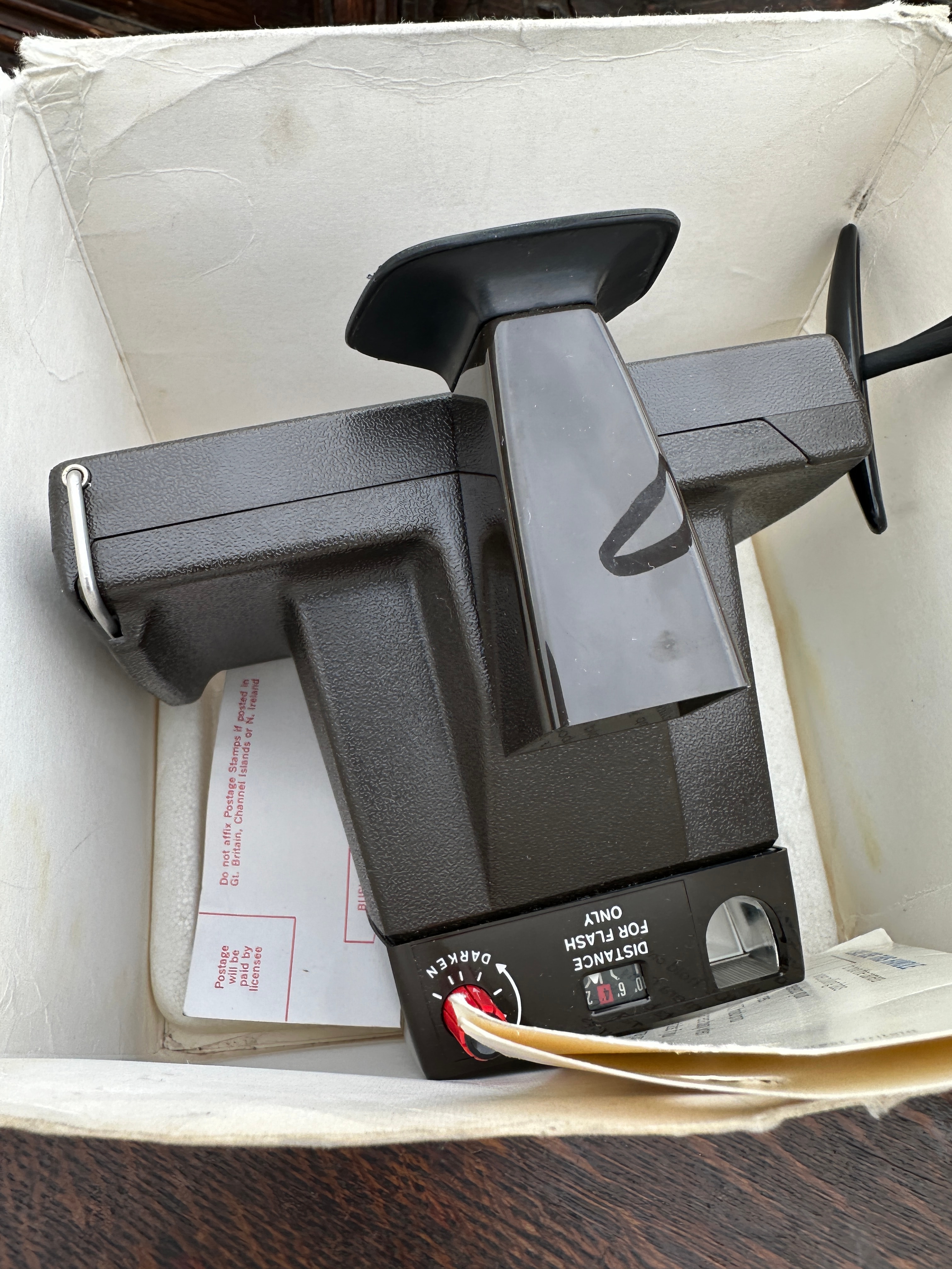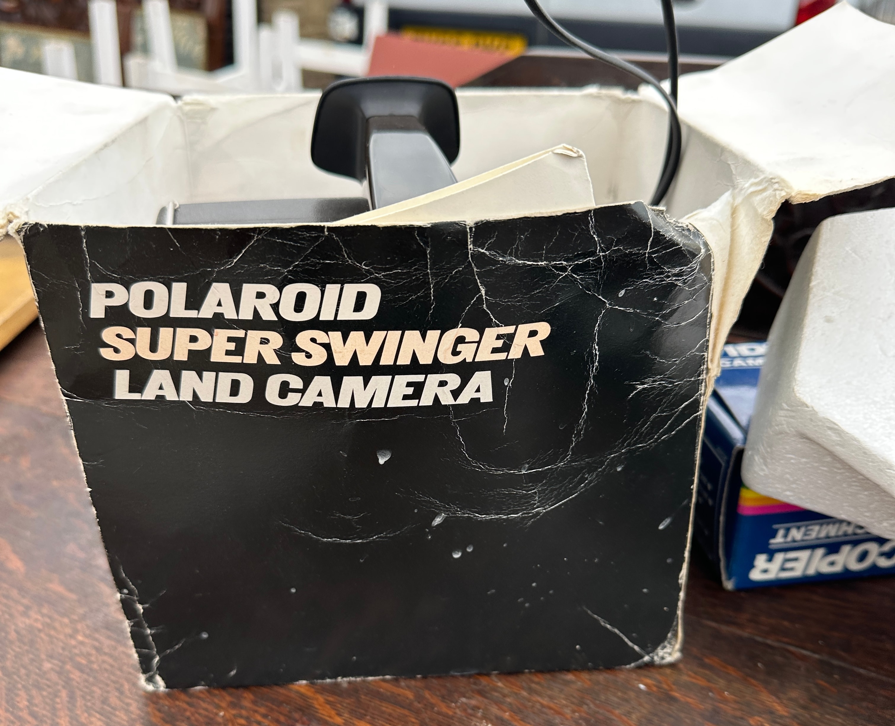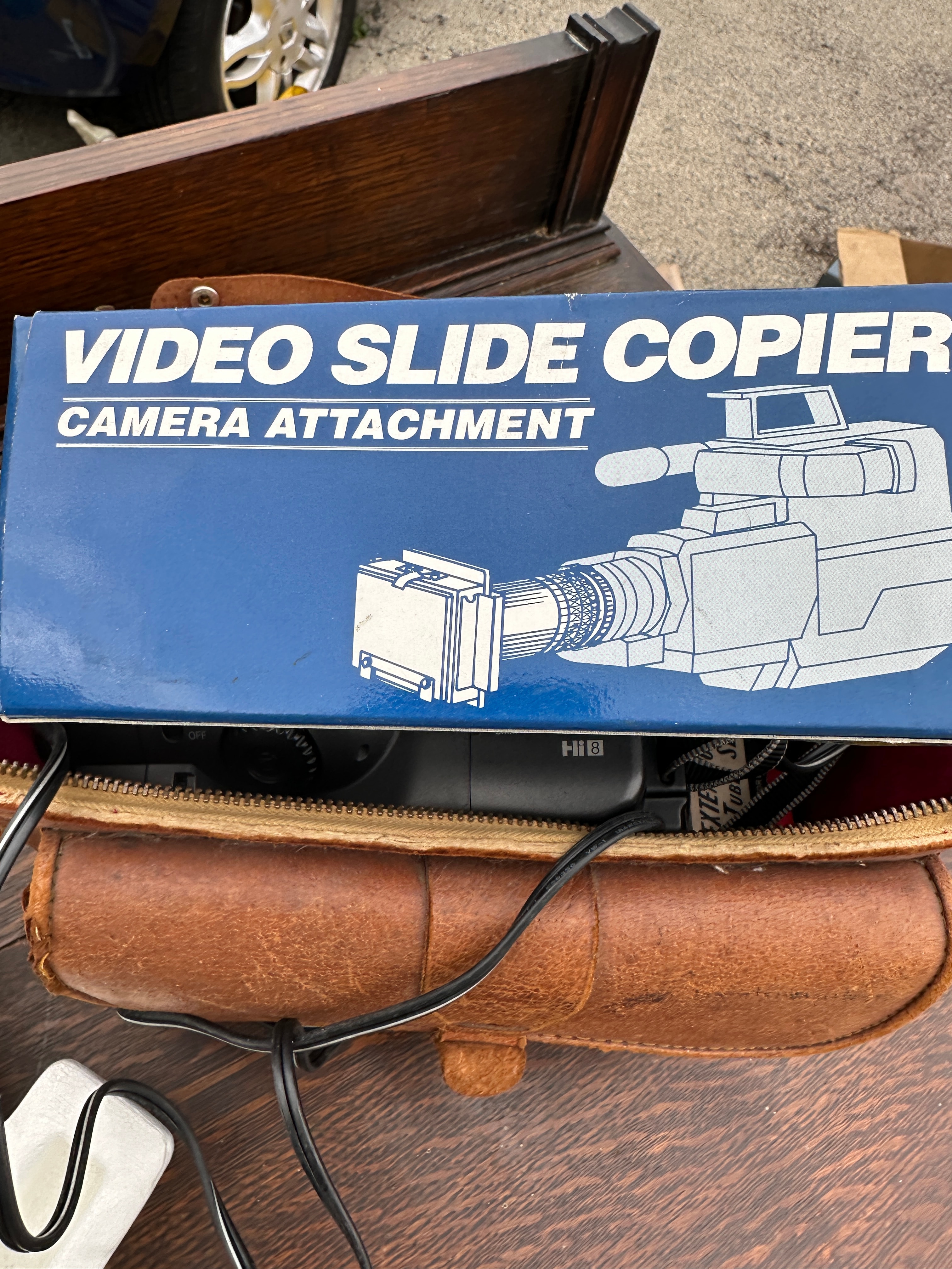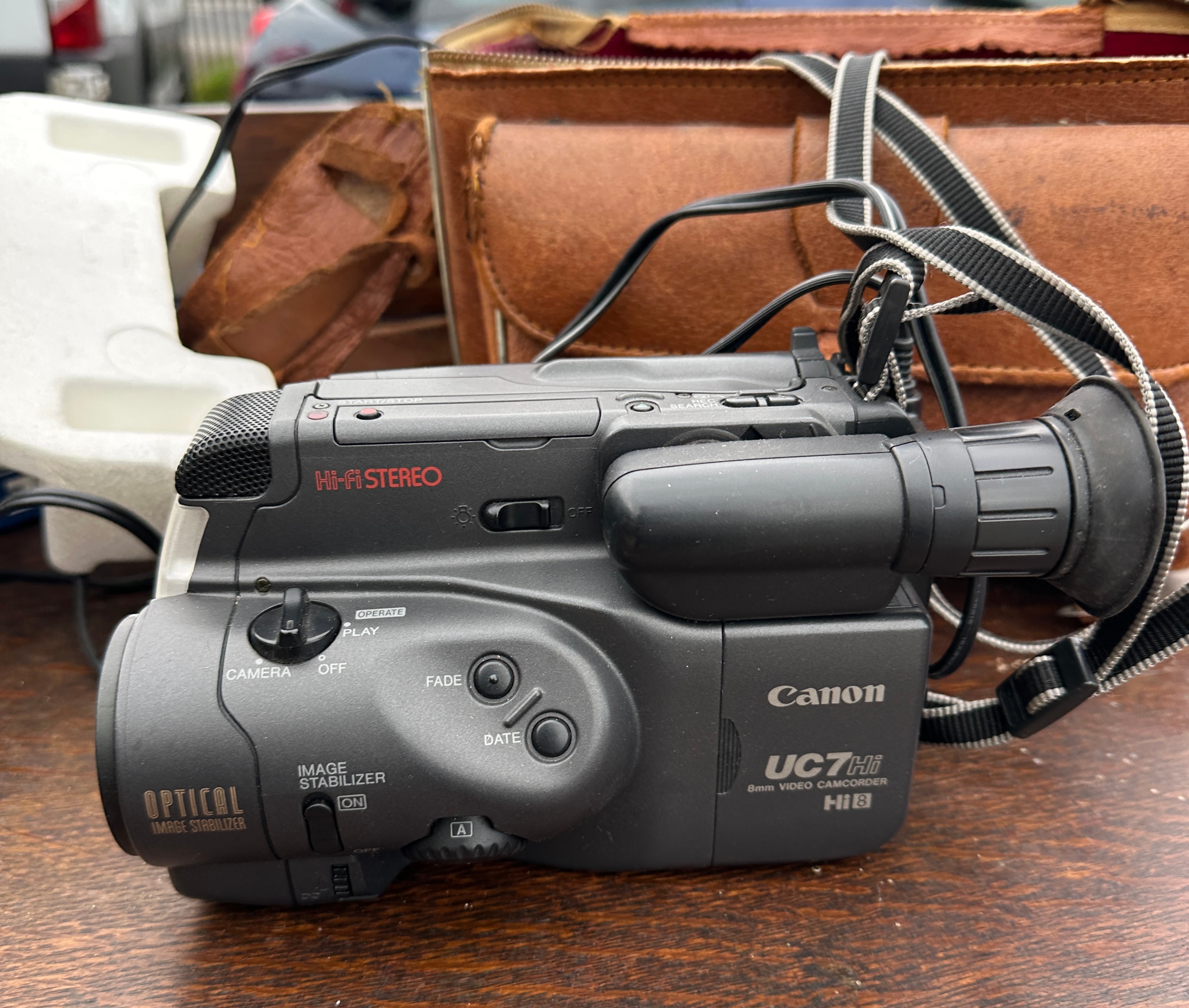 A collection of vintage photographic and video equipment. The primary items include a black plastic Canon UC7Hi Hi8 8mm Video Camcorder, marked “HI-FI STEREO” and “OPTICAL IMAGE STABILIZER,” appearing complete with an attached strap. Also featured is a brown plastic Polaroid Super Swinger Land Camera, complete with its original cardboard box and displaying “DISTANCE FOR FLASH ONLY” and exposure adjustment settings. Accompanying these is a brown leather zippered case with a red felt interior containing various cables and accessories, including Canon-branded items and a Mayfotos box. A worn cardboard box for a “VIDEO SLIDE COPIER CAMERA ATTACHMENT” is also included.