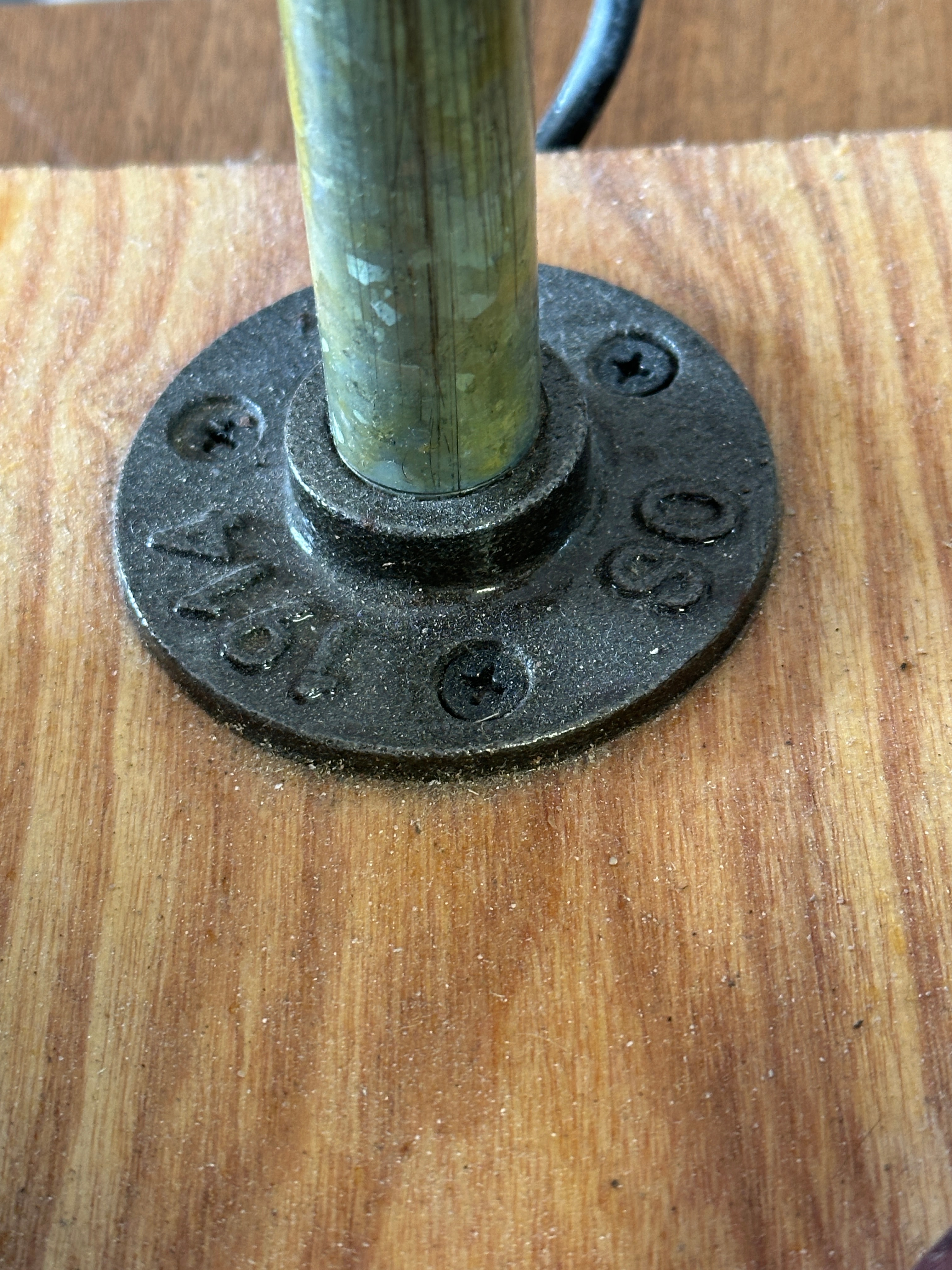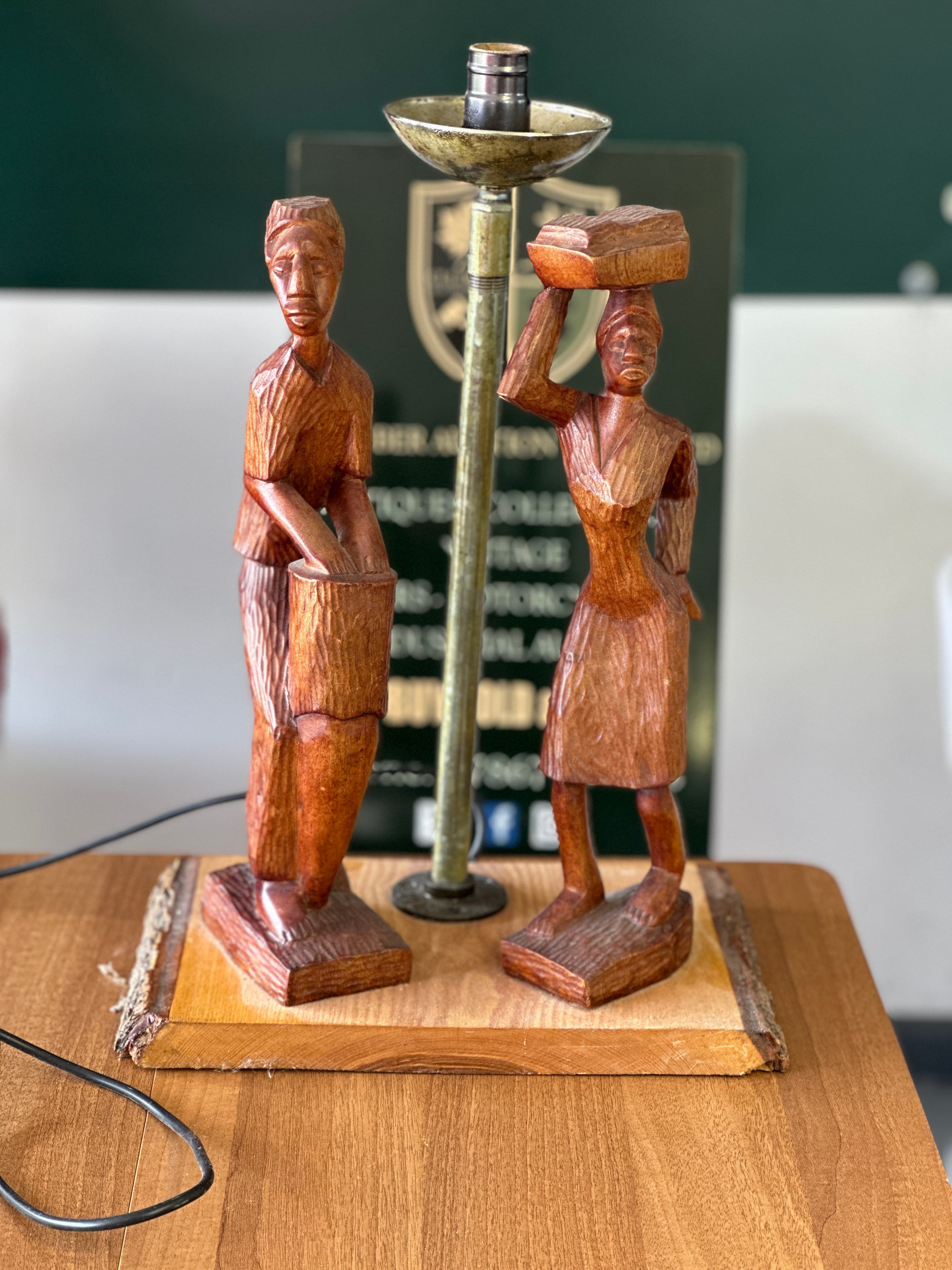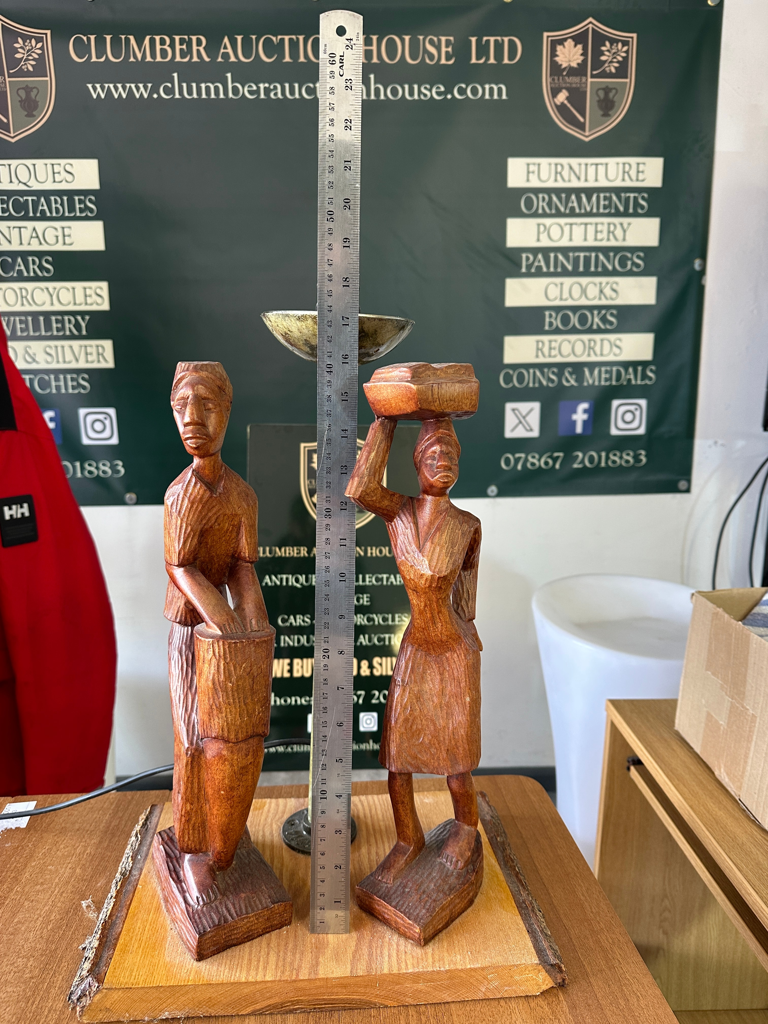 A decorative table lamp featuring two hand-carved wooden figural sculptures in a simplified, folk art style, reminiscent of traditional African carvings. One figure depicts an individual playing a drum, while the other carries an object on their head. Crafted from a reddish-brown hardwood, these figures are mounted on a multi-tiered wooden base, the lower tier retaining its natural bark edge. A central galvanized metal pipe, secured by a dark metal flange visibly marked “GALV” and “80,” rises between the figures, culminating in a brass-toned lamp receptacle.