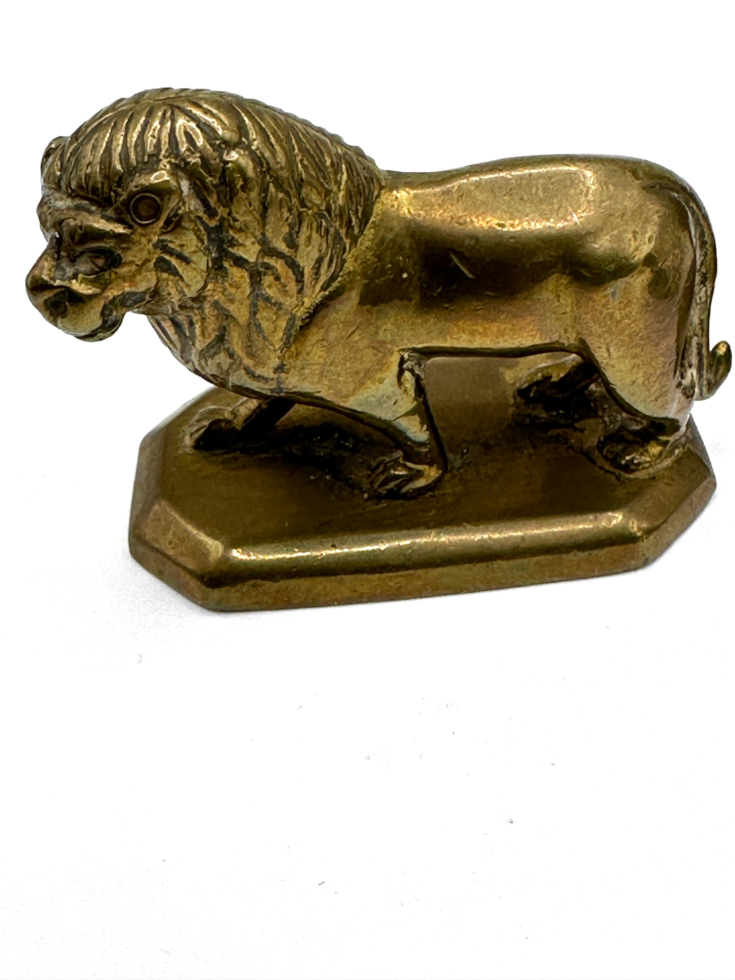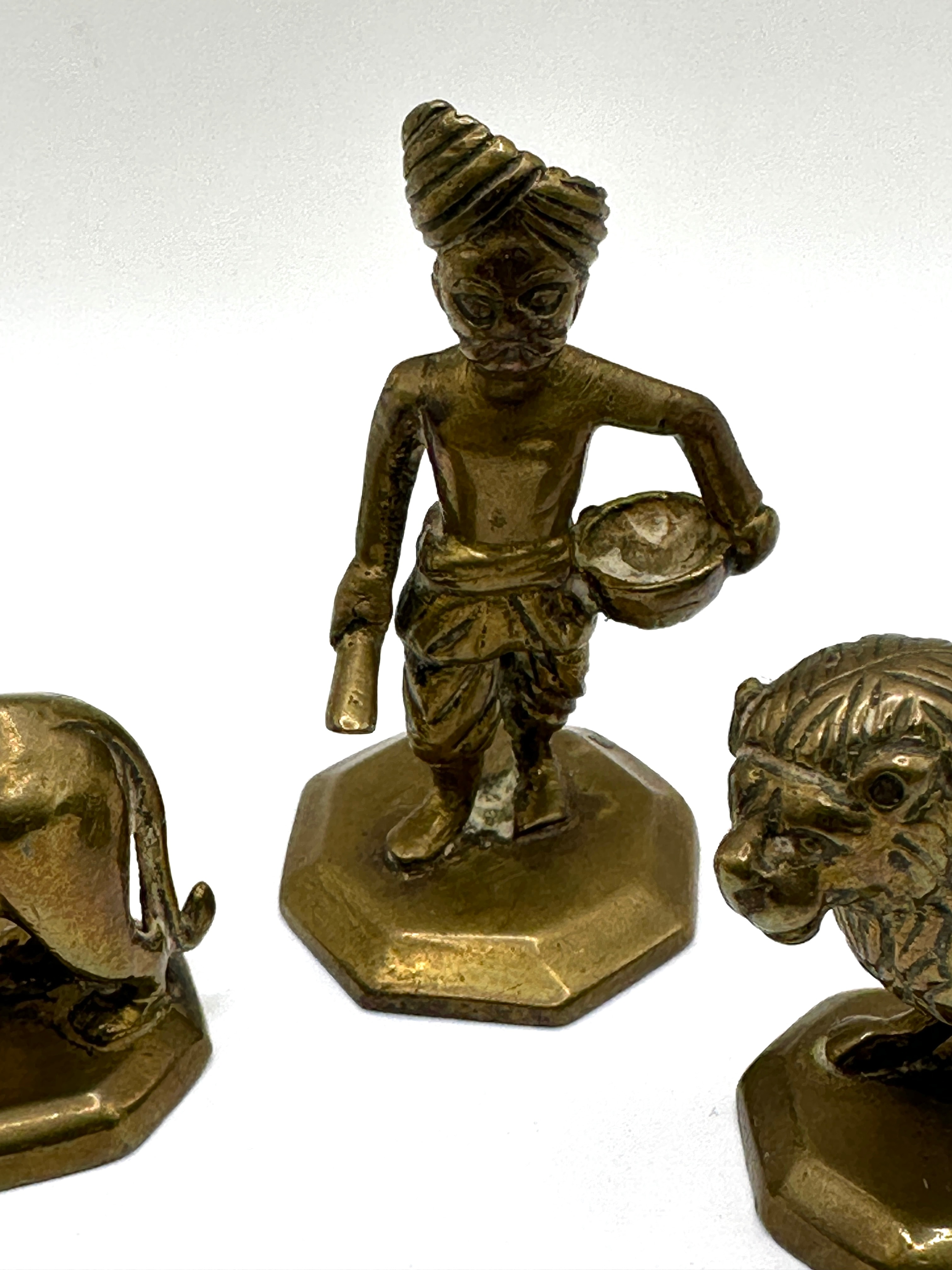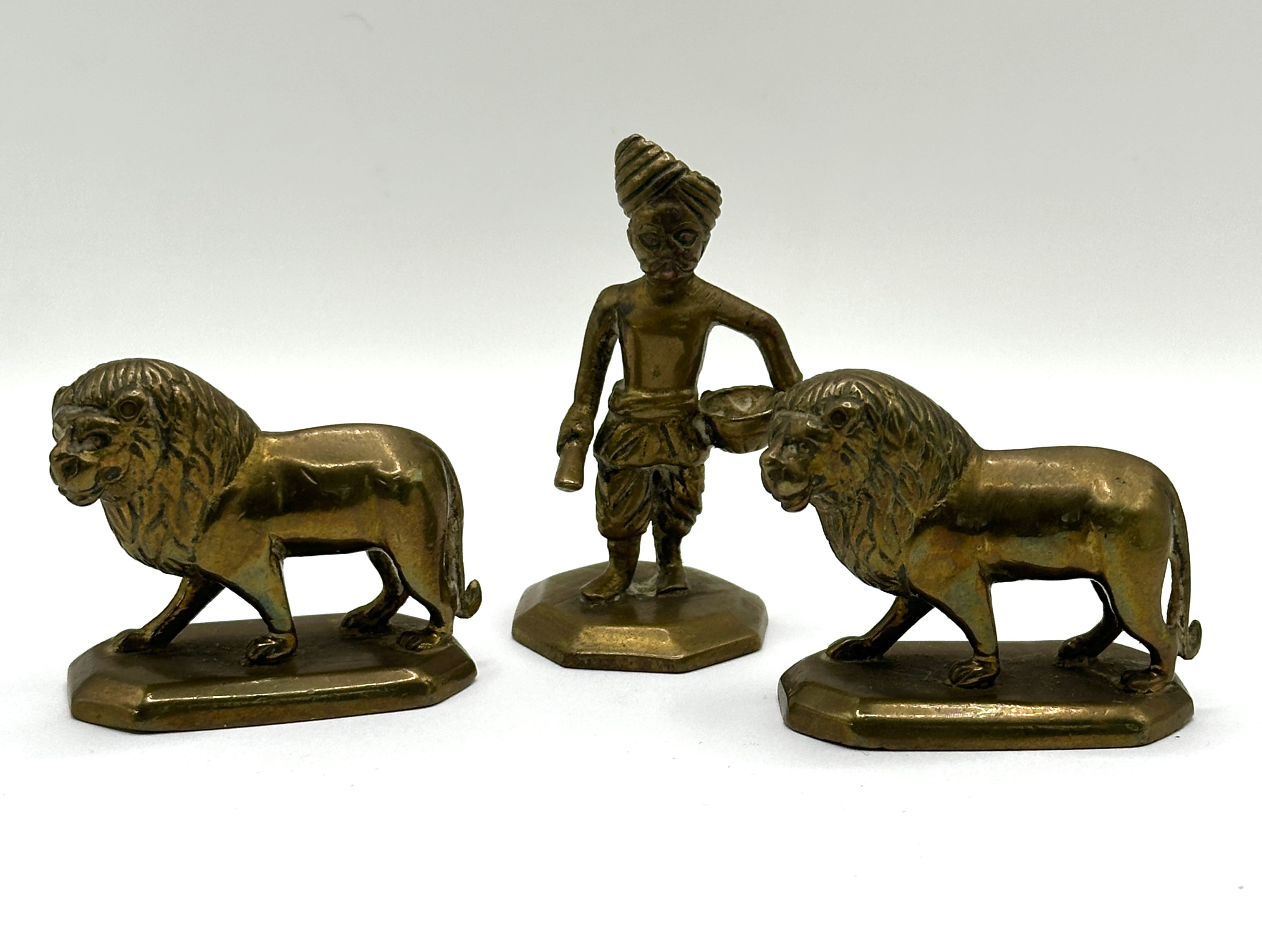 This set of three Indian brass figures, dating to approximately 1900, comprises a central standing human figure and two flanking lion figures. The central figure is depicted wearing a turban and traditional garments, holding an elongated object in one hand and a bowl-like item in the other, all posed on an octagonal base. The two identical stylized lion figures each stand on a rectangular base with chamfered corners and feature prominent manes. All pieces are cast metal, consistent with brass or bronze construction, and exhibit a warm, golden-brown metallic hue. Varied patination is present, with darker tones in recessed areas and lighter wear on raised surfaces, indicative of age and handling. No discernible text, maker’s marks, or inscriptions are visible.