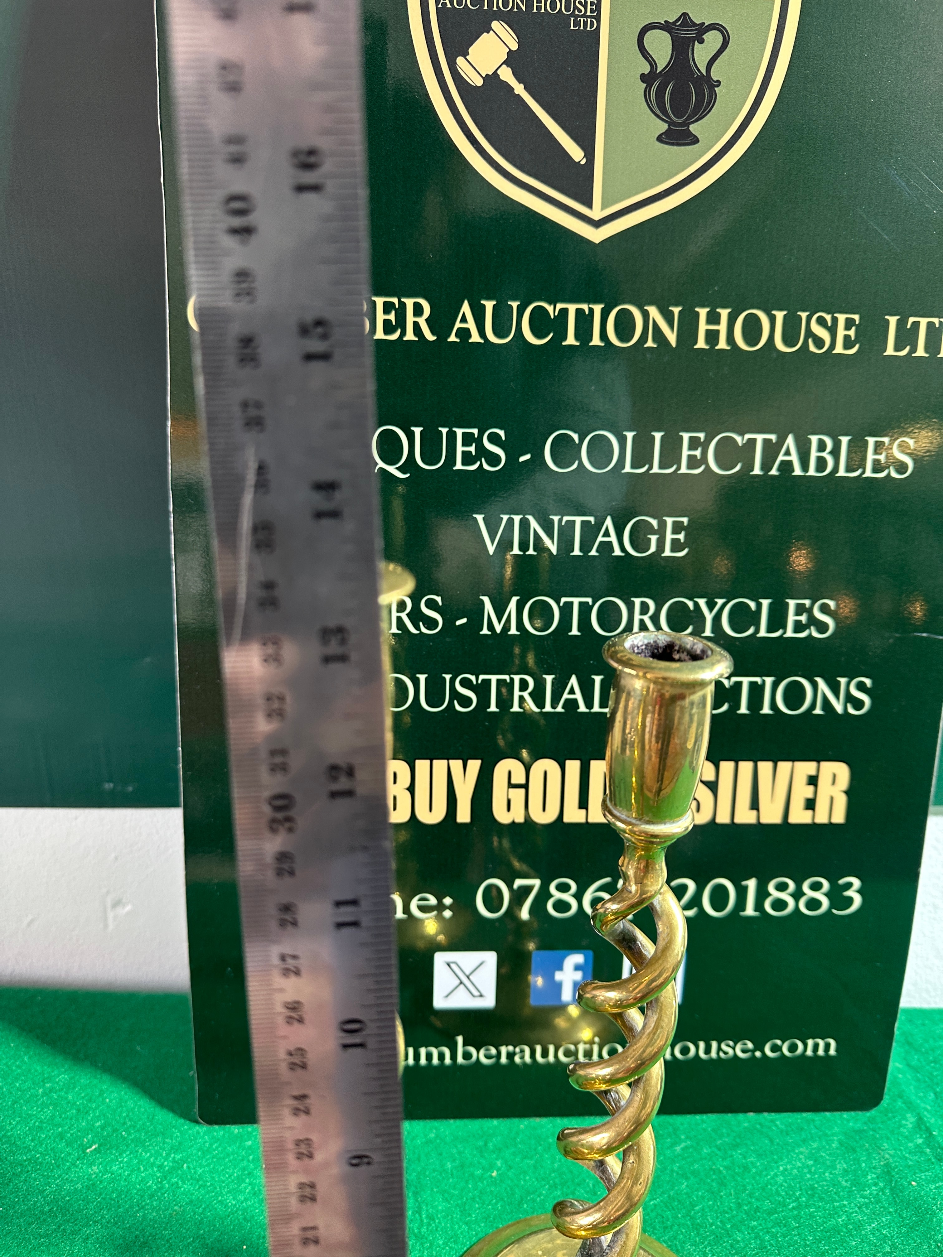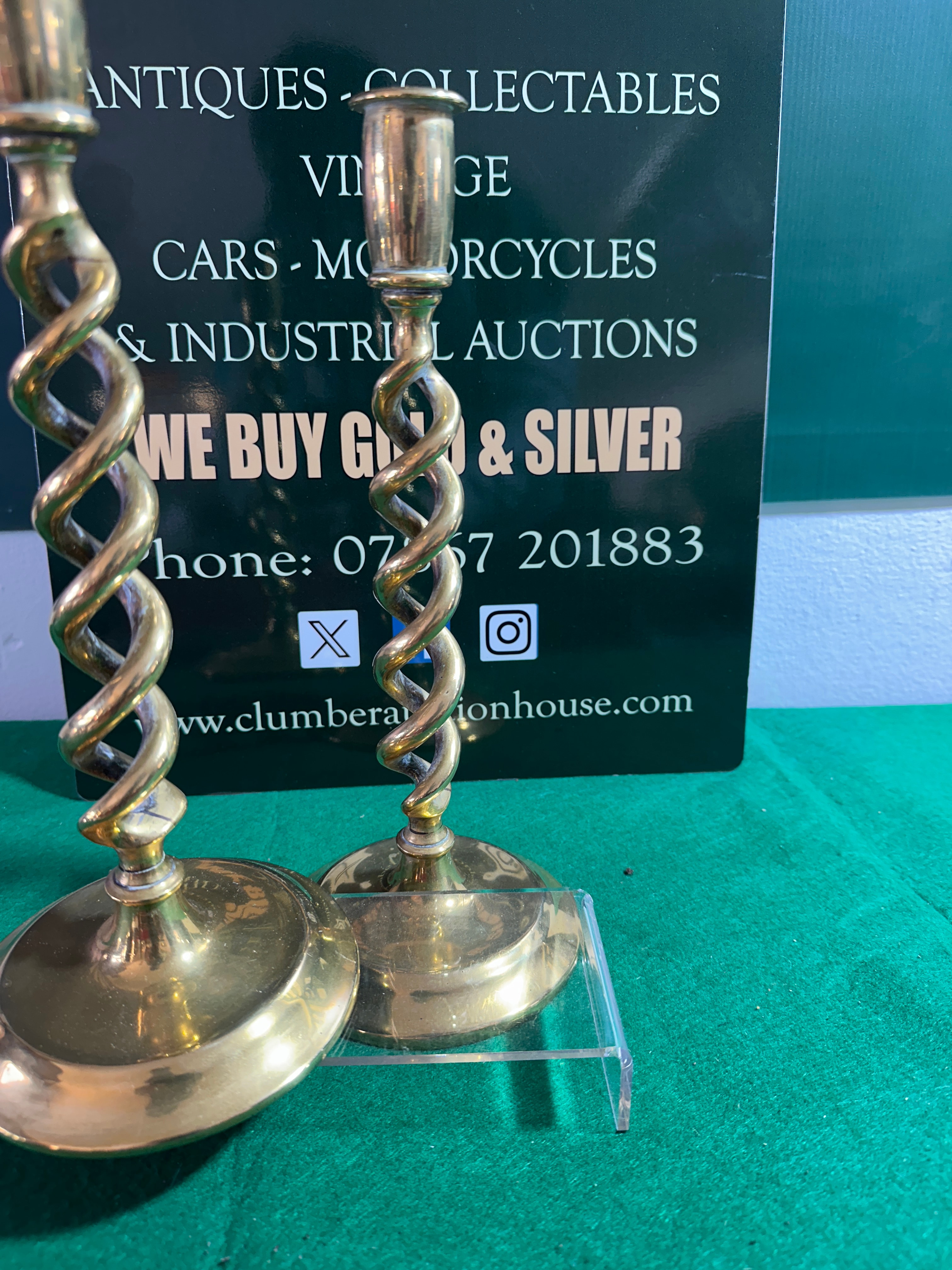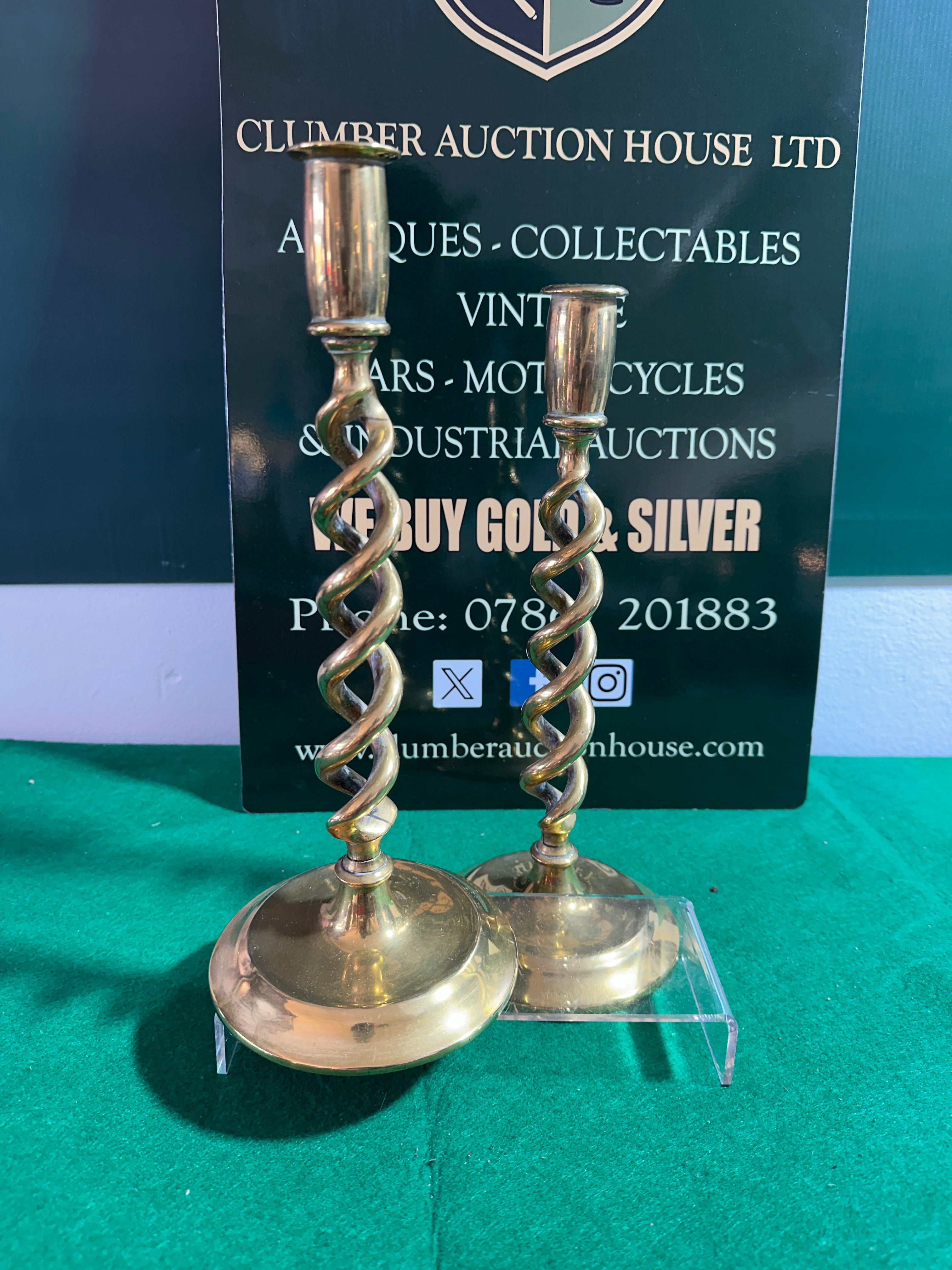 A pair of brass candlesticks , each featuring a barley twist stem rising from a wide, circular domed base to a plain, flared cup. No specific maker’s marks or engravings are visible.