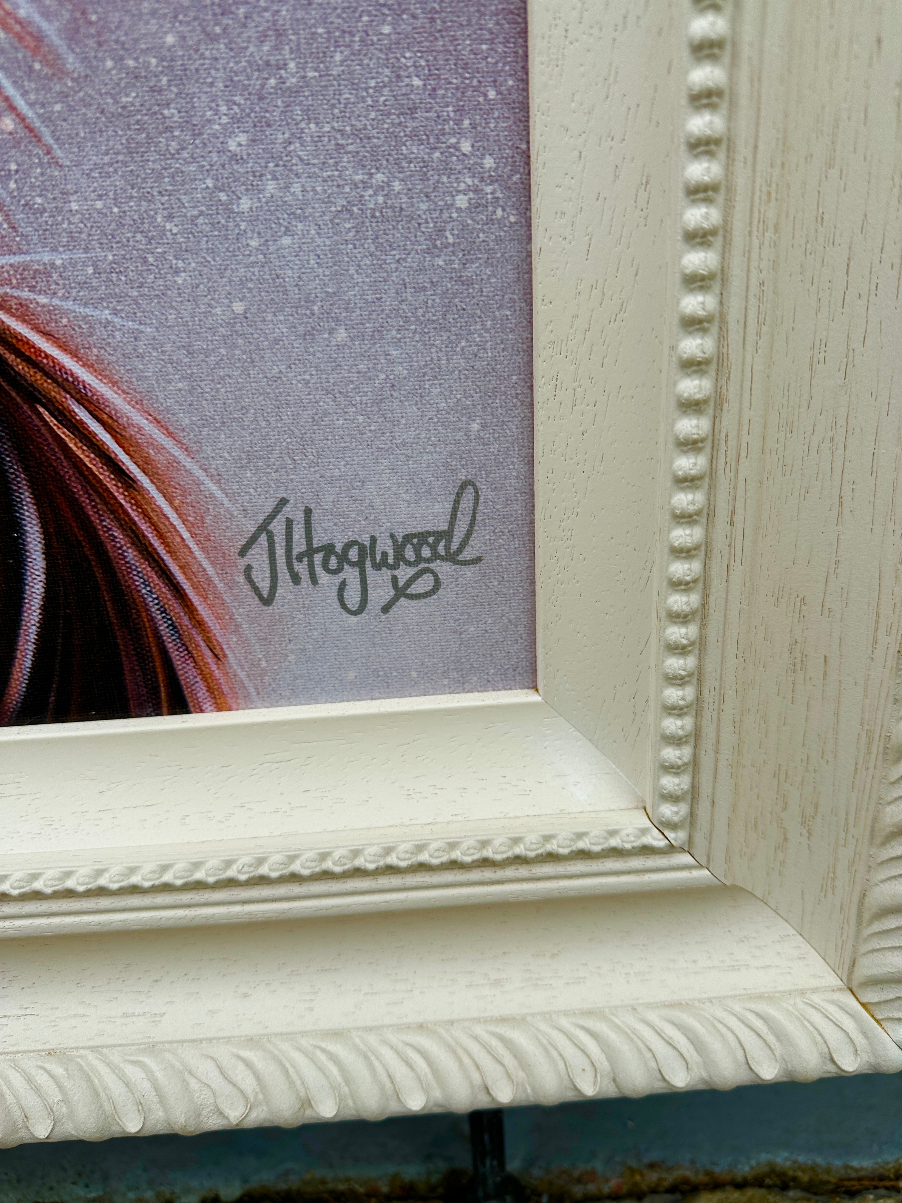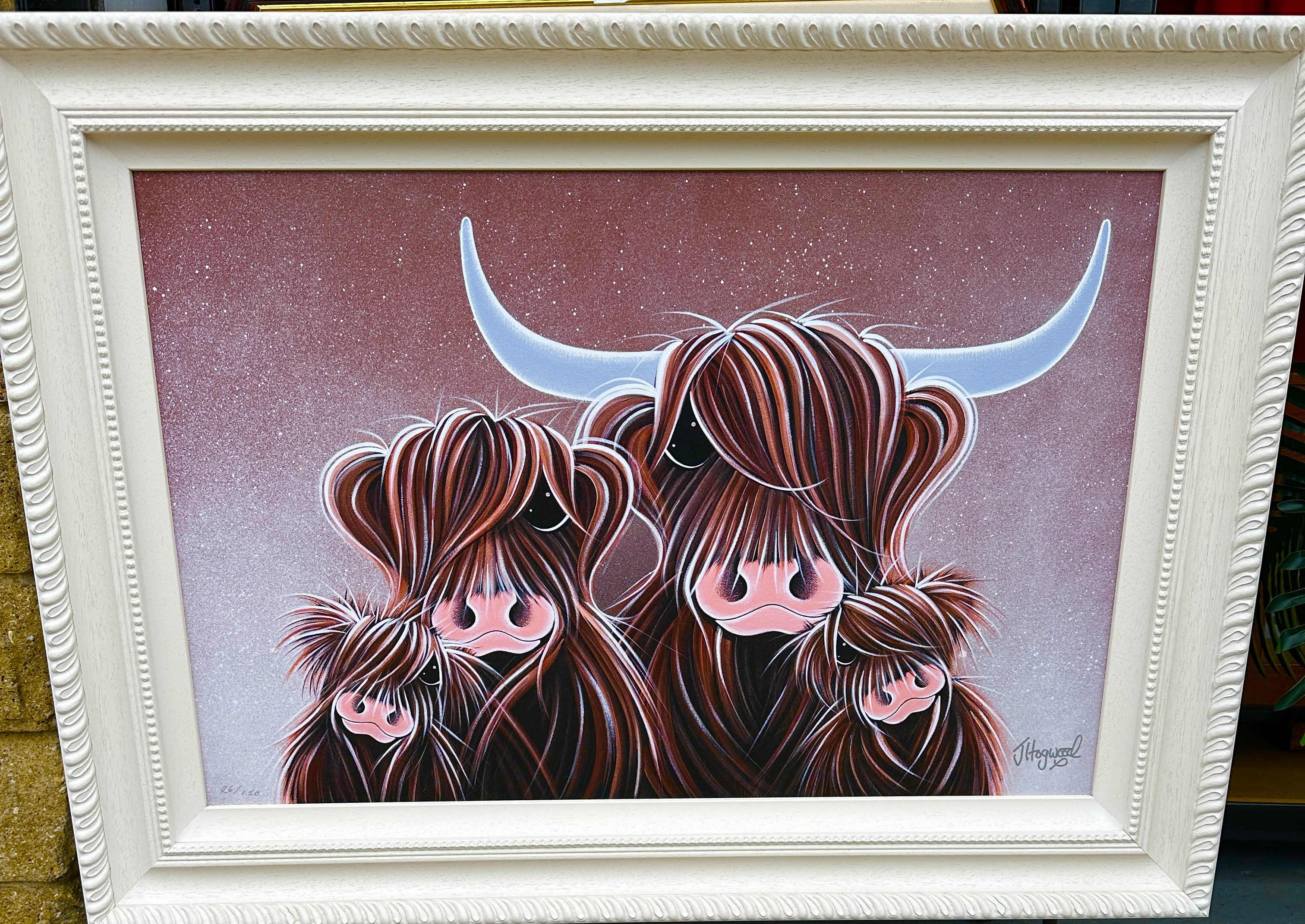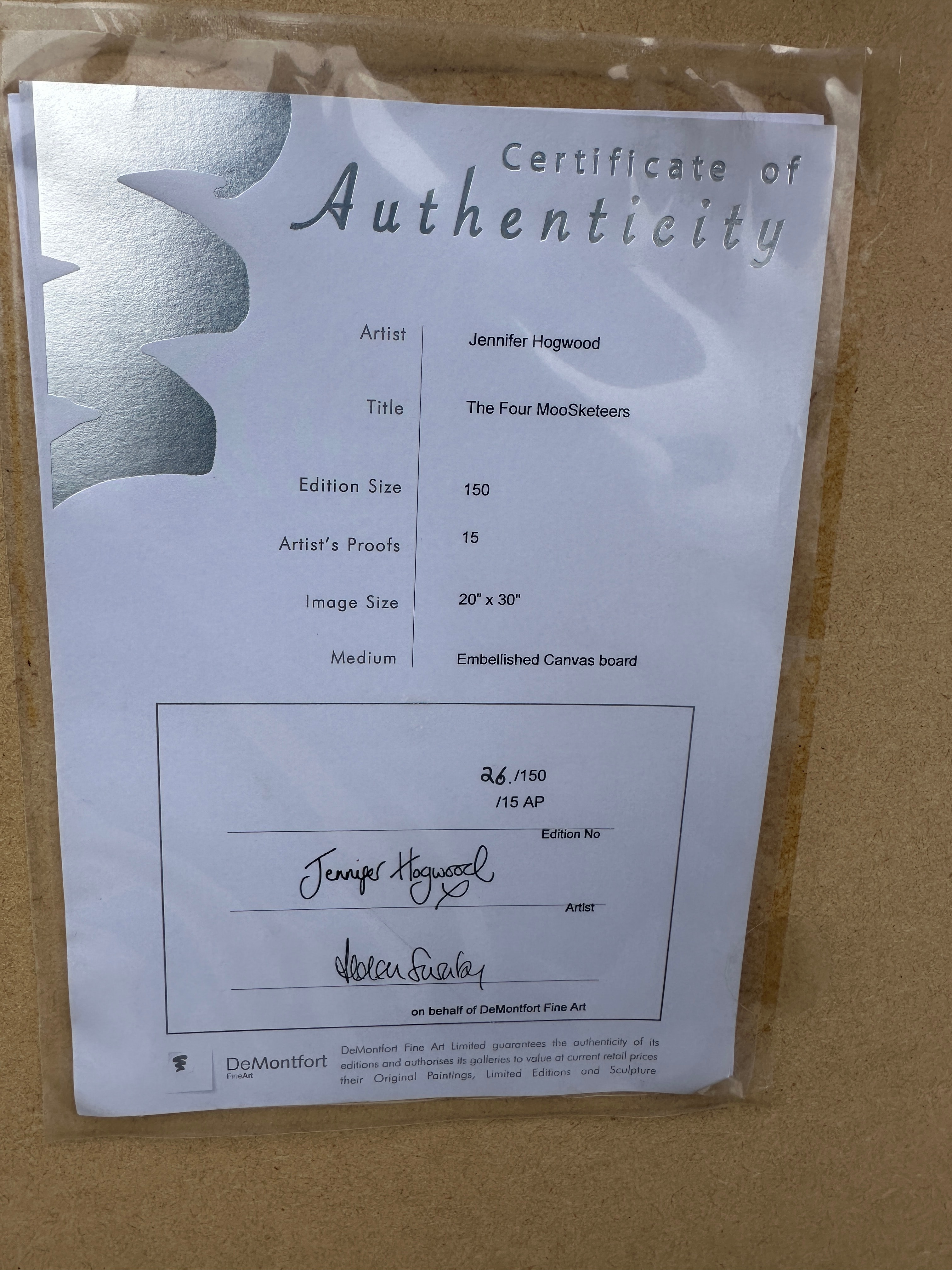 A contemporary embellished canvas board by Jennifer Hogwood, titled ‘The Four MooSketeers’. The artwork depicts four illustrative Highland cows with long, shaggy hair obscuring their eyes and prominent pink snouts, one adult featuring light blue horns, set against a speckled reddish-brown background fading to white. The piece is signed ‘J. Hogwood’ on the lower right and numbered ’26/150′ on the lower left, indicating it is a limited edition print. It is presented in a white, possibly painted wood, frame with a fluted/beaded inner border and a slightly distressed finish. Attached to the reverse is a Certificate of Authenticity confirming the artist, title, medium as “Embellished Canvas board,” an edition size of 150 (plus 15 artist’s proofs), and its publication by DeMontfort Fine Art.