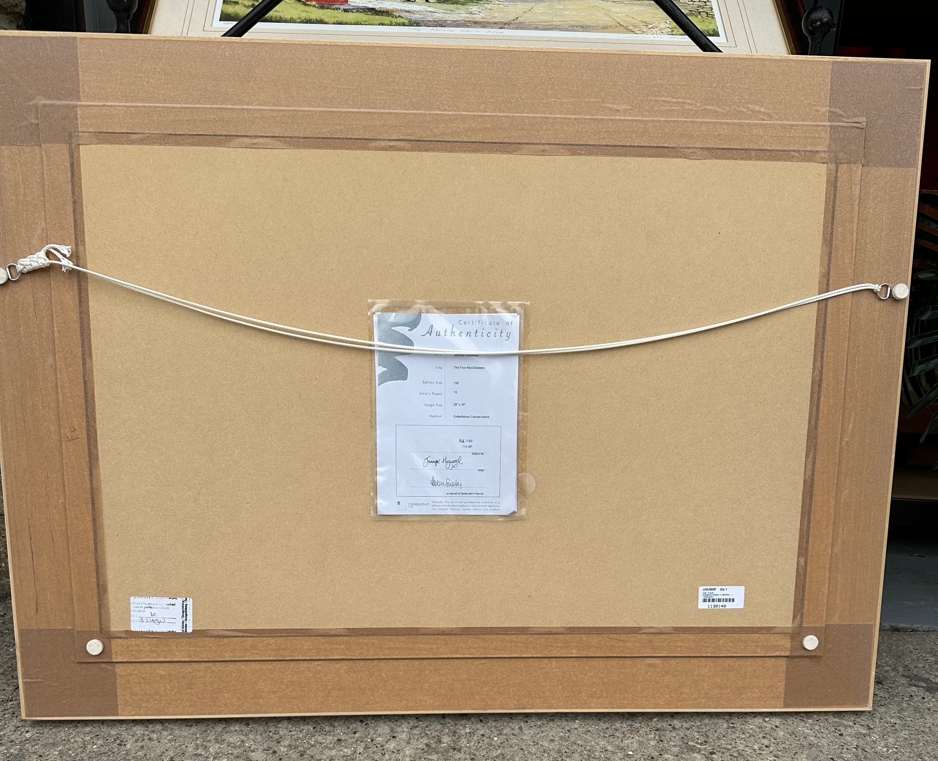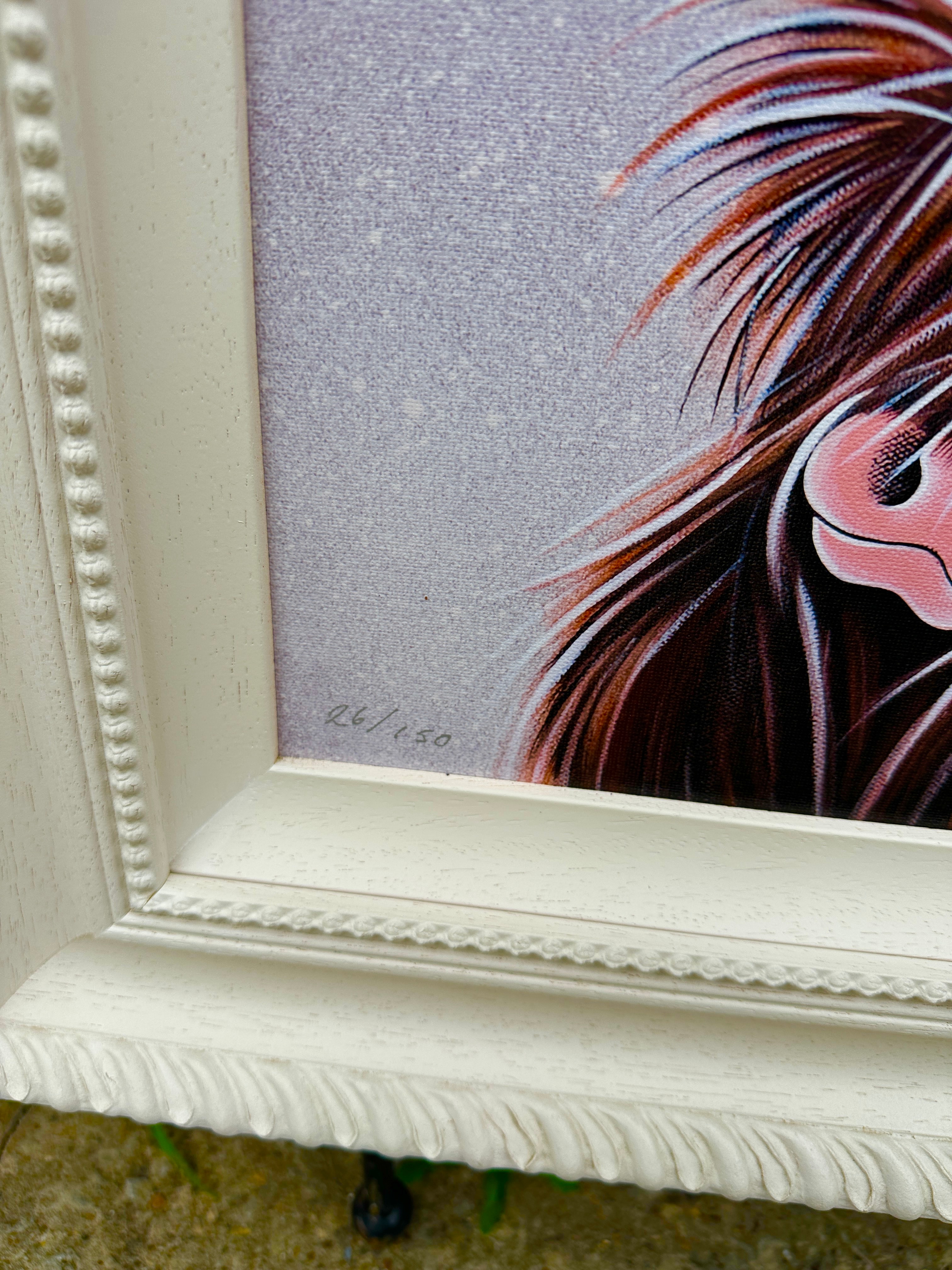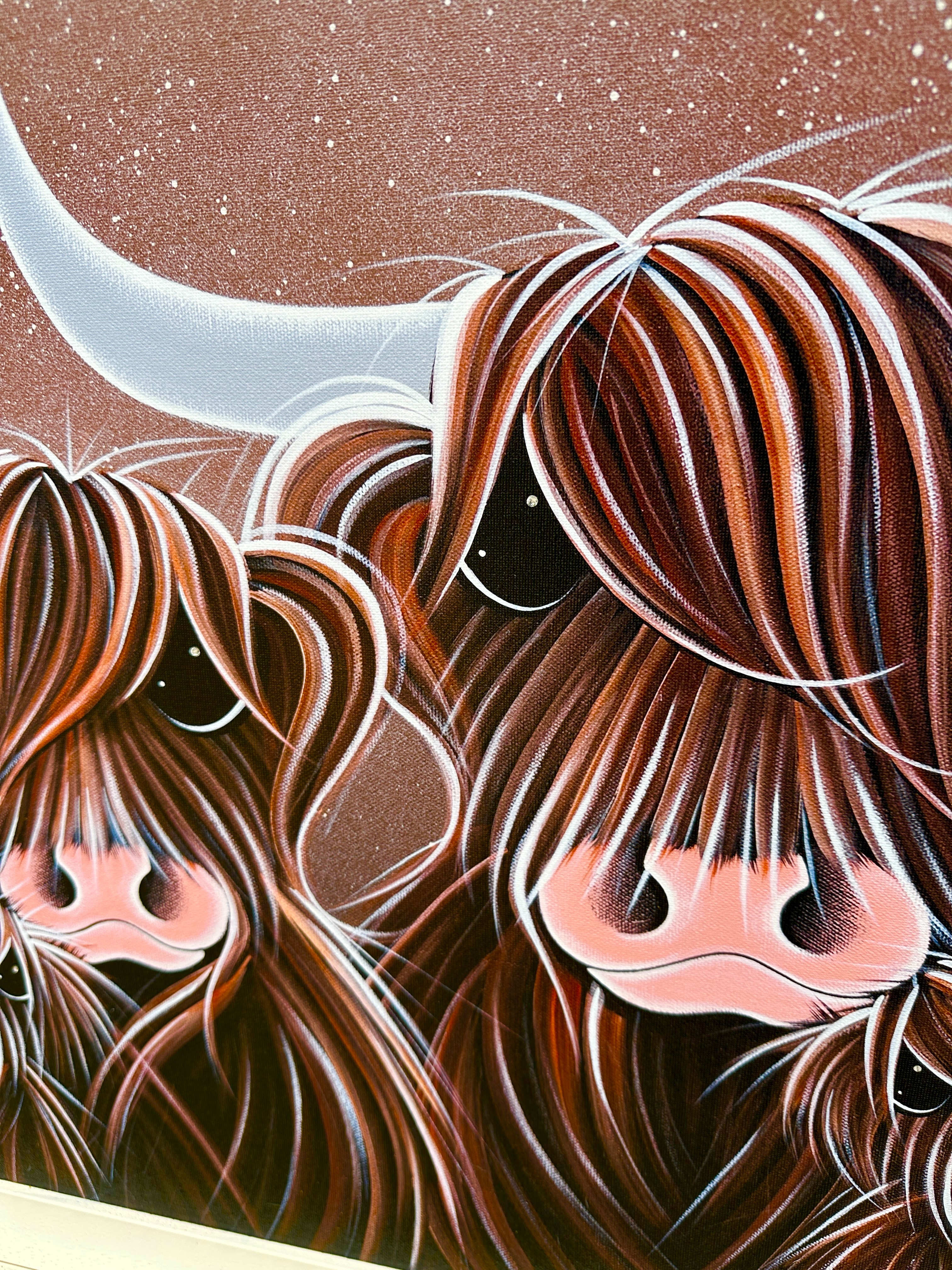 A contemporary embellished canvas board by Jennifer Hogwood, titled ‘The Four MooSketeers’. The artwork depicts four illustrative Highland cows with long, shaggy hair obscuring their eyes and prominent pink snouts, one adult featuring light blue horns, set against a speckled reddish-brown background fading to white. The piece is signed ‘J. Hogwood’ on the lower right and numbered ’26/150′ on the lower left, indicating it is a limited edition print. It is presented in a white, possibly painted wood, frame with a fluted/beaded inner border and a slightly distressed finish. Attached to the reverse is a Certificate of Authenticity confirming the artist, title, medium as “Embellished Canvas board,” an edition size of 150 (plus 15 artist’s proofs), and its publication by DeMontfort Fine Art.