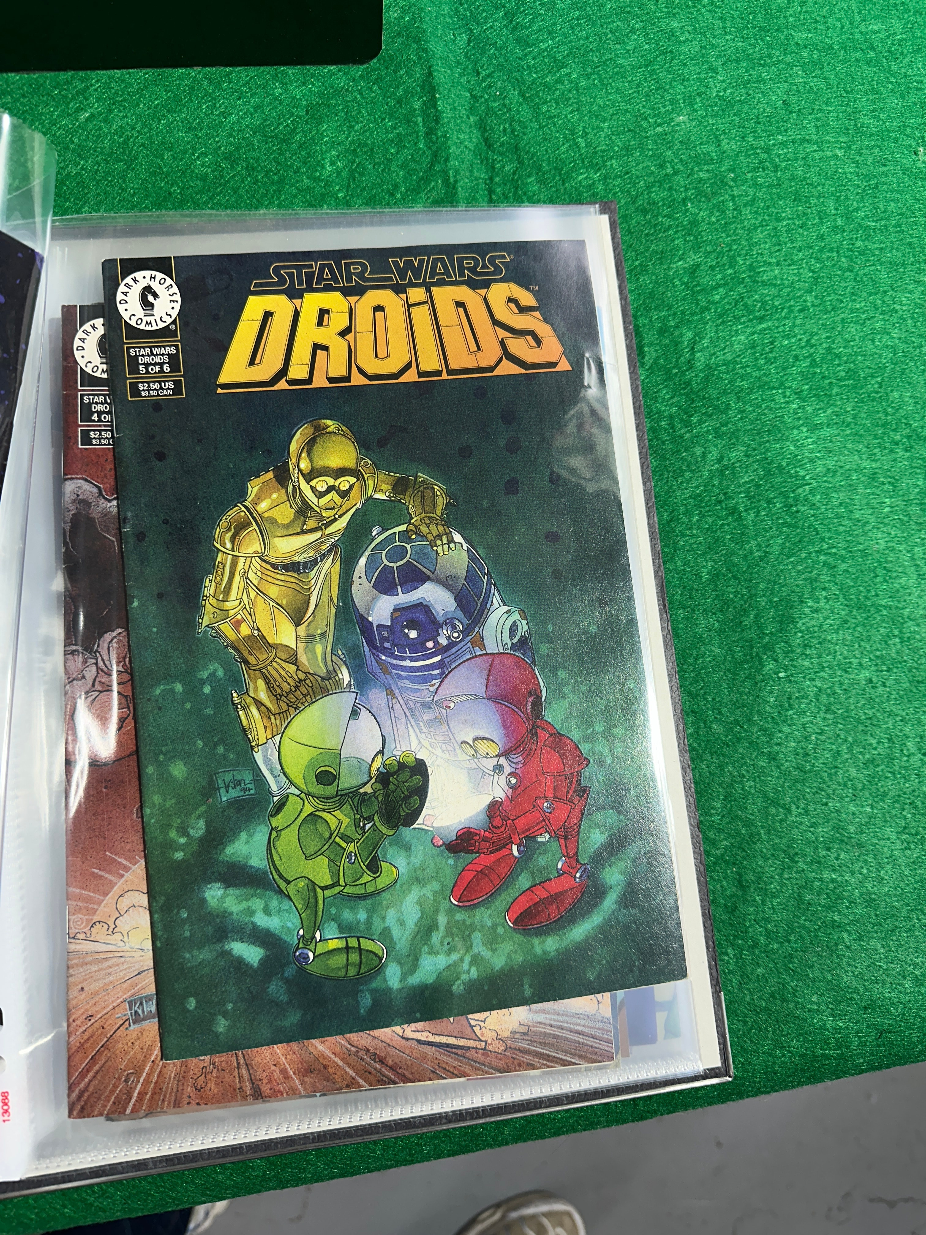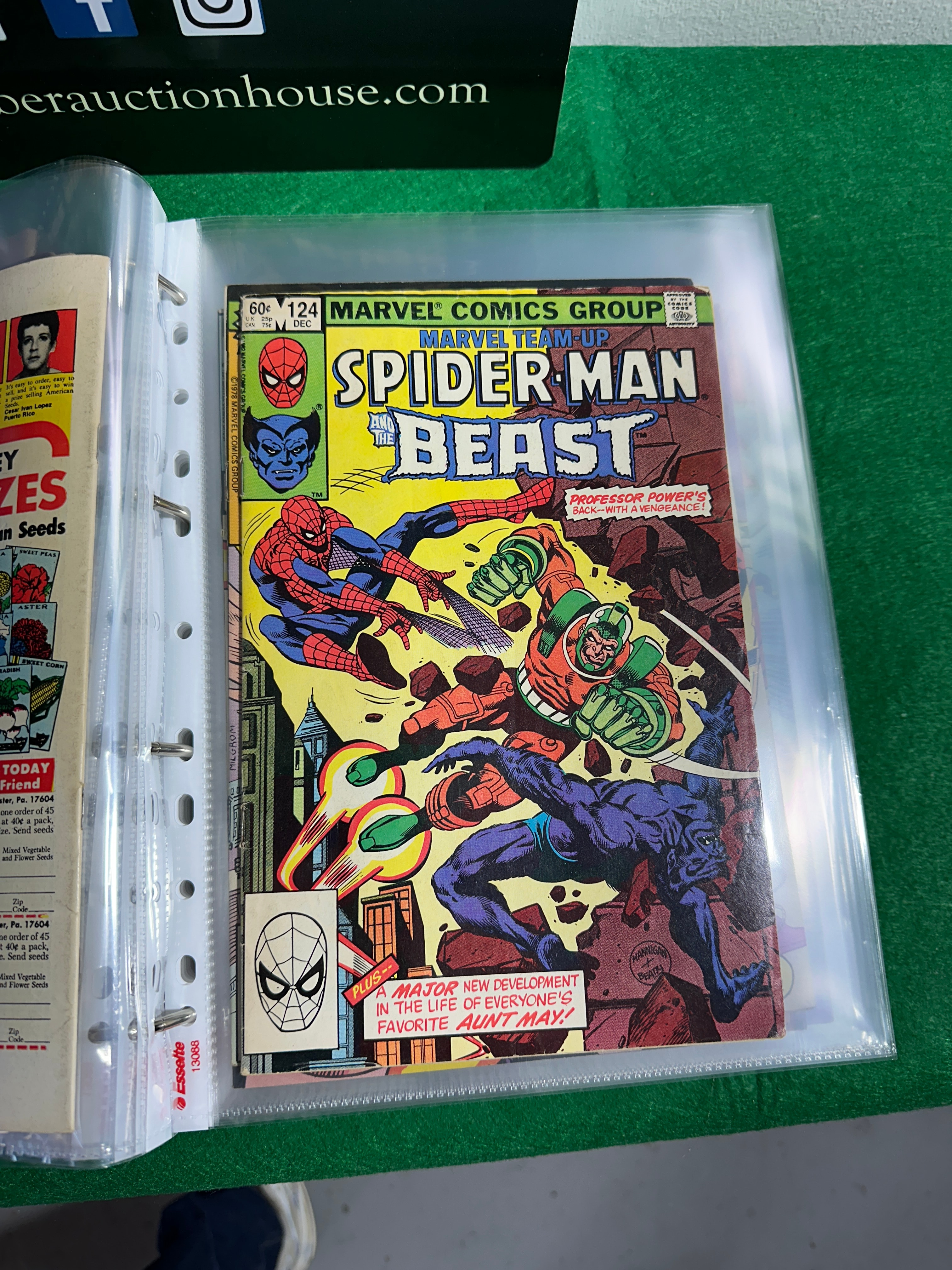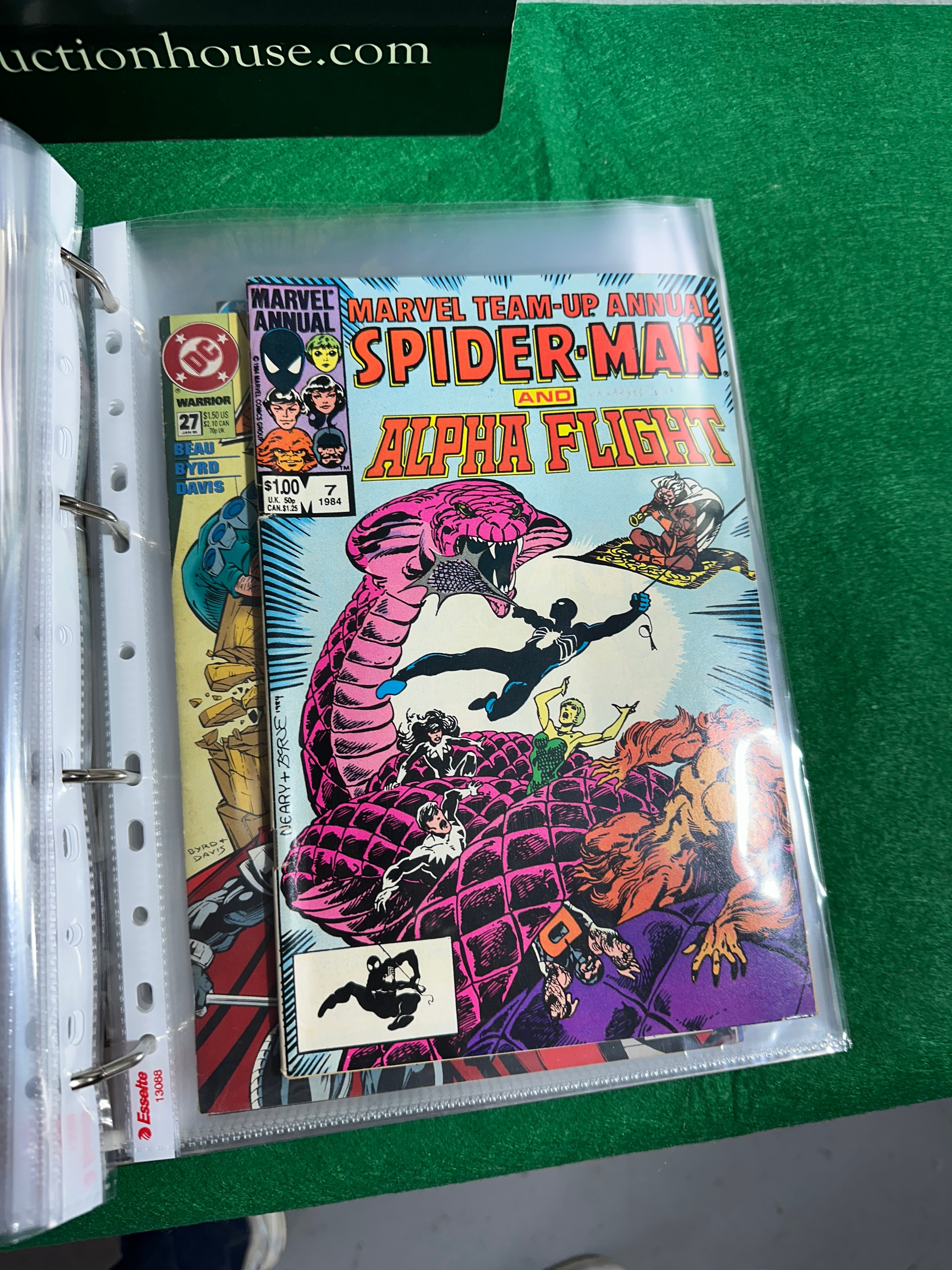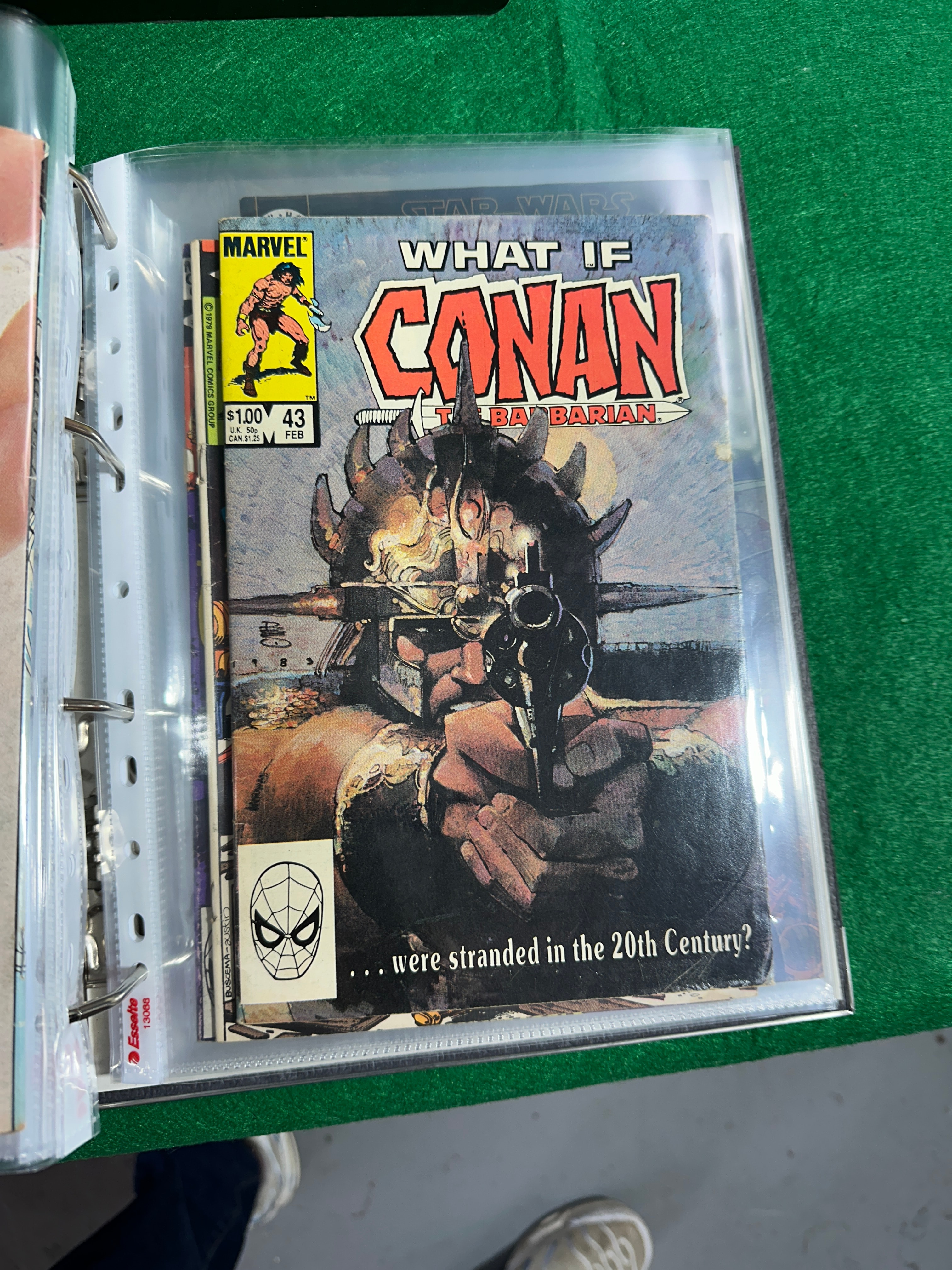 A collection of comic books, primarily from Marvel Comics Group but also including Dark Horse Comics and a partial DC Comics issue, housed in a dark blue, three-ring binder. Each individual paper collectible is protected by a clear plastic sleeve. The visible issues date from the early to mid-1980s, exemplified by *The Invincible Iron Man* #168 (Dec 1982), *Marvel Team-Up Spider-Man and The Beast* #124 (Dec 1982), *Marvel Team-Up Annual Spider-Man and Alpha Flight* #7 (1984), and *What If Conan the Barbarian* #43, alongside a later *Star Wars Droids* #5 of 6. These comics feature vibrant, illustrative covers depicting iconic characters such as Iron Man, Spider-Man, The Beast, Alpha Flight, Conan, C-3PO, and R2-D2, complete with visible prices and publication details.