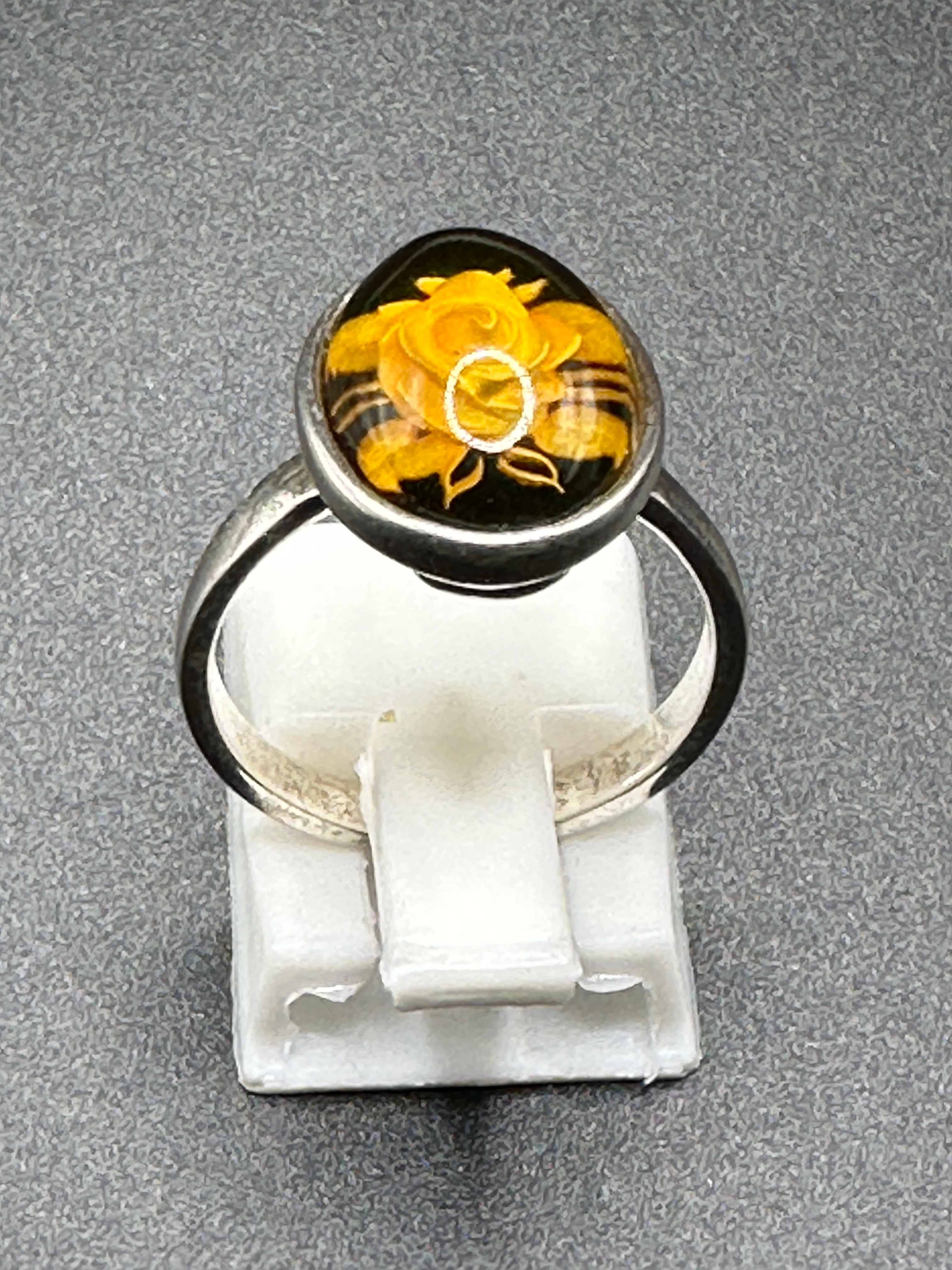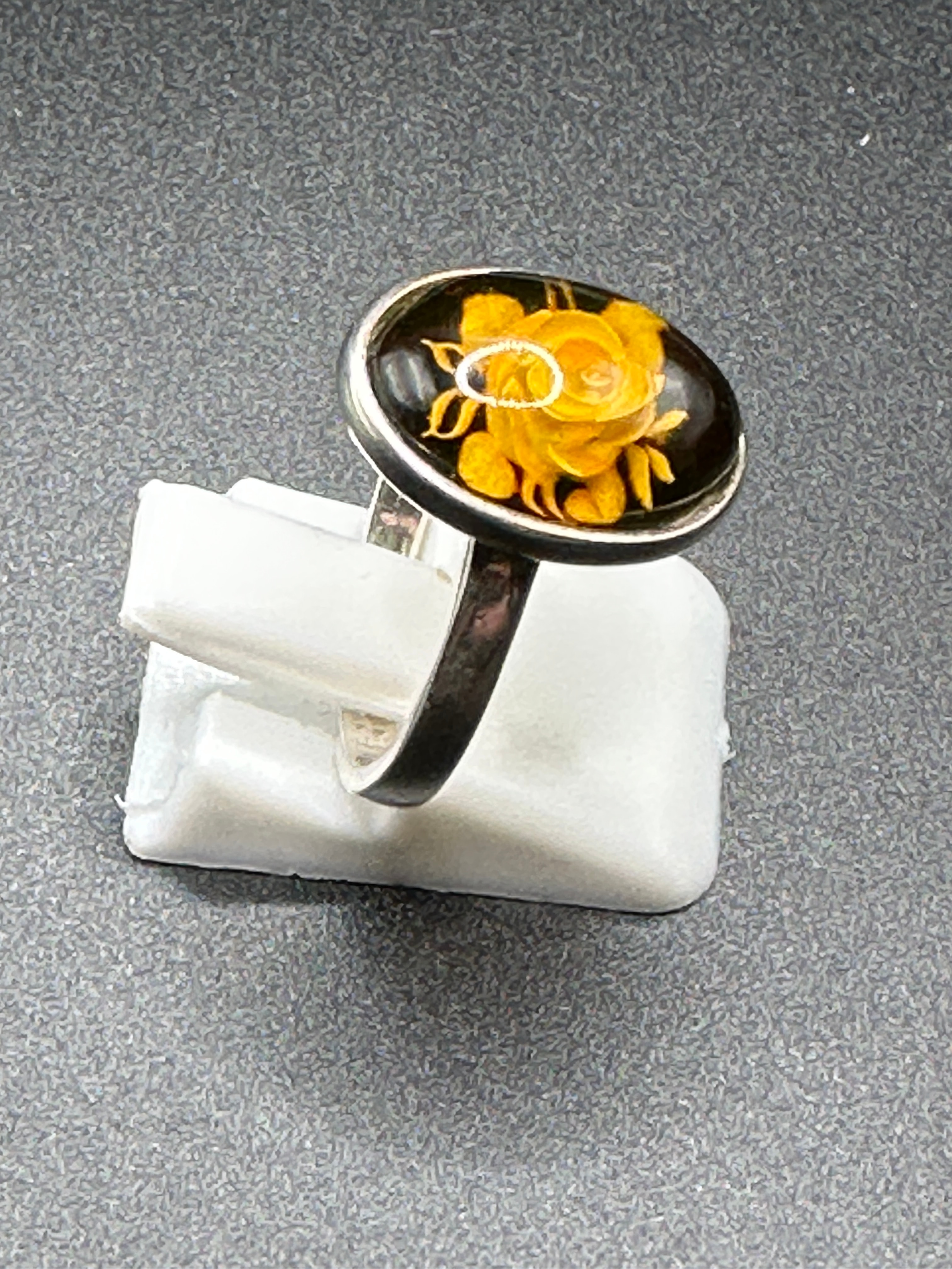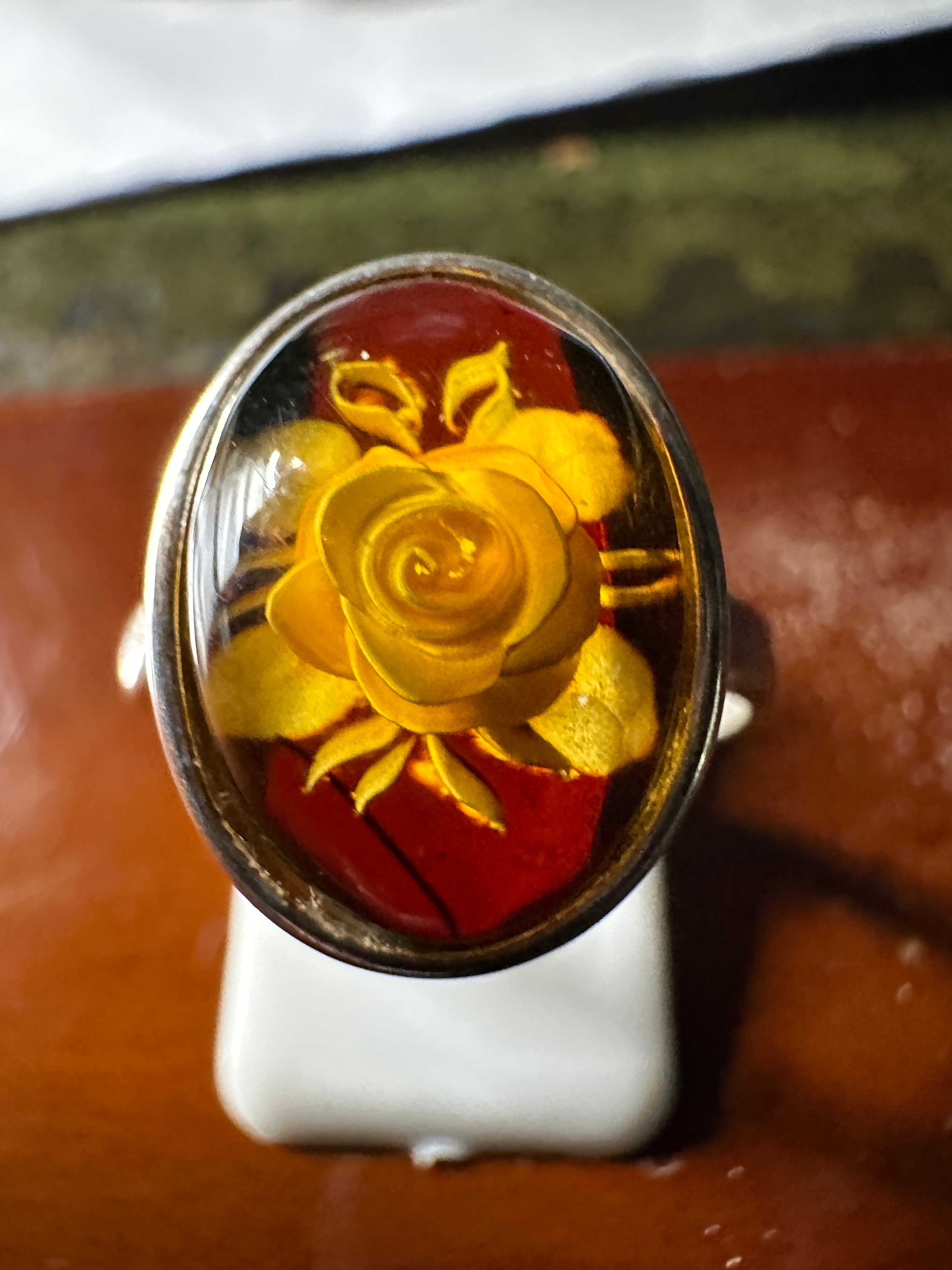 A Sterling Silver Amber Cameo Rose Ring. The ring is crafted from 925 silver. It features an oval cabochon-style setting, encasing a sculpted yellow rose design with accompanying leaves. The rose is set against a dark background, which appears to reveal a reddish base material. The metal band is plain.