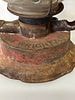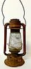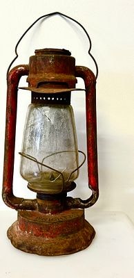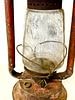 A vintage kerosene lantern of traditional utilitarian design, constructed primarily from metal, likely steel or tin, with a clear glass globe and a metal wire bail handle. The internal burner mechanism appears to be of brass or a similar yellow metal, featuring a wick adjuster. Embossed text is visible on the base, including the word “ORIGINAL.”