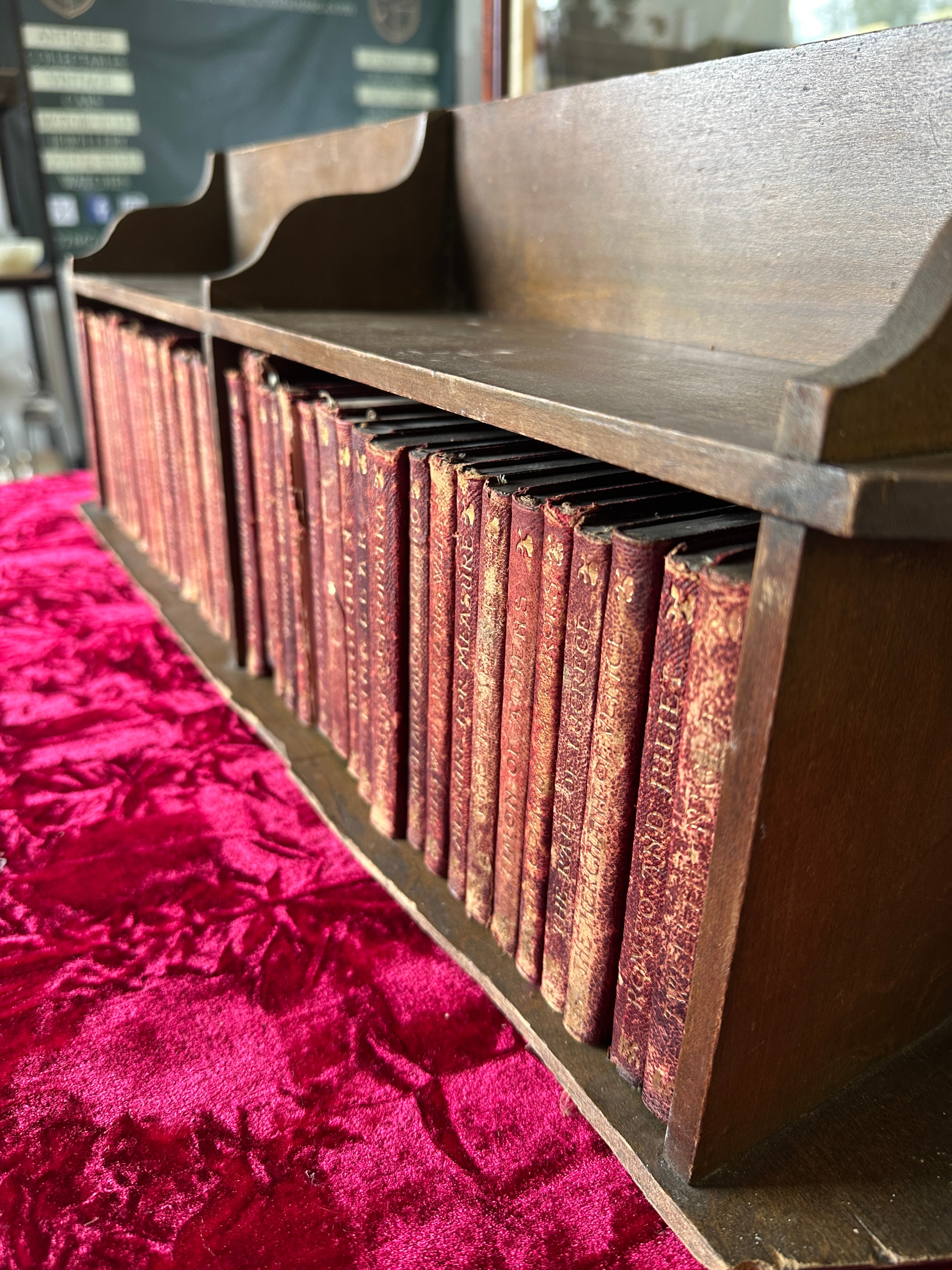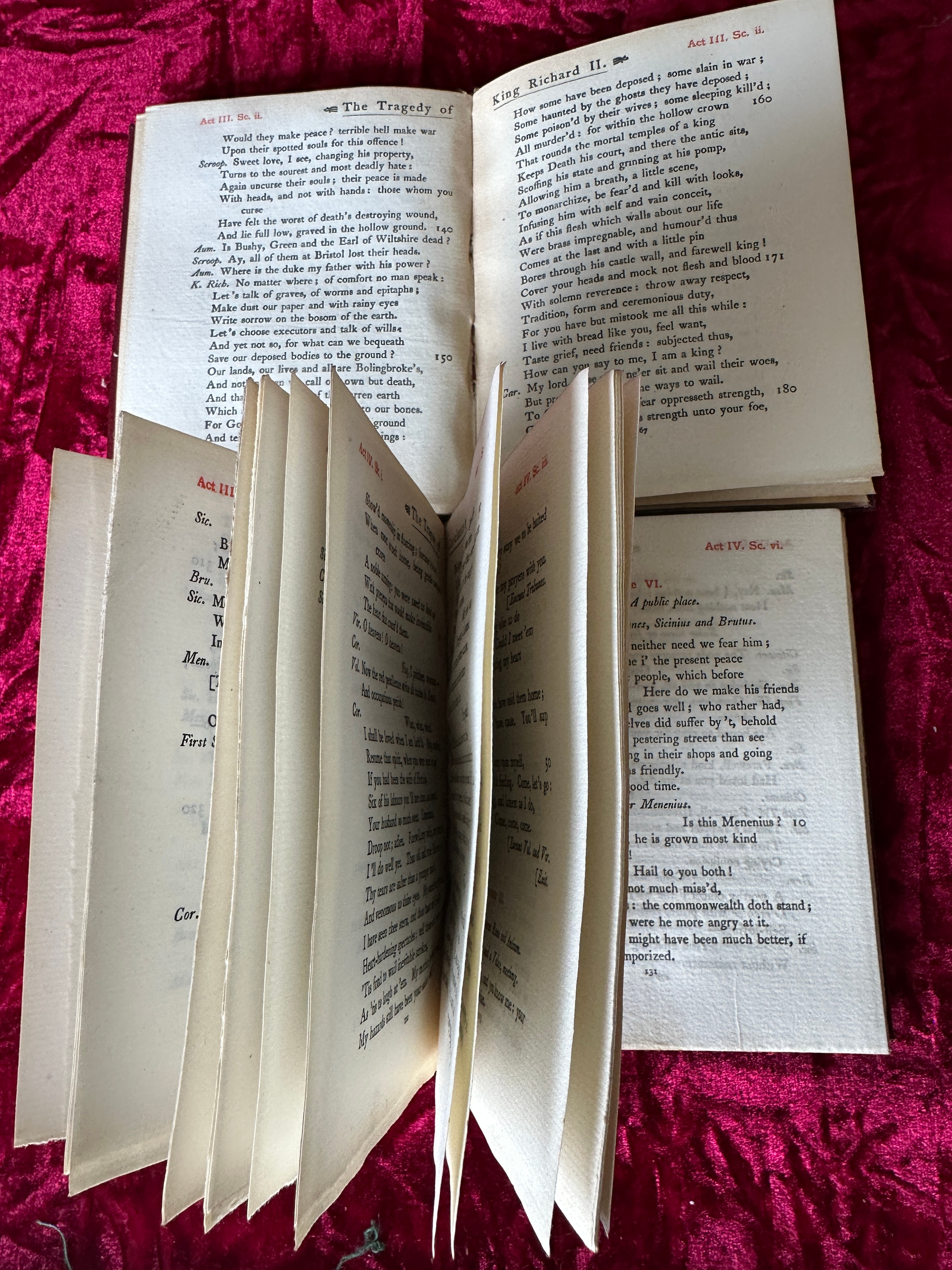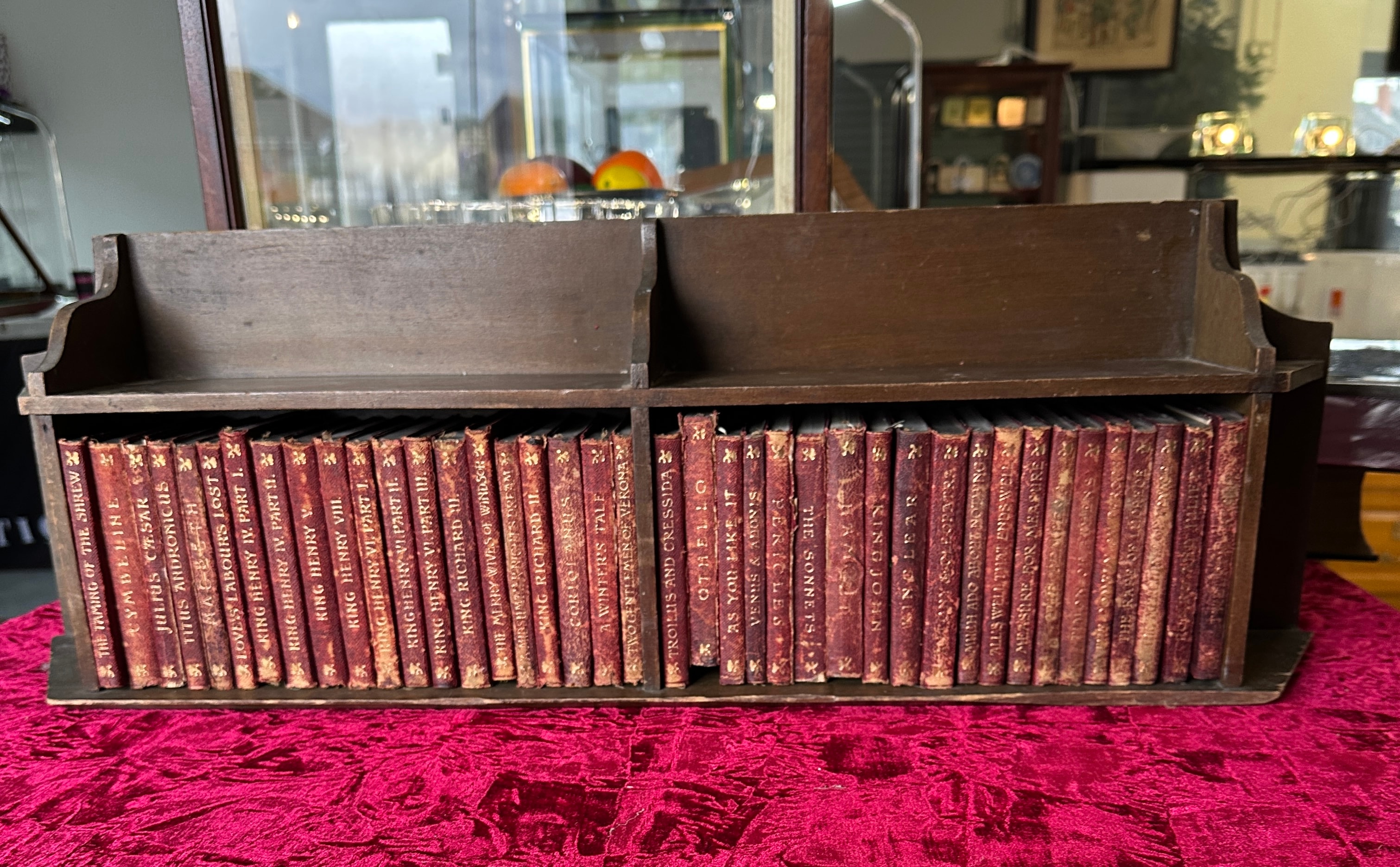 A collection of 40 miniature books comprising a nearly complete or complete set of William Shakespeare’s works. The books are housed in a fitted, dark-stained wooden display case featuring two compartments. Each volume is uniformly bound with reddish-brown covers, likely leather or faux leather, and features gilt titling and decorative motifs on its spine. Legible titles include “The Taming of the Shrew,” “Julius Caesar,” “King Henry V,” “Othello,” “The Sonnets,” and “Romeo and Juliet.” The front covers of the books display a consistent gilt armorial design featuring a crest with a winged creature above a shield. Internally, an open volume reveals standard printed text in English with act and scene divisions. Stylistically, this set suggests a late 19th or early 20th-century “pocket library” or miniature edition.