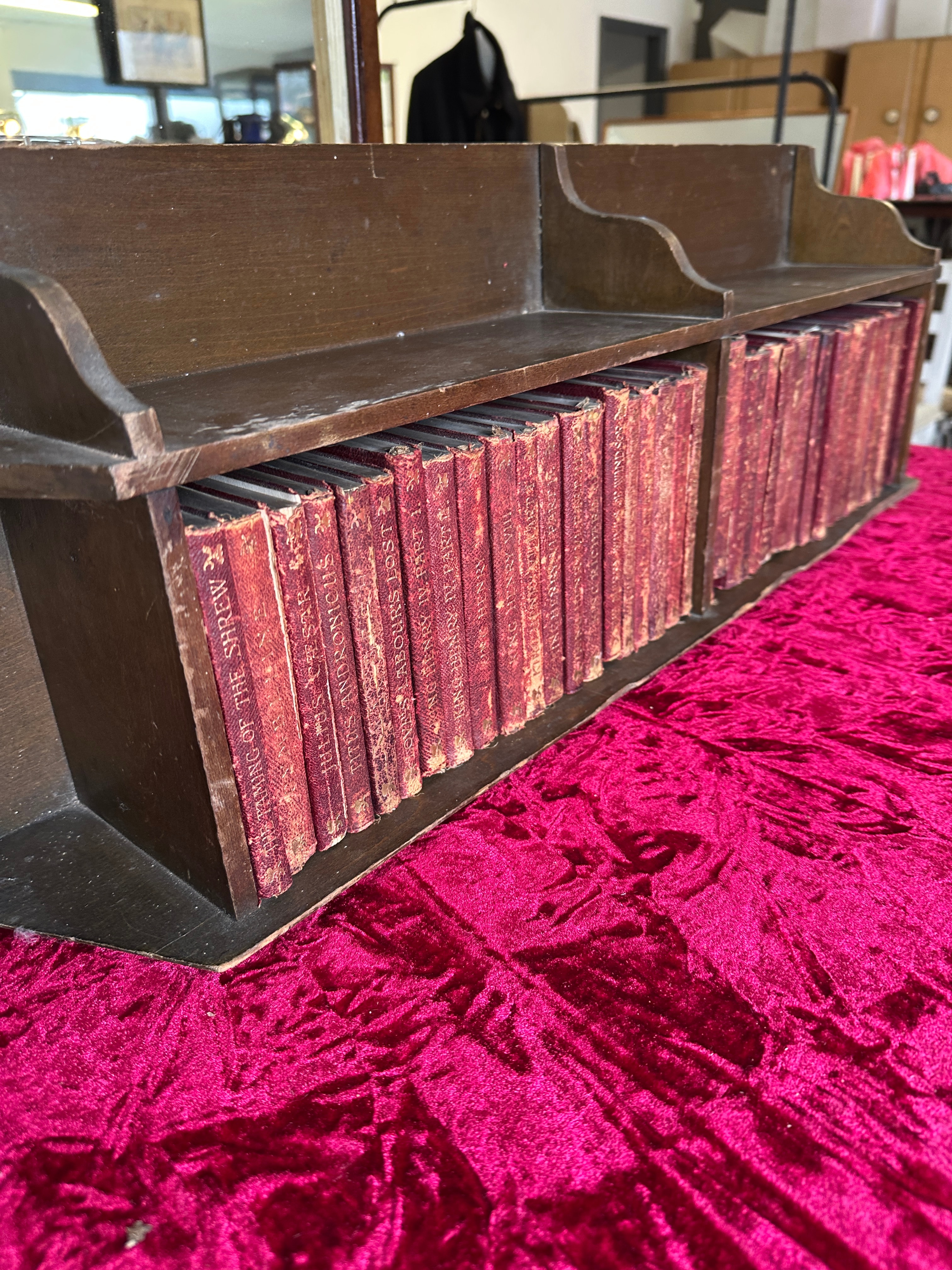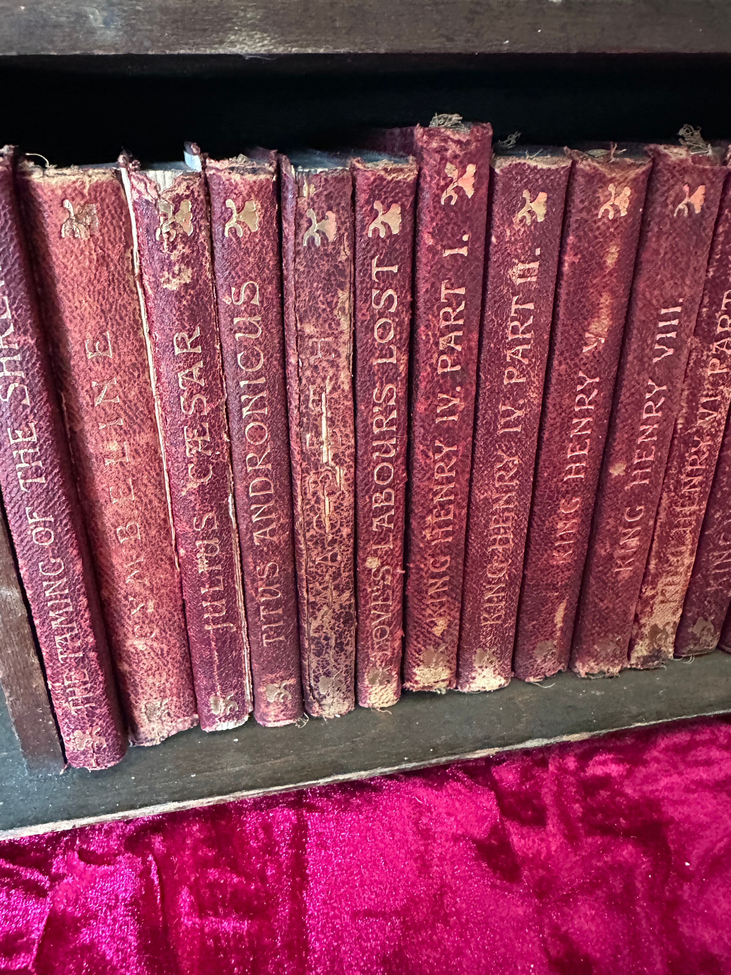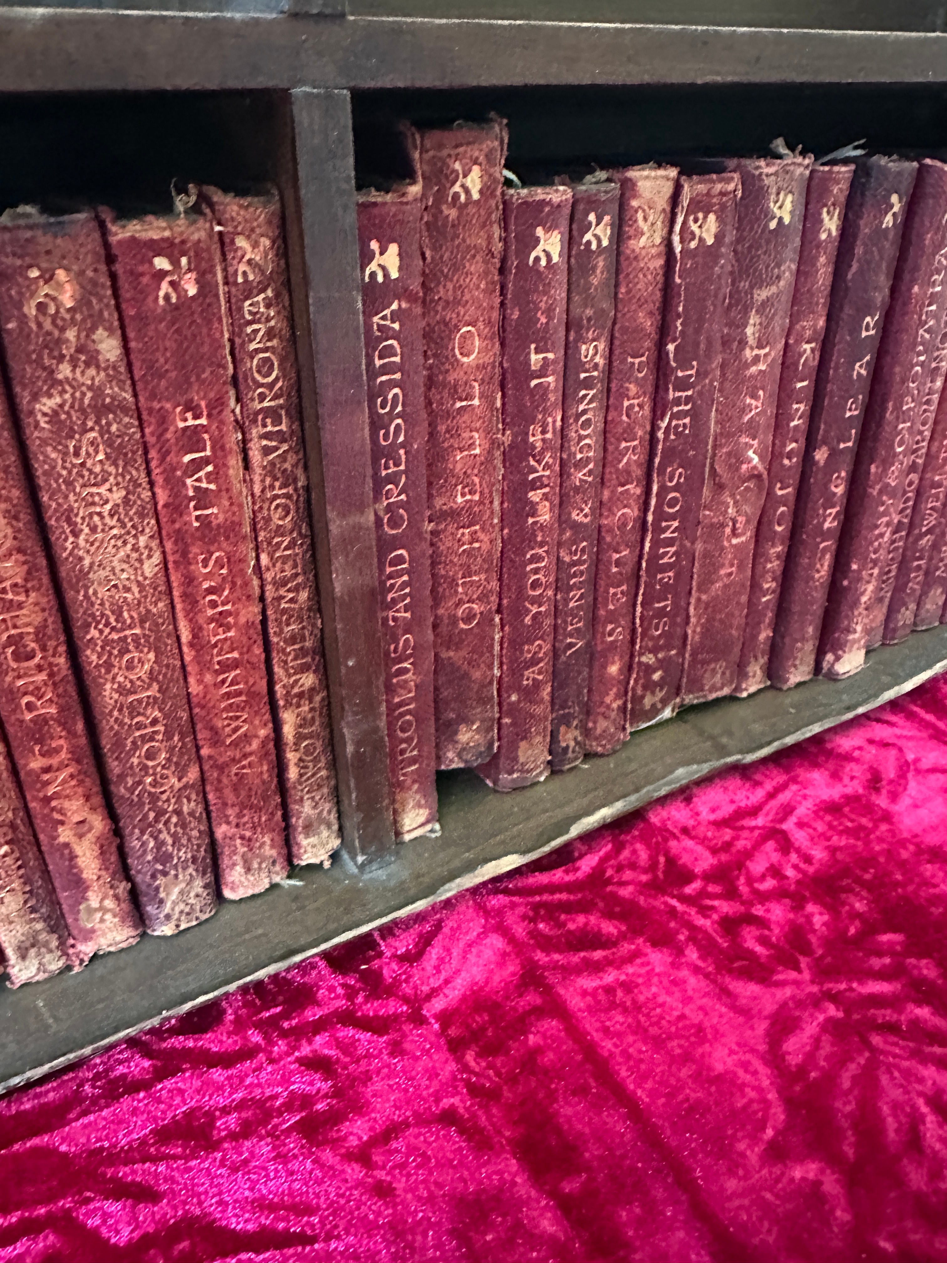 A collection of 40 miniature books comprising a nearly complete or complete set of William Shakespeare’s works. The books are housed in a fitted, dark-stained wooden display case featuring two compartments. Each volume is uniformly bound with reddish-brown covers, likely leather or faux leather, and features gilt titling and decorative motifs on its spine. Legible titles include “The Taming of the Shrew,” “Julius Caesar,” “King Henry V,” “Othello,” “The Sonnets,” and “Romeo and Juliet.” The front covers of the books display a consistent gilt armorial design featuring a crest with a winged creature above a shield. Internally, an open volume reveals standard printed text in English with act and scene divisions. Stylistically, this set suggests a late 19th or early 20th-century “pocket library” or miniature edition.