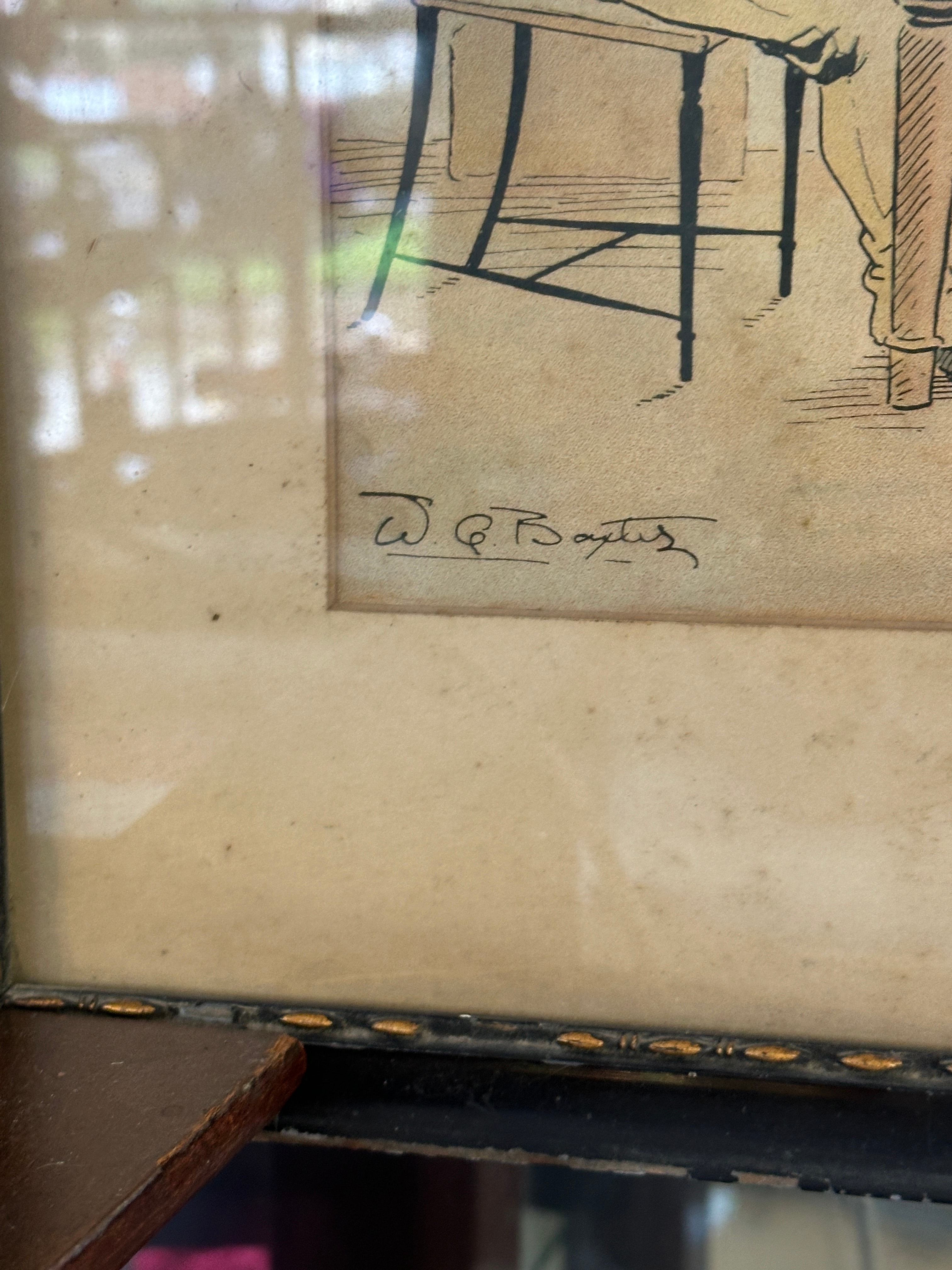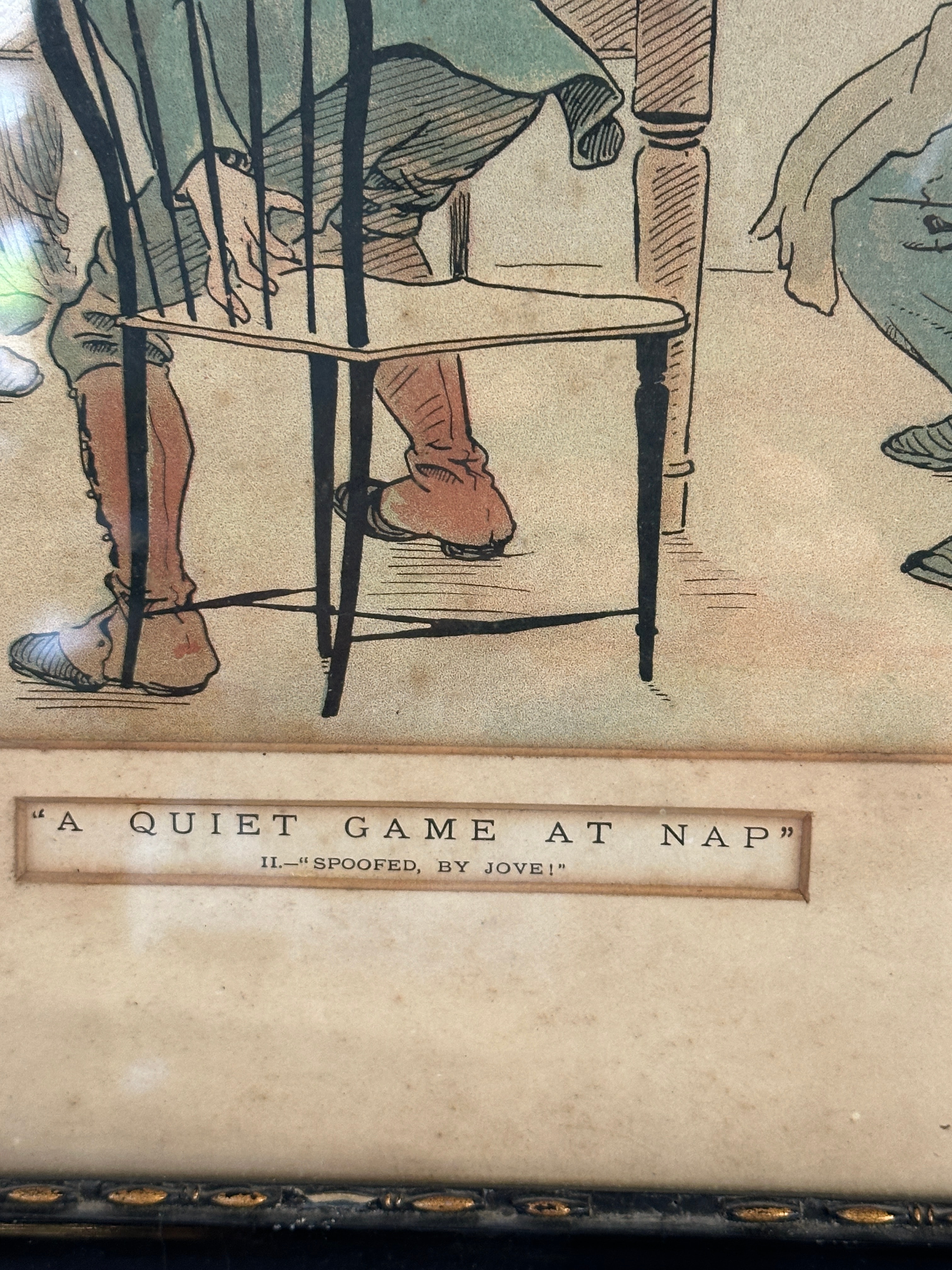 A pair of hand-colored prints after W.G. Baxter, published by Pears, from the series “A Quiet Game at Nap.” One print is titled “I. – ‘NAP FOR ALL HE’S WORTH!'” and the other “II. – ‘SPOOFED, BY JOVE!'”, as depicted in the provided image. Each print features a humorous caricatural genre scene of four men engaged in a card game at a table. Each artwork is signed “W. G. Baxter” on the lower left and “Pears” on the lower right. Suggestive of the late 19th or early 20th century, each print is housed under glass within a matted, likely wooden frame featuring a distressed black finish with gold accents.