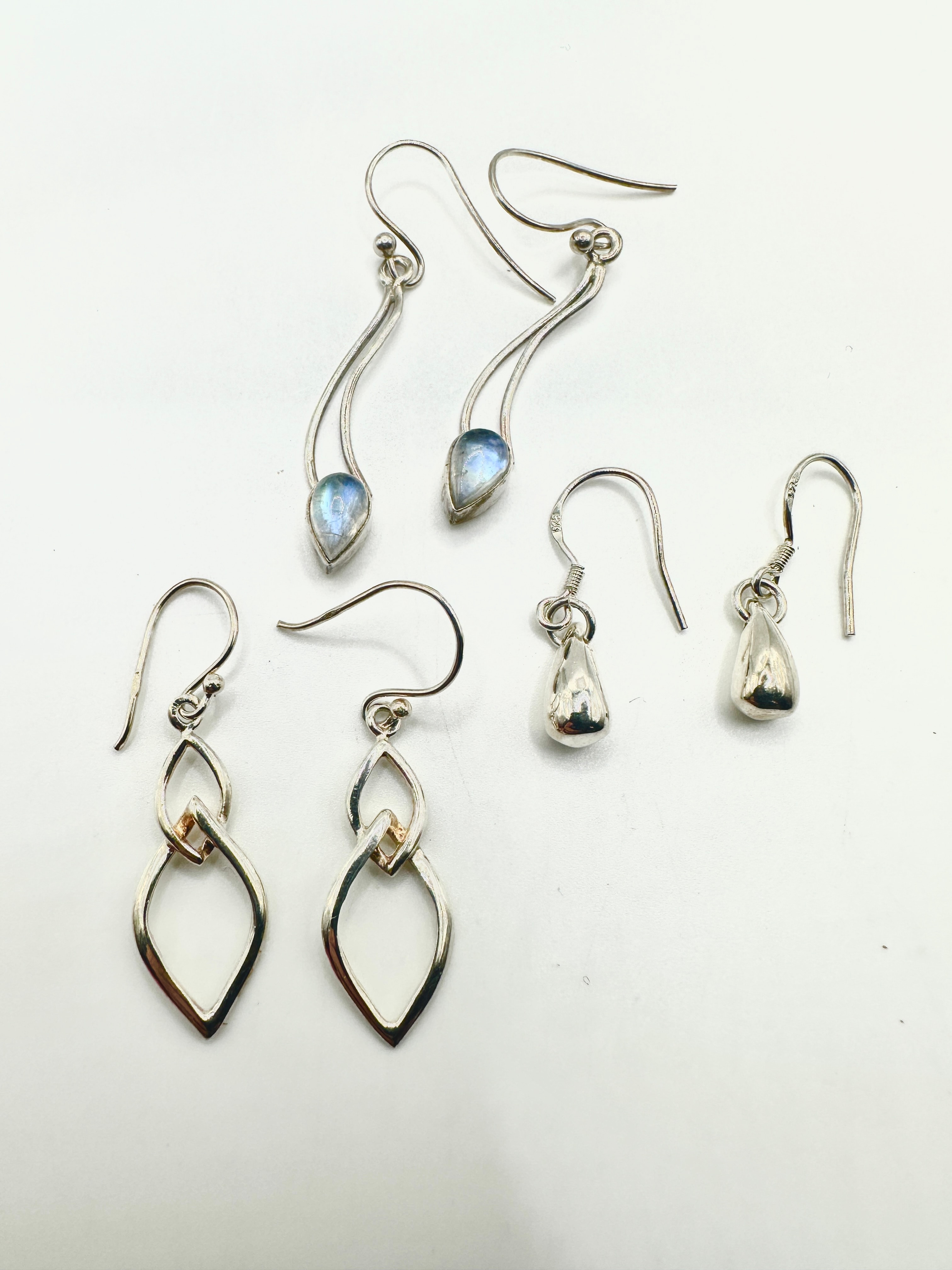A collection of three distinct pairs of modern dangle earrings, crafted from 925 silver. The top pair features elongated, wavy S-shaped elements, each terminating in a bezel-set, tear-drop shaped iridescent cabochon, consistent with moonstone. The bottom-left pair consists of two interconnected, elongated diamond-shaped links, one exhibiting a small gold-tone accent at its intersection. The bottom-right pair comprises simple, smooth teardrop-shaped pendants. All earrings utilize fish hook ear wires, with a clear “925” hallmark visible on an ear wire of the bottom-right pair.