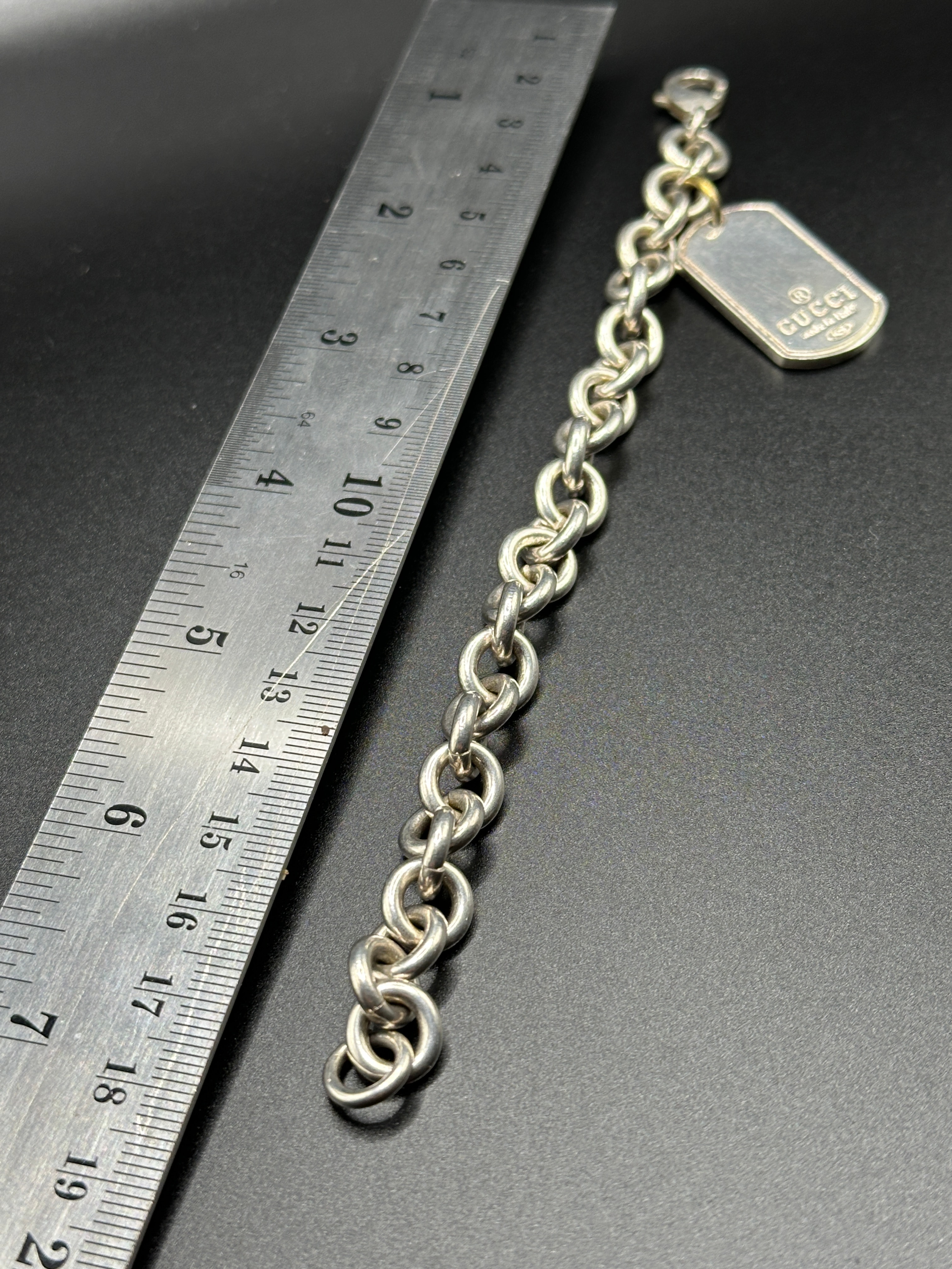 A 925 silver chain-link bracelet featuring chunky, interlocking oval links secured by a lobster clasp. An attached rectangular “dog tag” style charm is marked with “® GUCCI,” “Made in Italy,” and the “925” sterling silver hallmark.