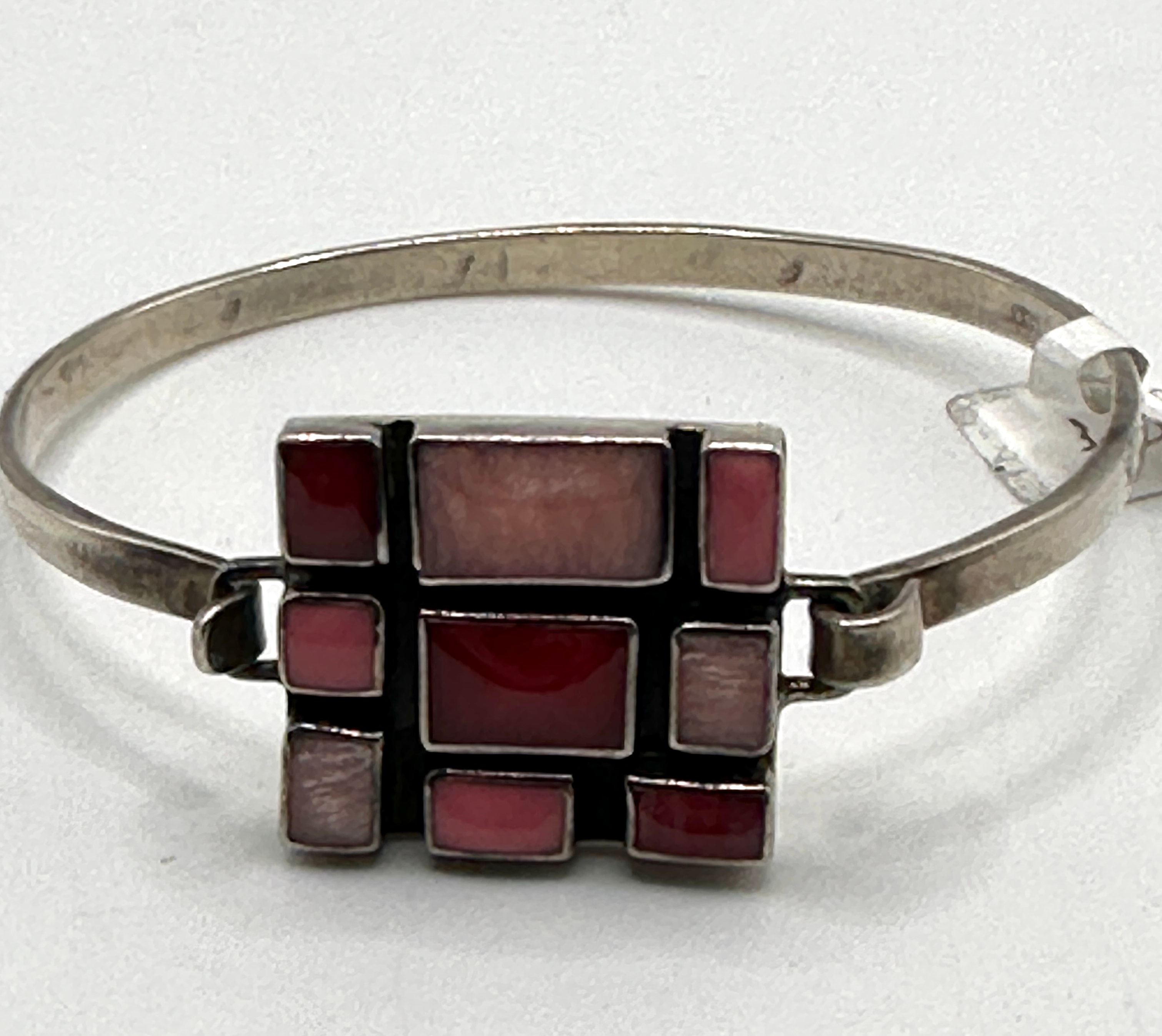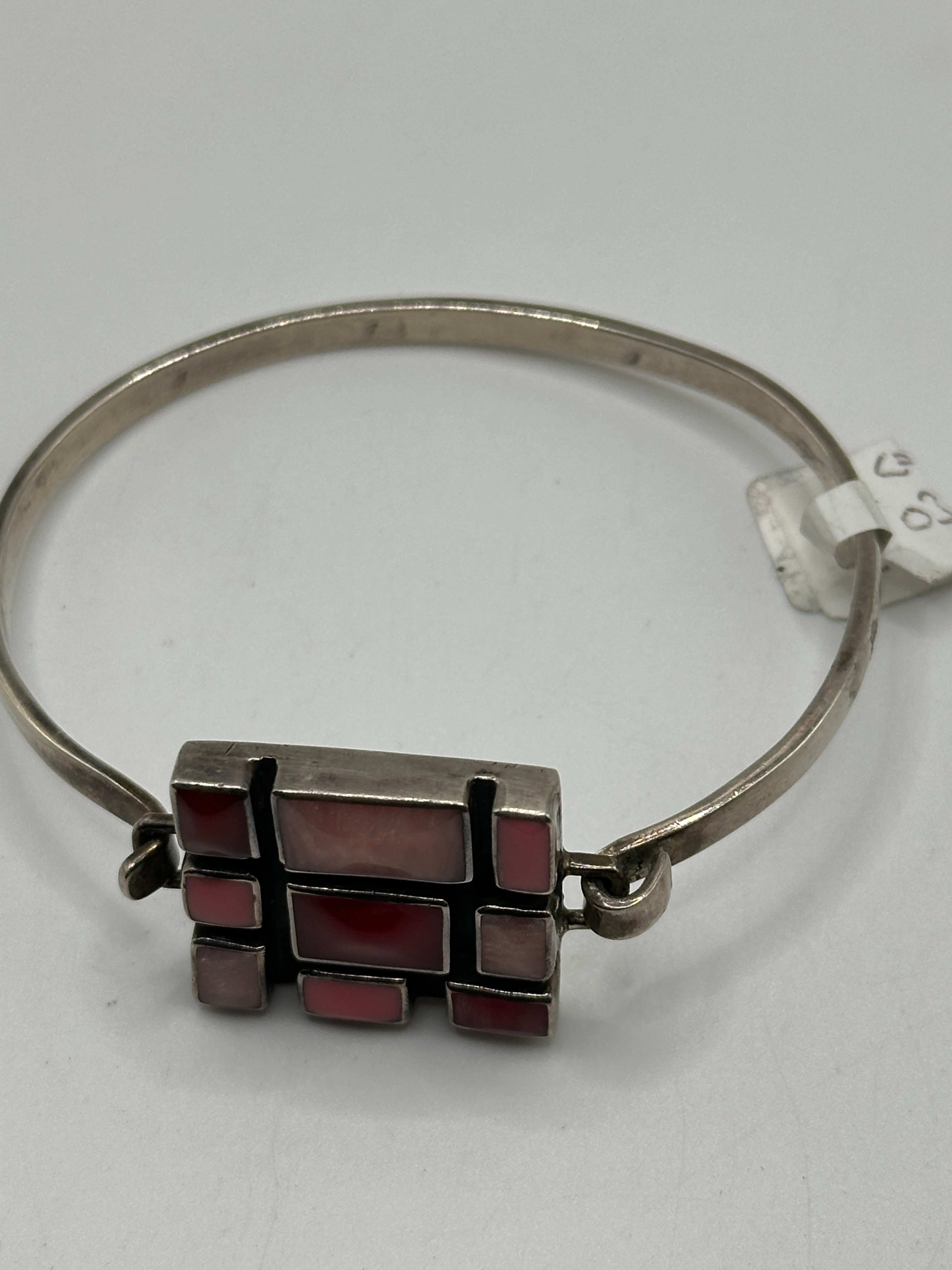 A 925 silver bangle bracelet featuring a rectangular centerpiece with a geometric mosaic jasper inlay design. The centerpiece is composed of multiple smaller rectangular and square segments inlaid with various opaque and semi-translucent jasper materials in shades of red, rose, and pale pink.
