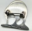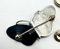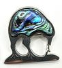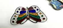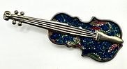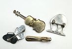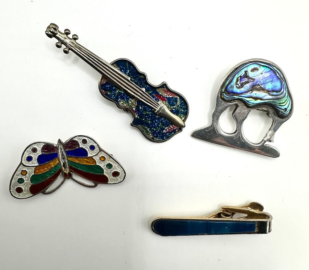 A group of four decorative accessory items. This lot includes a silver-tone violin-shaped brooch with its body inlaid with crushed, multicolored material, likely stone or glass, set in dark resin, and backed by a gold-tone pin mechanism. Also present is a butterfly-shaped brooch crafted from sterling silver, featuring vibrant multicolored enamel filling its wing segments, clearly marked “STERLING” on its reverse. An abstract brooch, made of silver-tone metal, is adorned with a prominent, iridescent abalone shell inlay, with faint, illegible markings visible on its base. The final item is a classic gold-tone tie clip featuring a rectangular dark blue enamel or inlay strip.